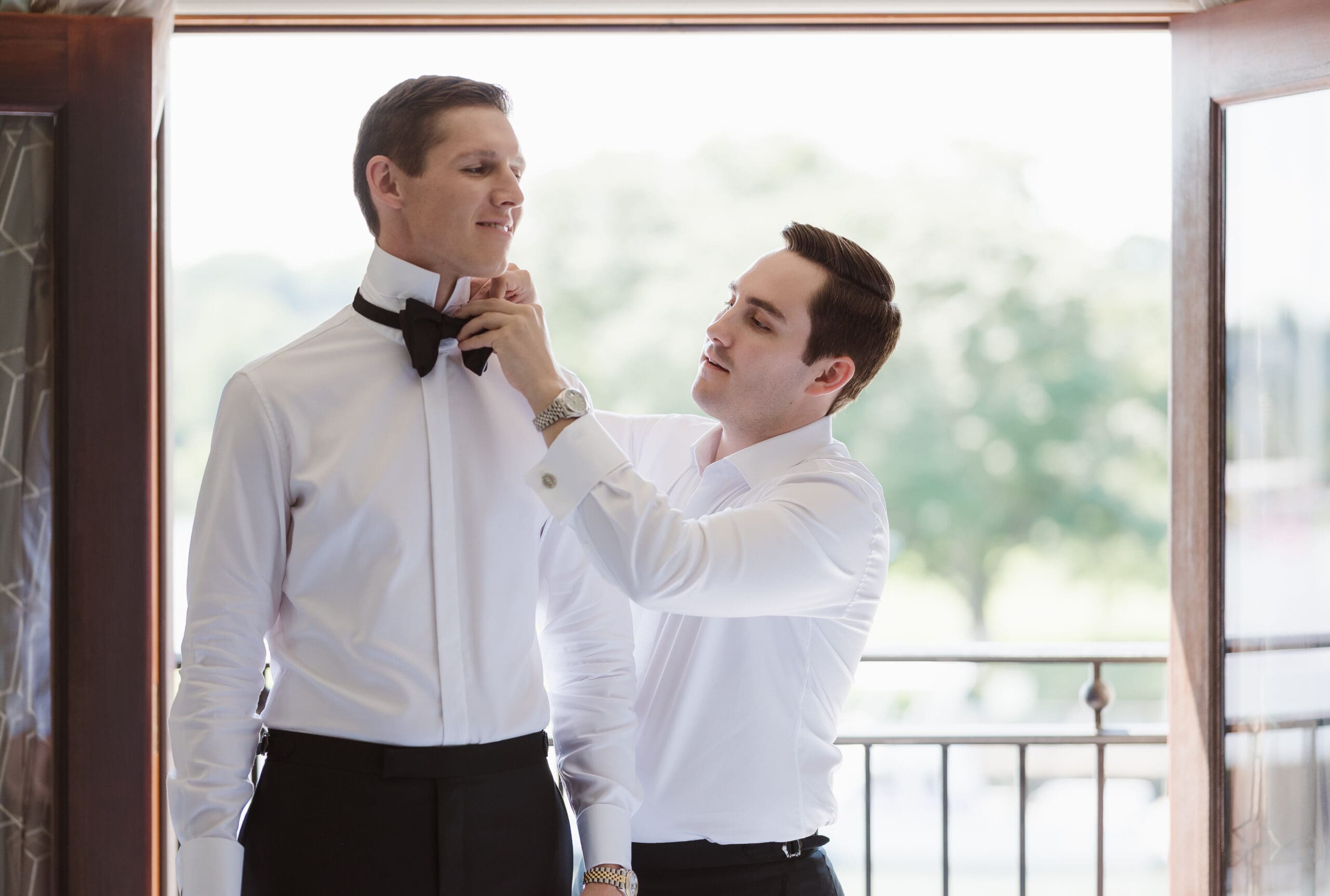 We started by taking getting ready photos at the Delamar Greenwich Harbor—the couple booked the Presidential Suite and signed their marriage license in private with their officiant. After the gay couple got ready together, we headed to the American Yacht Club for photos, including the property and one of the groom’s father’s sailboats. Then we took a wedding party and family photos on the waterfront. The entire day was perfect; nothing went wrong.