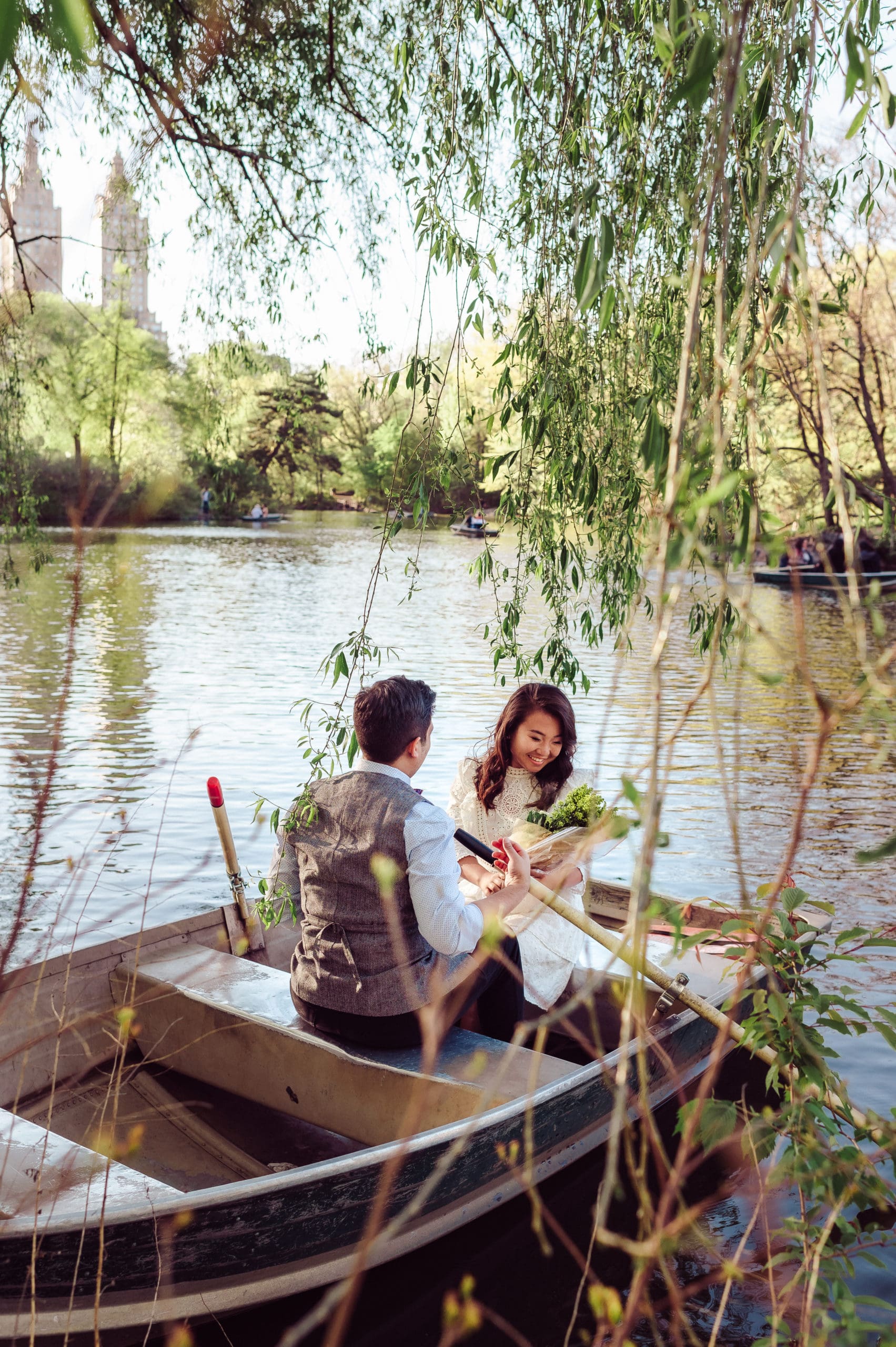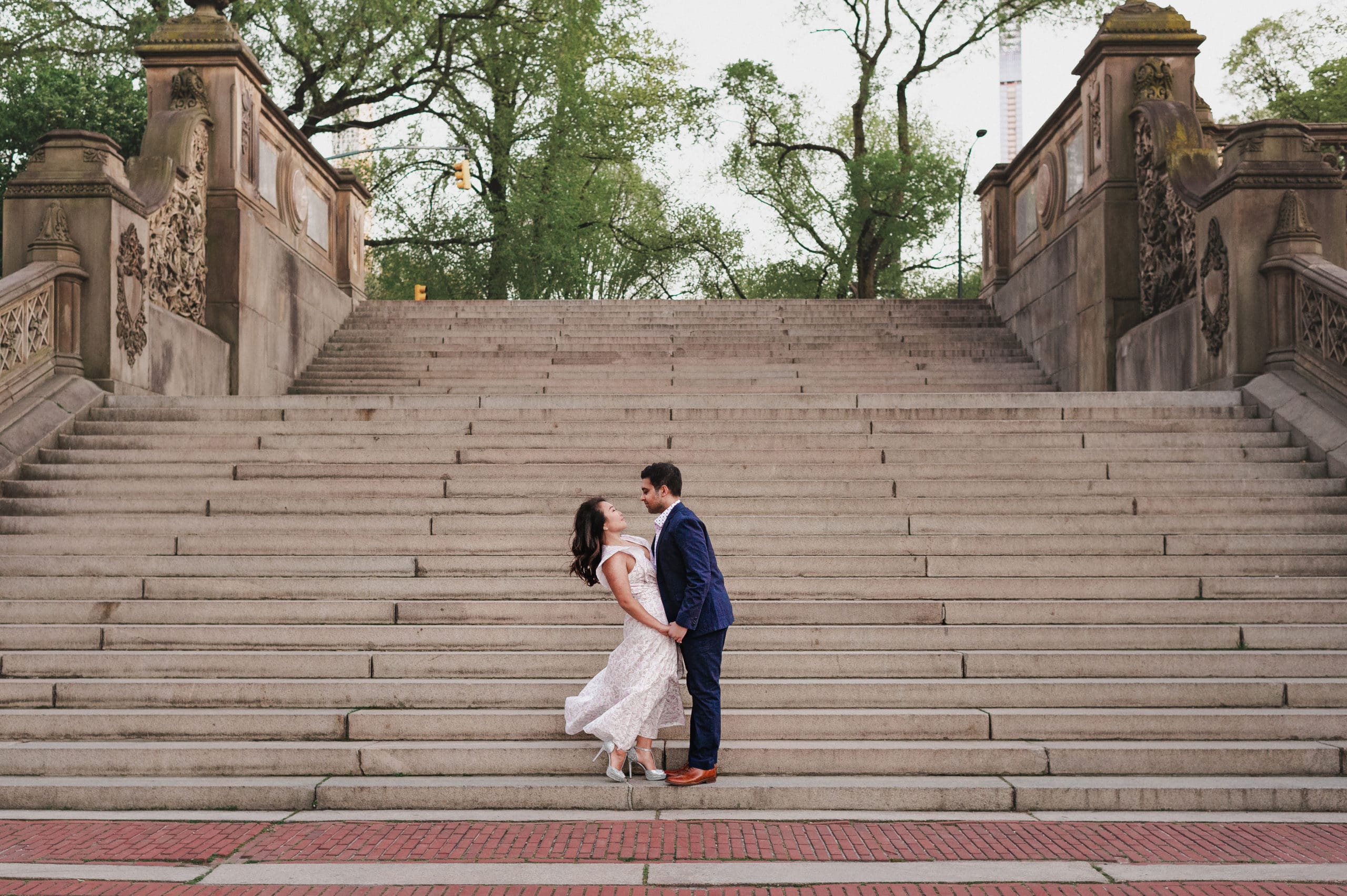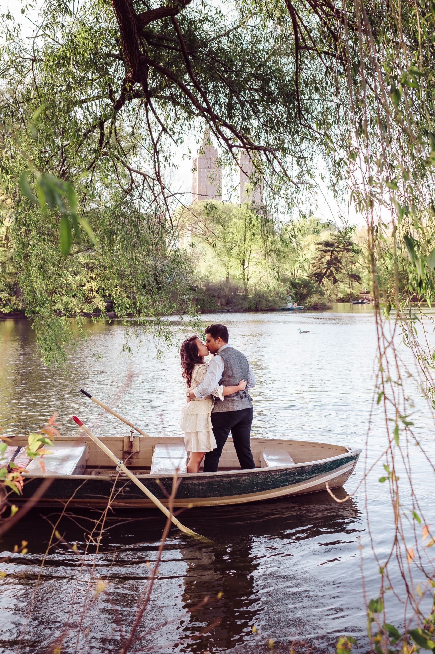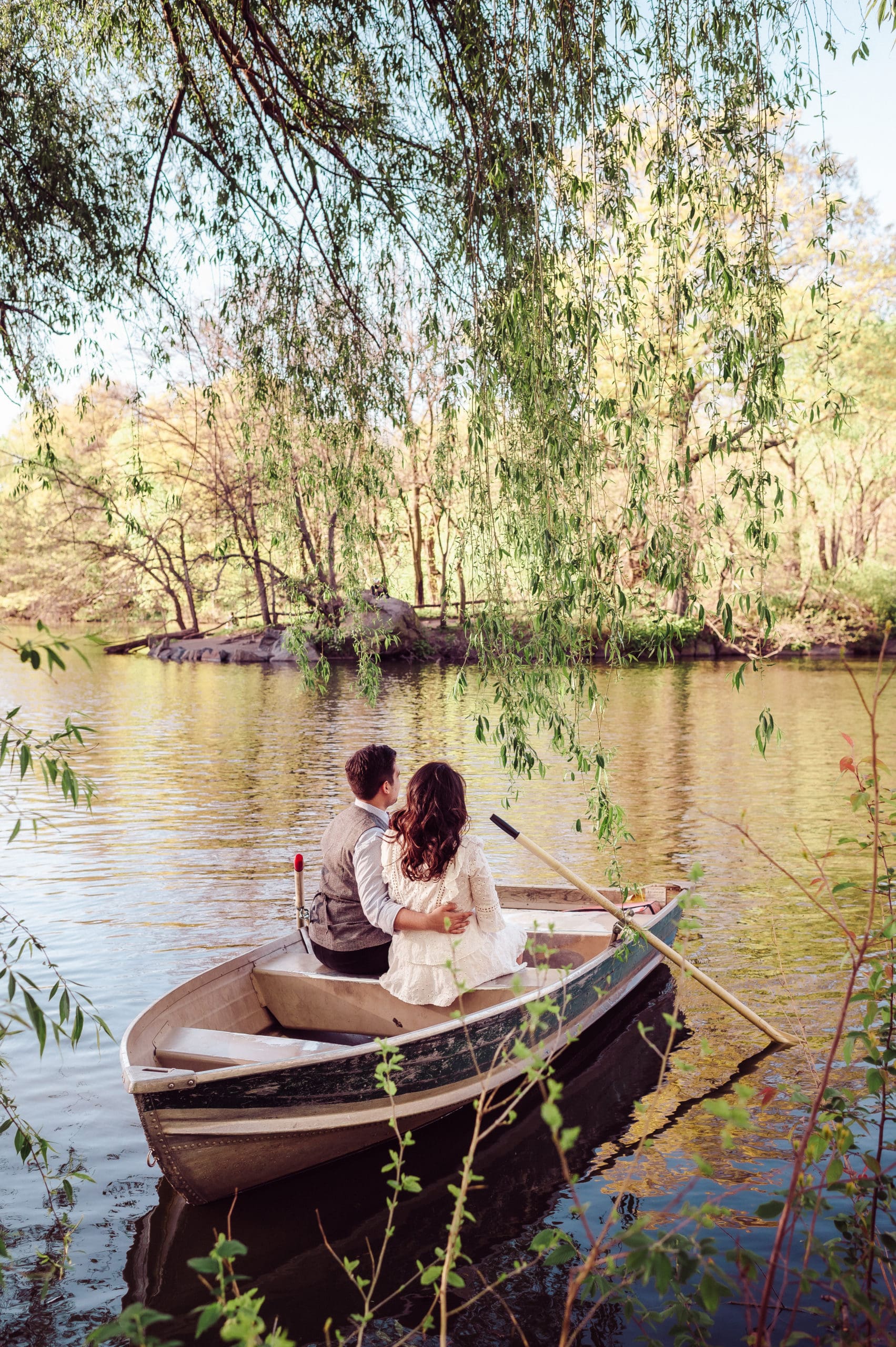 In the map below, these are the typical spots we can cover engagement photos within 90 minutes around Central Park. First, we started at the Loeb Boat House where the couple rented a rowboat for “The Notebook” style vibes. Next, we photographed near a willow tree with the iconic two towers and lake in the background. After, we walked over the Bethesda Terrace staircase and inside the beautiful terrace for dancing photos. The sun went down at the end of our shoot and we ended up at the Bow bridge for creative night portraits with off-camera flash, champagne shower and smoke bombs.