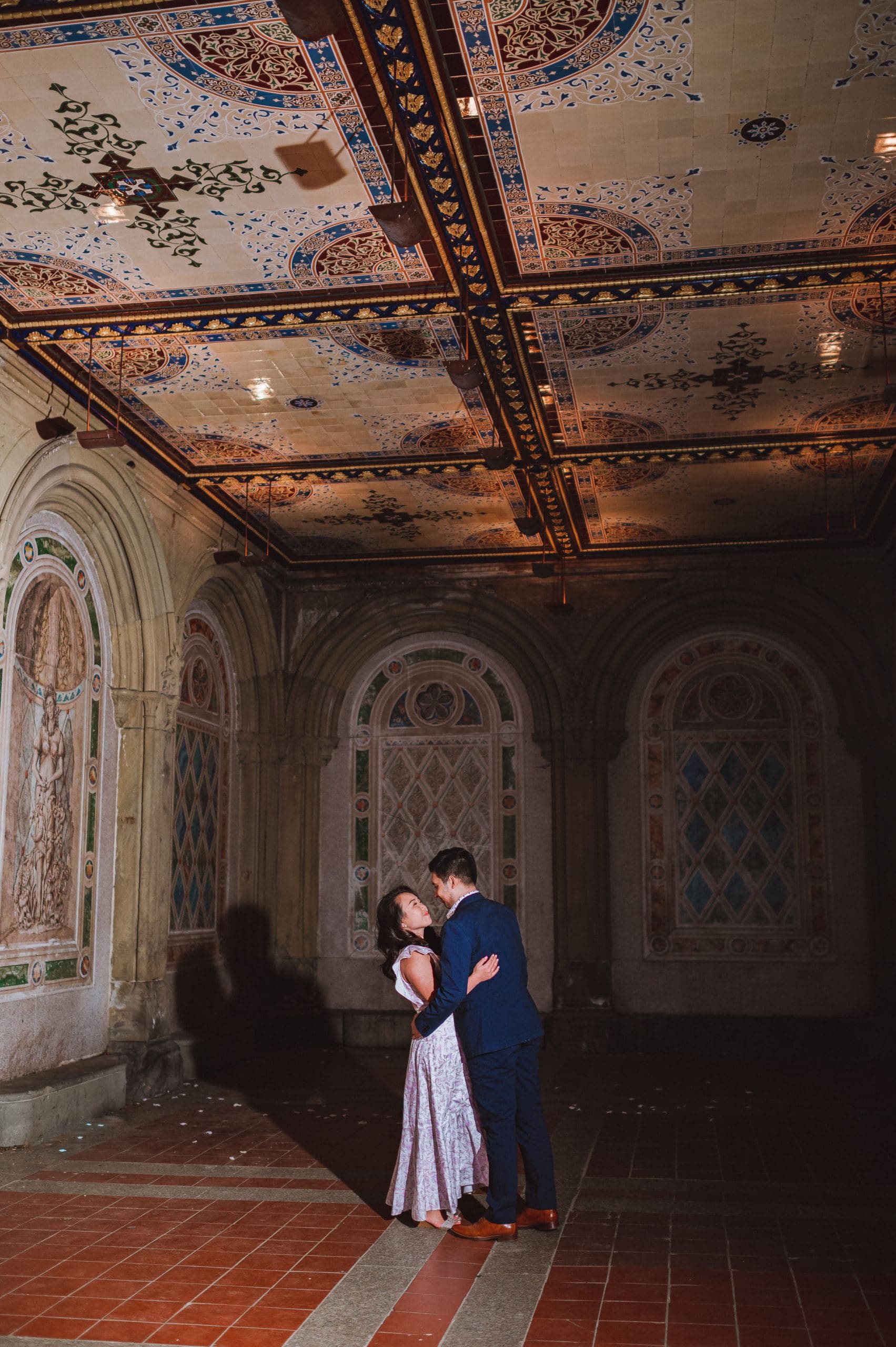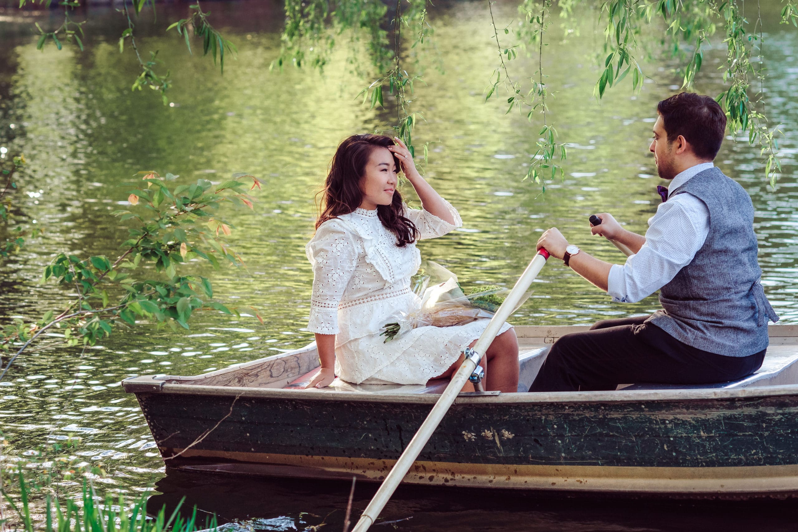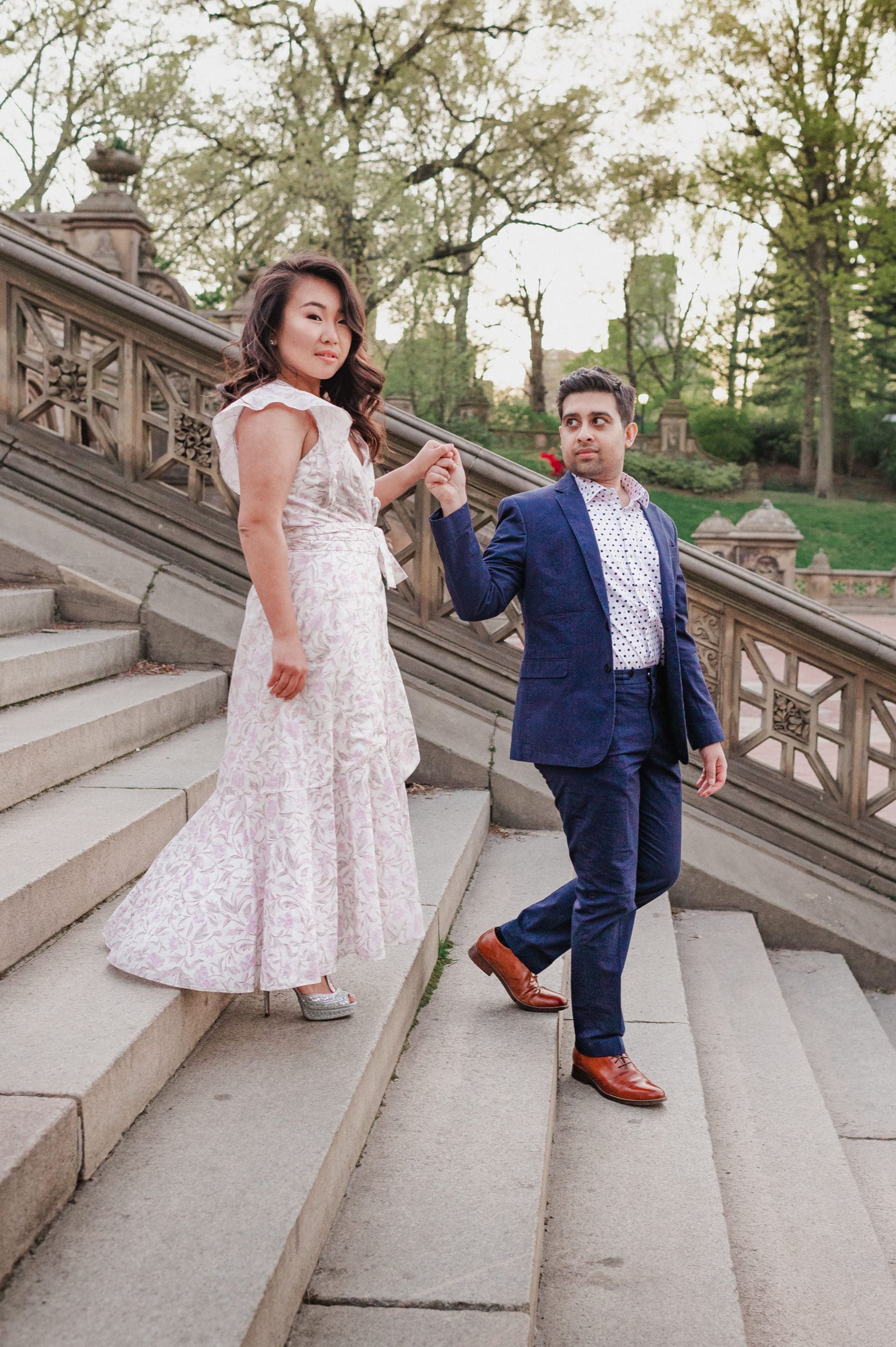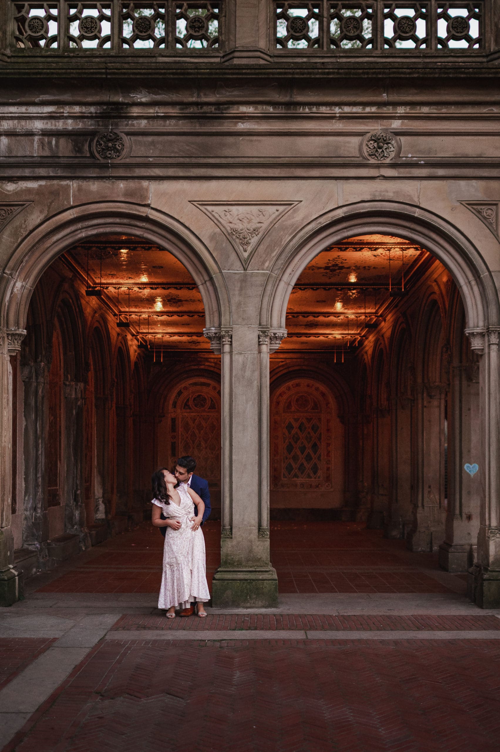 In the map below, these are the typical spots we can cover engagement photos within 90 minutes around Central Park. First, we started at the Loeb Boat House where the couple rented a rowboat for “The Notebook” style vibes. Next, we photographed near a willow tree with the iconic two towers and lake in the background. After, we walked over the Bethesda Terrace staircase and inside the beautiful terrace for dancing photos. The sun went down at the end of our shoot and we ended up at the Bow bridge for creative night portraits with off-camera flash, champagne shower and smoke bombs.