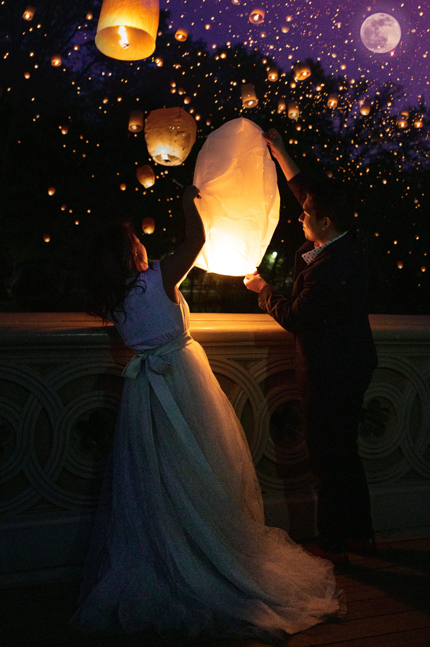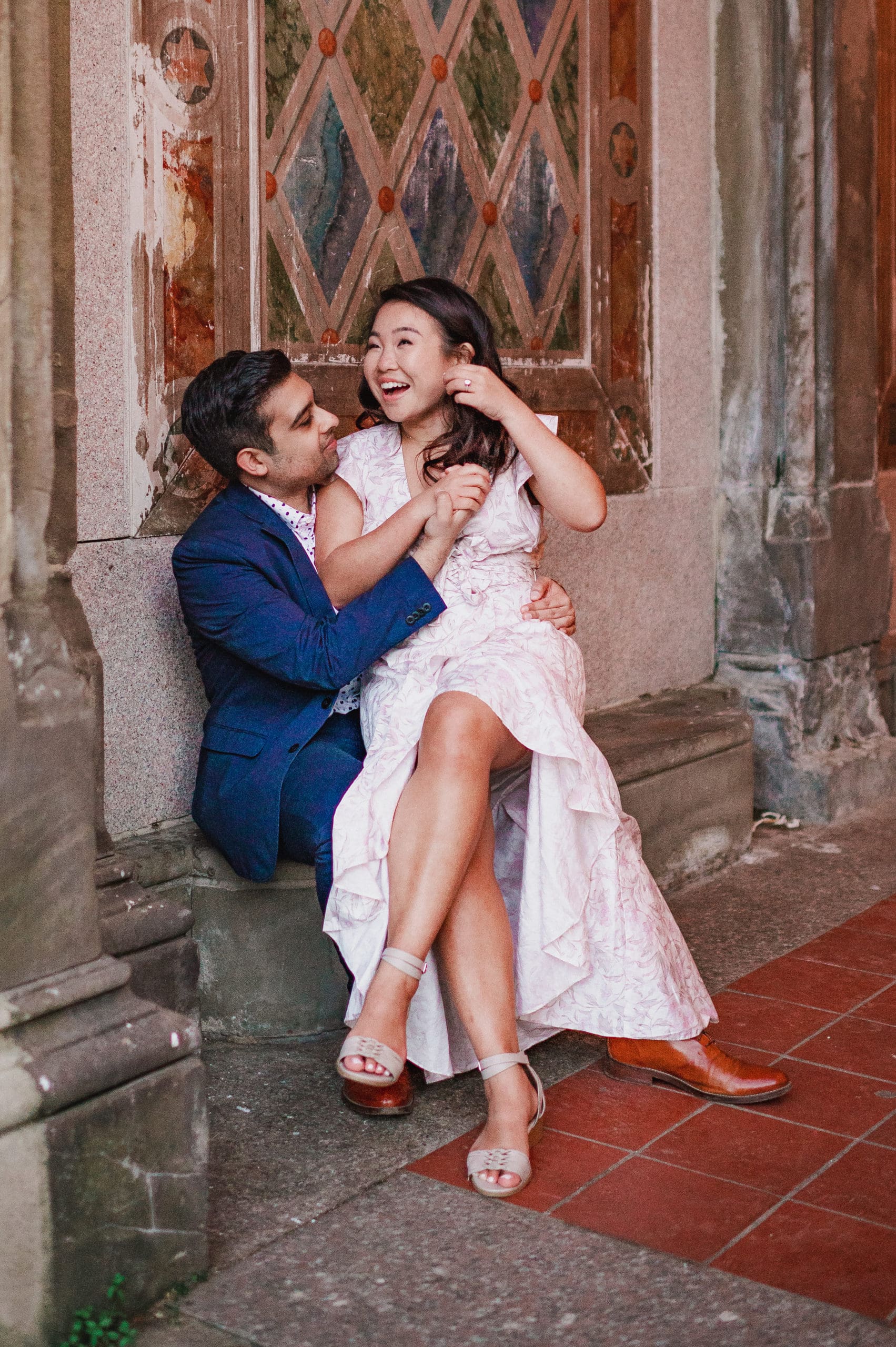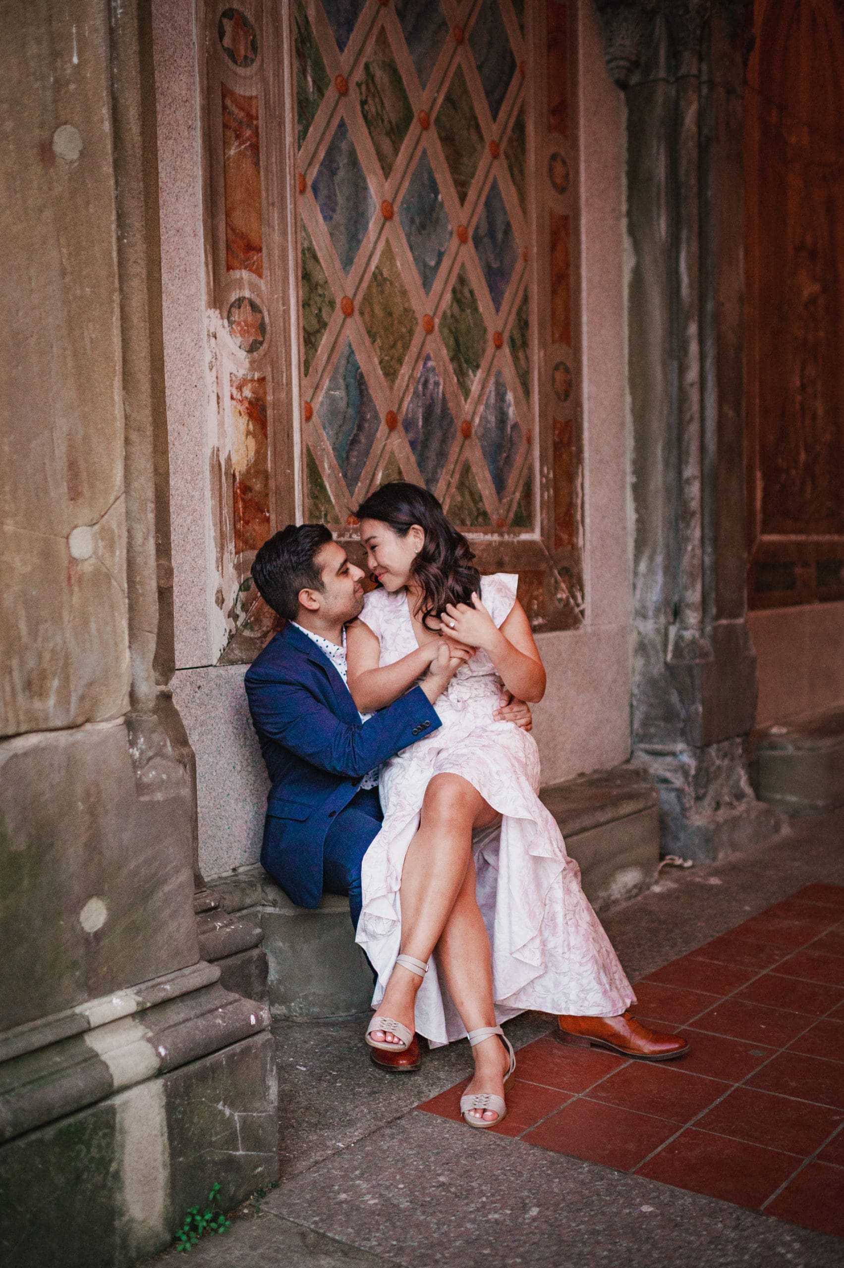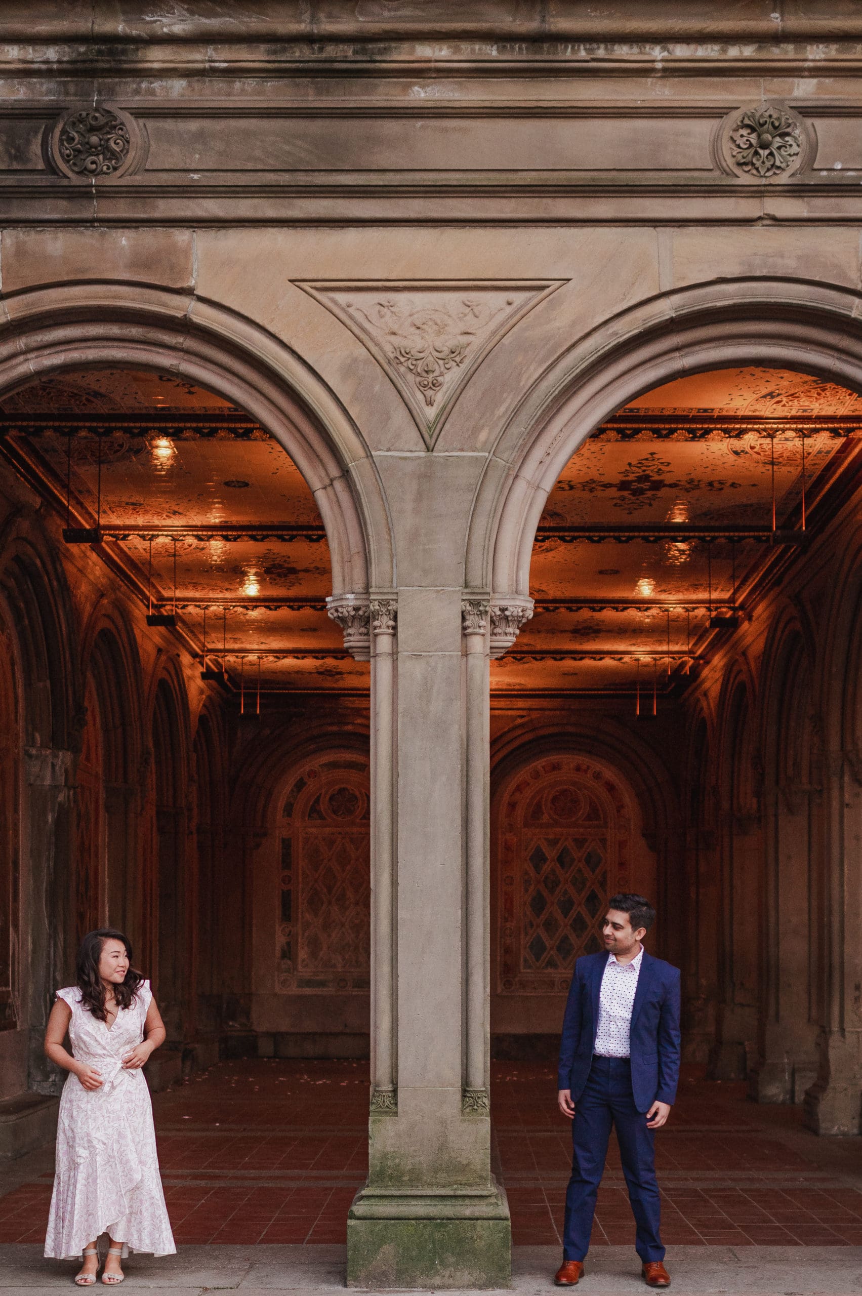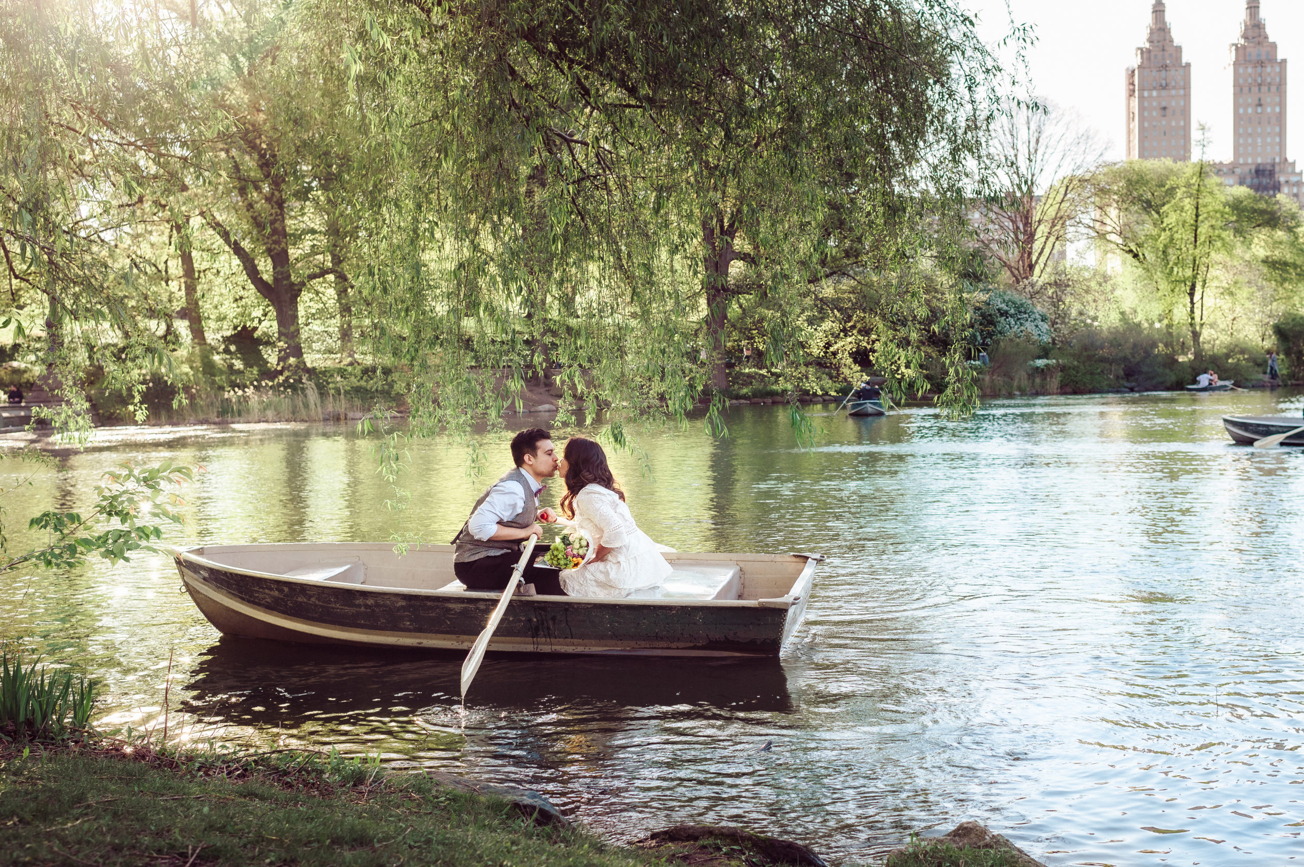 In the map below, these are the typical spots we can cover engagement photos within 90 minutes around Central Park. First, we started at the Loeb Boat House where the couple rented a rowboat for “The Notebook” style vibes. Next, we photographed near a willow tree with the iconic two towers and lake in the background. After, we walked over the Bethesda Terrace staircase and inside the beautiful terrace for dancing photos. The sun went down at the end of our shoot and we ended up at the Bow bridge for creative night portraits with off-camera flash, champagne shower and smoke bombs.