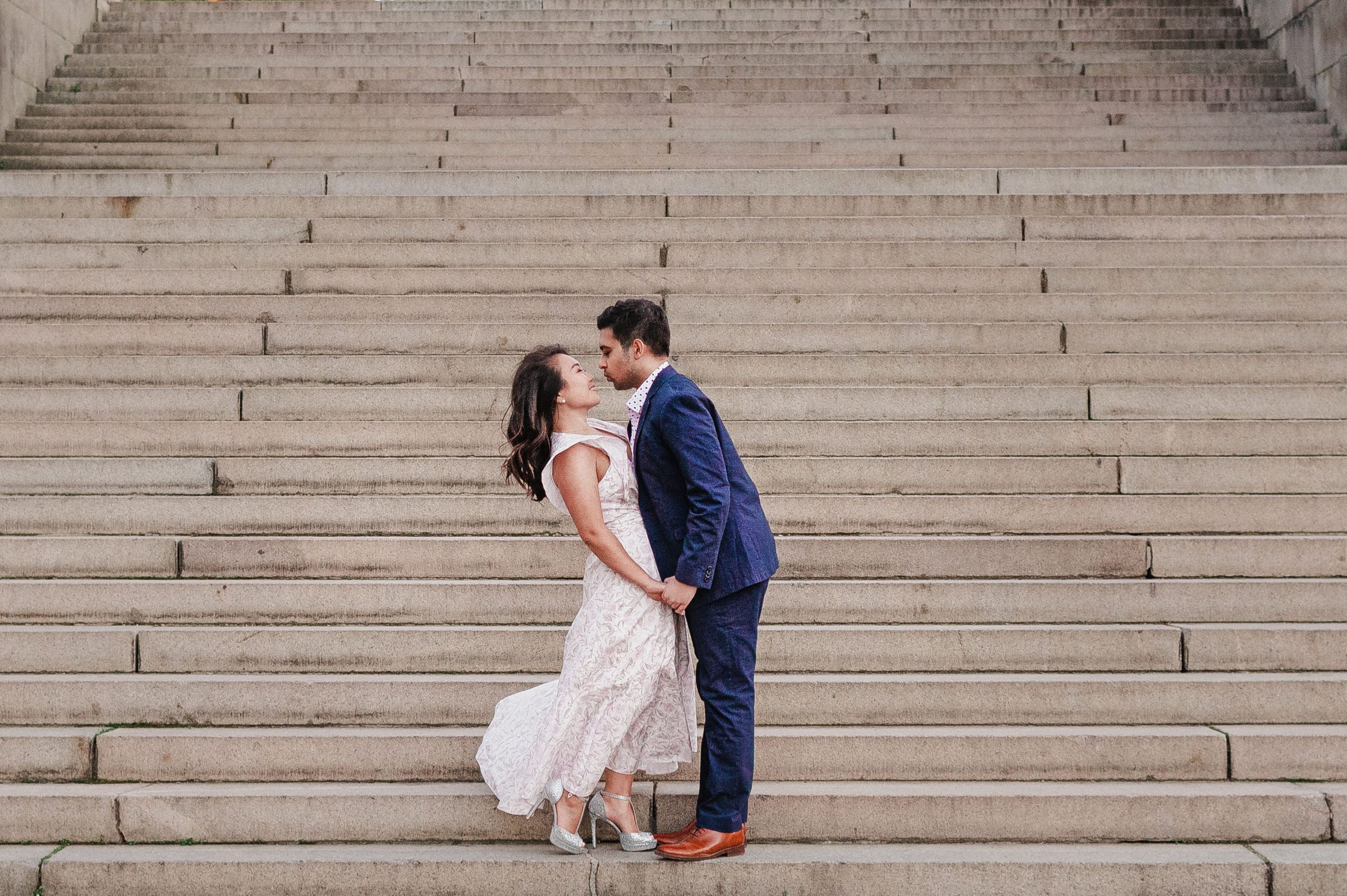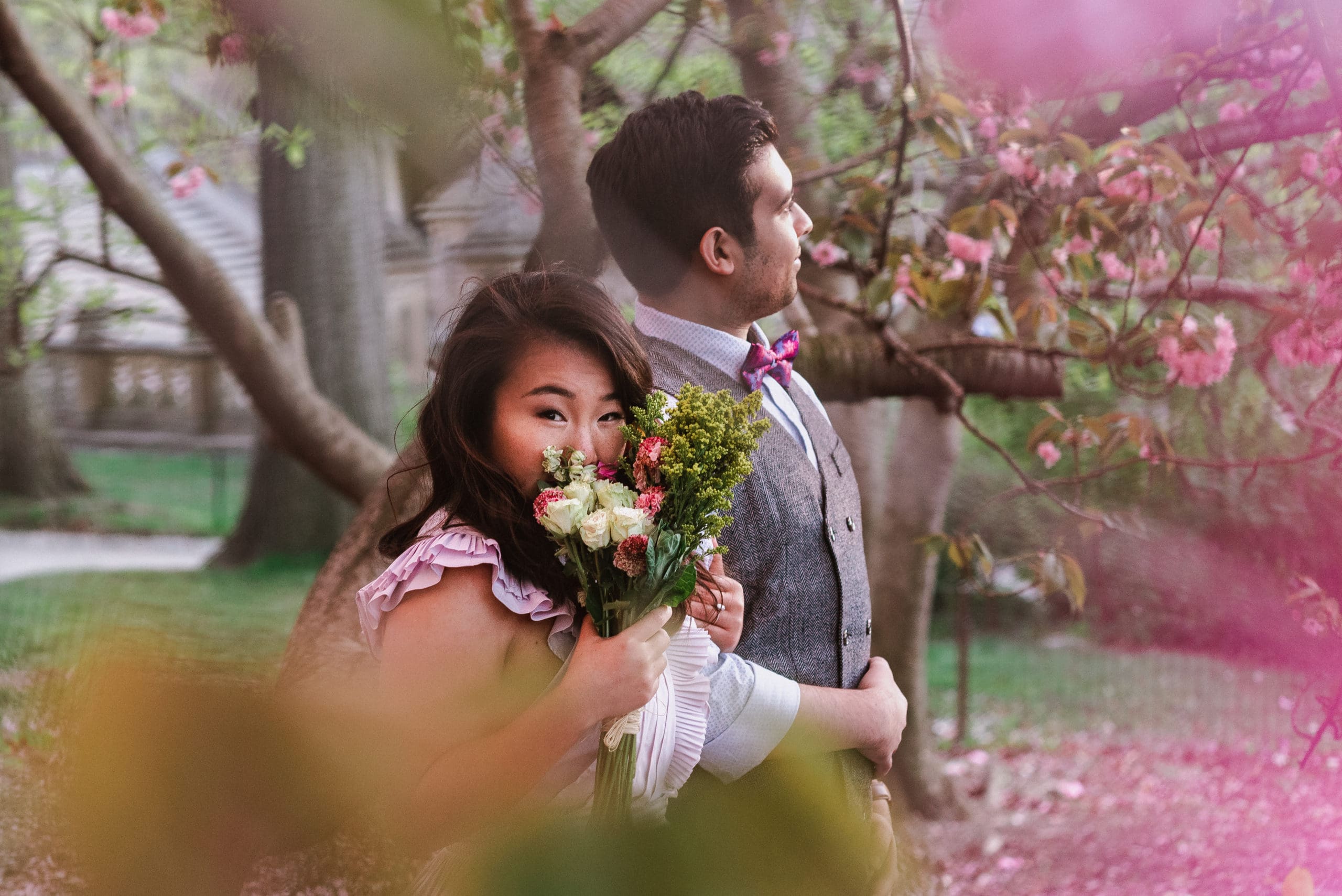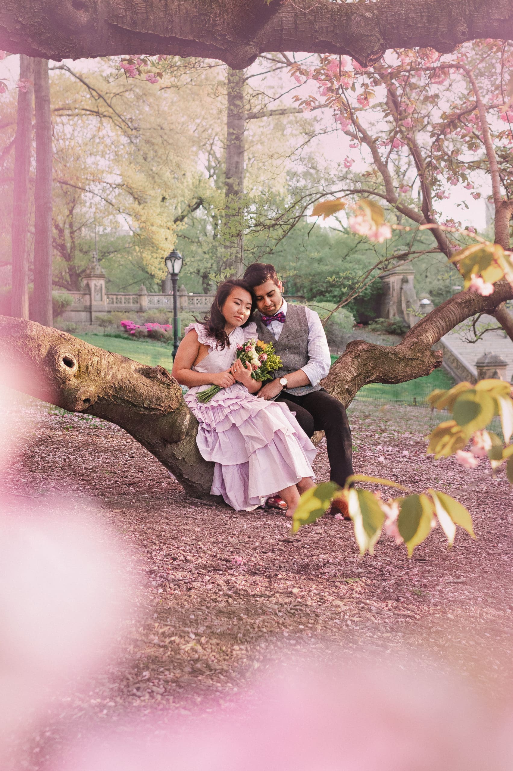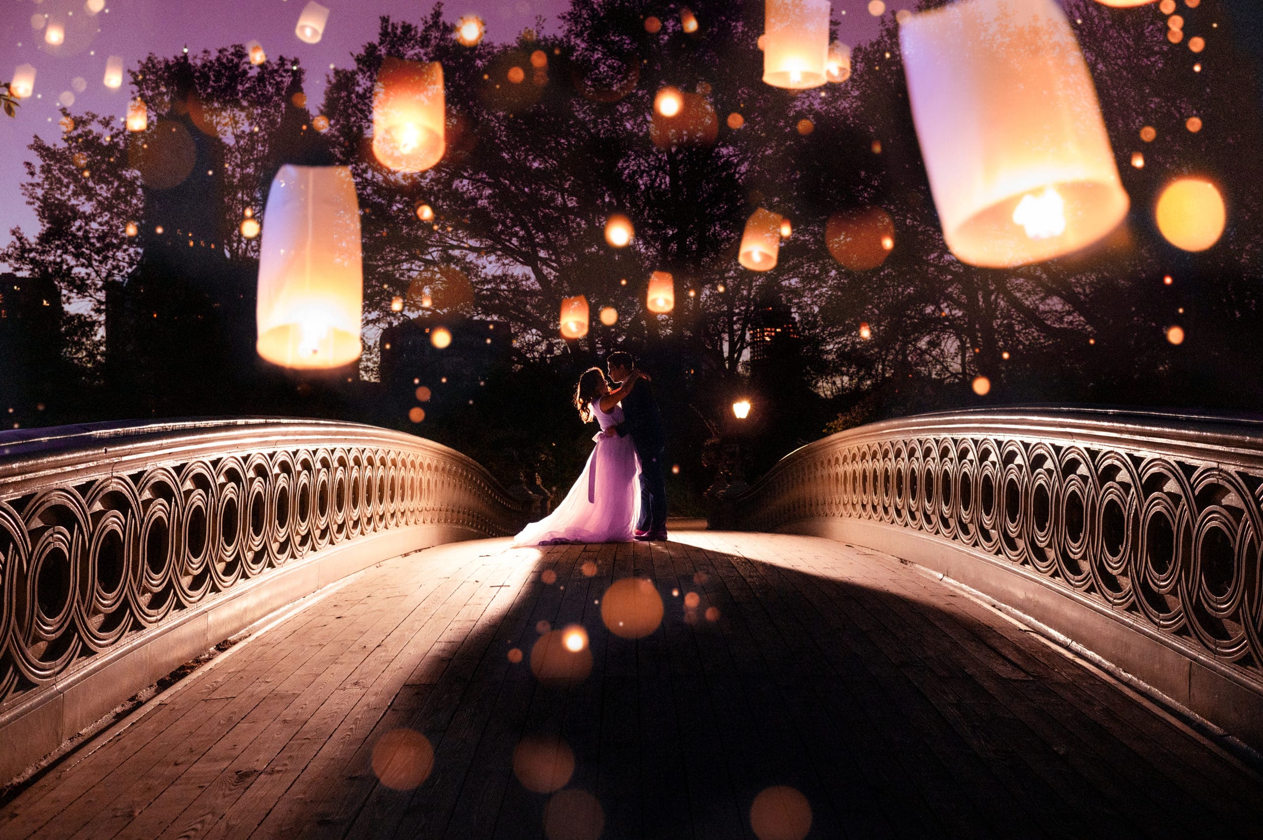 In the map below, these are the typical spots we can cover engagement photos within 90 minutes around Central Park. First, we started at the Loeb Boat House where the couple rented a rowboat for “The Notebook” style vibes. Next, we photographed near a willow tree with the iconic two towers and lake in the background. After, we walked over the Bethesda Terrace staircase and inside the beautiful terrace for dancing photos. The sun went down at the end of our shoot and we ended up at the Bow bridge for creative night portraits with off-camera flash, champagne shower and smoke bombs.