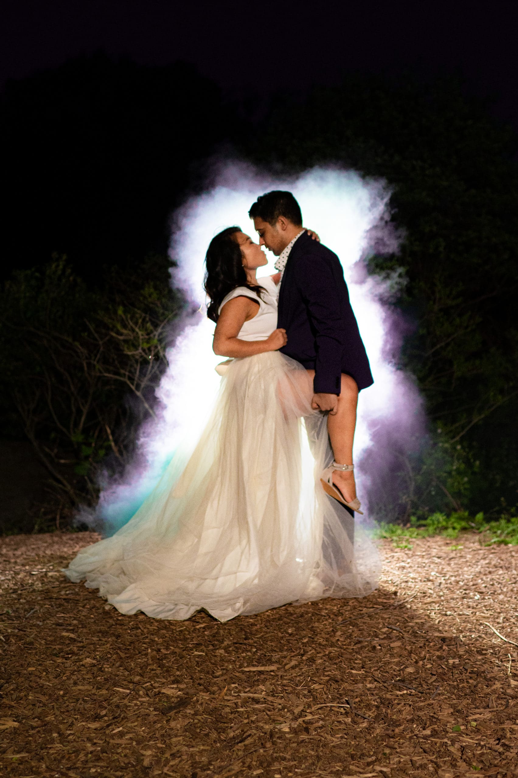 This couple wanted a smoke bomb photo inspired all over Pinterest! To do this, the couple purchased colorful smoke bombs from Enola Gaye. I had to set up an off-camera flash with a tripod about 4 ft behind them directed on their backs. The purpose of this is to light up the smoke behind them. Without the light, you will not be able to see the detail of the smoke. The best part of smoke bomb photography, you can do this at ANY time of day! Be careful as it is fire and to use smoke bombs with gloves and away from dry brush! Water nearby to extinguish is key. Below you will find how I shot it and a cool gif from the creative smoke bomb photography session.