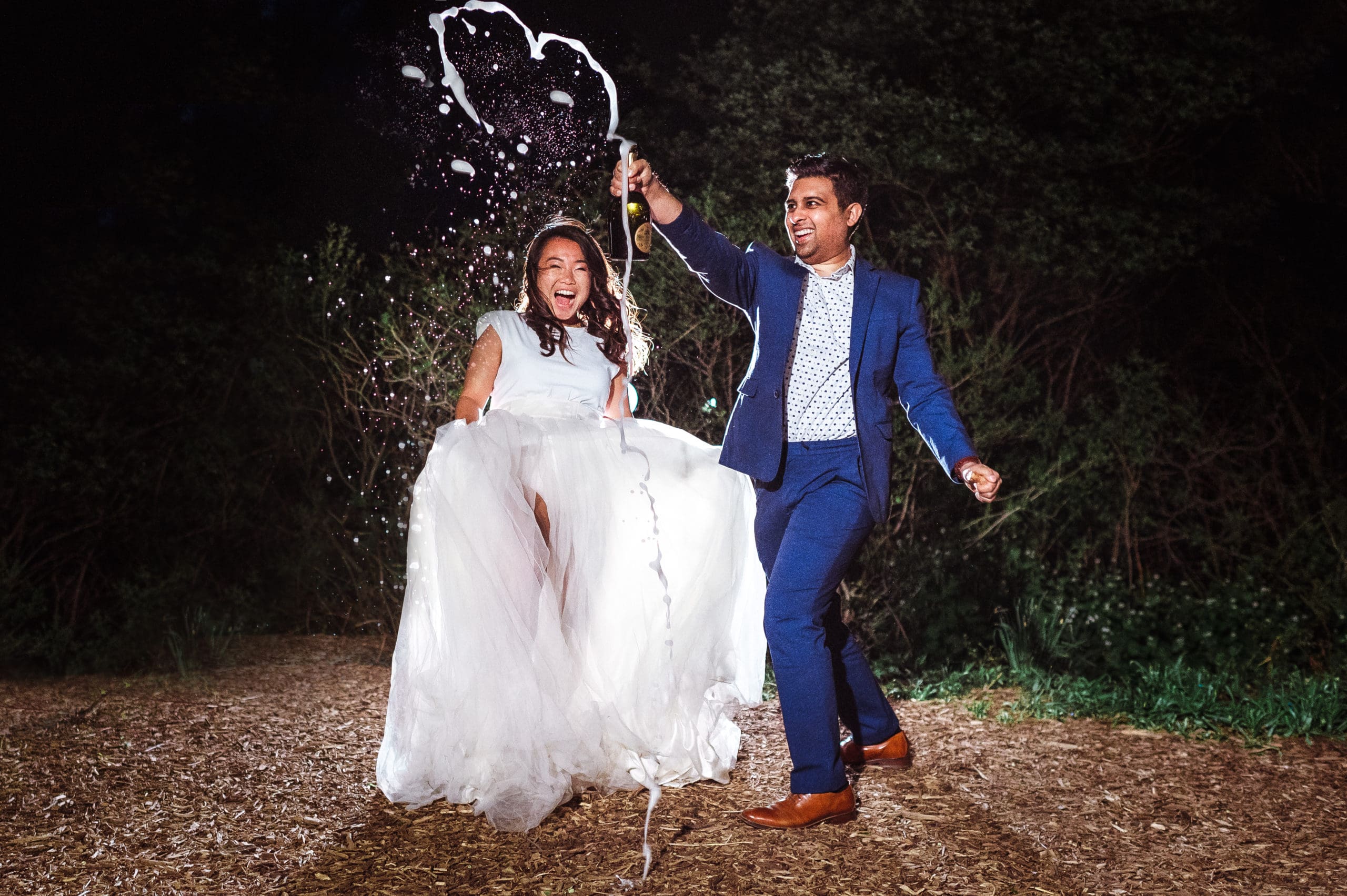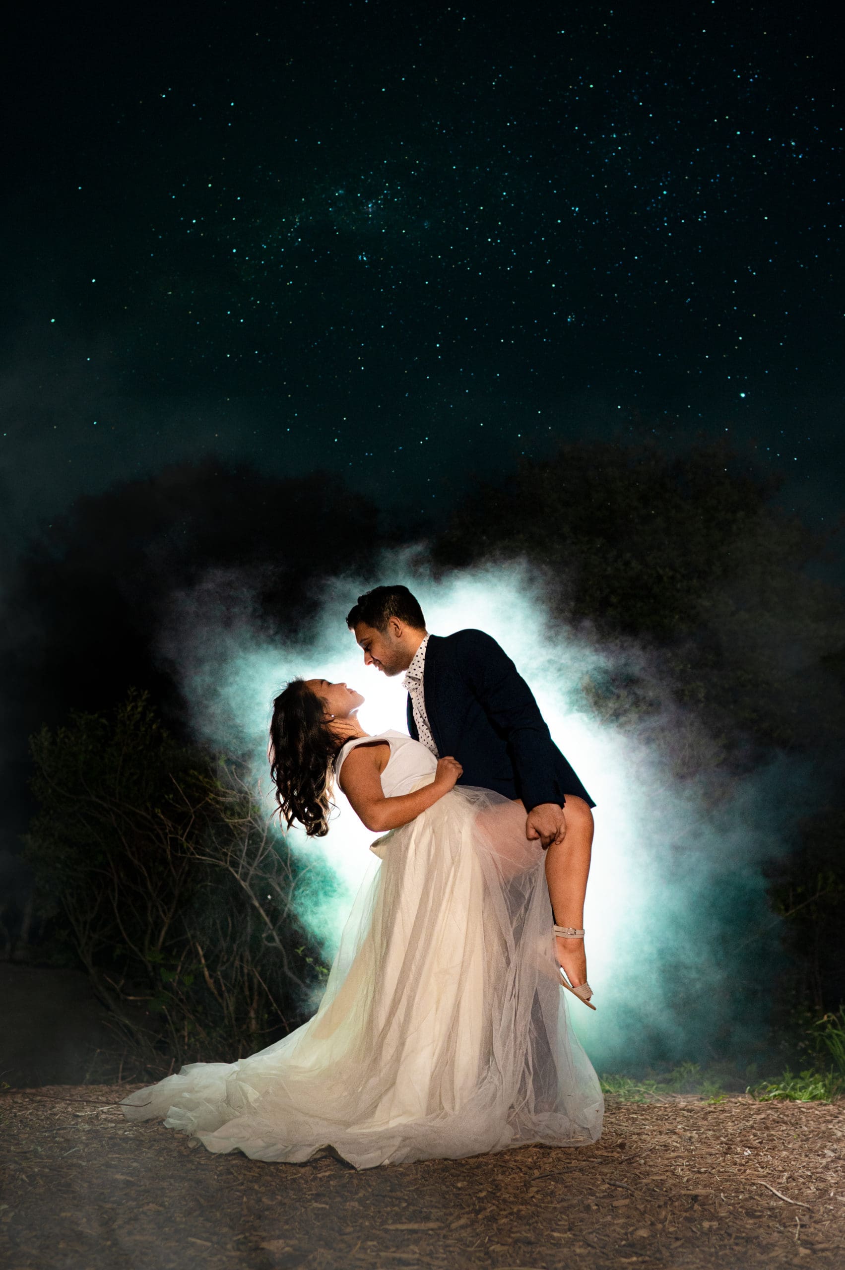 This couple wanted a photo where they belonged in the live-action Disney film, Aladdin. So I had my assistant and the couple’s family member help hold up a white sheet and I had a tripod to capture multiple shots to composite onto a genie/lamp photo I bought rights to on Shutterstock. Check out the behind-the-scenes video below!