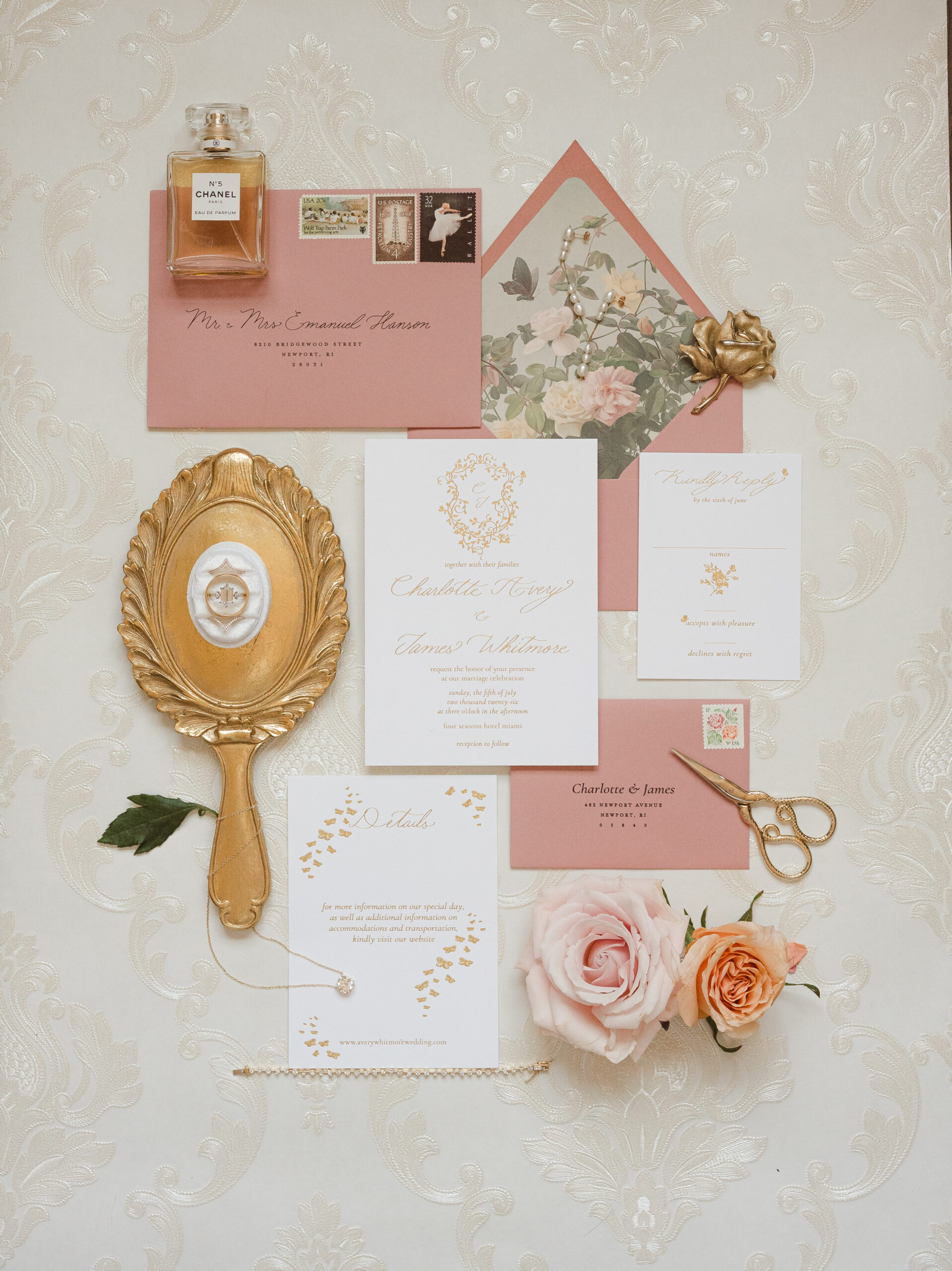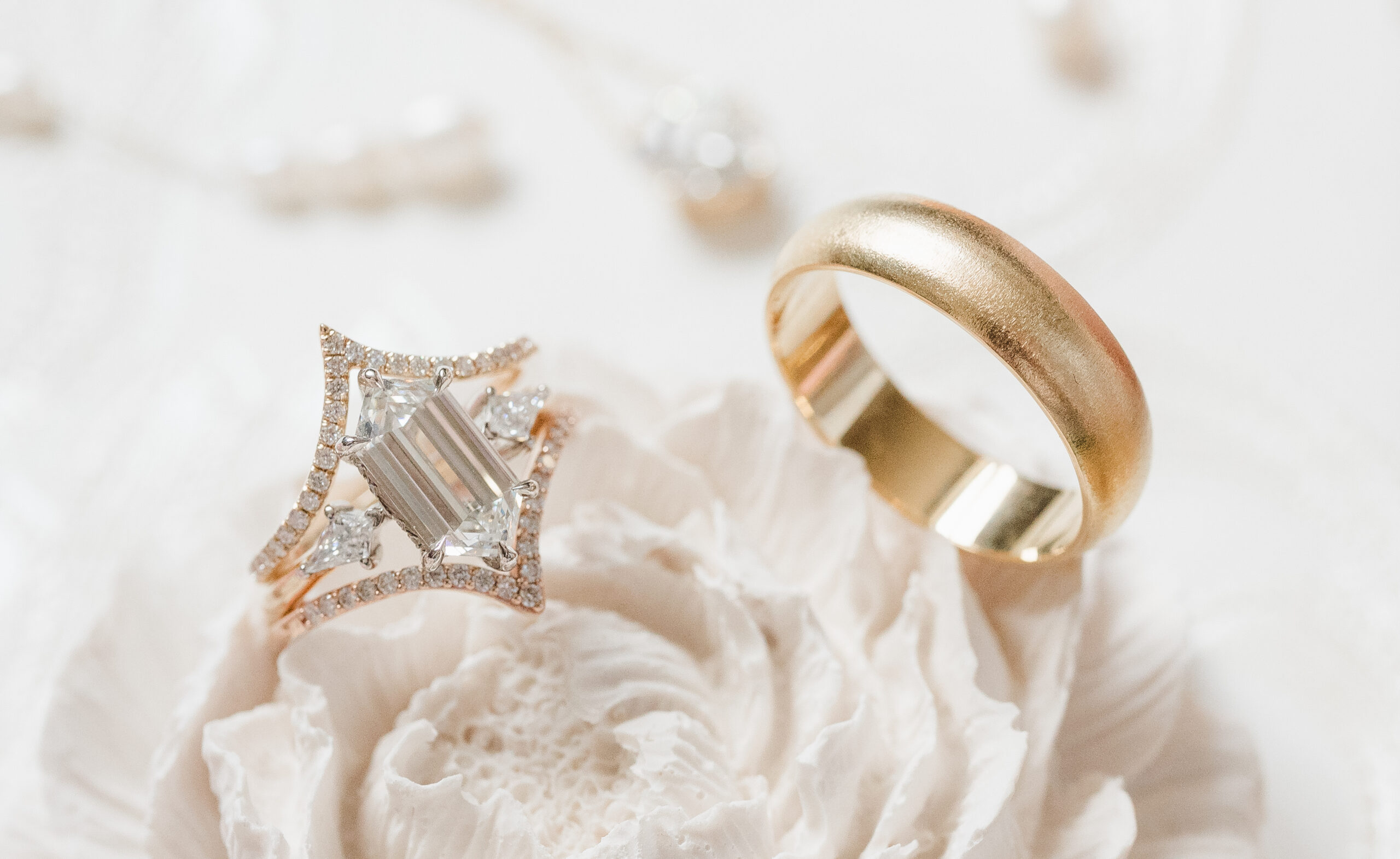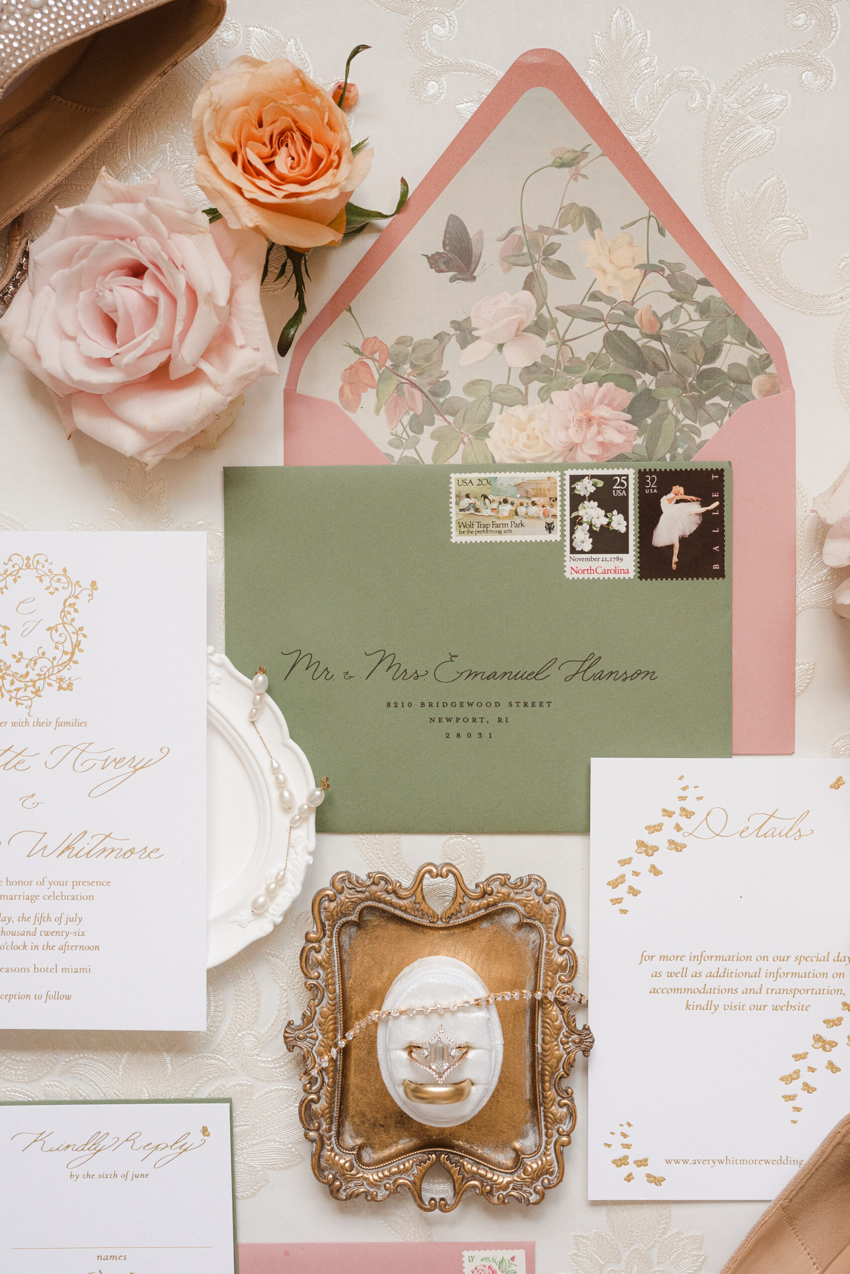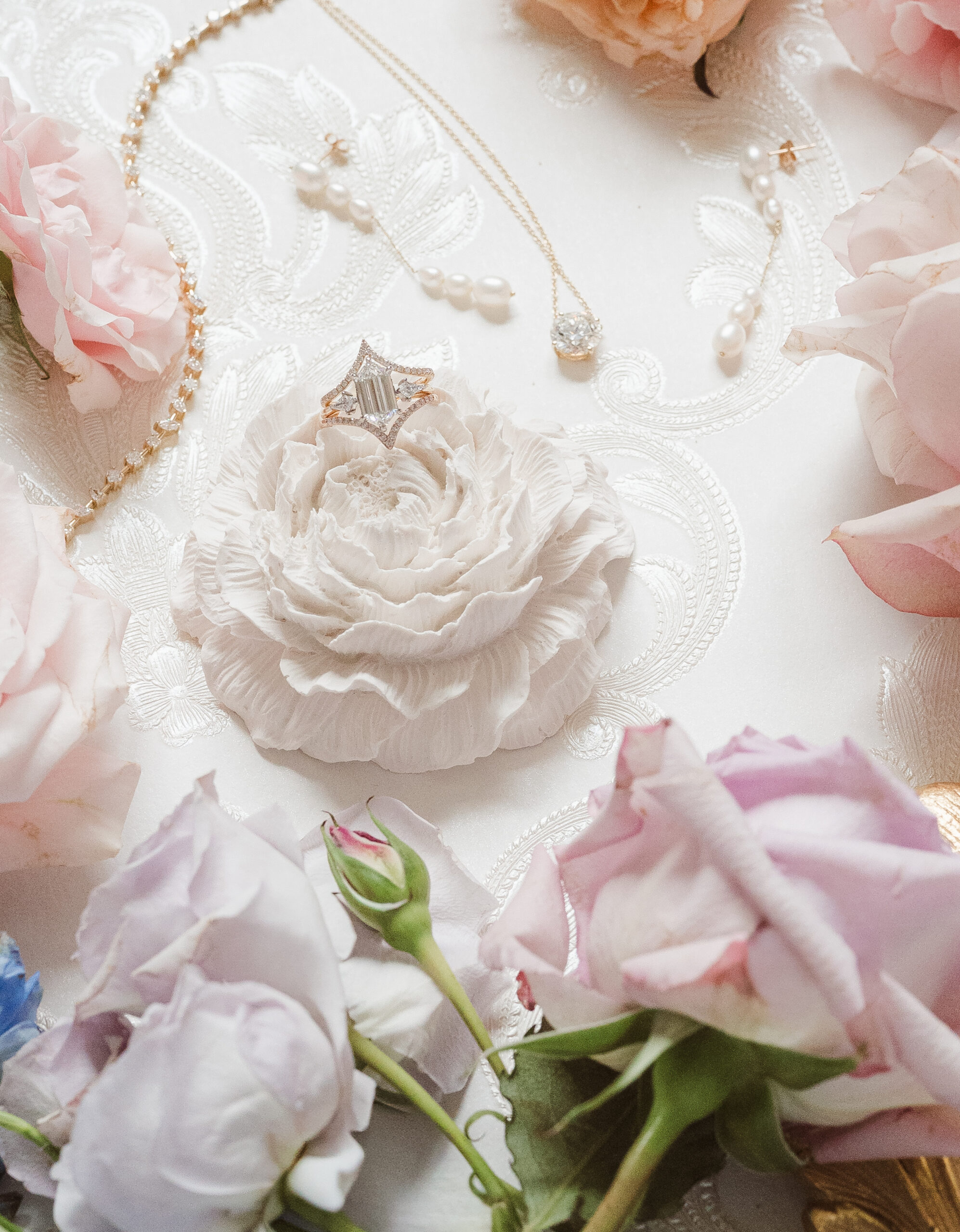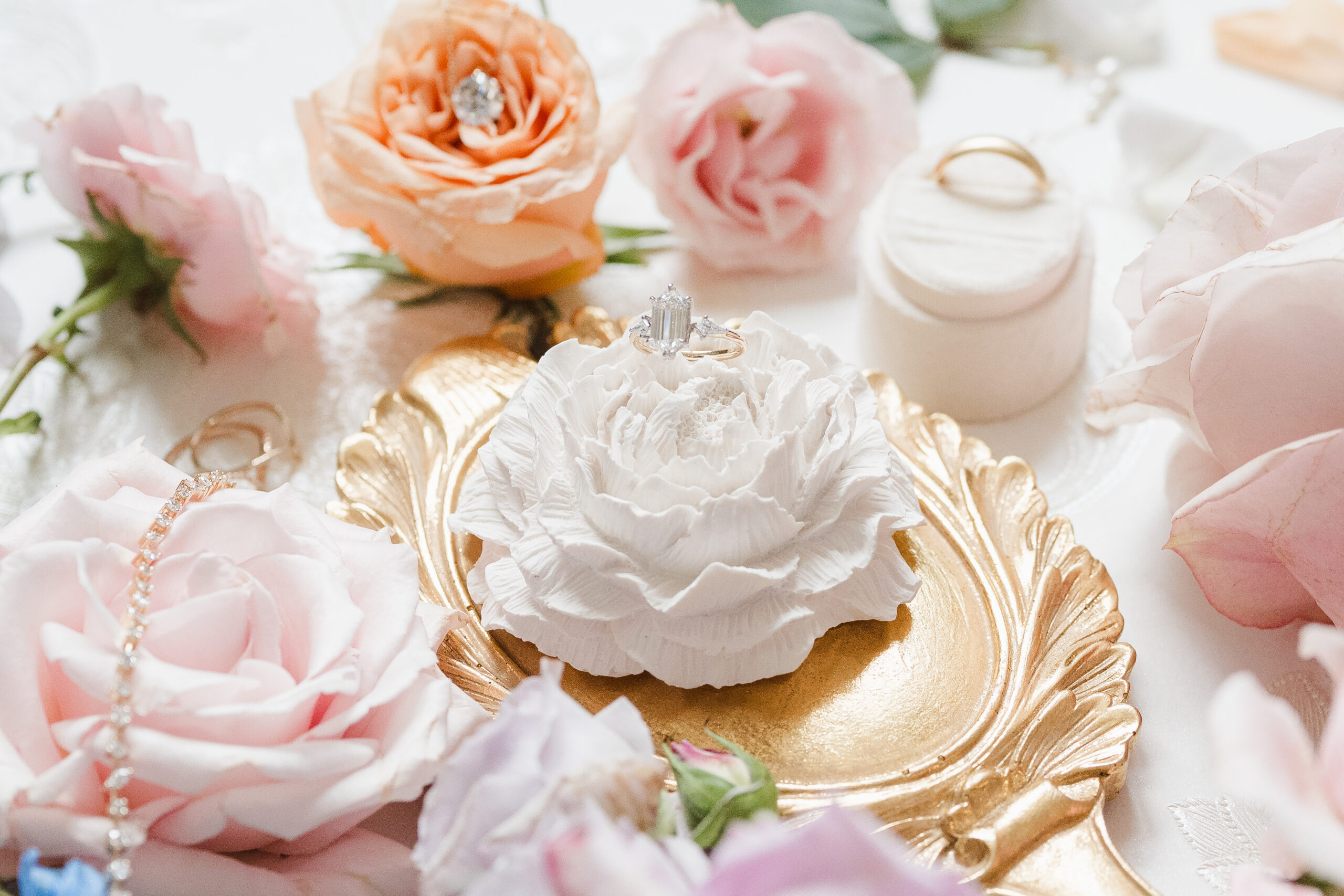 The last piece to this photo shoot (puzzle) was getting my favorite custom wedding jewelry designer, Kerry at Love Locked. I am/was humbled with gratitude as she trusted me with some of her prized custom pieces made of real gold and diamonds. Love Locked is known for making custom whimsical, modern and ethereal wedding jewelry for brides and grooms. I was able to capture some photos including their custom rings, a diamond tennis bracelet and pearl drop earrings that photographed perfectly with the vintage flat lay featuring Covenant Calligraphy pink and green invitation suites.