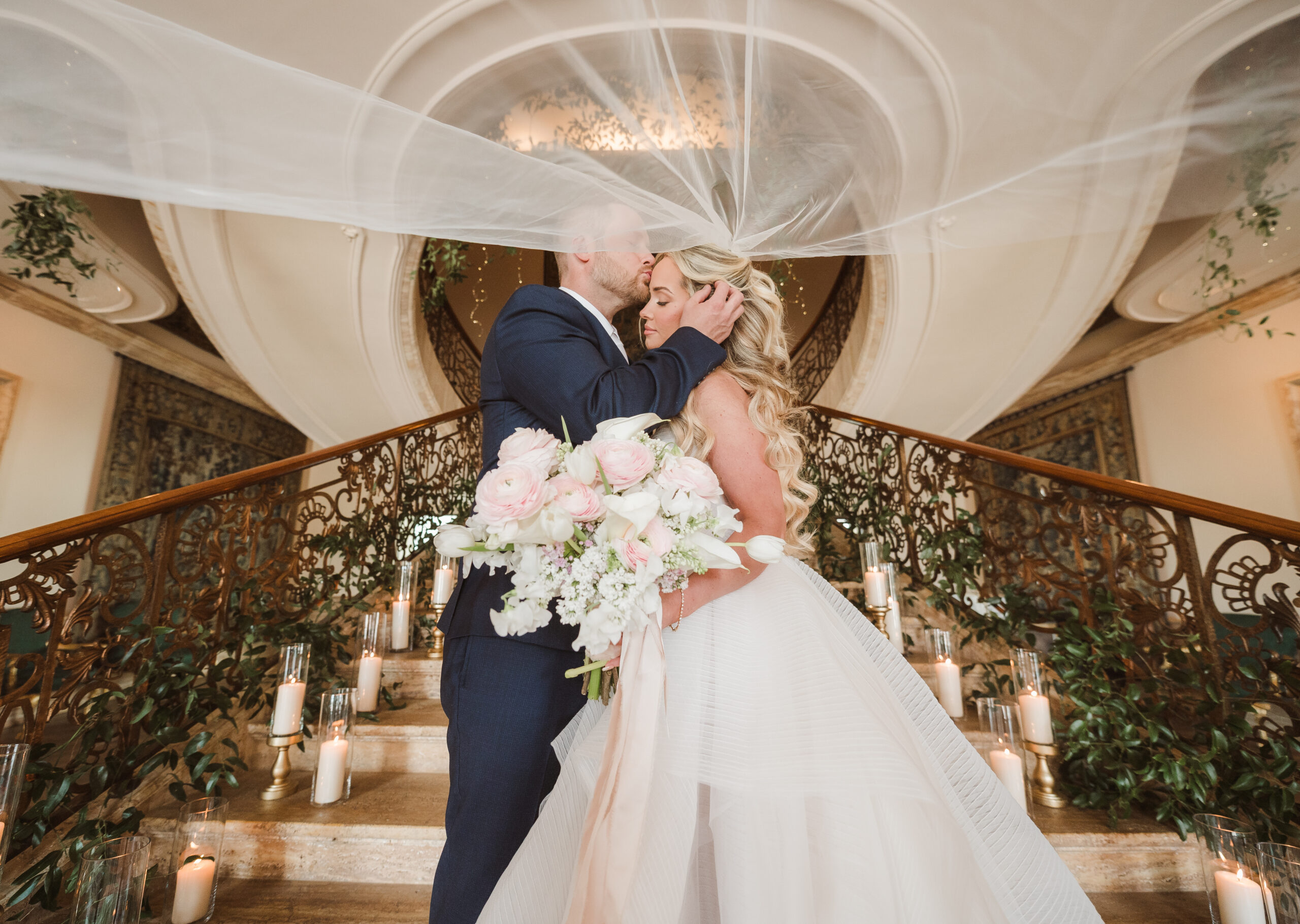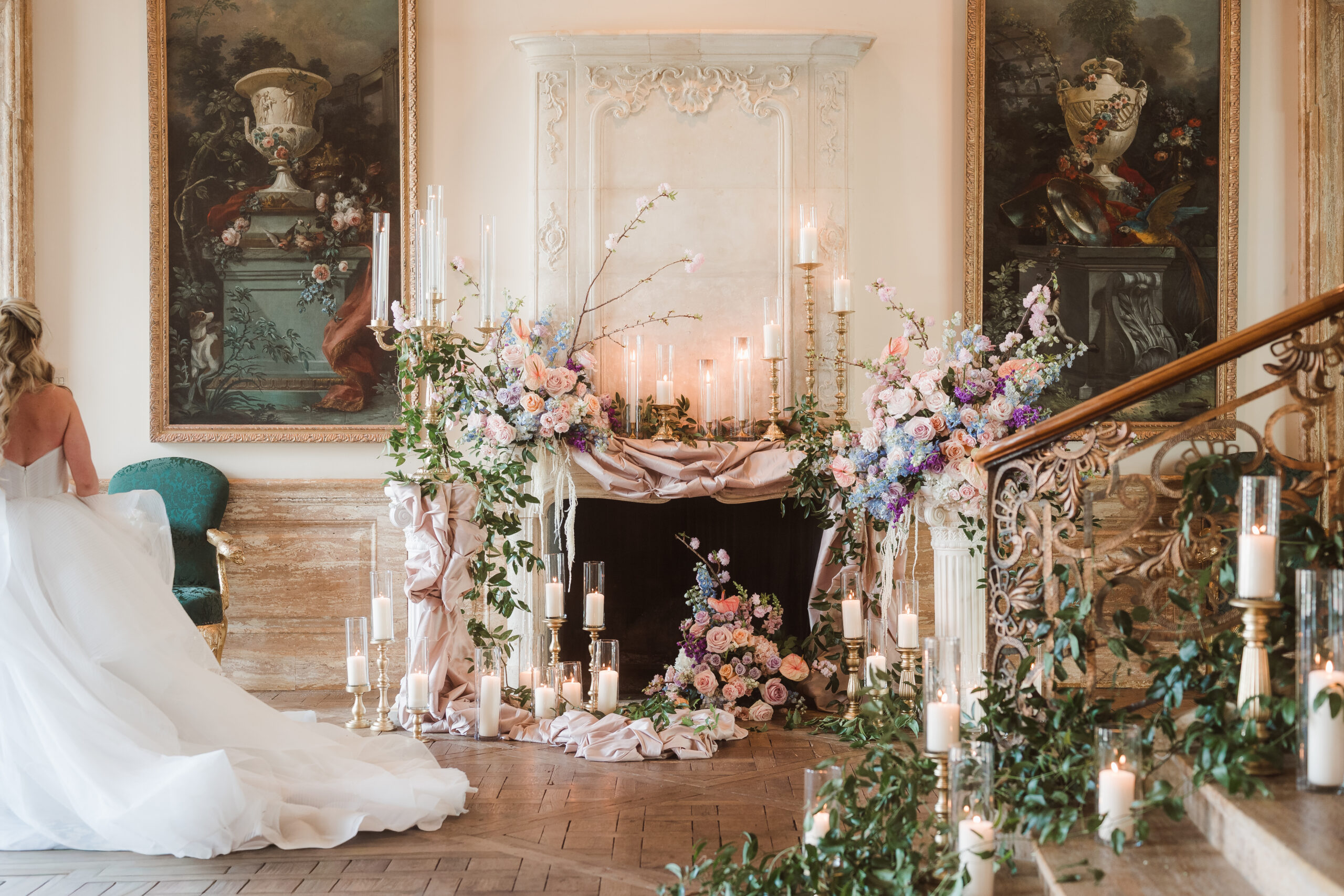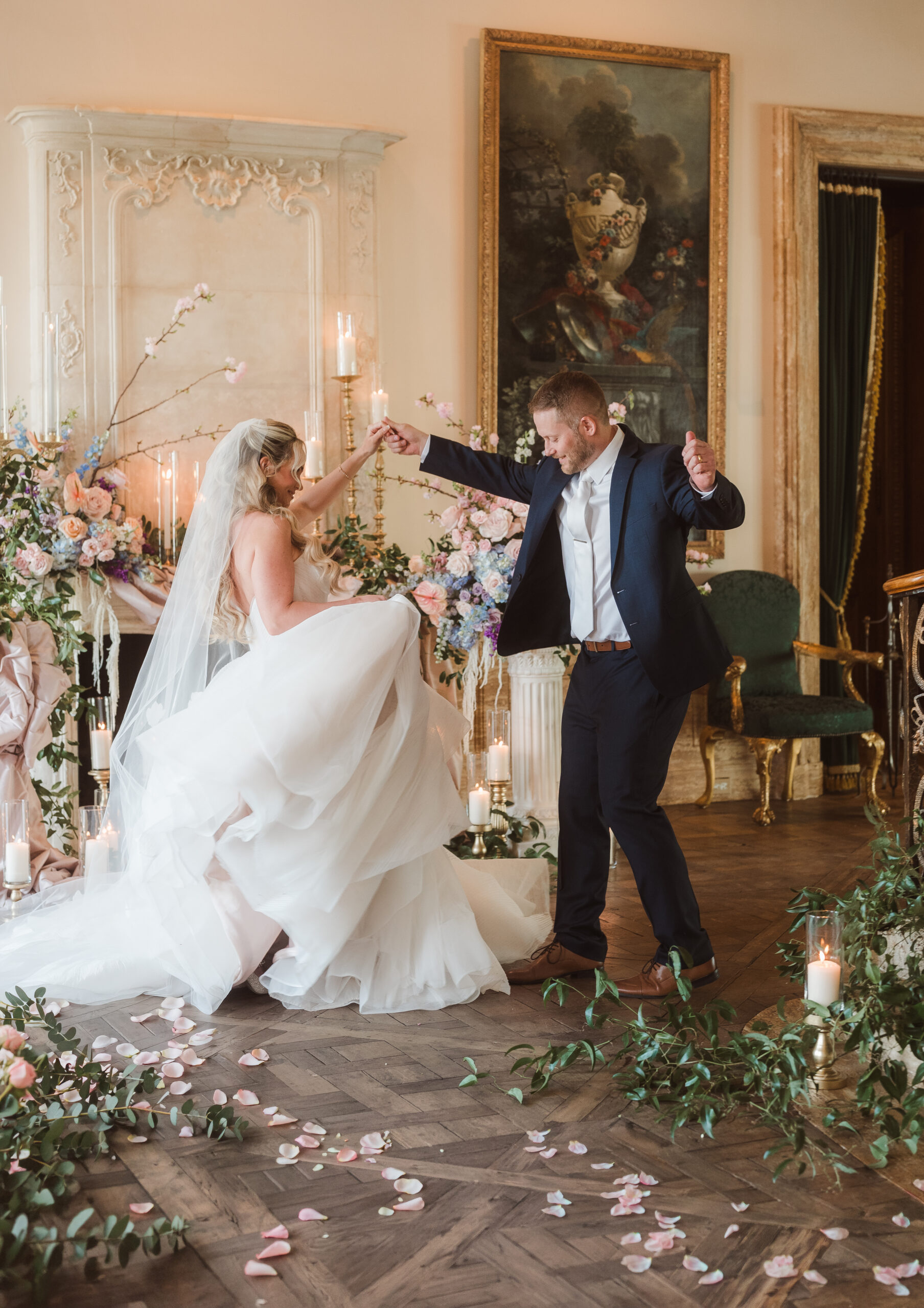 Find inspiration in a spring wedding set at a historic Princeton mansion like Jasna Polana, where pastel tones, fresh greenery, and candlelight come together to create a soft, romantic atmosphere. Picture delicate florals, glowing light as the sun sets, and a flowing gown that moves effortlessly. The entire setting feels timeless, elegant, and straight out of a fairytale.