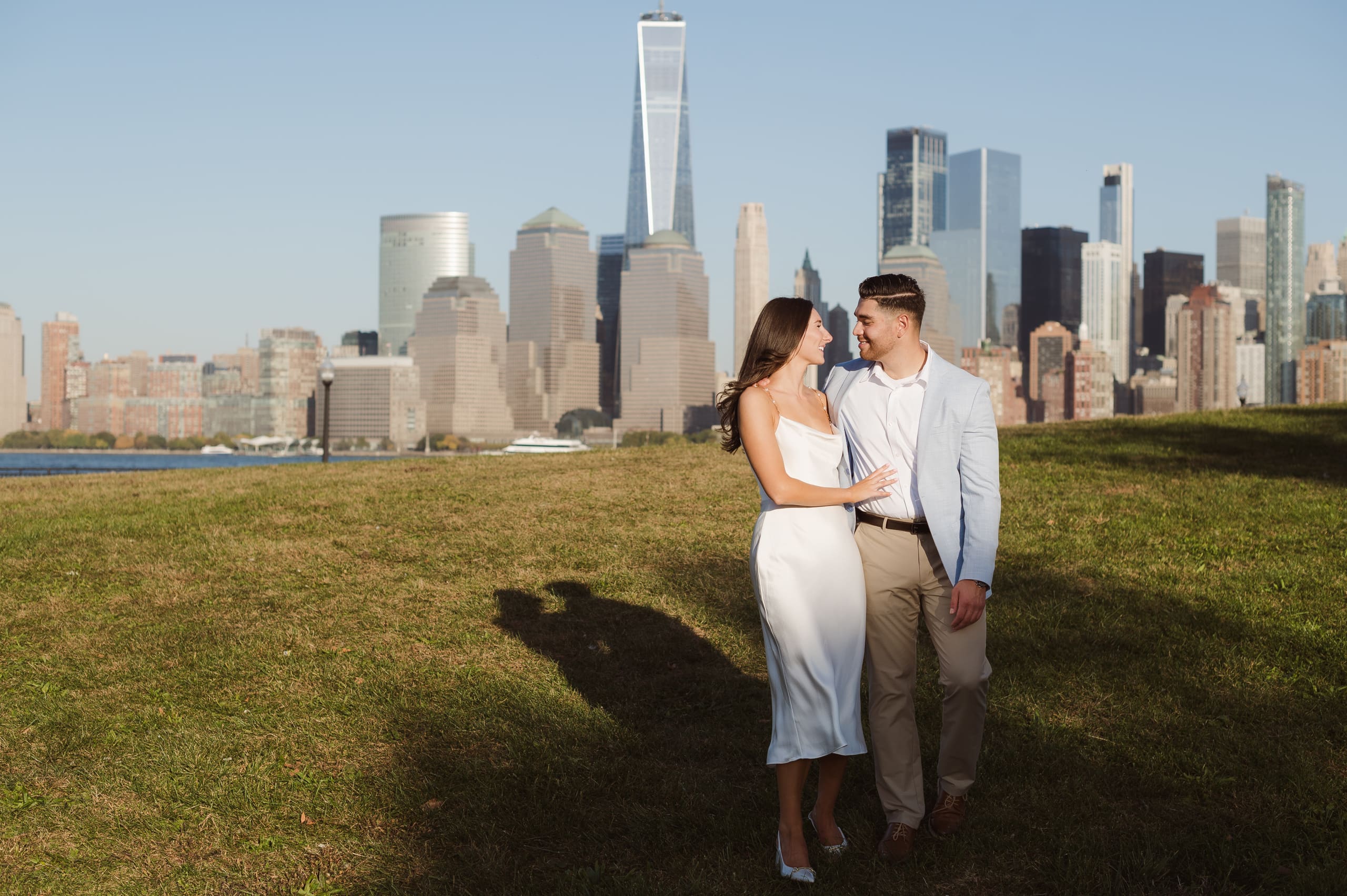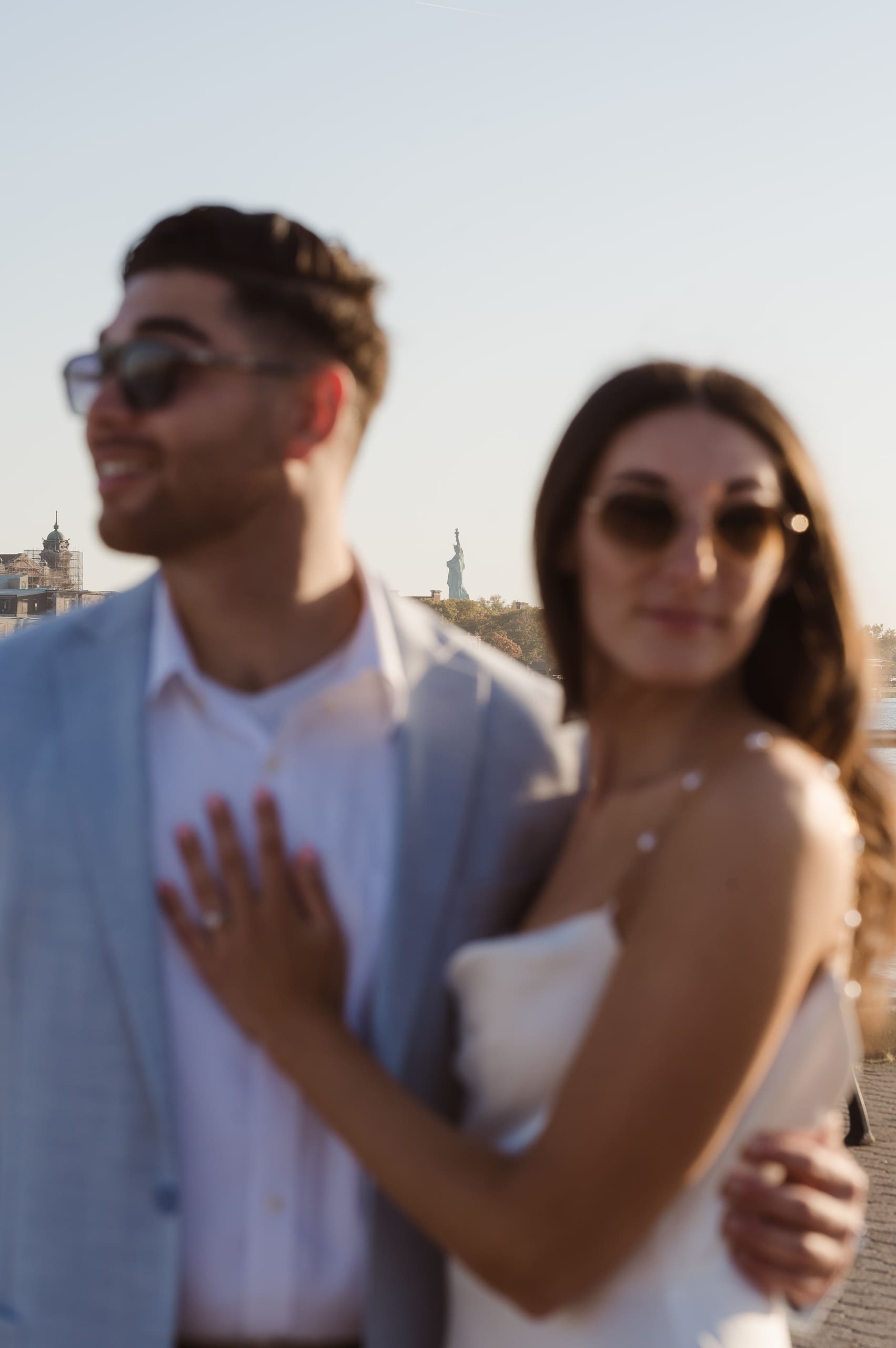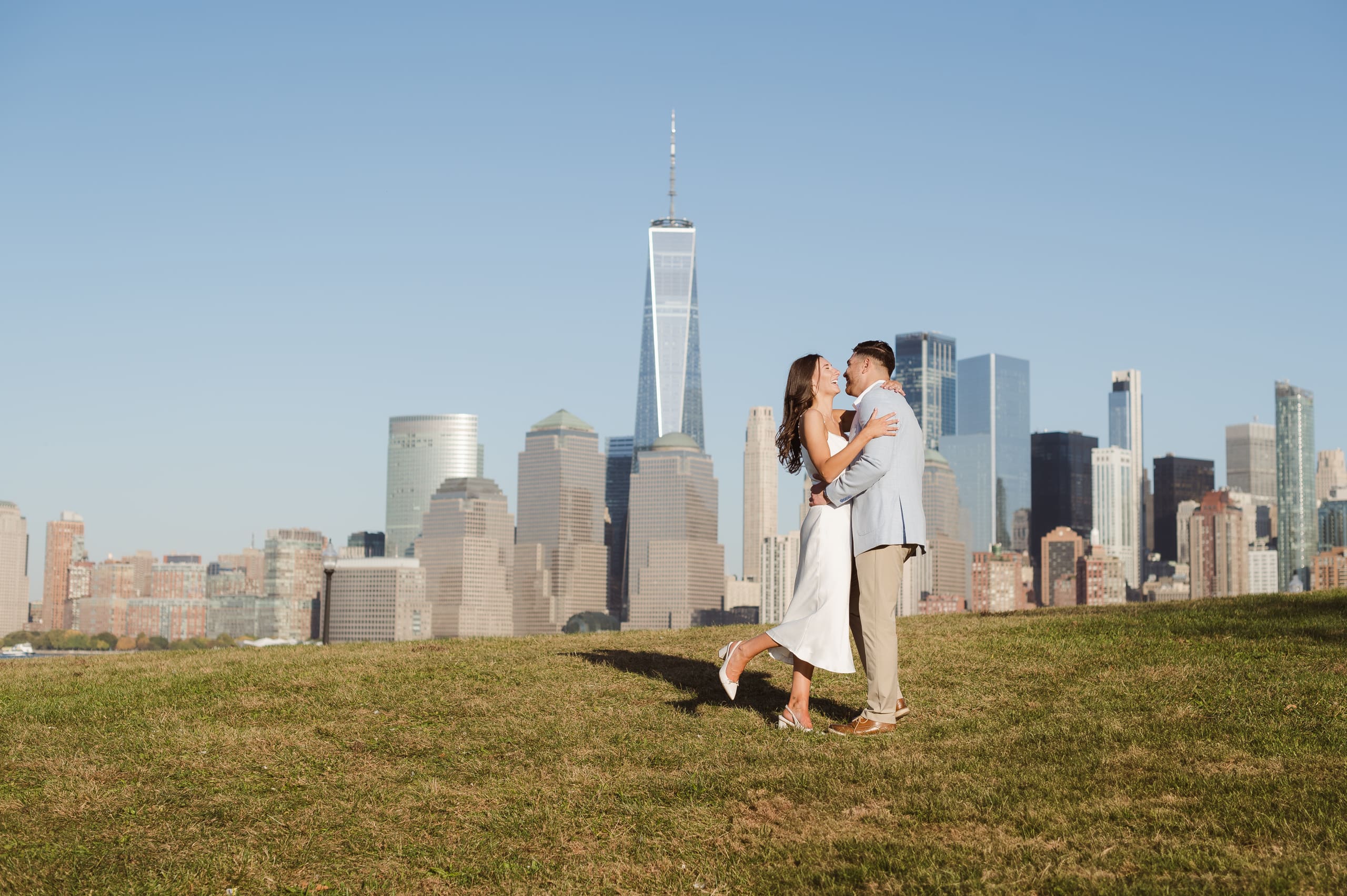 To wrap up the session, we celebrated their engagement by popping a bottle of champagne, sharing a delightful picnic under the warm golden hues of the sunset, and enjoying some spontaneous dancing to commemorate this special moment in their lives. It was a perfect way to encapsulate their love story against the stunning backdrop of the Manhattan skyline and the serene beauty of Liberty State Park.