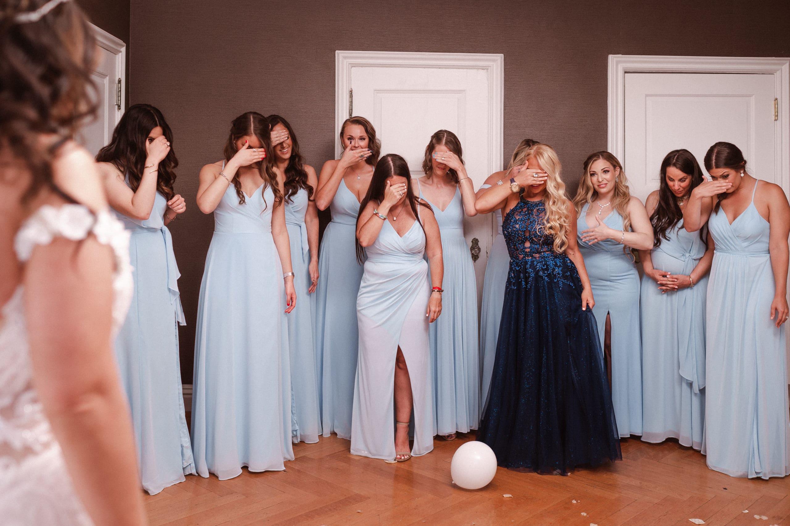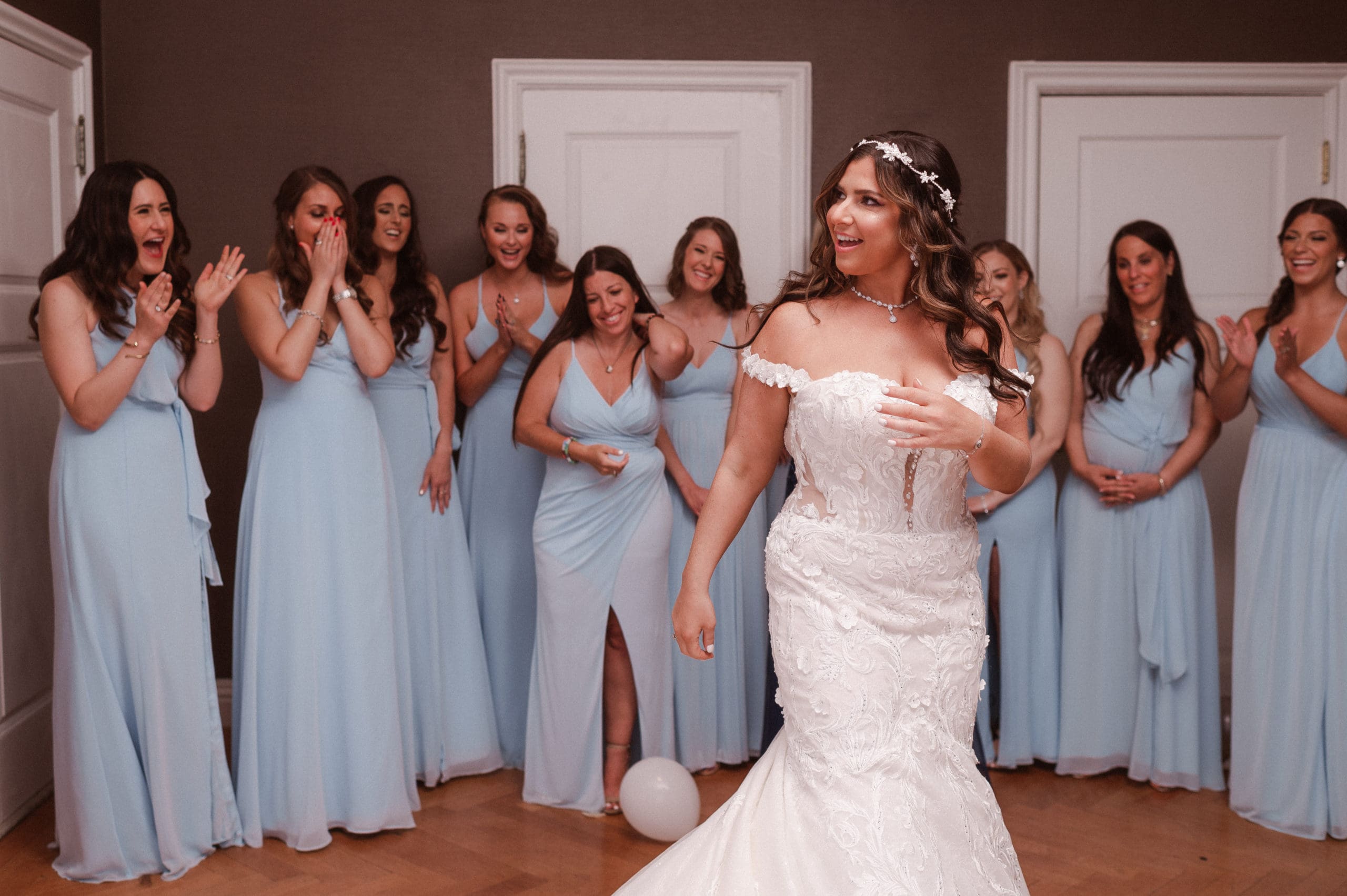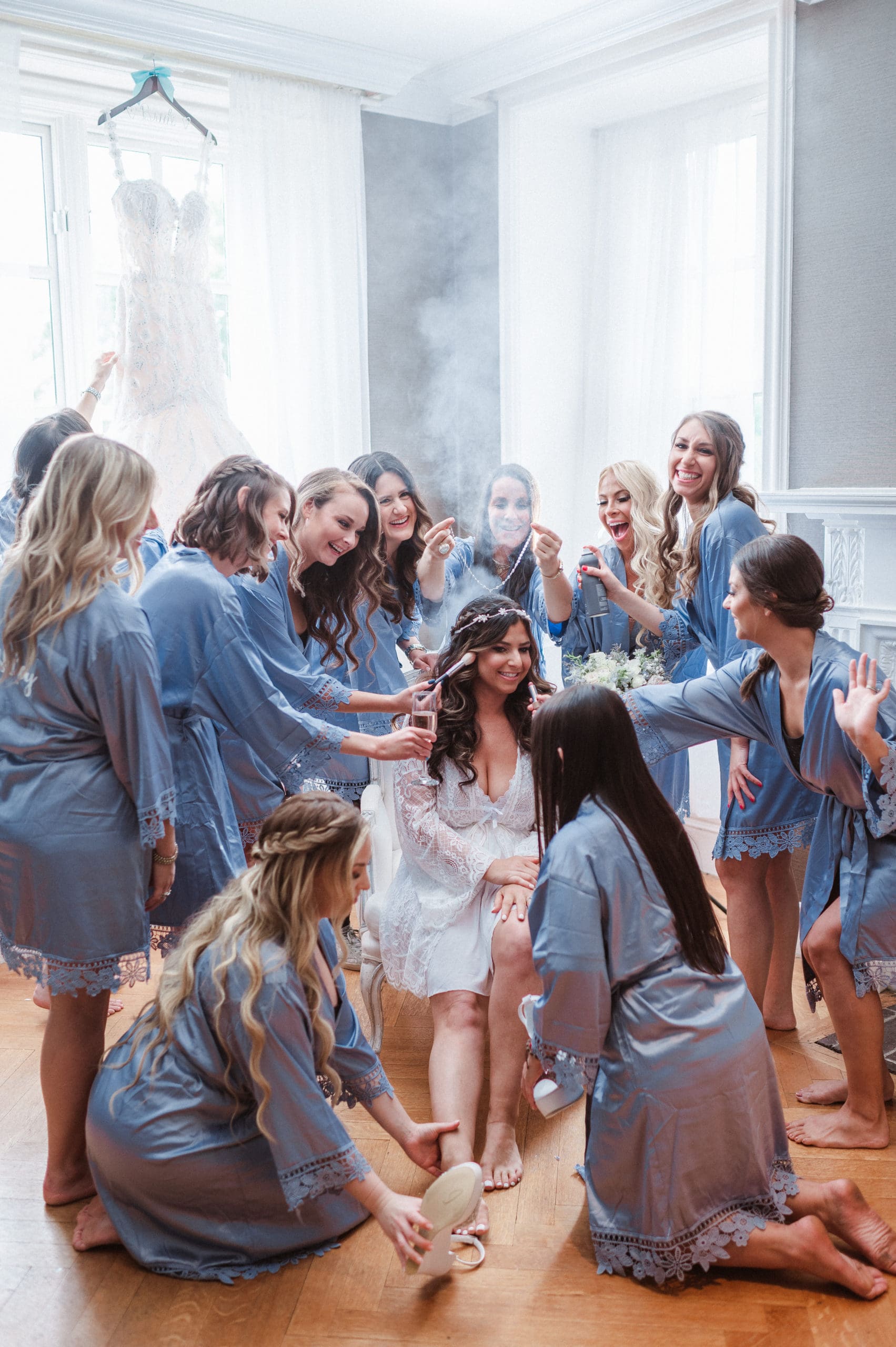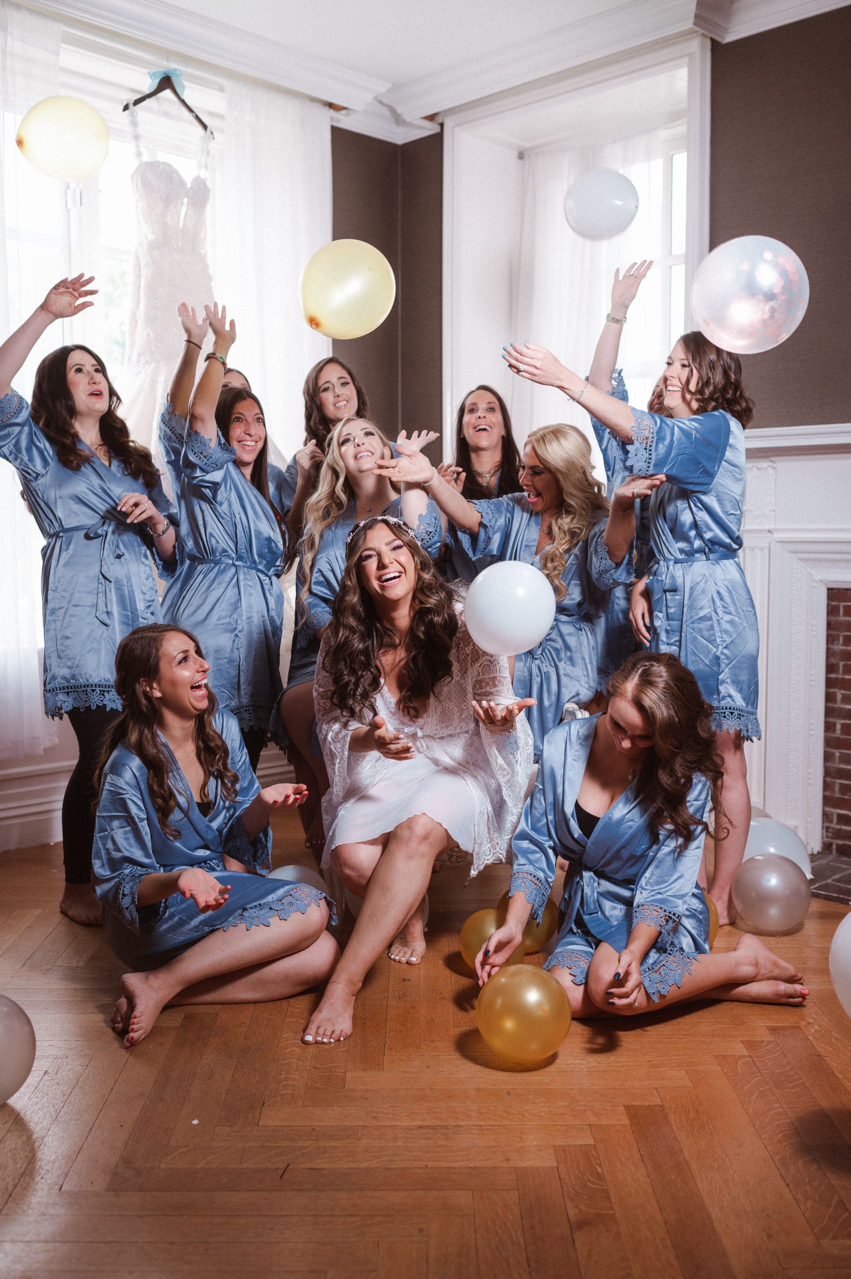 I arranged 2.5 hours of bridal prep portraits as the bride had extra personalized requests to document on her wedding day. She wanted bridal portraits in robe, creative portraits with her bridal party of 12, first look with family and bridesmaids, photos with her puppy, opening a gift from her groom, and bridal boudoir portraits. I could have easily added an extra half hour for this – but we were able to get it all done in time for the first look with her groom outside the glen cove mansion.