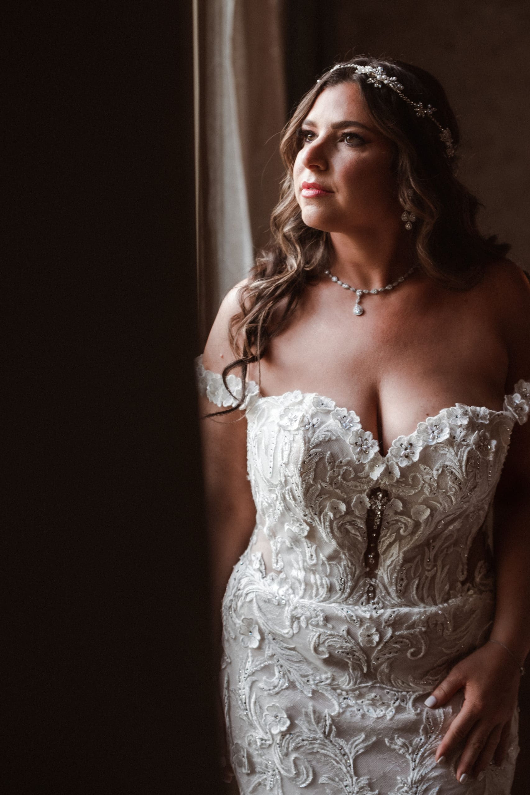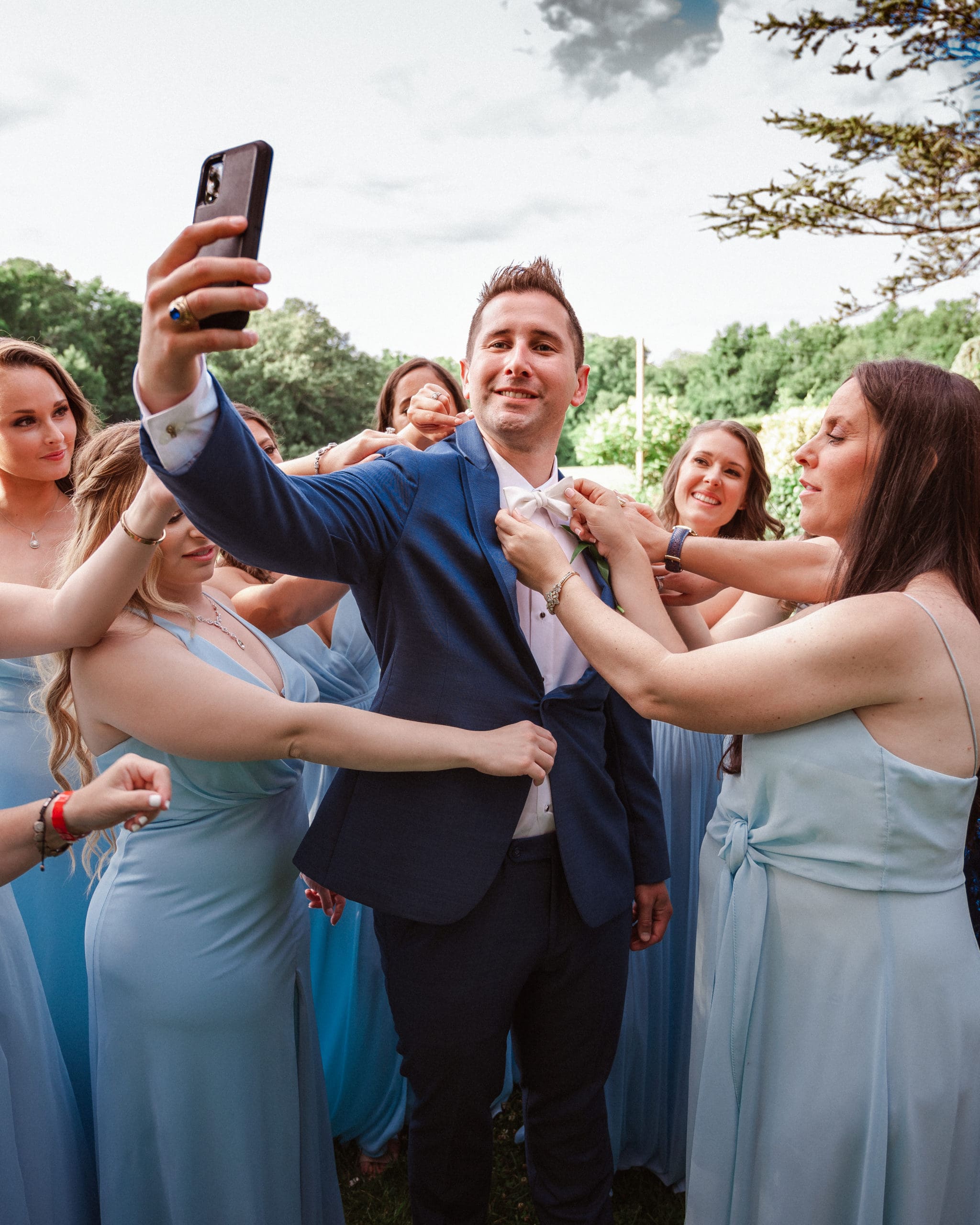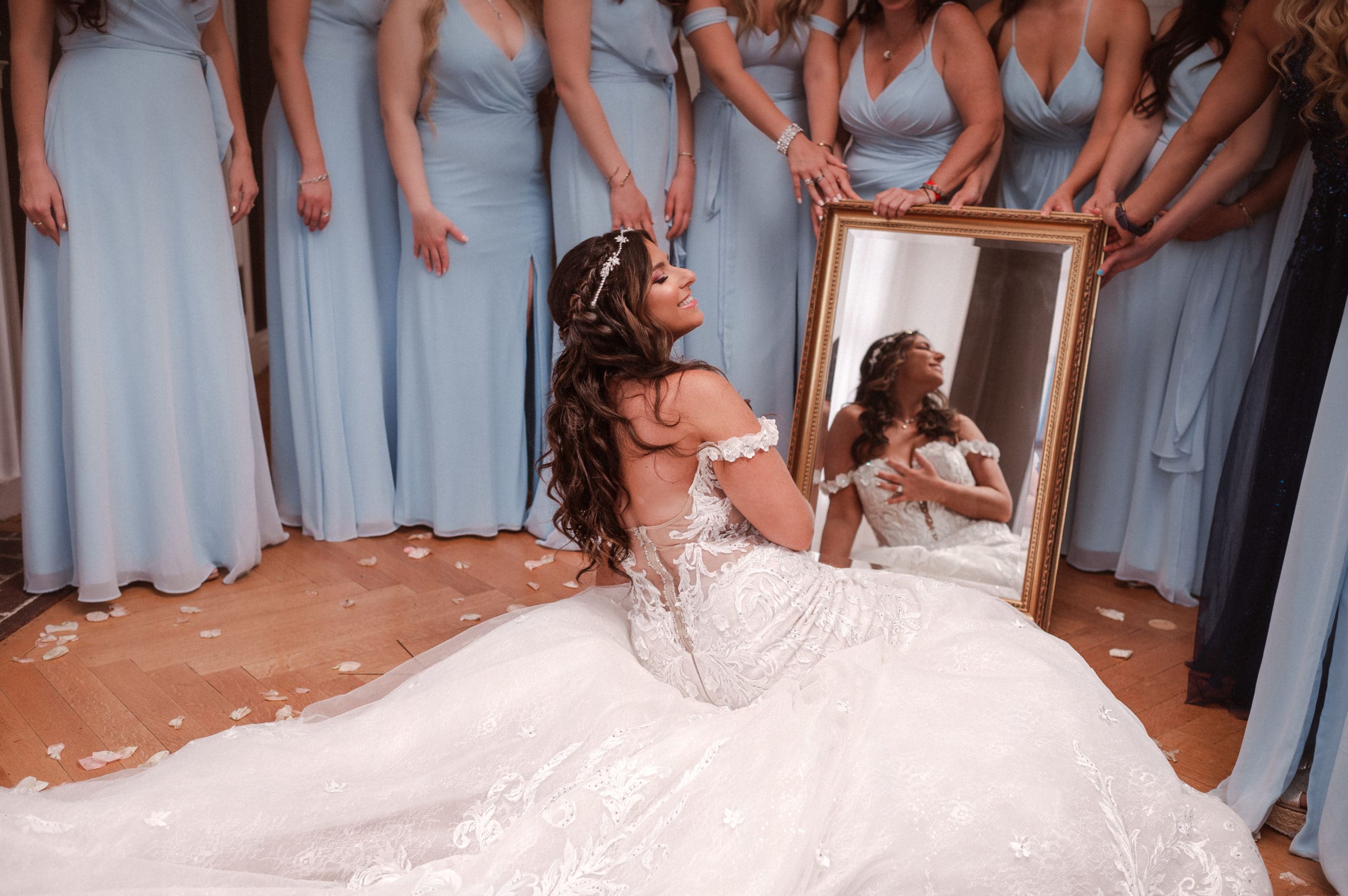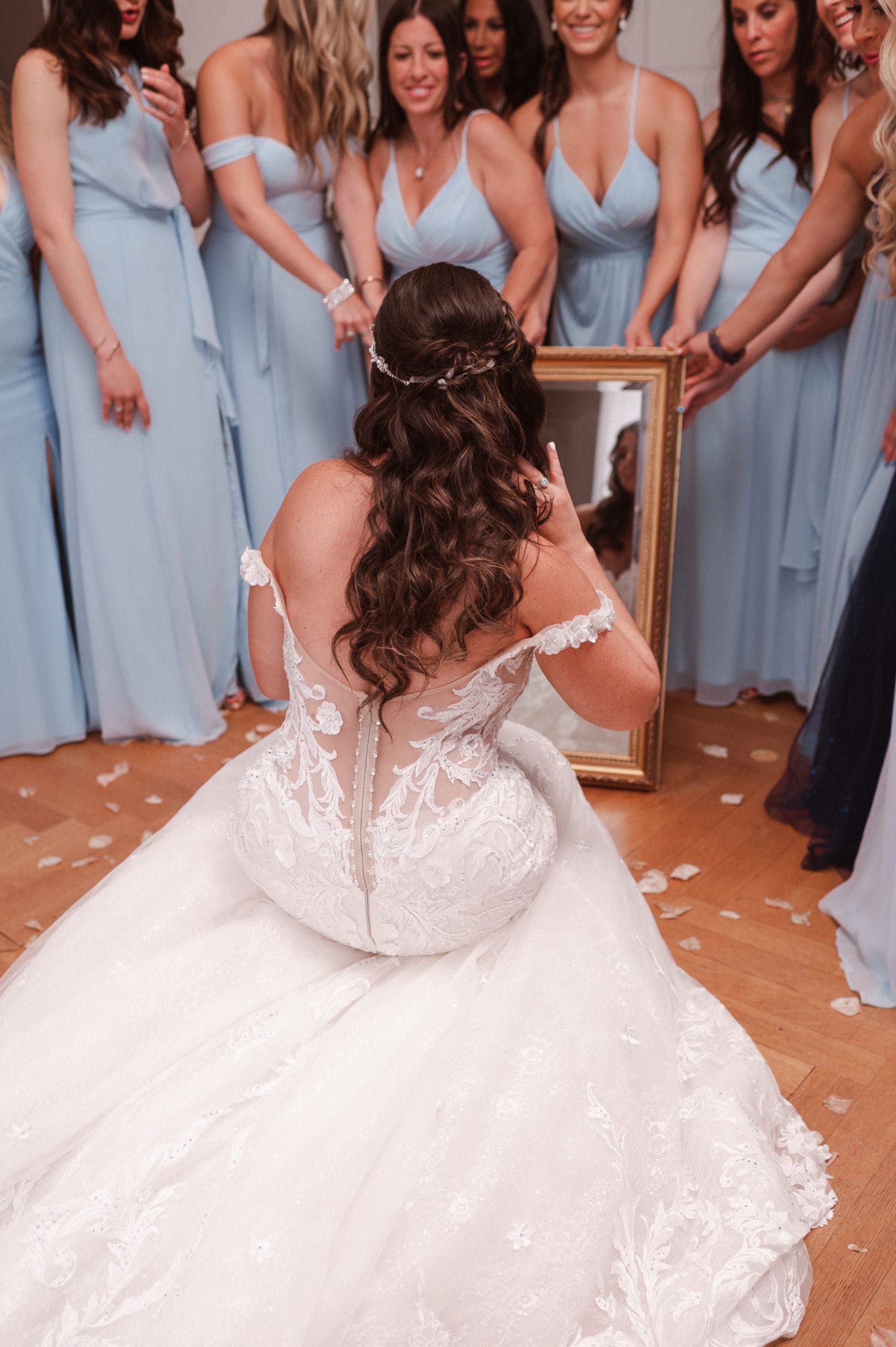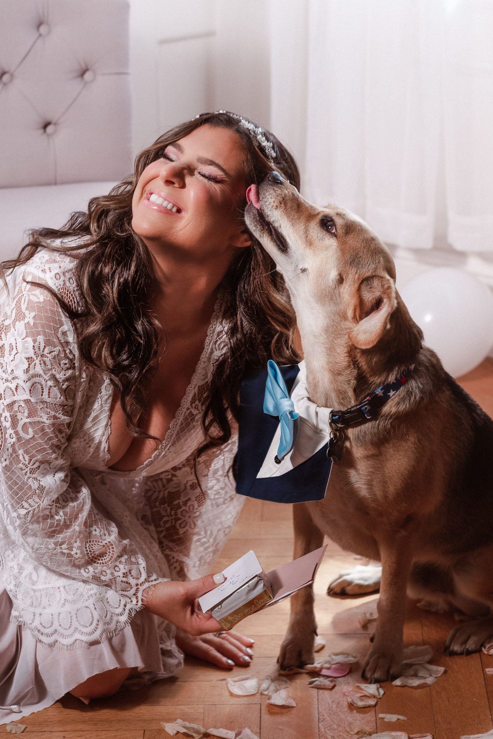 I arranged 2.5 hours of bridal prep portraits as the bride had extra personalized requests to document on her wedding day. She wanted bridal portraits in robe, creative portraits with her bridal party of 12, first look with family and bridesmaids, photos with her puppy, opening a gift from her groom, and bridal boudoir portraits. I could have easily added an extra half hour for this – but we were able to get it all done in time for the first look with her groom outside the glen cove mansion.