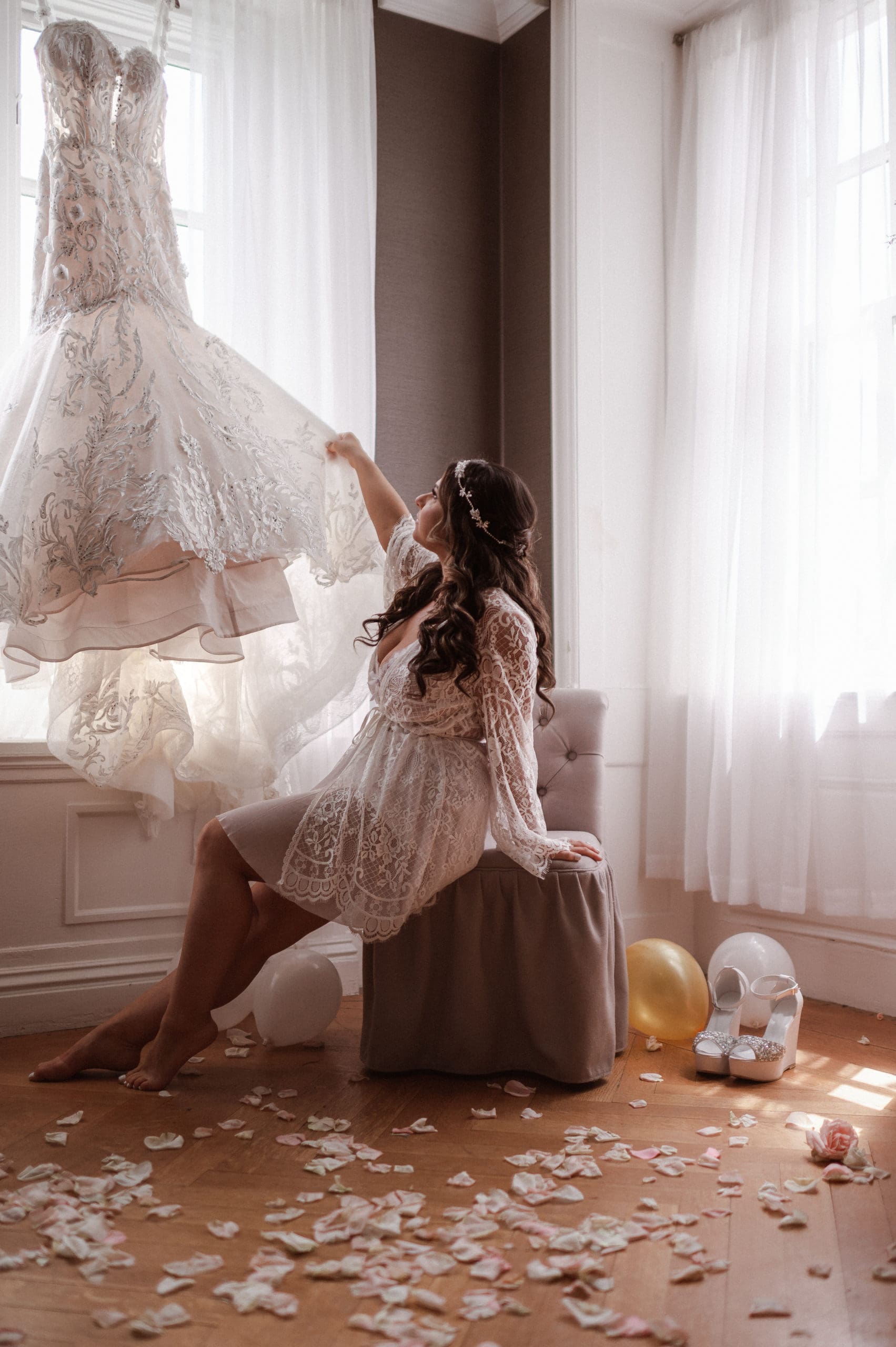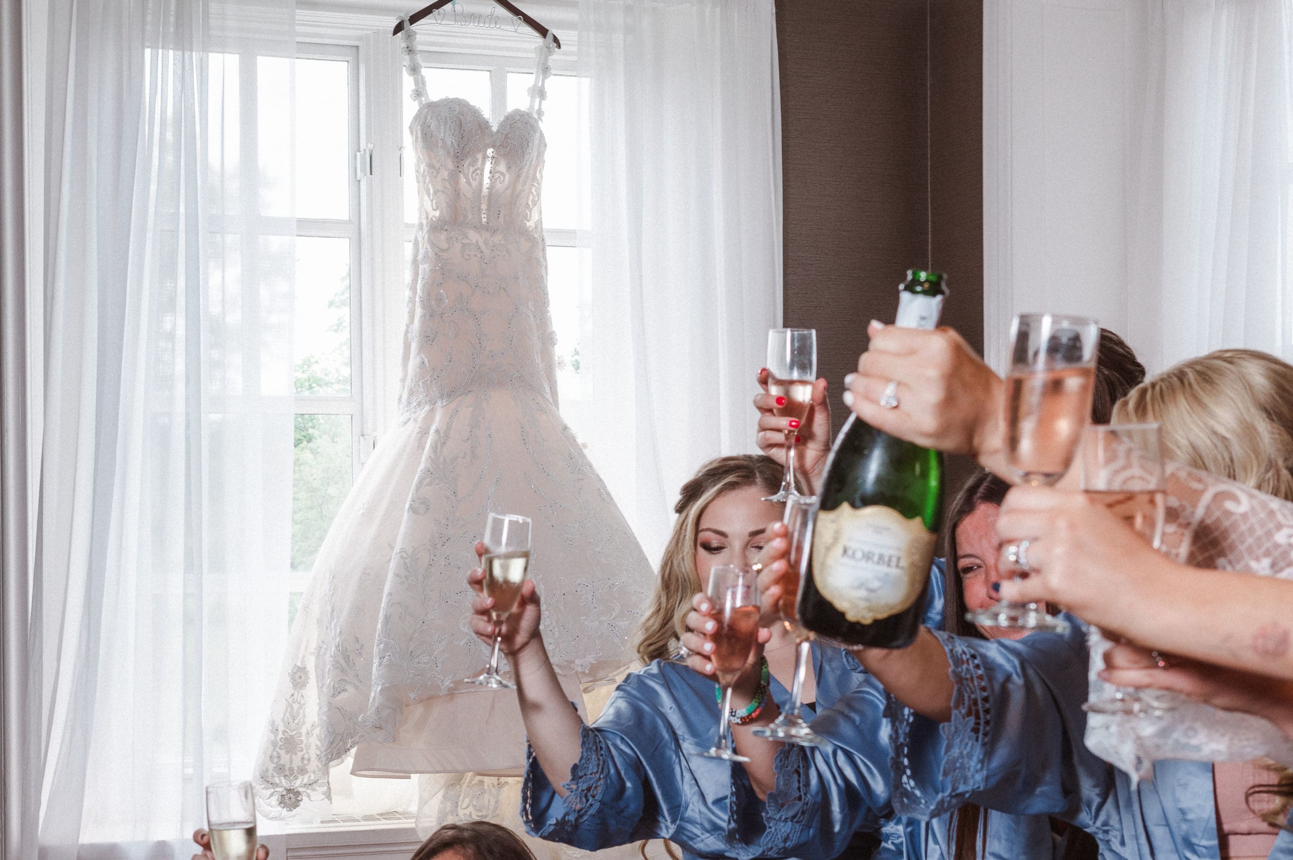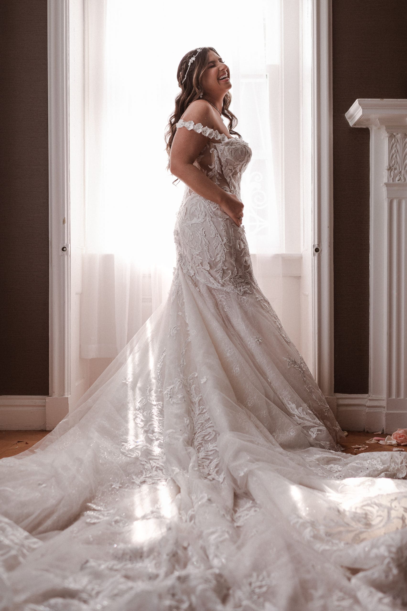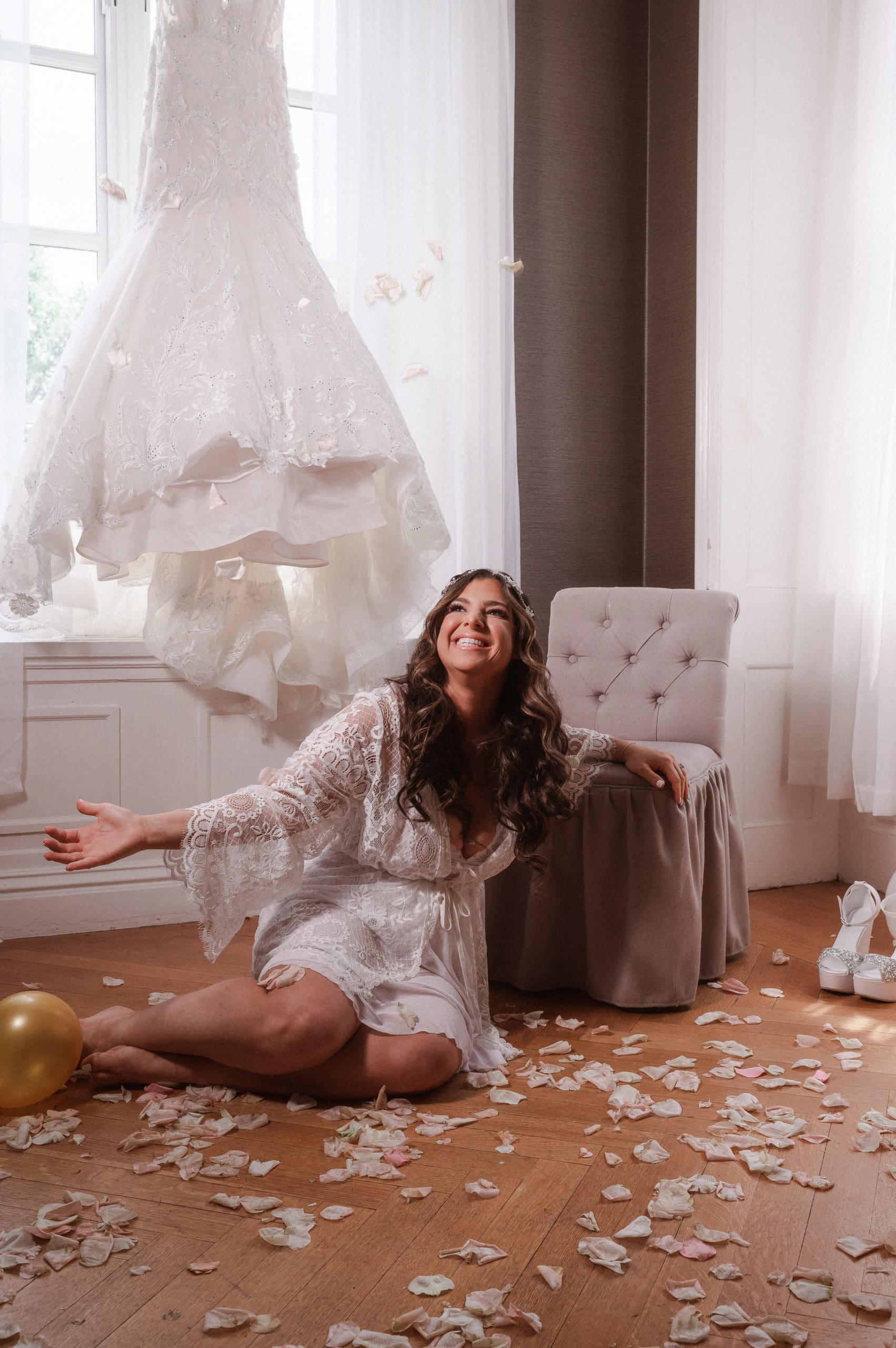 I arranged 2.5 hours of bridal prep portraits as the bride had extra personalized requests to document on her wedding day. She wanted bridal portraits in robe, creative portraits with her bridal party of 12, first look with family and bridesmaids, photos with her puppy, opening a gift from her groom, and bridal boudoir portraits. I could have easily added an extra half hour for this – but we were able to get it all done in time for the first look with her groom outside the glen cove mansion.