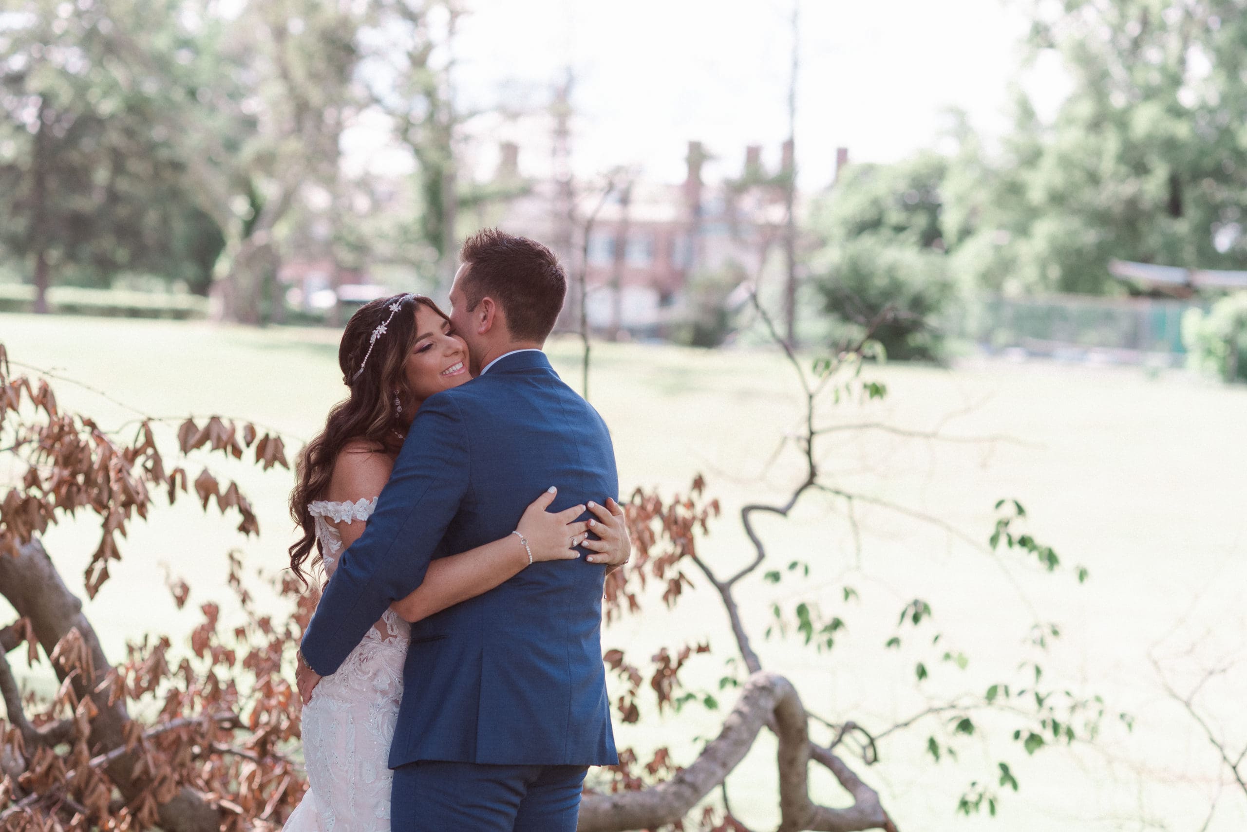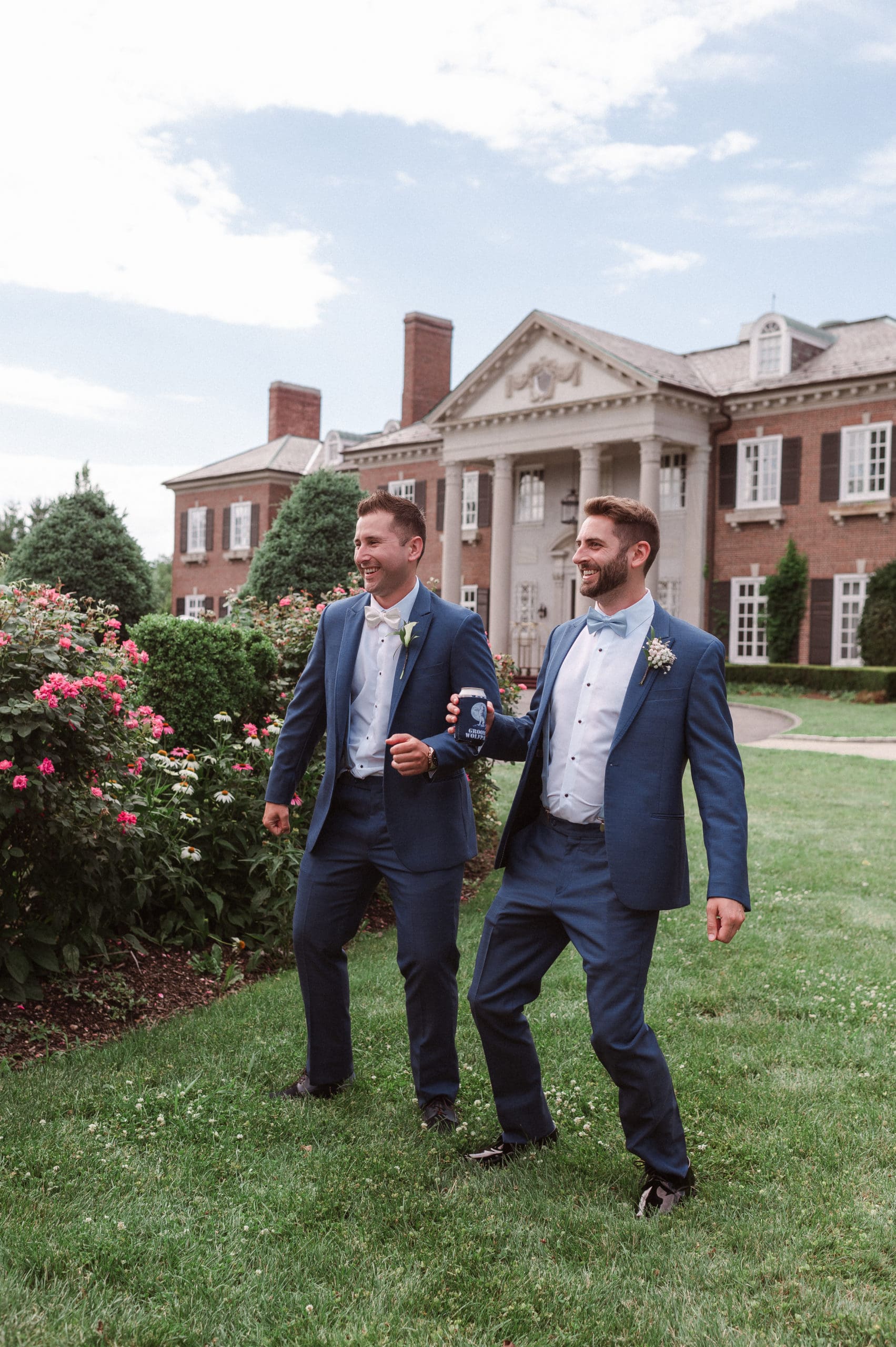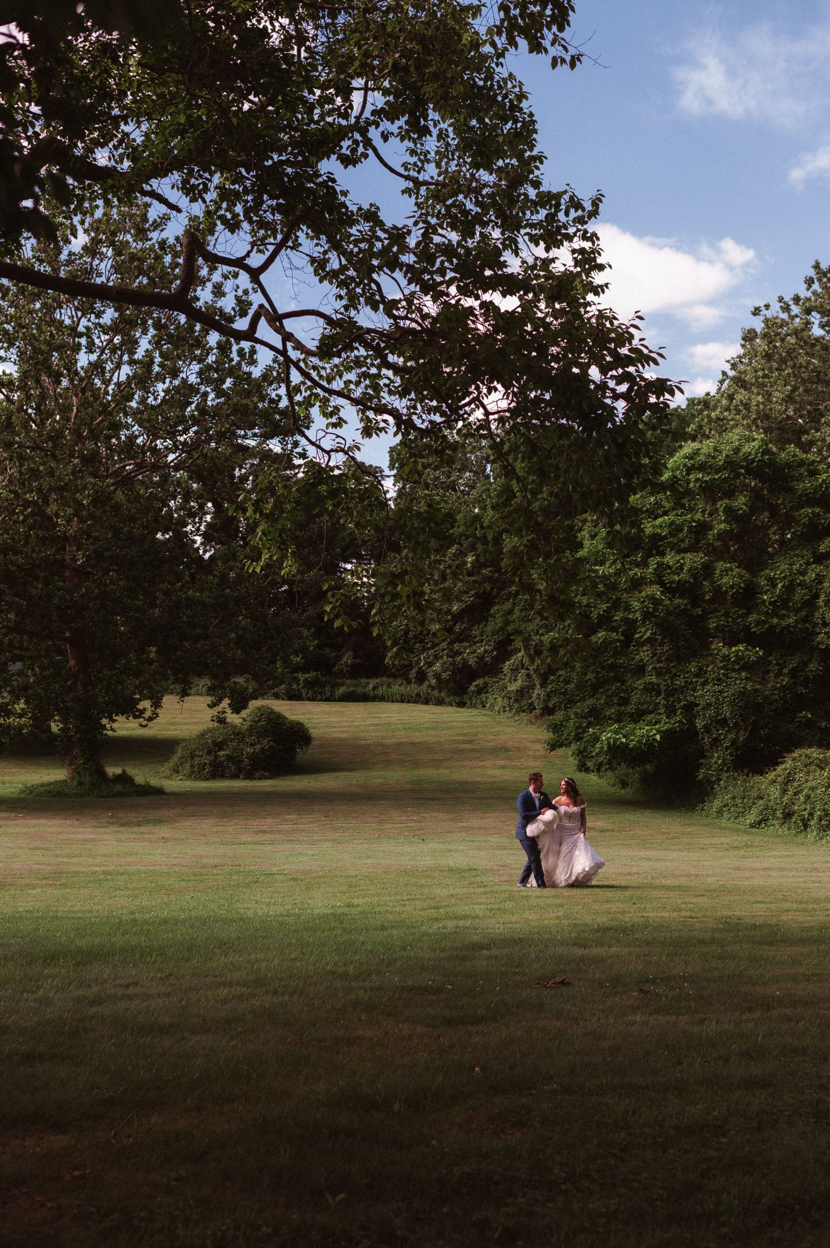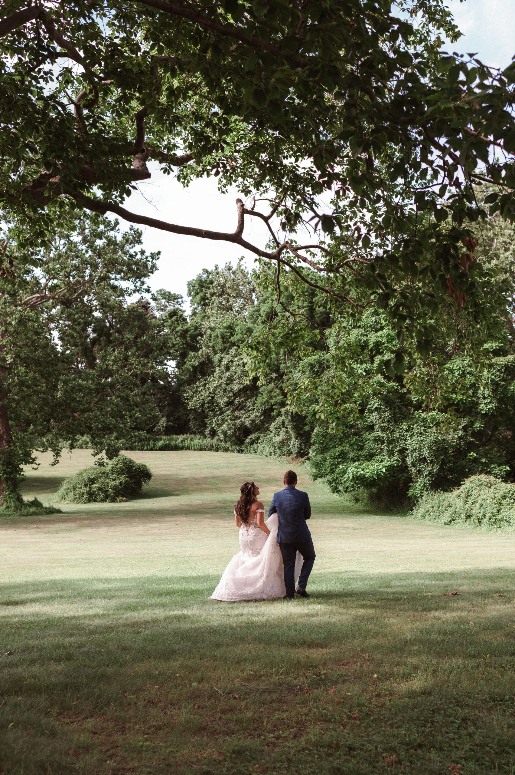 If you watched the behind-the-scenes video, you will hear the loud music in the background during some of their portrait sessions at the Glen Cove Mansion. This is because the Glen Cove Mansion booked a day party event at their pool before the wedding start time. The original plan was to do the first look in front of Glen Cove Mansion, but the noise was not okay for both video audio and the music was too distracting for the couple’s sweet moment. The videographer and planner decided it would be best to adventure out to the field, far away from the venue, to do the first look there. The sound was softer, but it was the best we could get. As a result of this unforeseen issue, we did have less than an hour for portraits.