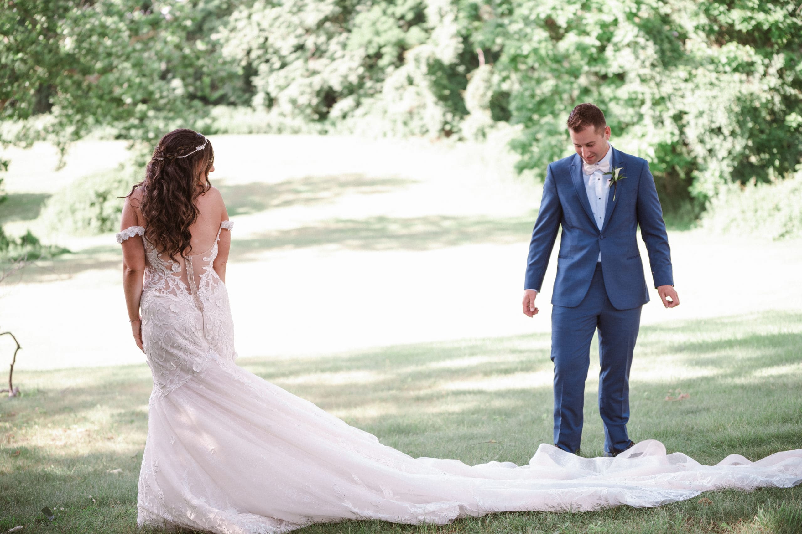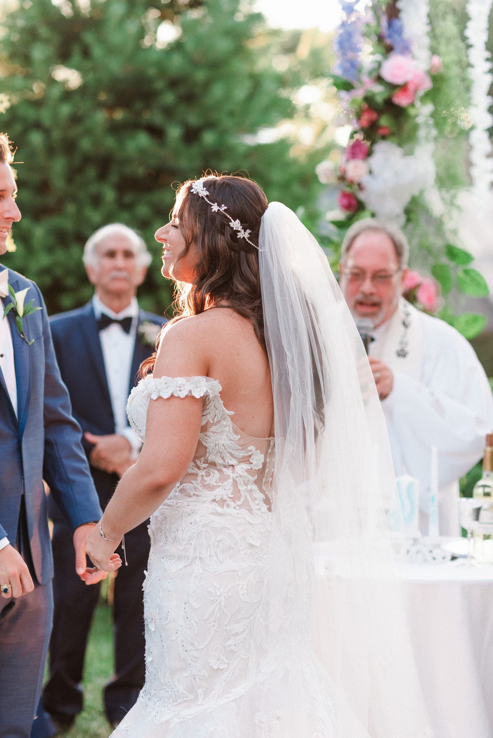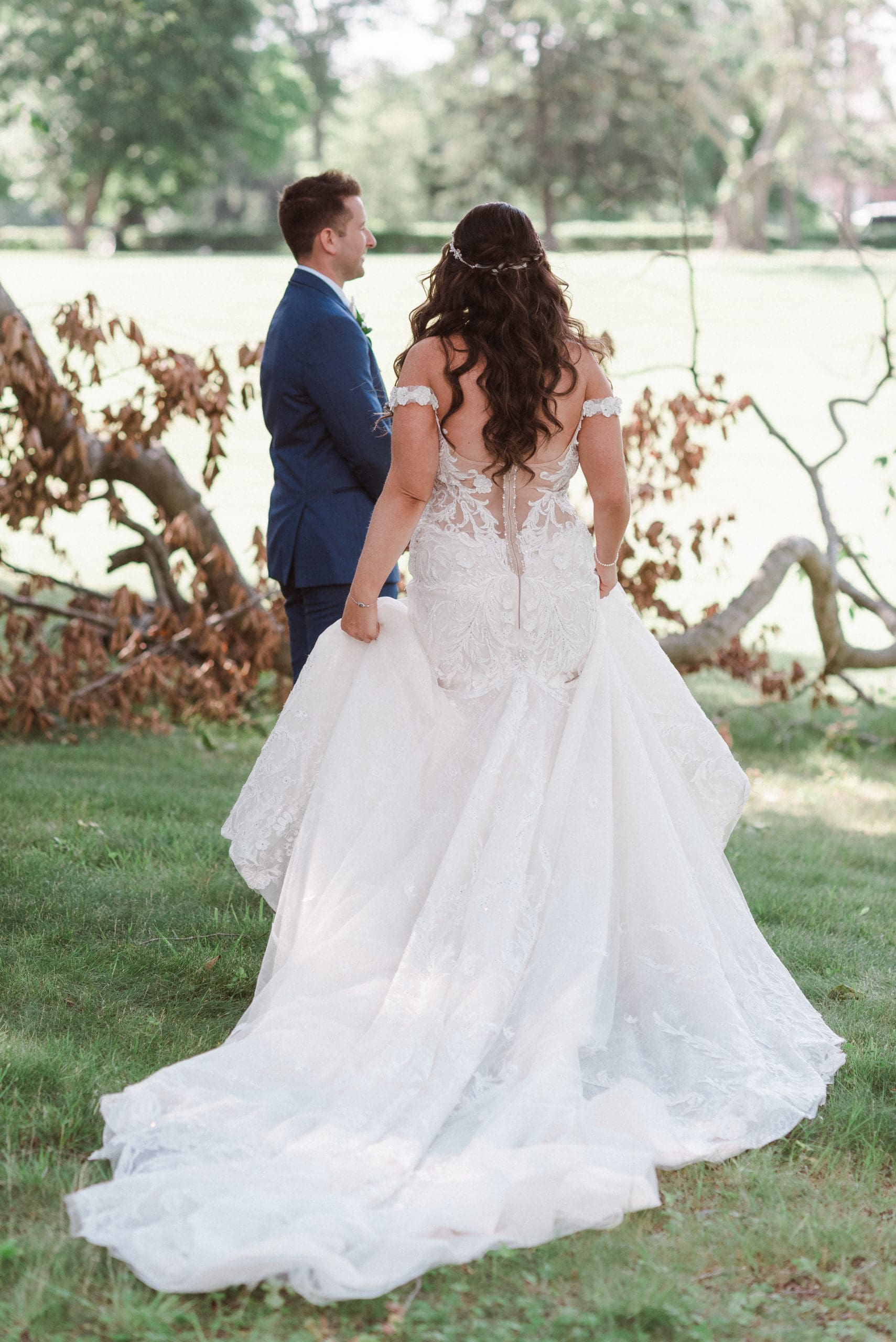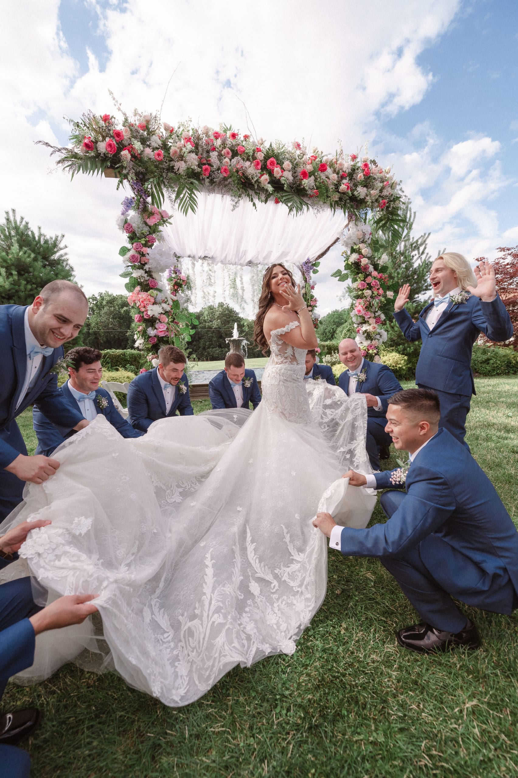 If you watched the behind-the-scenes video, you will hear the loud music in the background during some of their portrait sessions at the Glen Cove Mansion. This is because the Glen Cove Mansion booked a day party event at their pool before the wedding start time. The original plan was to do the first look in front of Glen Cove Mansion, but the noise was not okay for both video audio and the music was too distracting for the couple’s sweet moment. The videographer and planner decided it would be best to adventure out to the field, far away from the venue, to do the first look there. The sound was softer, but it was the best we could get. As a result of this unforeseen issue, we did have less than an hour for portraits.