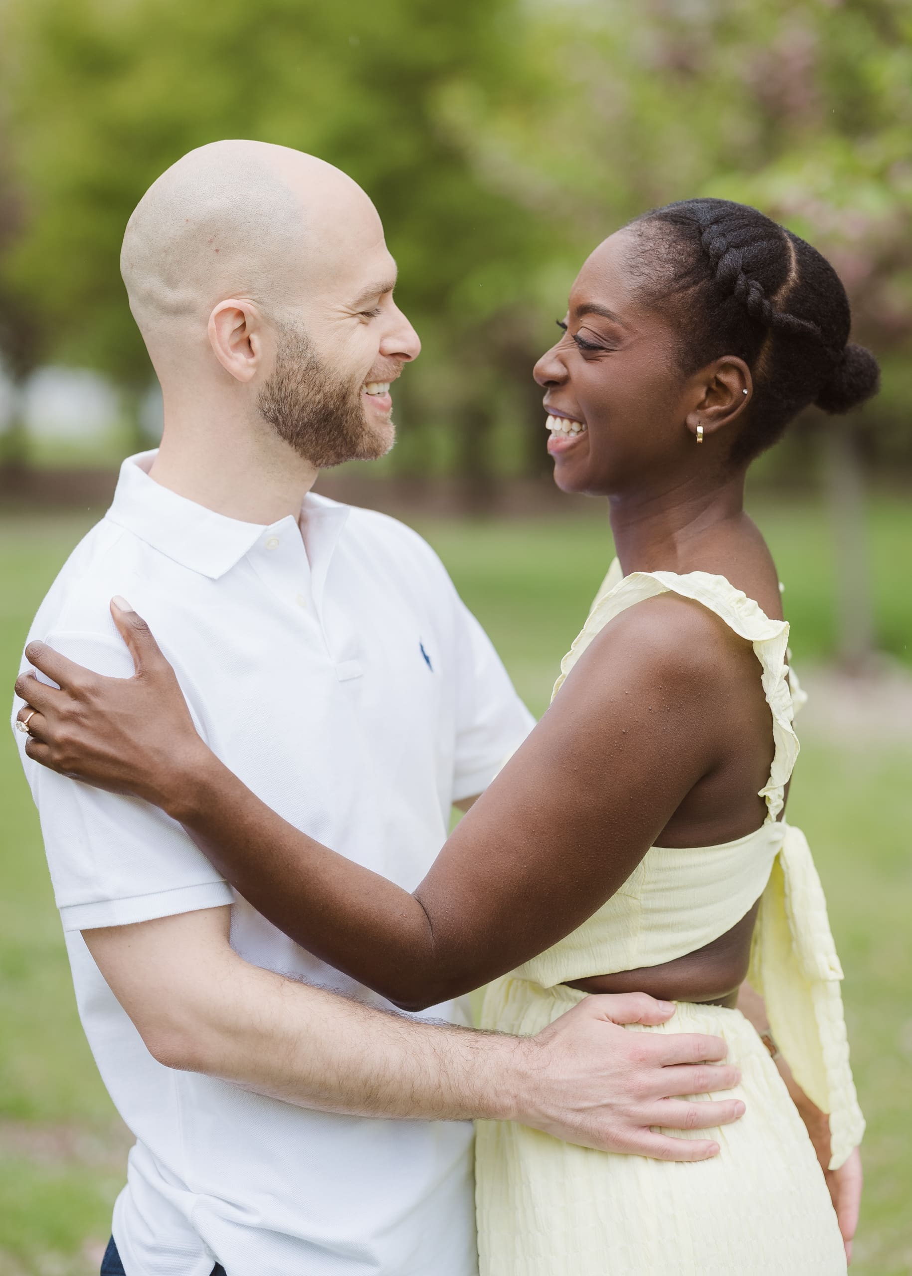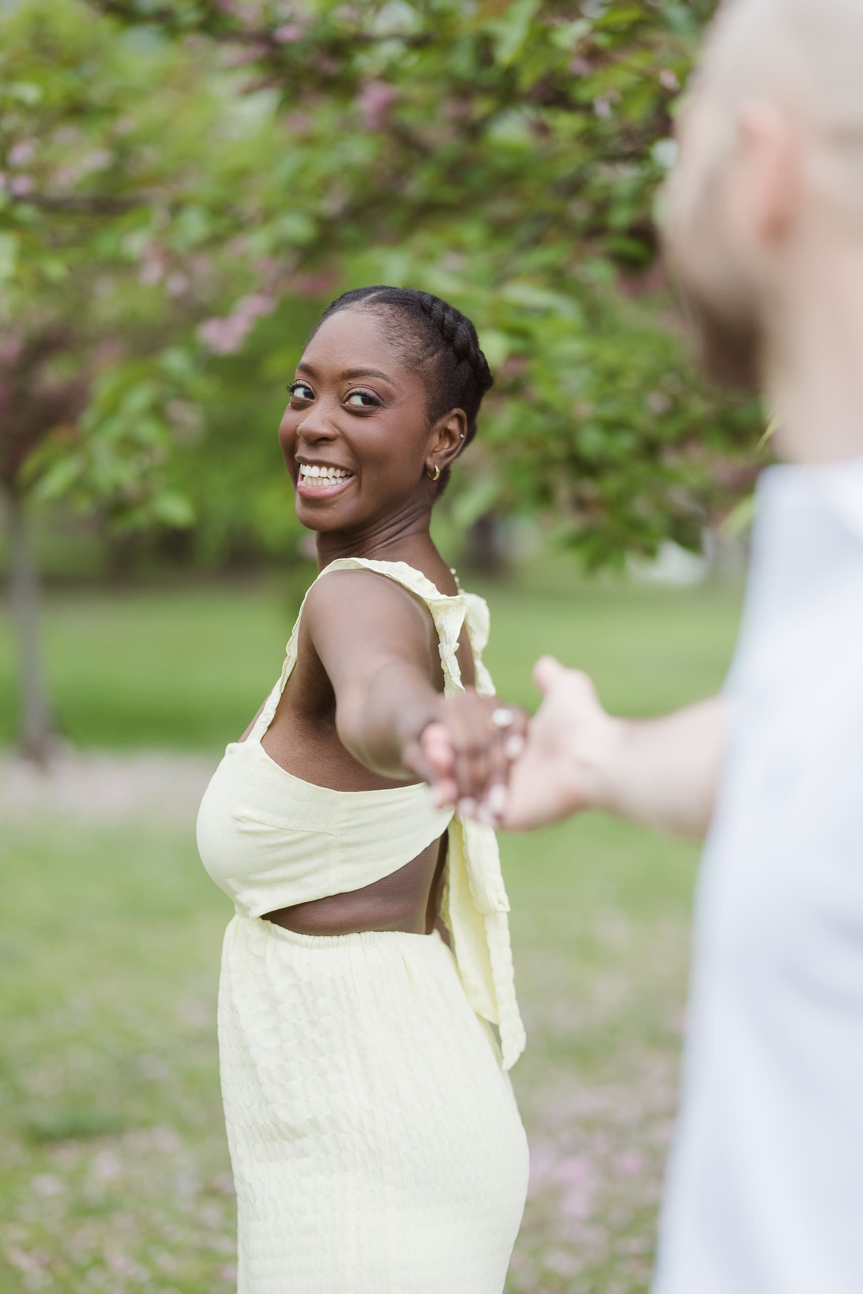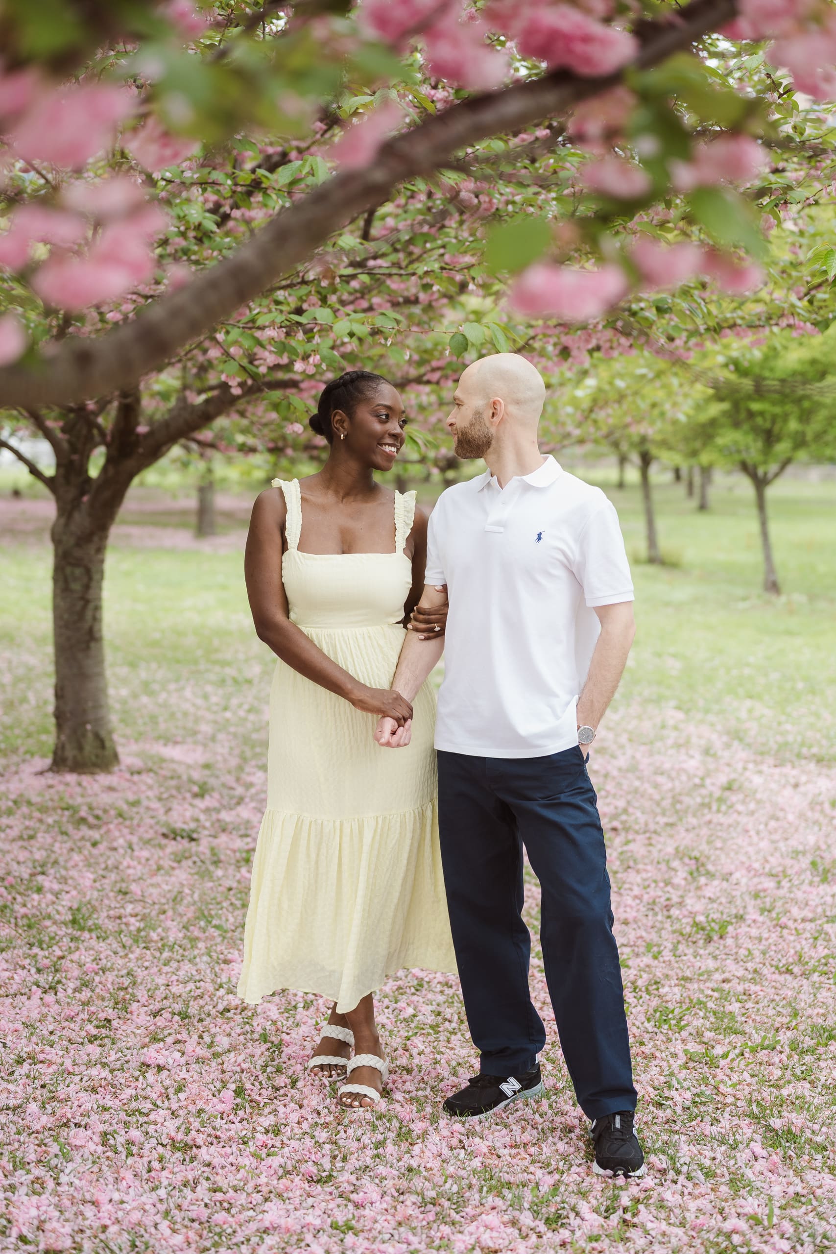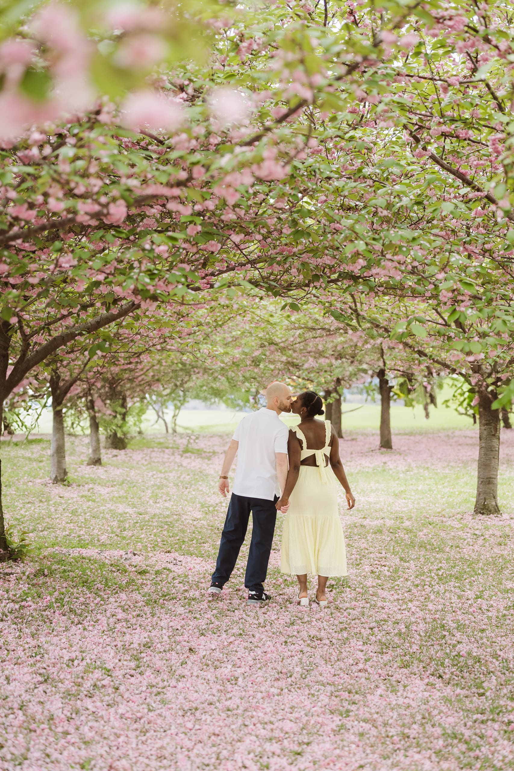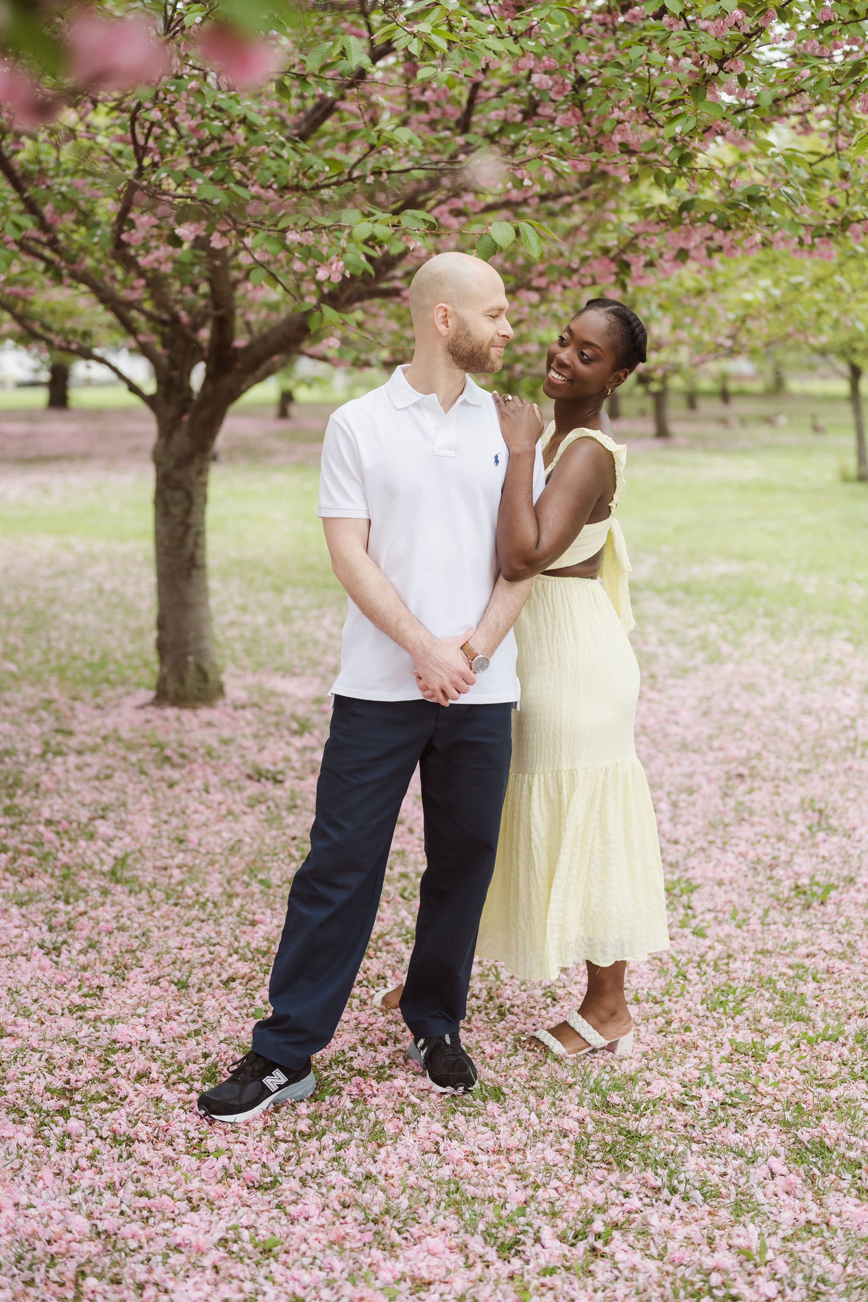 Recently, I had the pleasure of photographing a couple for a mini engagement sessions at the beautiful Liberty State Park. Unlike the standard hour-long shoots, this session was just 30 minutes, but we made every second count. With this condensed timeframe, the couple only had one look but were able to shoot at two stunning locations within the park, one with the skyline (on a cloudy rainy day) and another series of photos under the cherry blossoms (last day of bloom) making the most of their time together.
