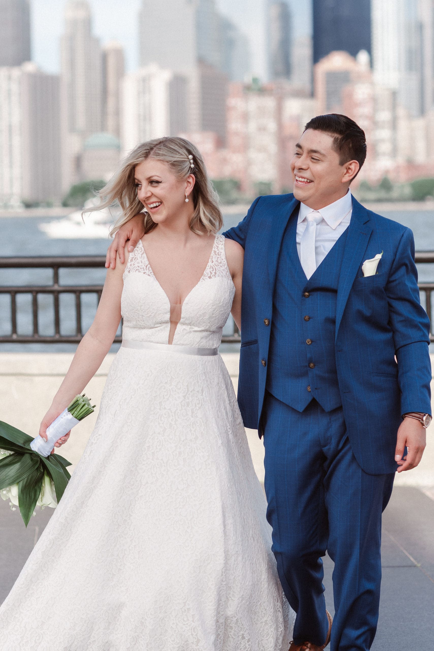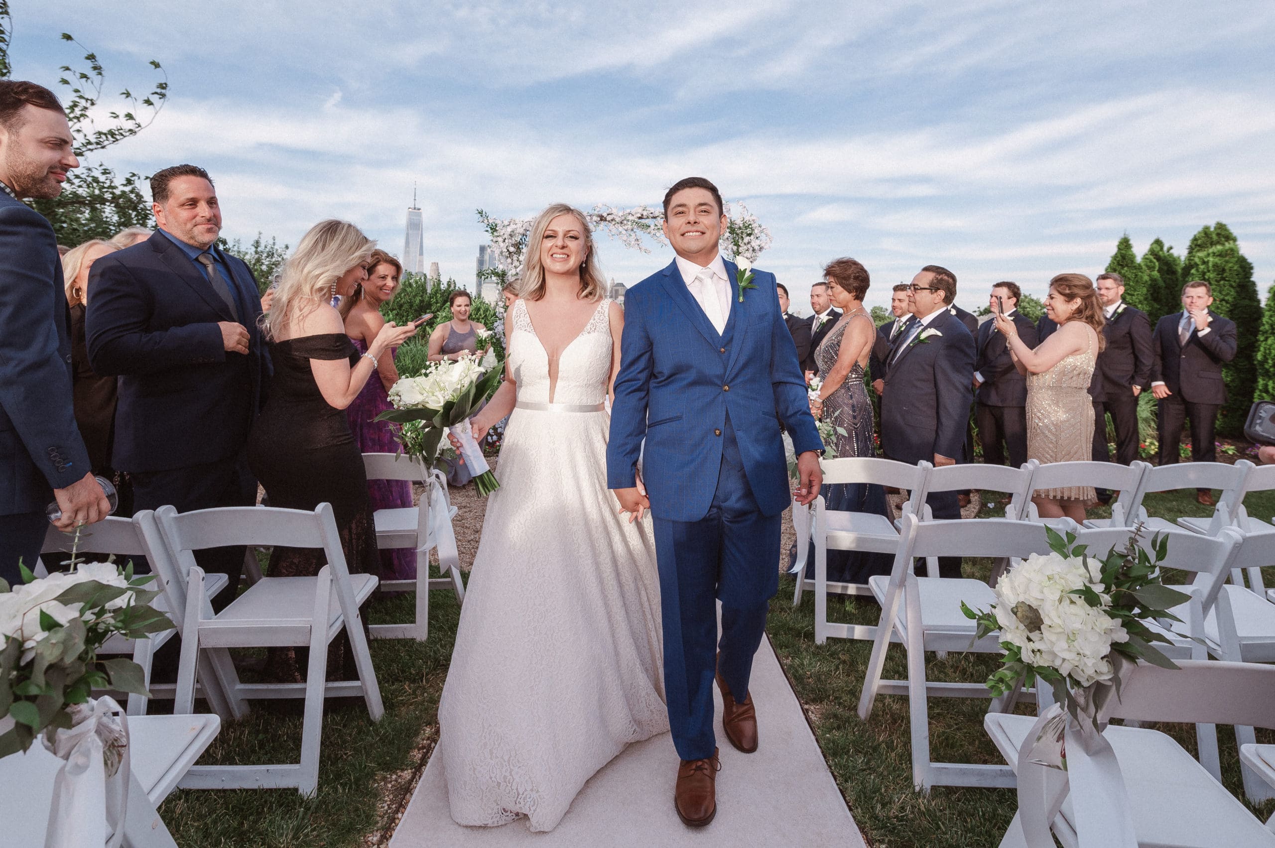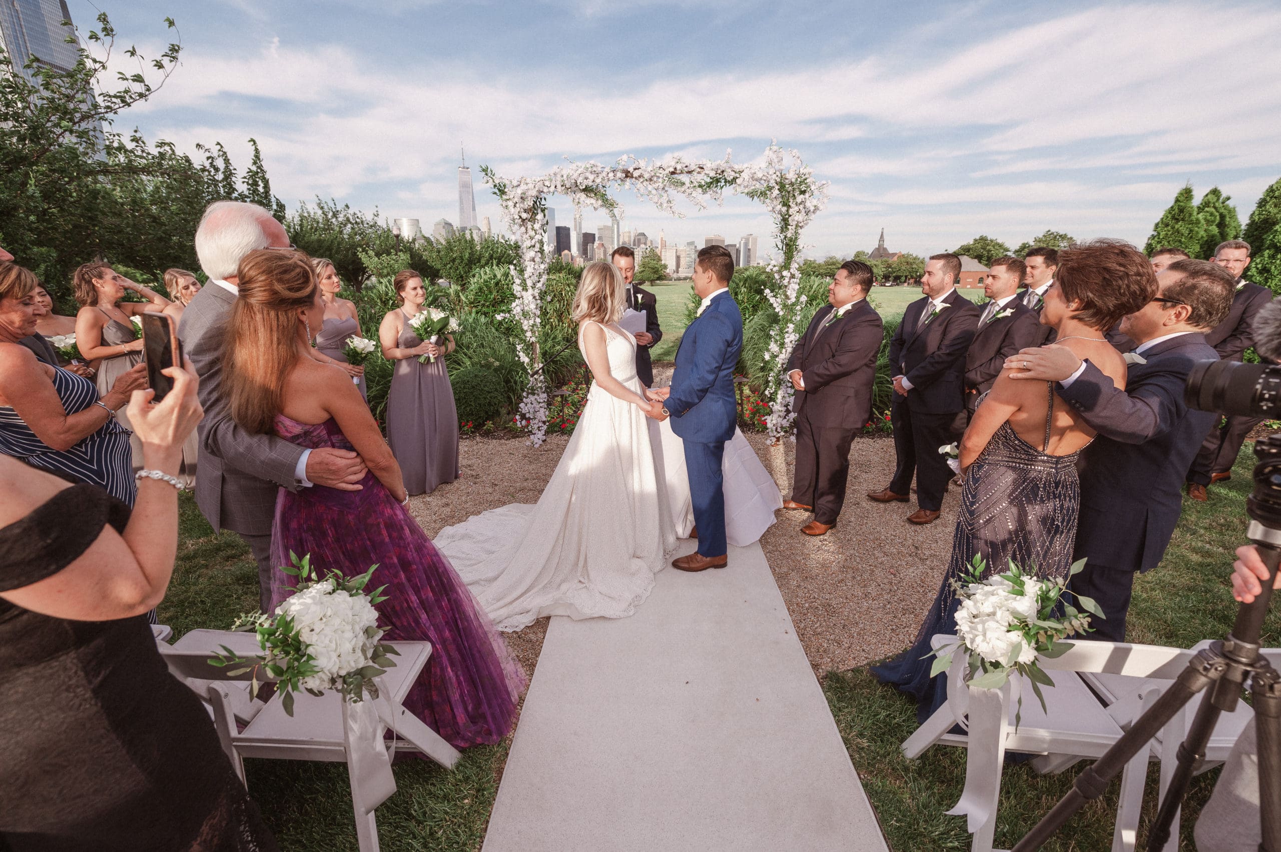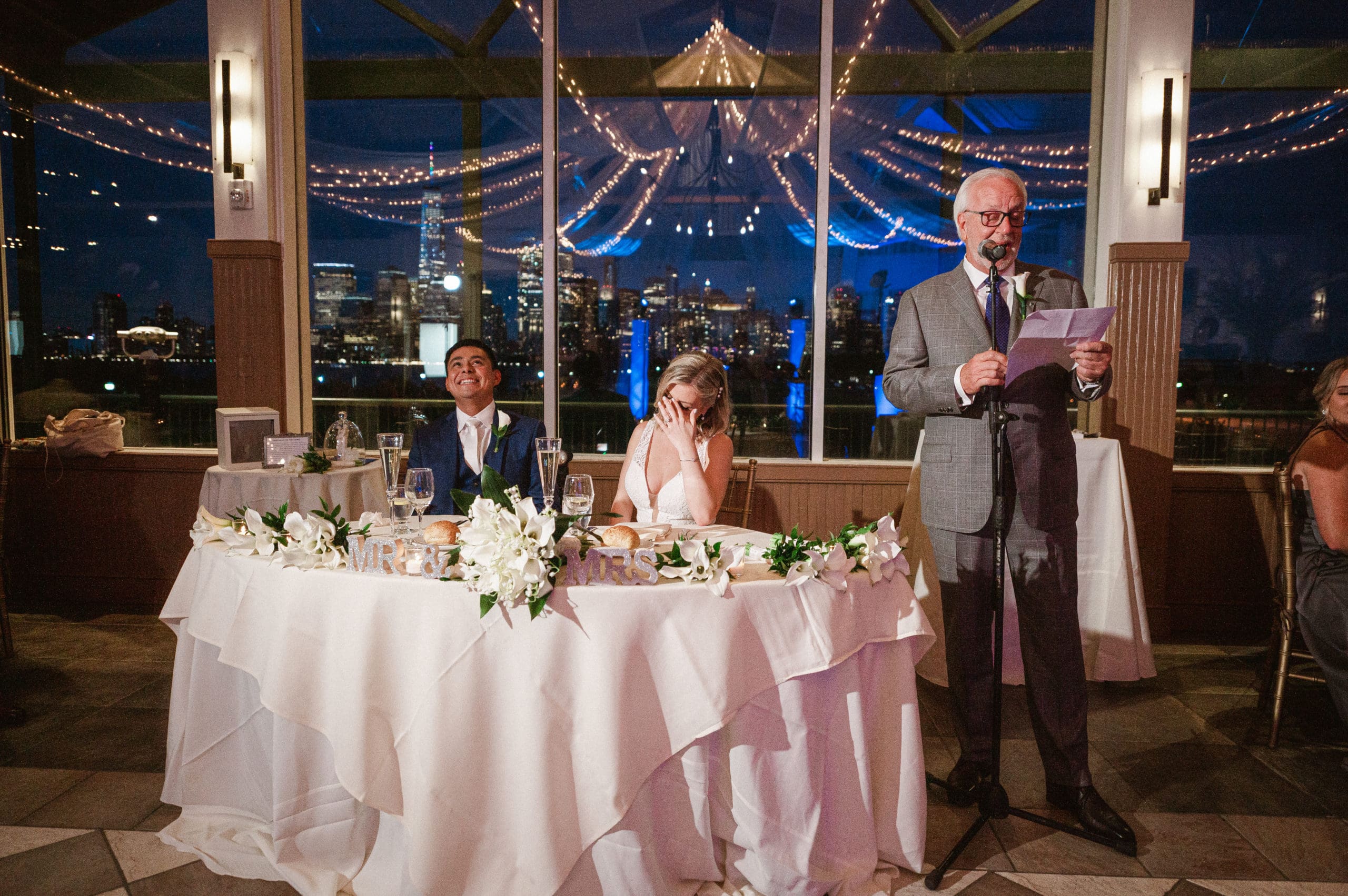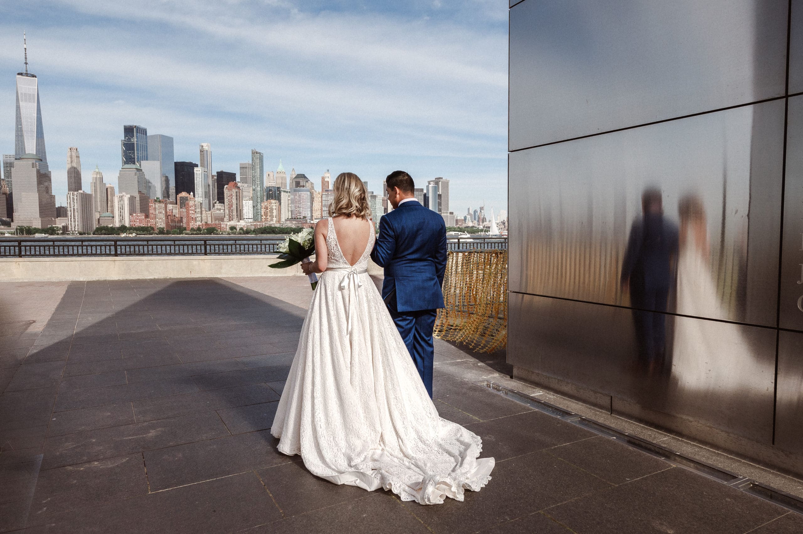 This couple had postponed their wedding three times during the COVID-19 pandemic, and finally got a day to celebrate with about 200 of their friends and family members. My favorite parts of their wedding day were the bride prep first look with dad and witnessing mom crying in the background. I loved the first look of the bride and groom in front of the train station, followed by portraits around the 9/11 memorial in New Jersey. The ceremony was so beautiful, had great weather, and was filled with so much love. Everyone in the aisle wanted to take a photo of the beautiful bride coming down the aisle. As she walked down, even though her husband already saw her before the ceremony, he STILL CRIED!!! Epic. This couple had booked an incredible entertainment company with a DJ, emcee, lighting, ANDÂ a live drummer. INCREDIBLE ENERGY LASTED ALL NIGHT LONG. It just shows in their wedding photos at Liberty House Restaurant, New Jersey.