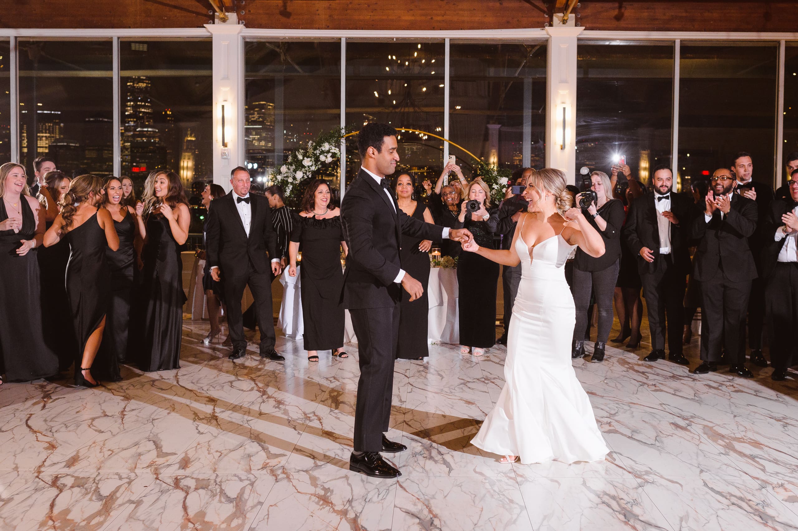 This couple is from Tennessee and planned a destination wedding at the iconic Liberty House Restaurant because they fell in love with the sweeping NYC and Jersey City skyline views. L.H. is a wedding venue is a perfect place for an indoor ceremony and reception as the venue can easily swap within one hour (during cocktail hour) to change the decor and style of the space.