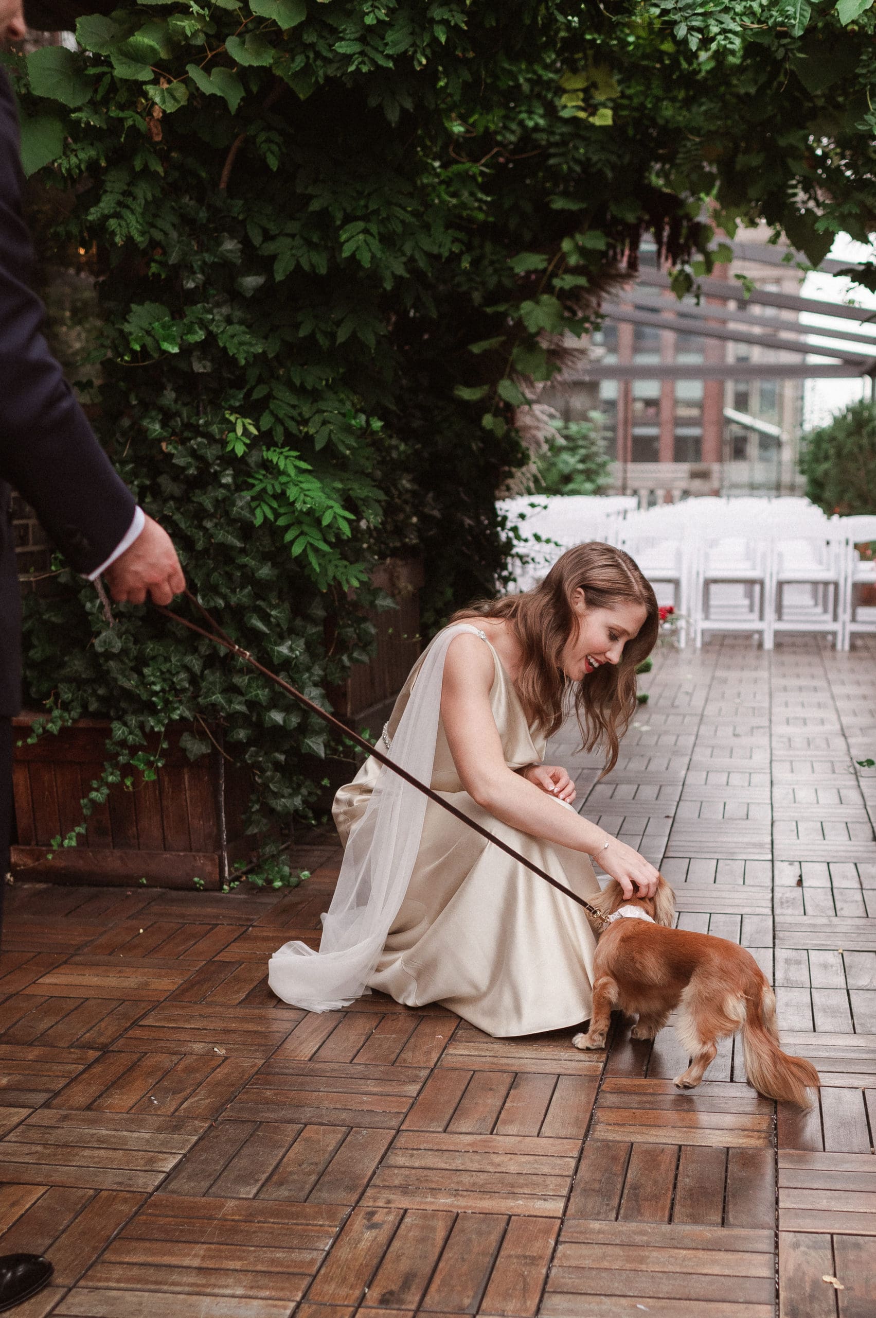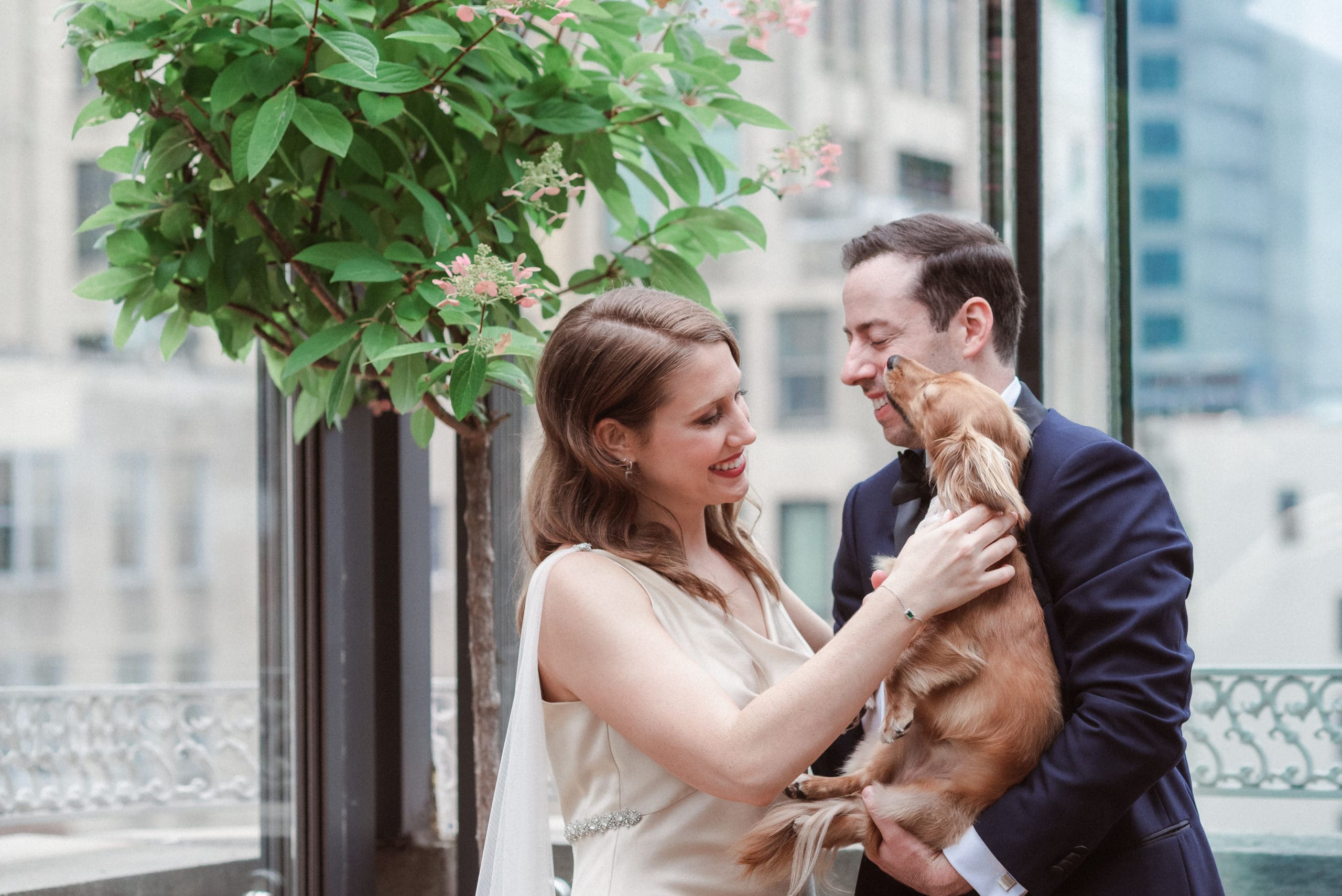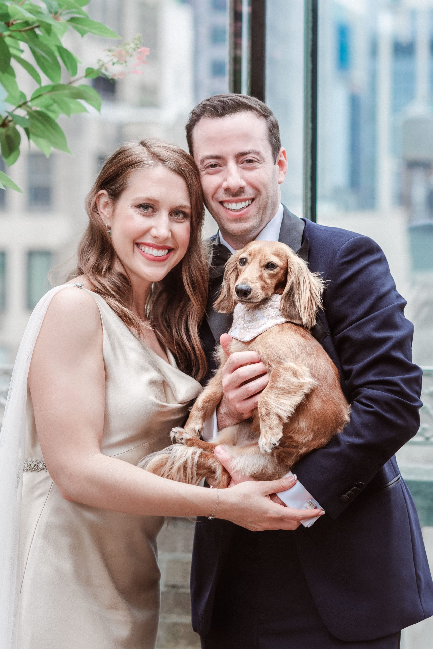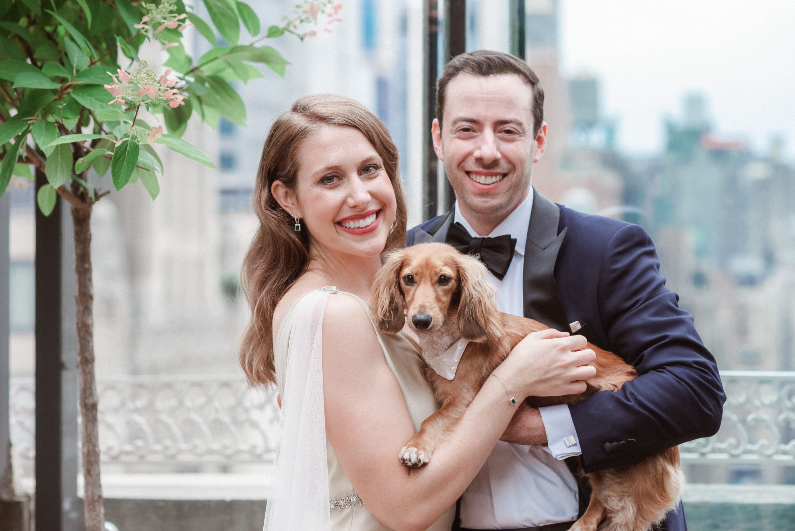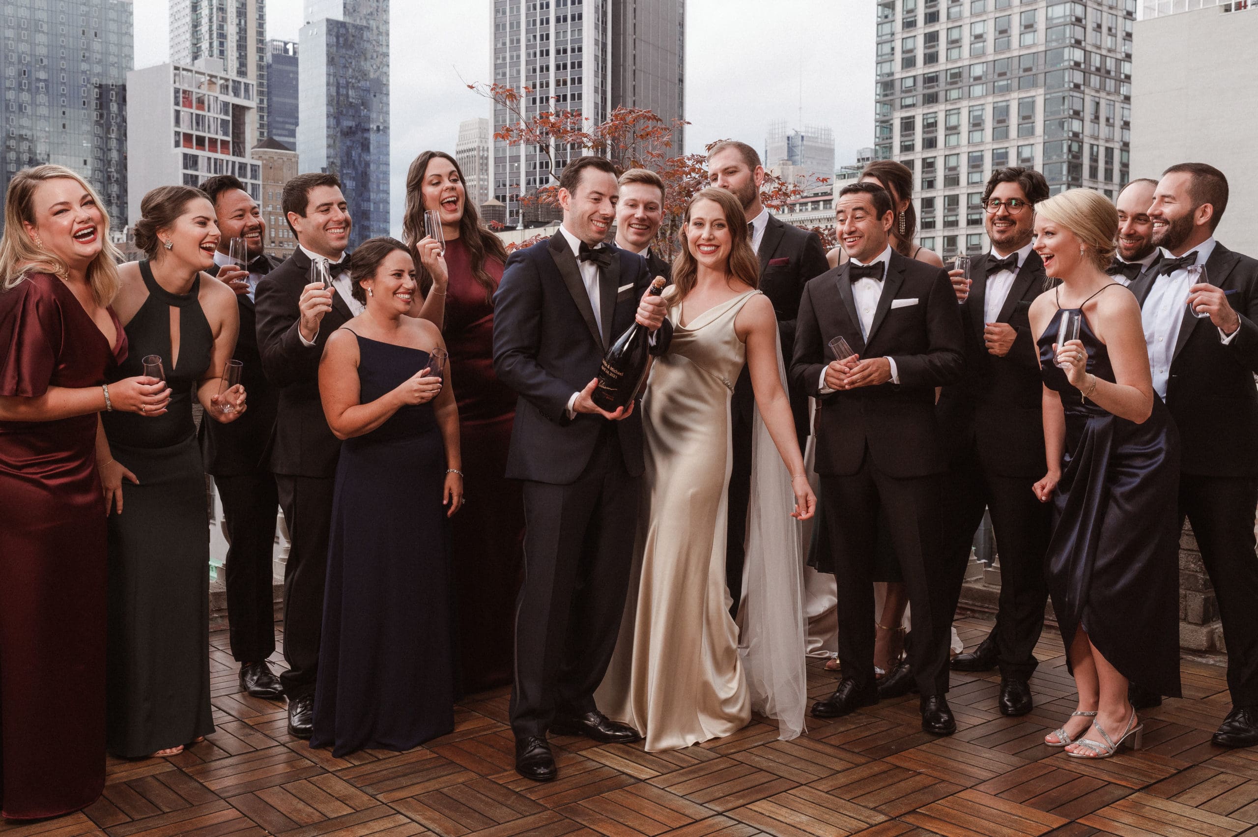 A collection of wedding photos at Midtown Loft and Terrace in Manhattan (NYC). The wedding took place in September, the weather was cooperating and we worked well around the foot traffic during the portrait sessions around 5th avenue. I loved how at this wedding, this couple did not stick with traditional things. Like, the bride wore a custom beautiful satin-textured champagne color dress by @designerloft_Bridal . There’s more about this day I loved, like how they invited their fur baby, Pickles, for photos! The wedding took place all at one location, which made the guests’/vendors lives easier so there’s no need to commute around NYC in order to get to the next location on time. I also loved the fact that they wrote vows and brought engraved 2020 wedding decorations/magnum champagne bottles to incorporate in their 2nd wedding date in 2021.