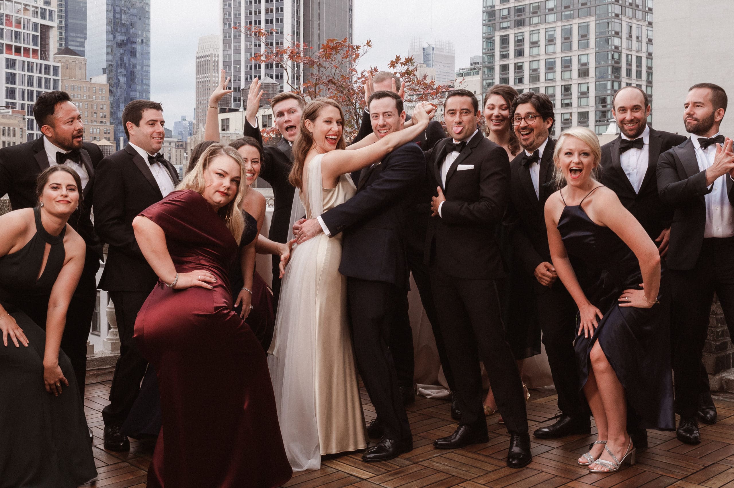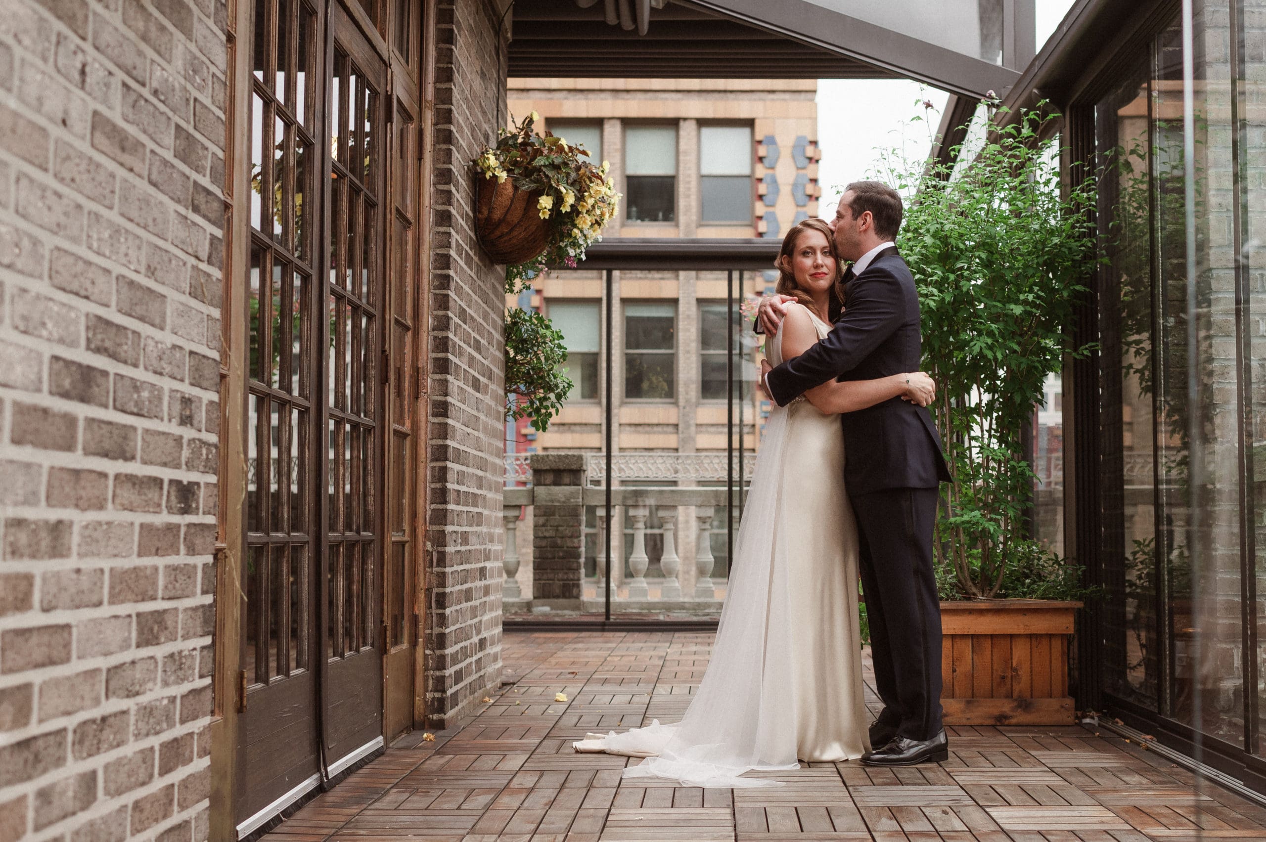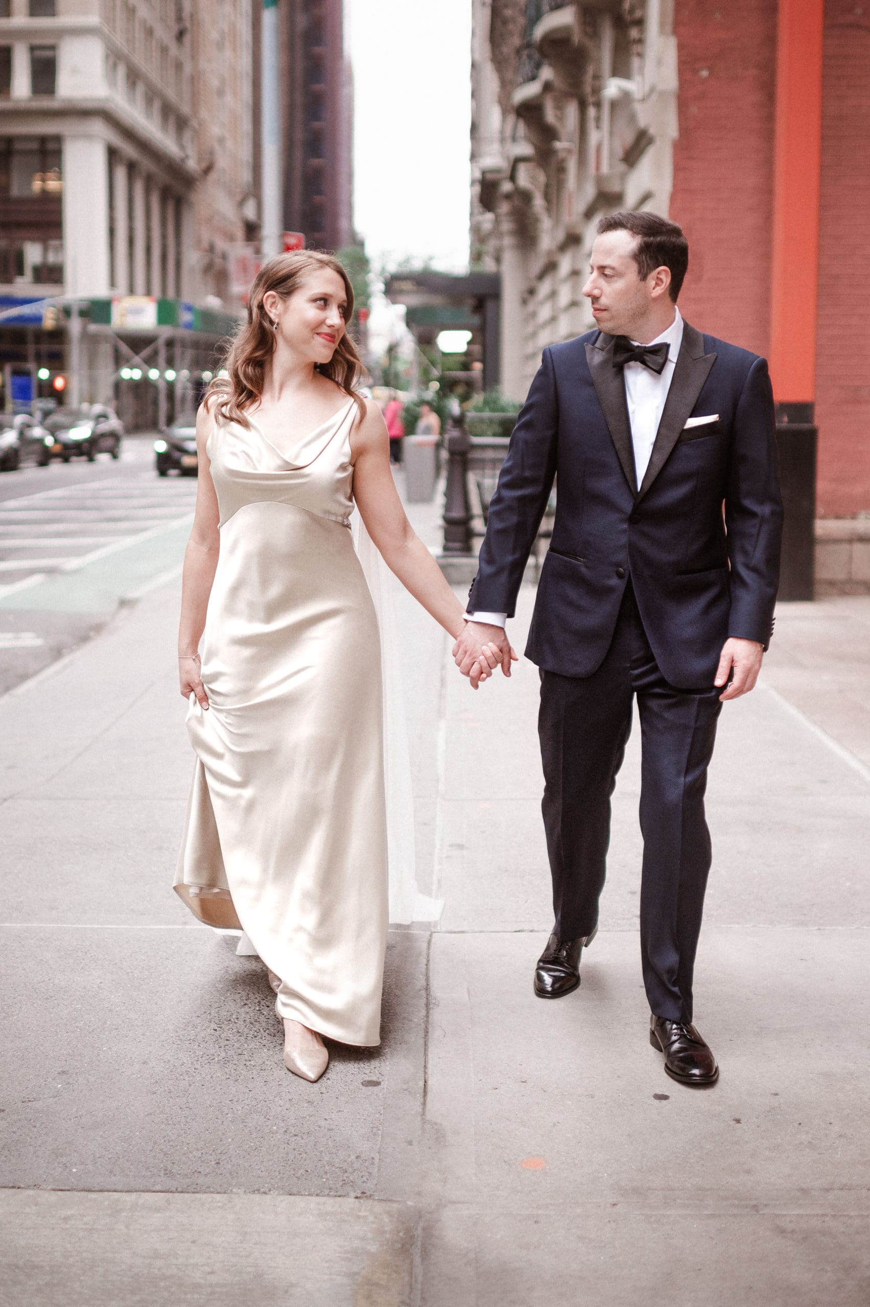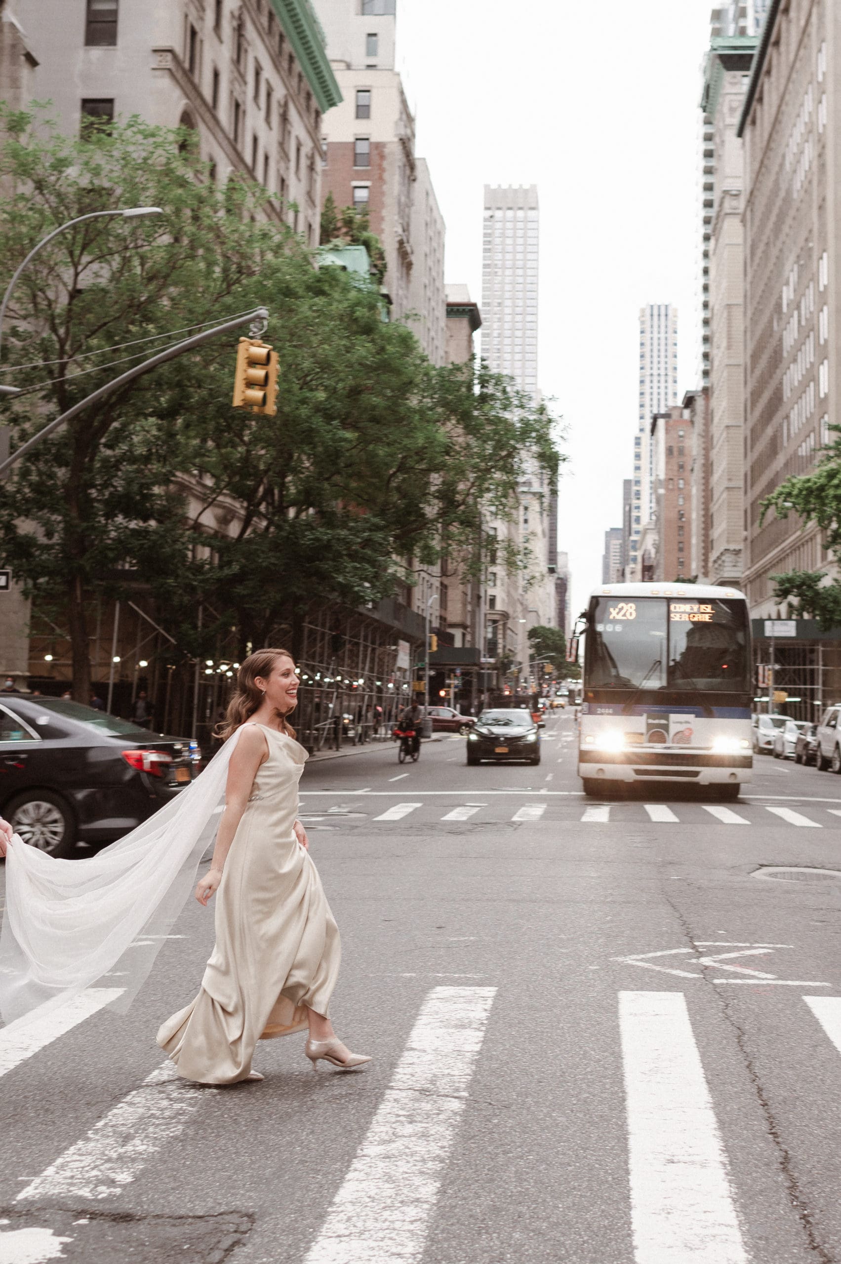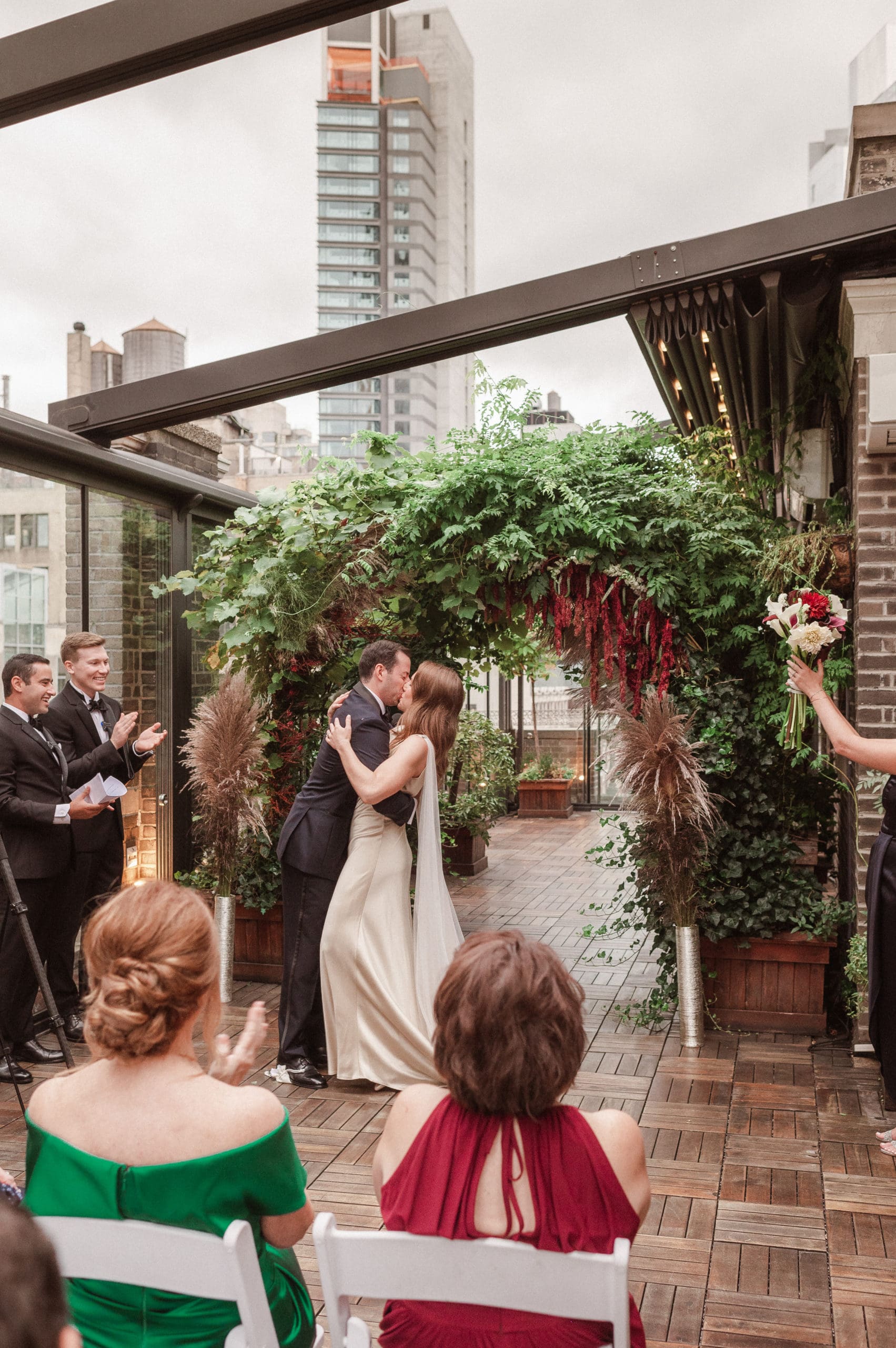A collection of wedding photos at Midtown Loft and Terrace in Manhattan (NYC). The wedding took place in September, the weather was cooperating and we worked well around the foot traffic during the portrait sessions around 5th avenue. I loved how at this wedding, this couple did not stick with traditional things. Like, the bride wore a custom beautiful satin-textured champagne color dress by @designerloft_Bridal . There’s more about this day I loved, like how they invited their fur baby, Pickles, for photos! The wedding took place all at one location, which made the guests’/vendors lives easier so there’s no need to commute around NYC in order to get to the next location on time. I also loved the fact that they wrote vows and brought engraved 2020 wedding decorations/magnum champagne bottles to incorporate in their 2nd wedding date in 2021.