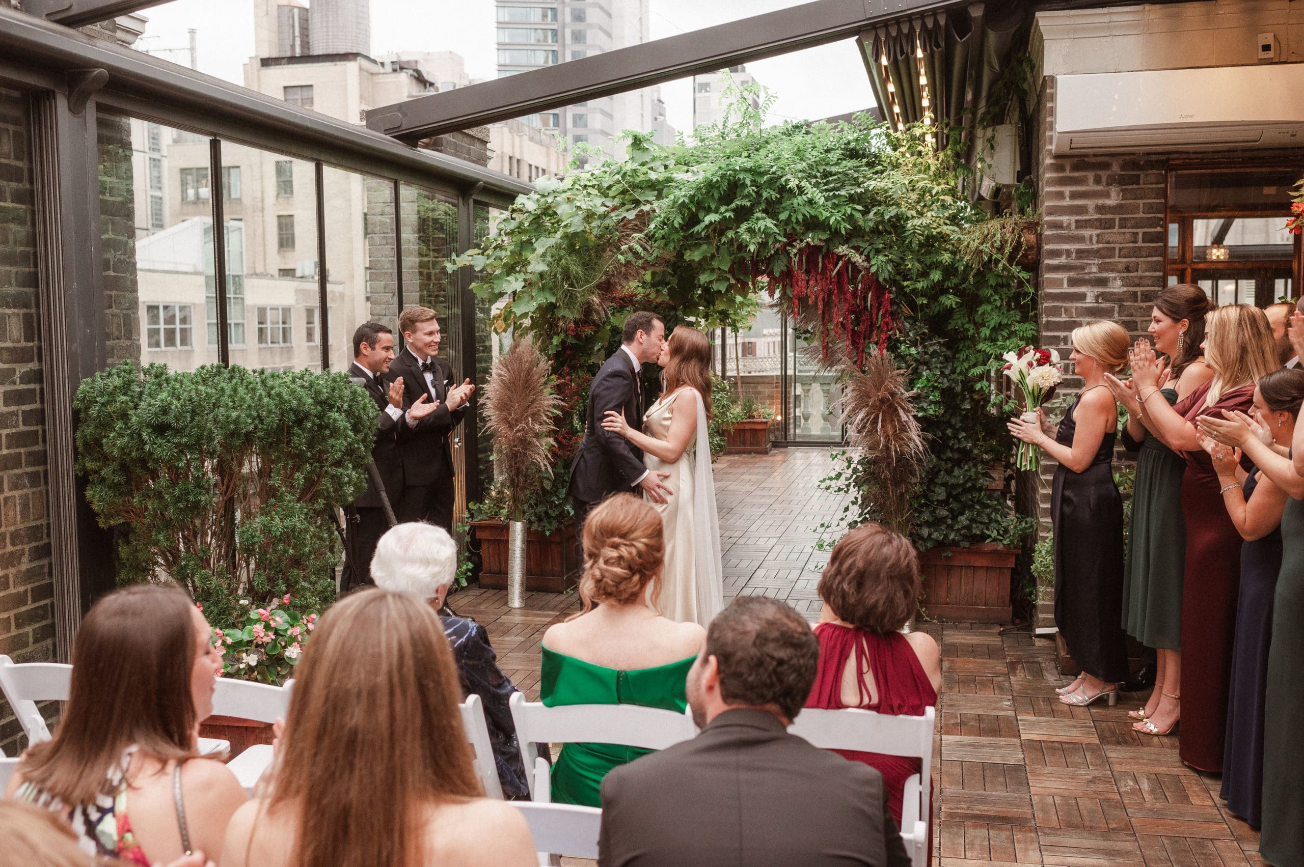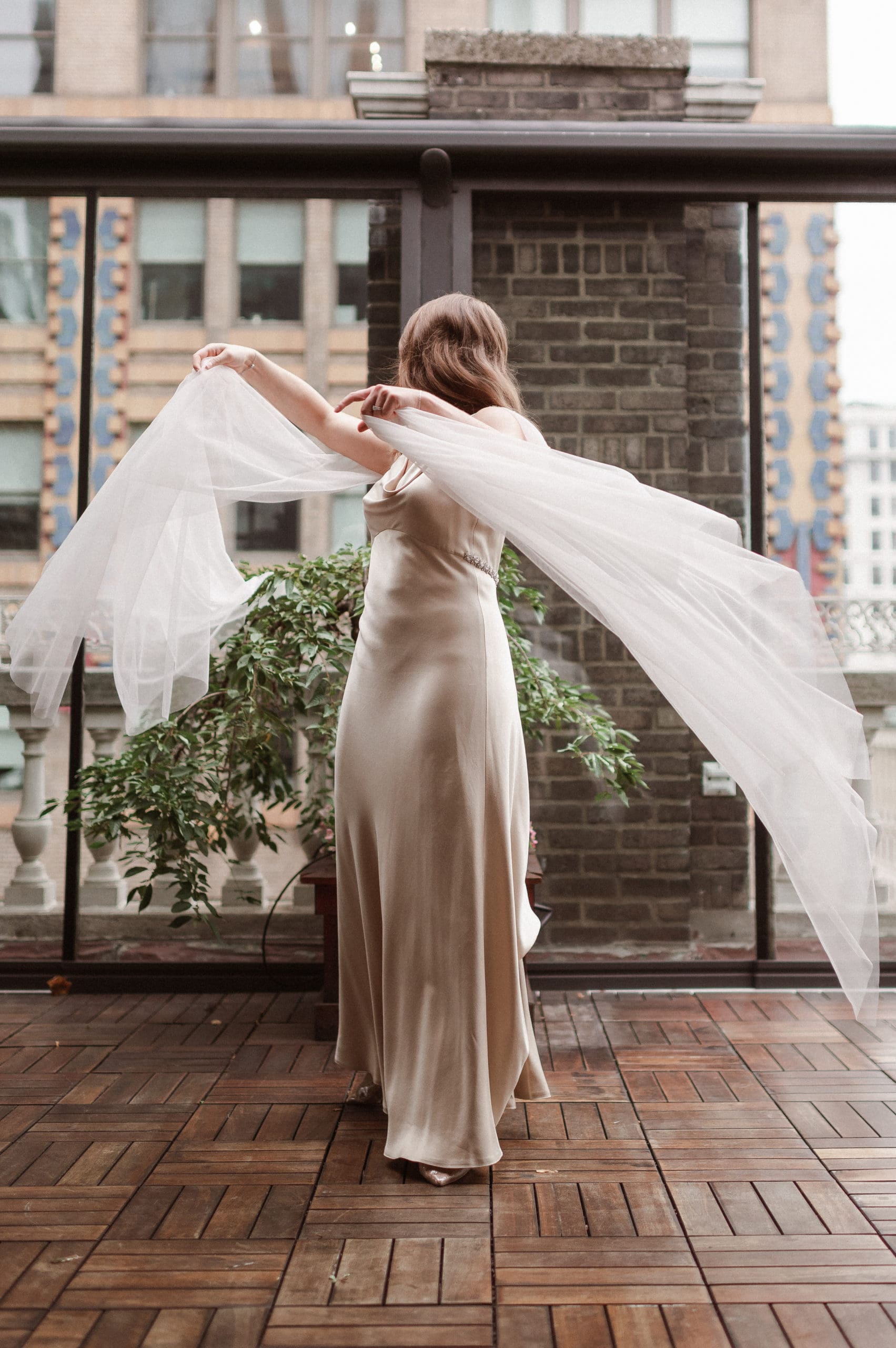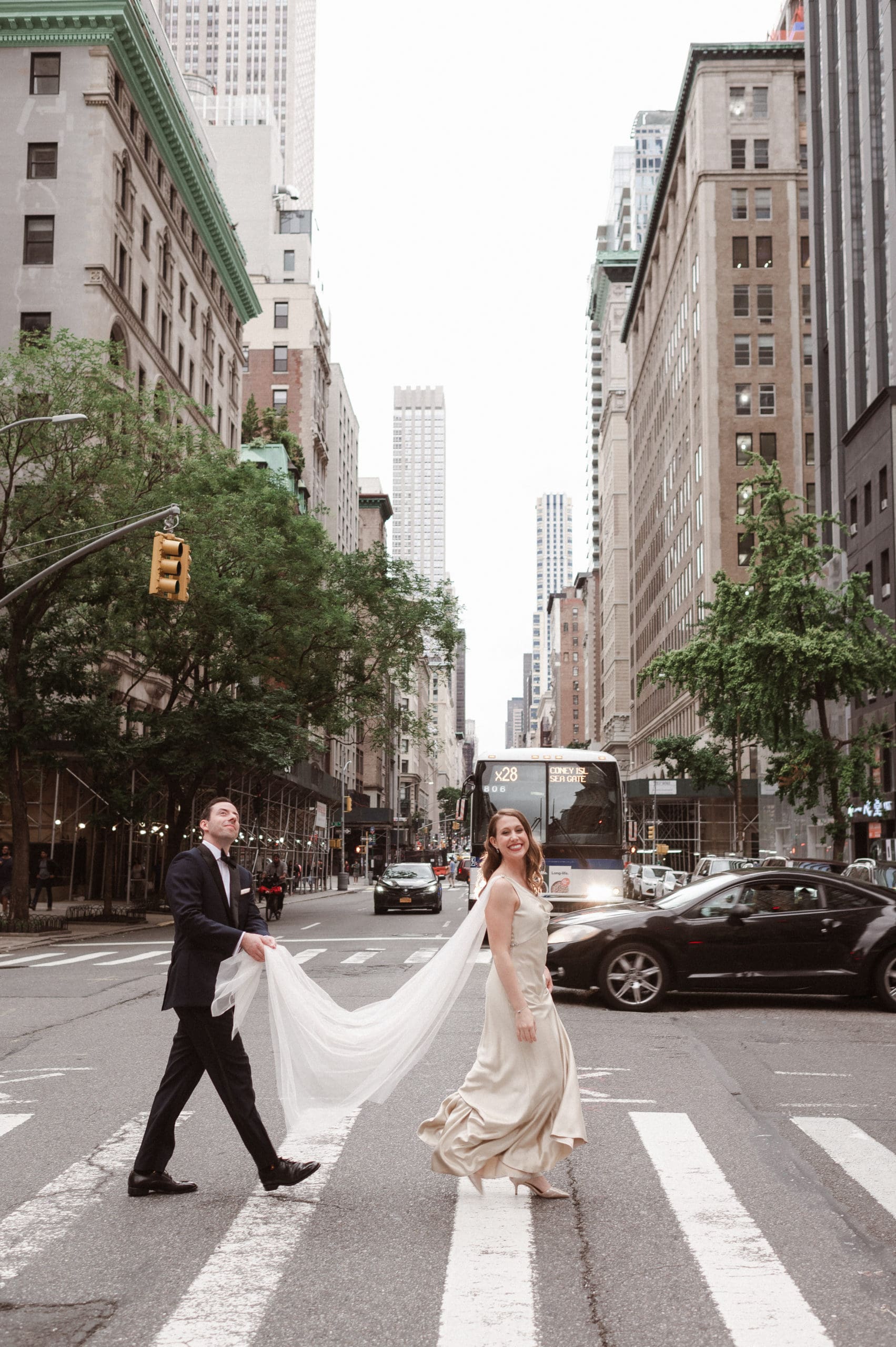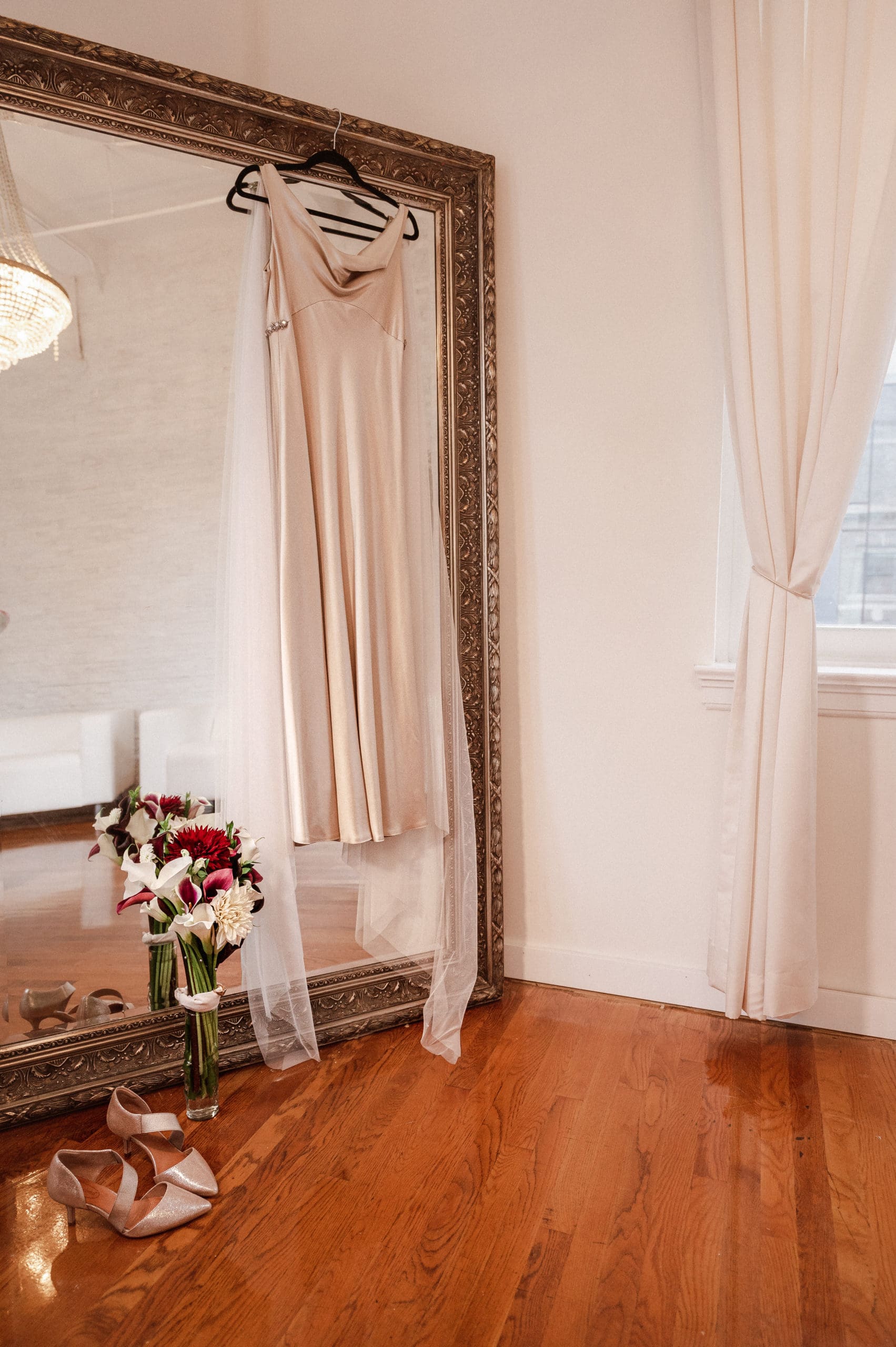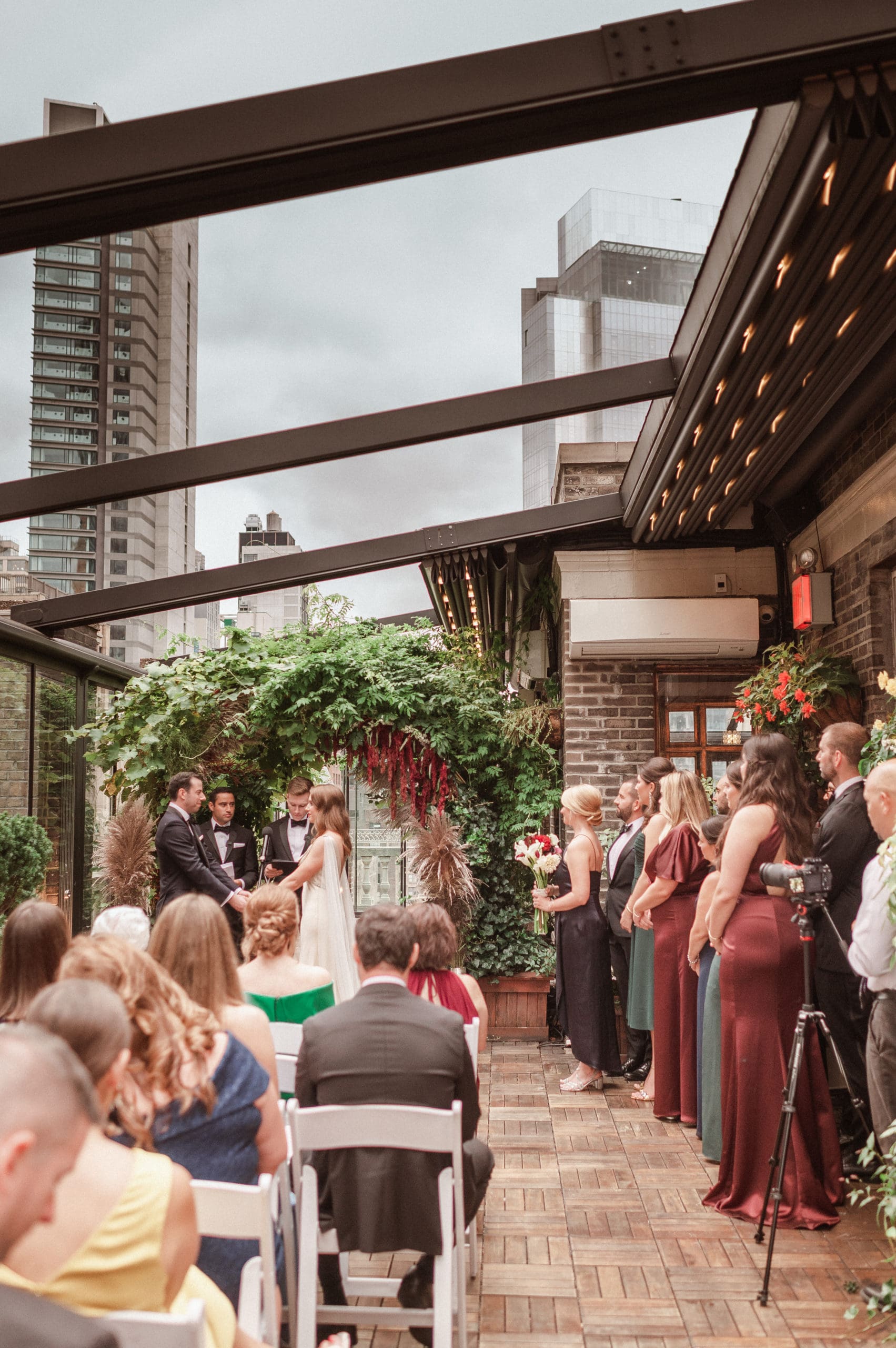 A collection of wedding photos at Midtown Loft and Terrace in Manhattan (NYC). The wedding took place in September, the weather was cooperating and we worked well around the foot traffic during the portrait sessions around 5th avenue. I loved how at this wedding, this couple did not stick with traditional things. Like, the bride wore a custom beautiful satin-textured champagne color dress by @designerloft_Bridal . There’s more about this day I loved, like how they invited their fur baby, Pickles, for photos! The wedding took place all at one location, which made the guests’/vendors lives easier so there’s no need to commute around NYC in order to get to the next location on time. I also loved the fact that they wrote vows and brought engraved 2020 wedding decorations/magnum champagne bottles to incorporate in their 2nd wedding date in 2021.