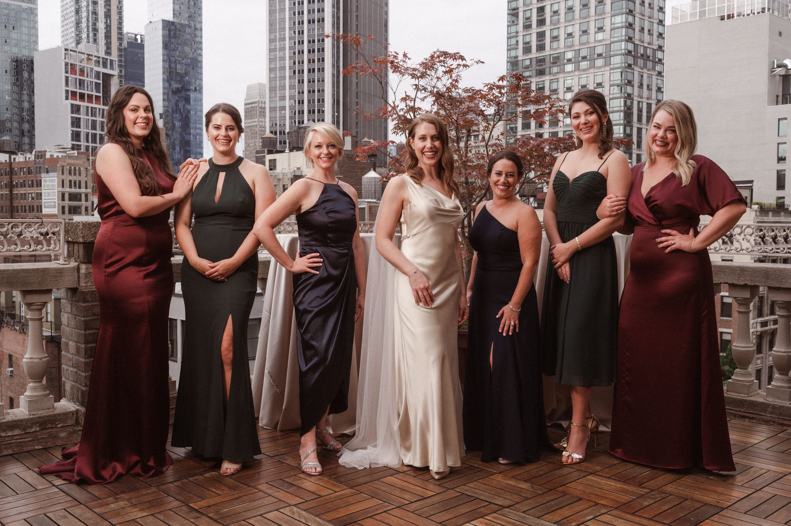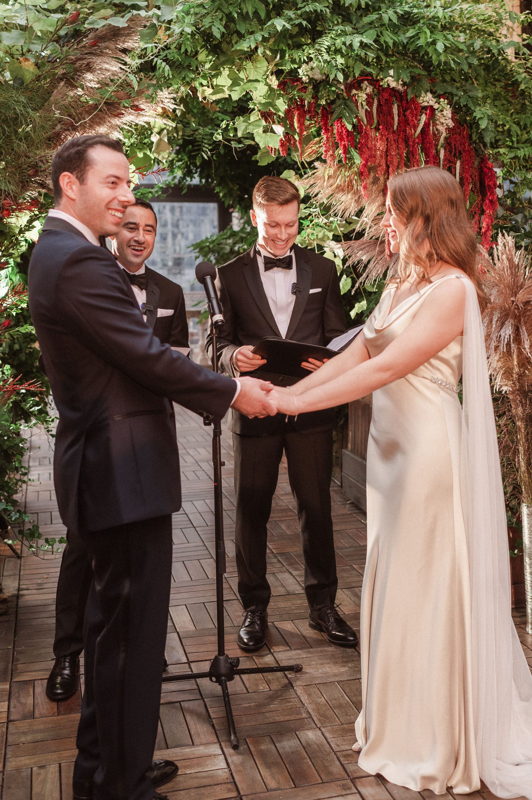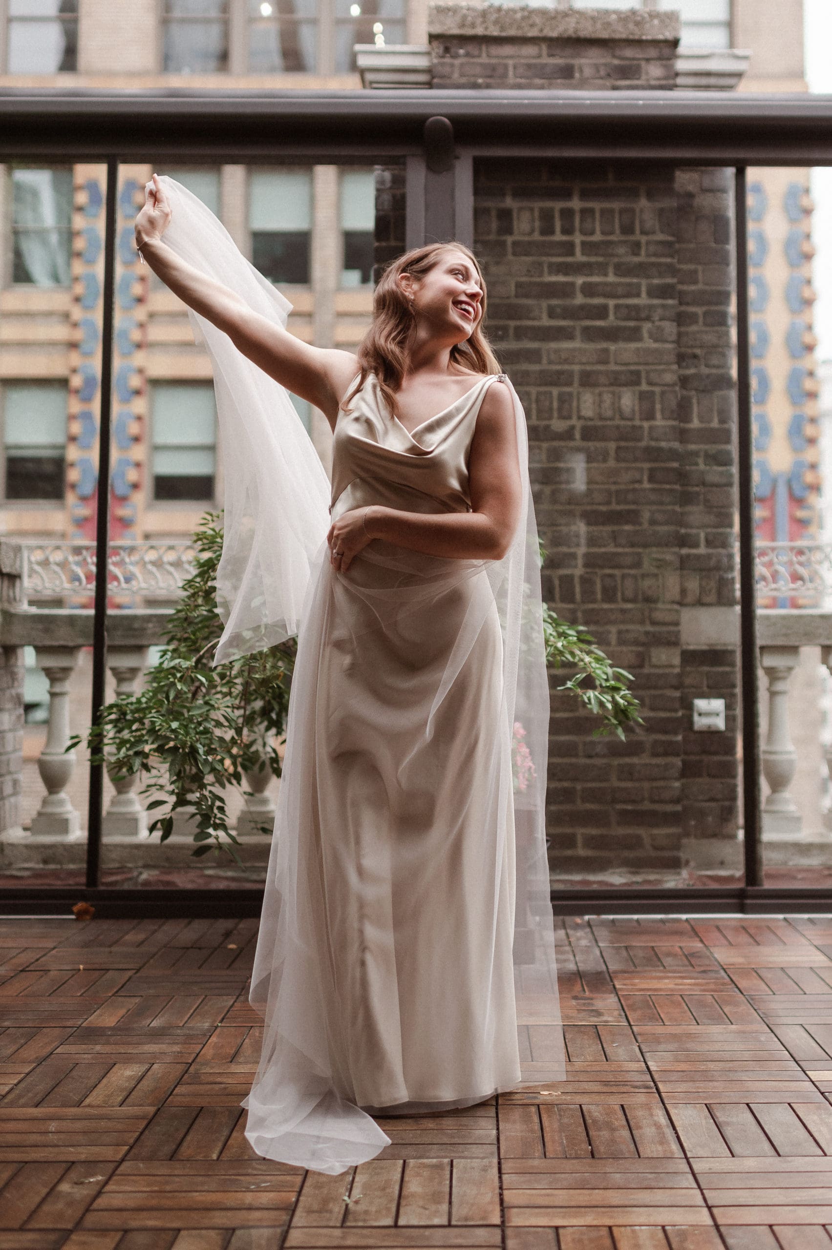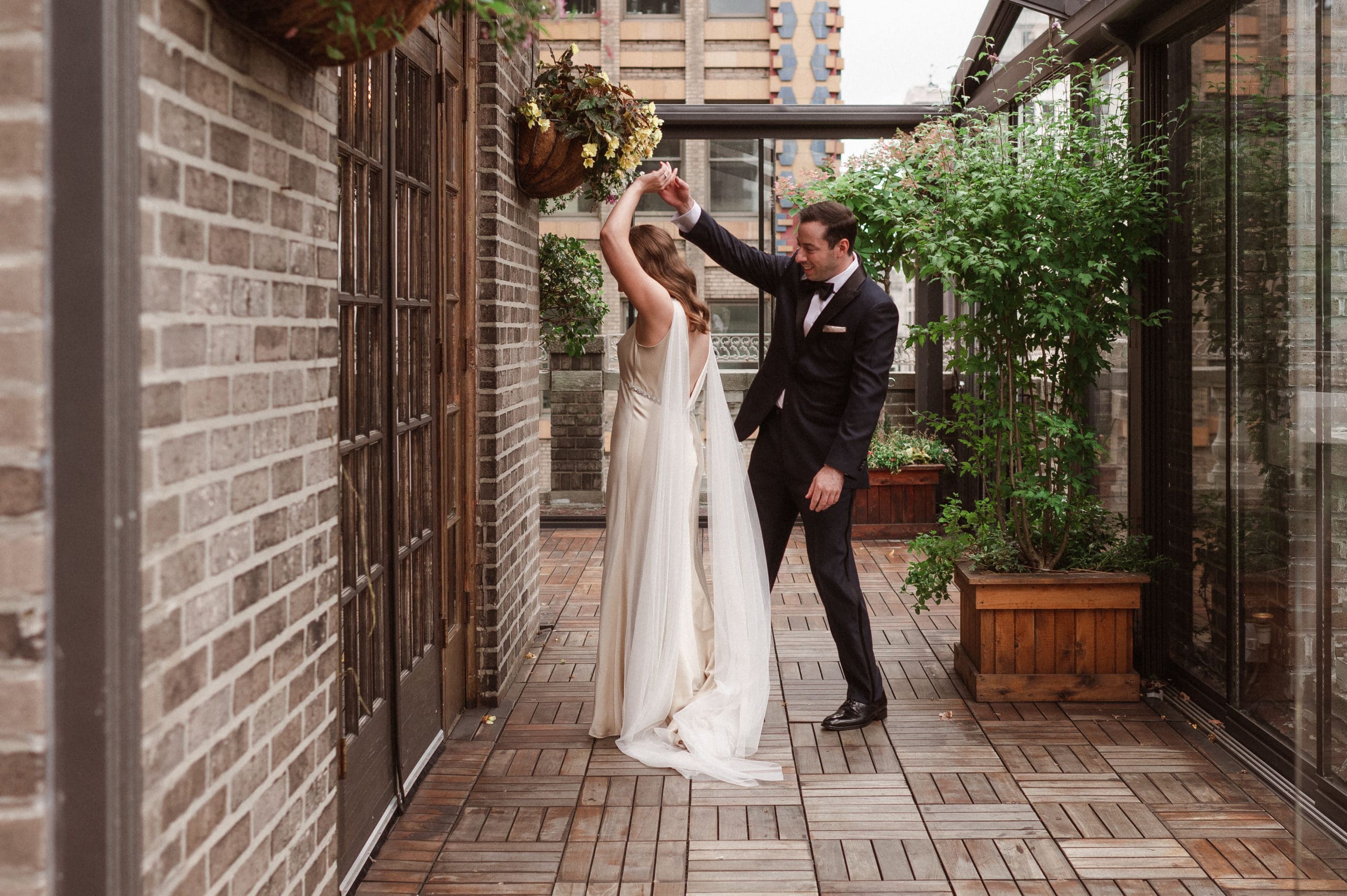 A collection of wedding photos at Midtown Loft and Terrace in Manhattan (NYC). The wedding took place in September, the weather was cooperating and we worked well around the foot traffic during the portrait sessions around 5th avenue. I loved how at this wedding, this couple did not stick with traditional things. Like, the bride wore a custom beautiful satin-textured champagne color dress by @designerloft_Bridal . There’s more about this day I loved, like how they invited their fur baby, Pickles, for photos! The wedding took place all at one location, which made the guests’/vendors lives easier so there’s no need to commute around NYC in order to get to the next location on time. I also loved the fact that they wrote vows and brought engraved 2020 wedding decorations/magnum champagne bottles to incorporate in their 2nd wedding date in 2021.