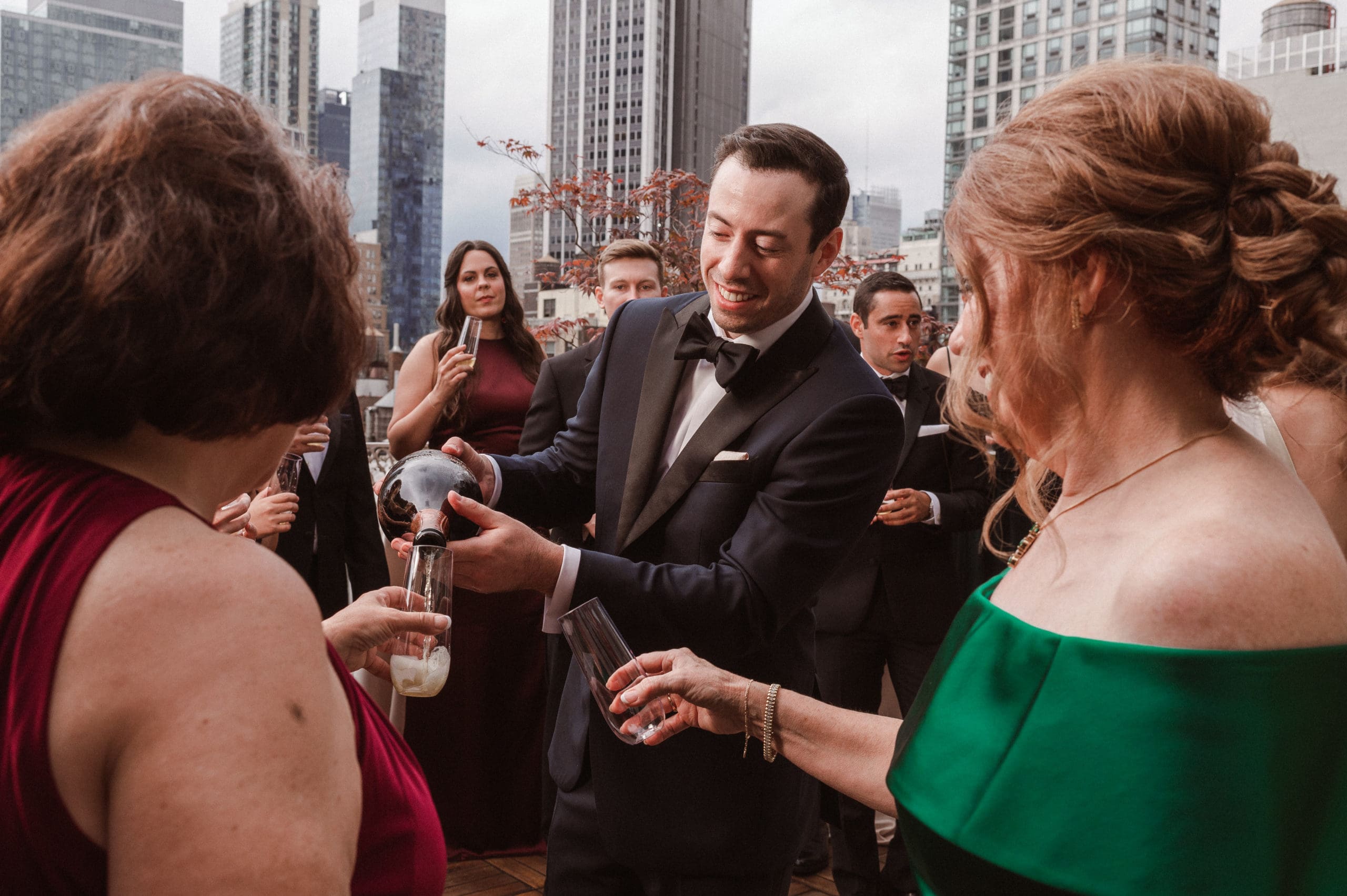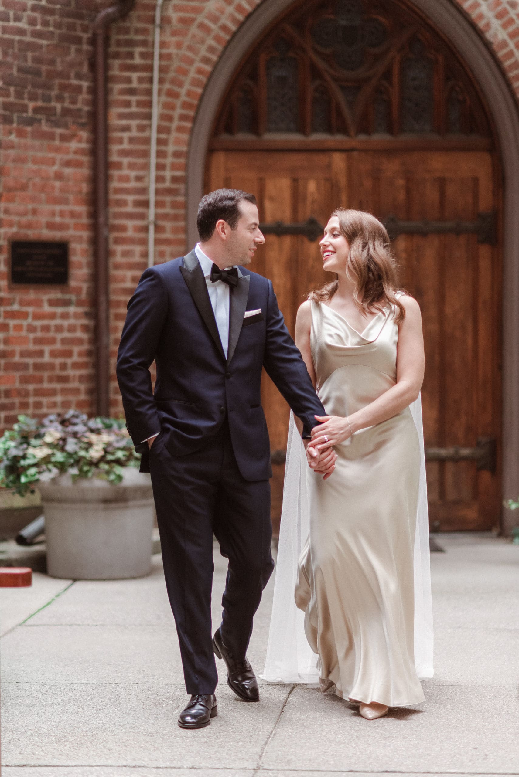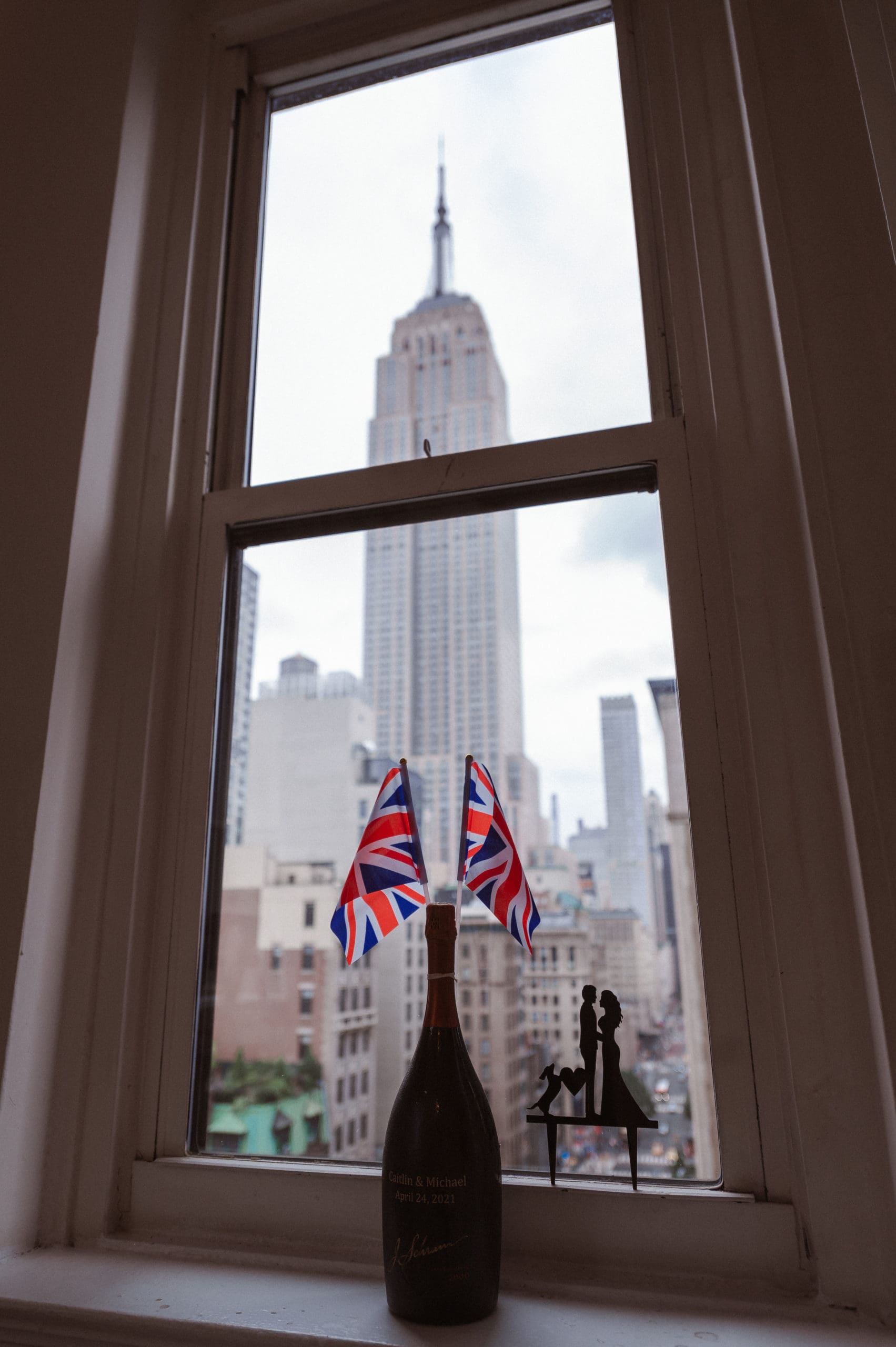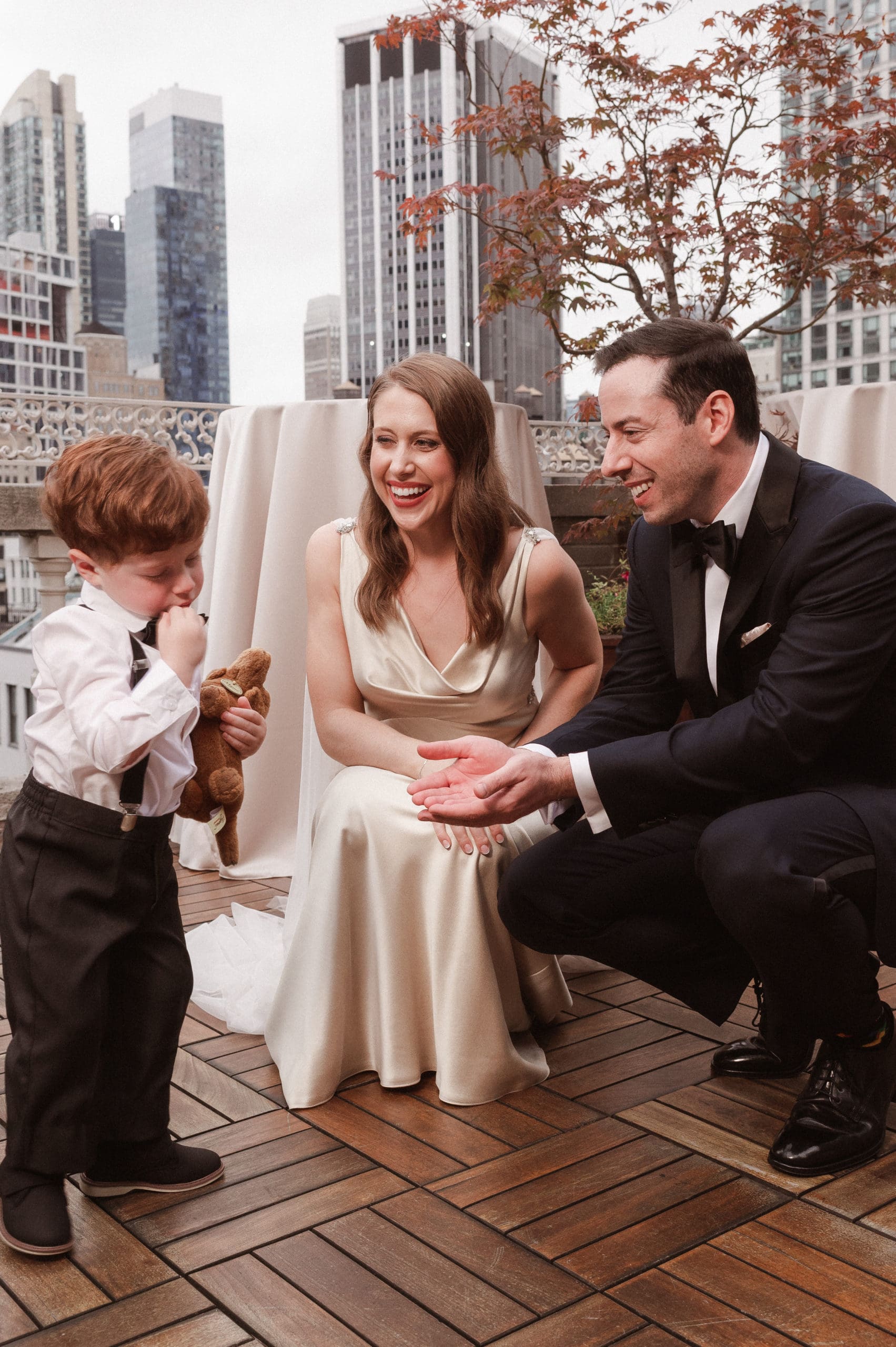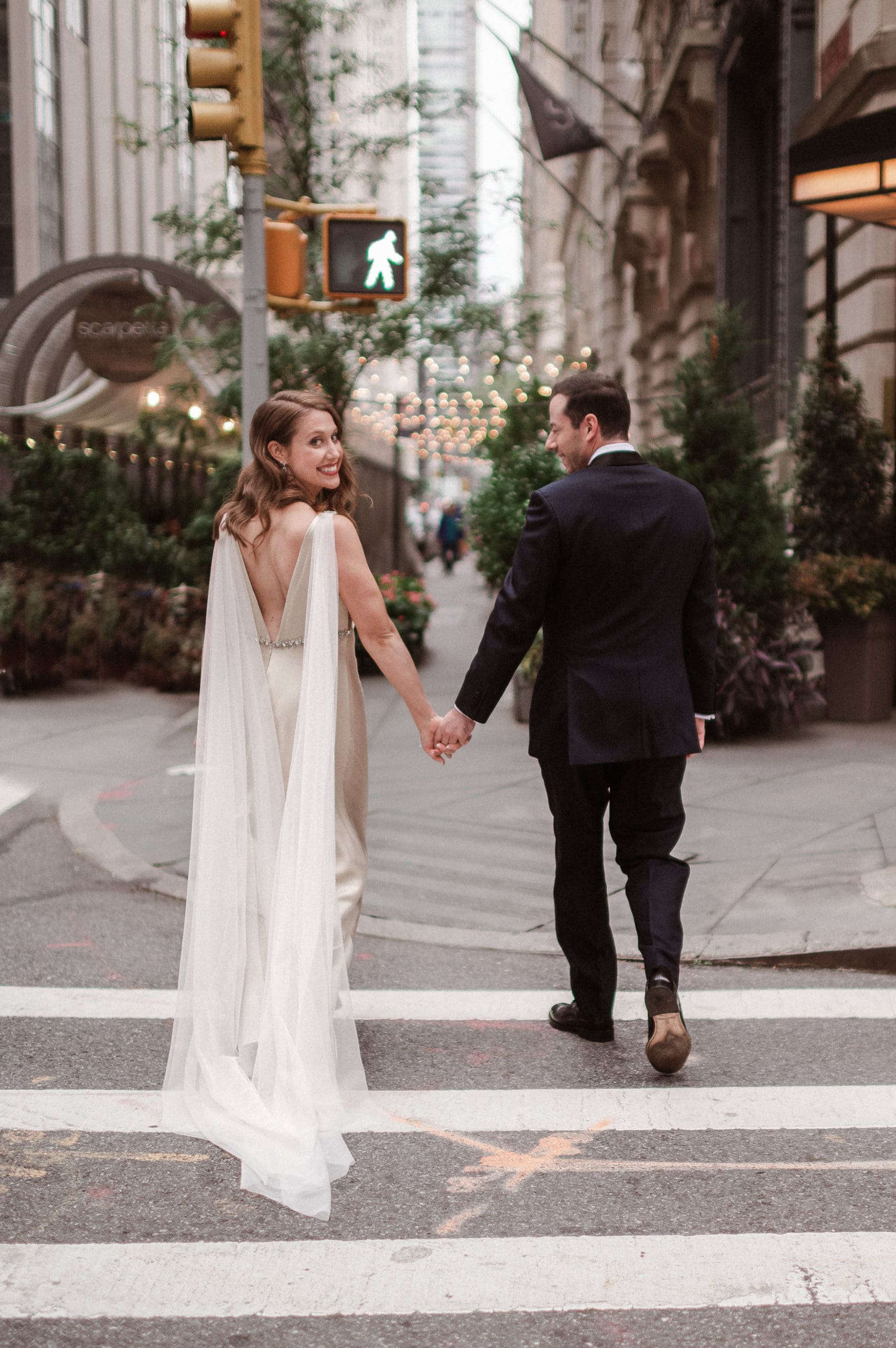 A collection of wedding photos at Midtown Loft and Terrace in Manhattan (NYC). The wedding took place in September, the weather was cooperating and we worked well around the foot traffic during the portrait sessions around 5th avenue. I loved how at this wedding, this couple did not stick with traditional things. Like, the bride wore a custom beautiful satin-textured champagne color dress by @designerloft_Bridal . There’s more about this day I loved, like how they invited their fur baby, Pickles, for photos! The wedding took place all at one location, which made the guests’/vendors lives easier so there’s no need to commute around NYC in order to get to the next location on time. I also loved the fact that they wrote vows and brought engraved 2020 wedding decorations/magnum champagne bottles to incorporate in their 2nd wedding date in 2021.