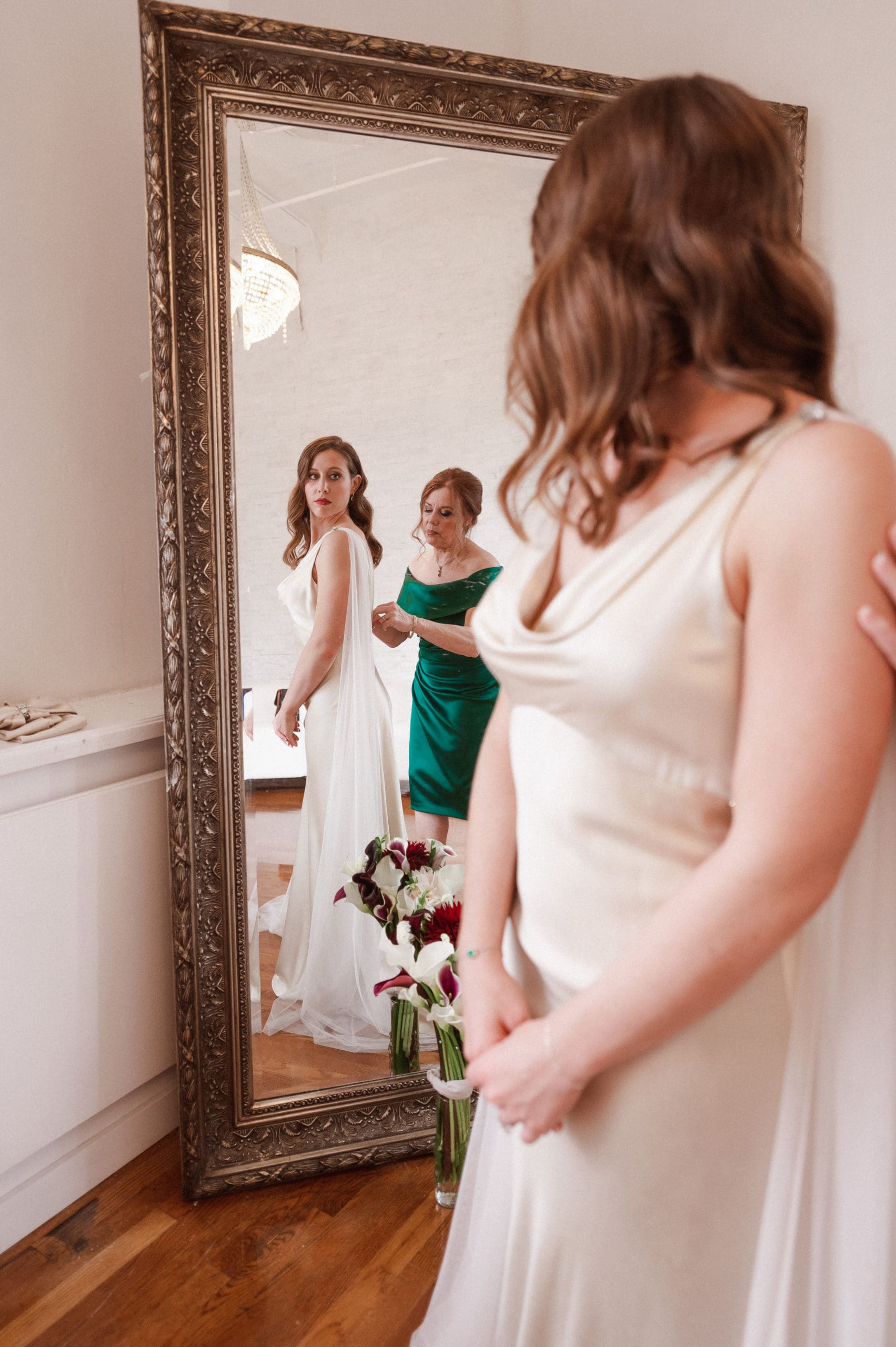 This couple did not “getting ready photos”, rather the bride wanted private prep moments after the salon with her mother in the closed-curtain bridal suite. The groom just wanted to start portraits during their first look.