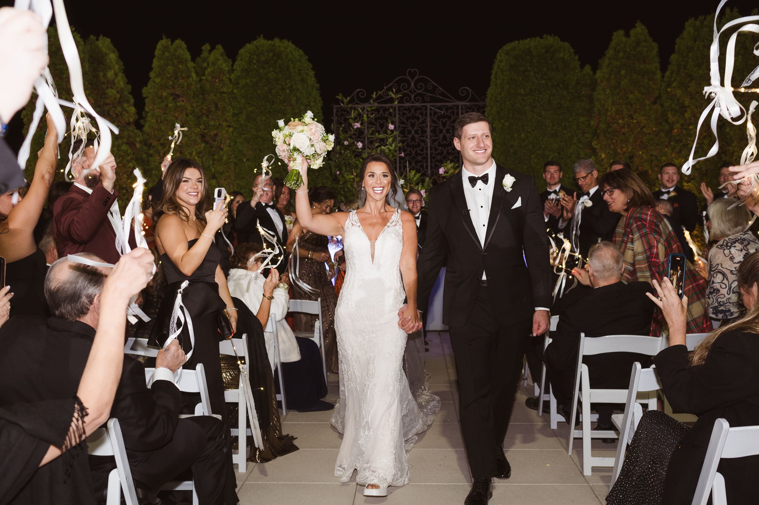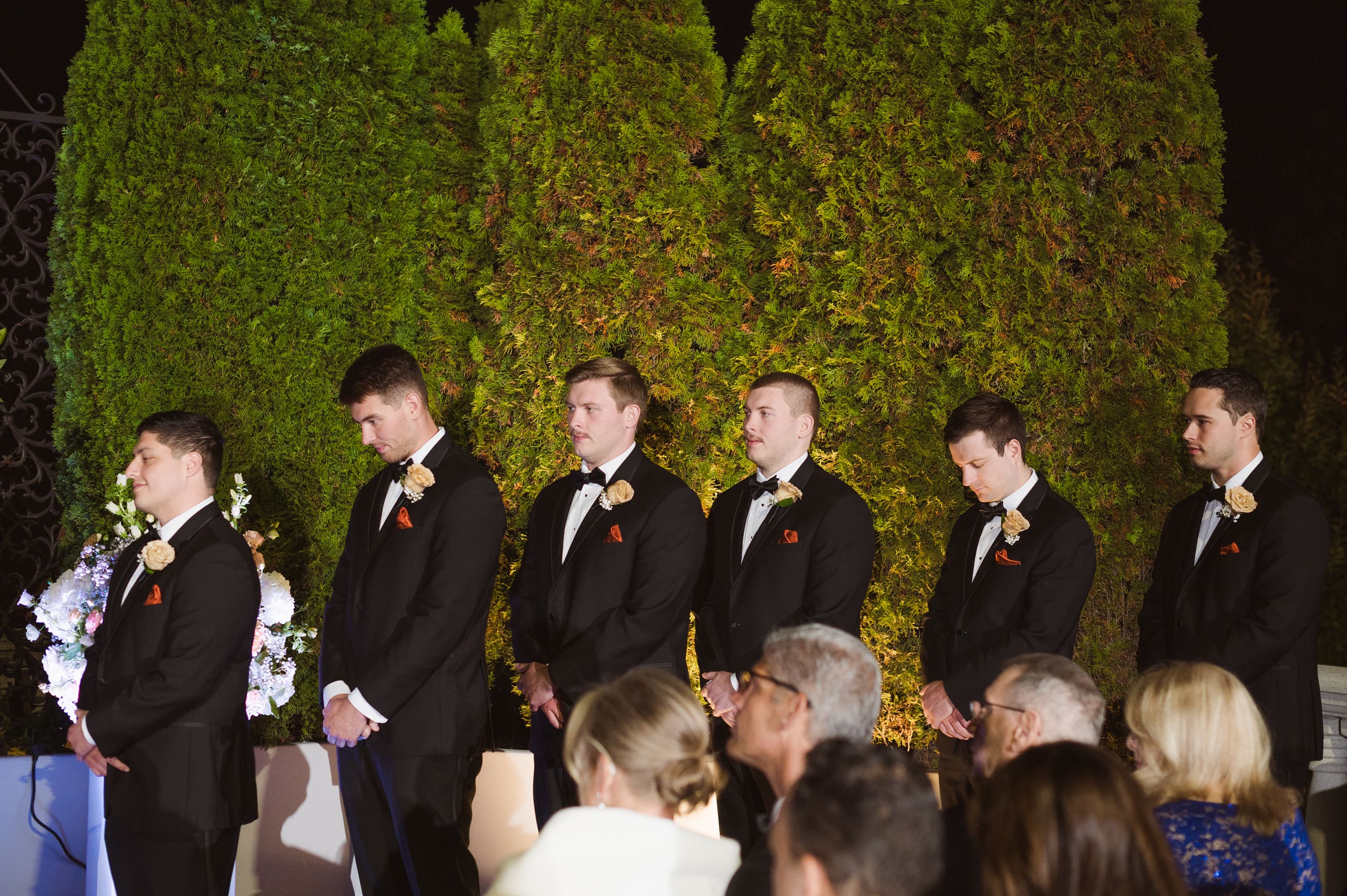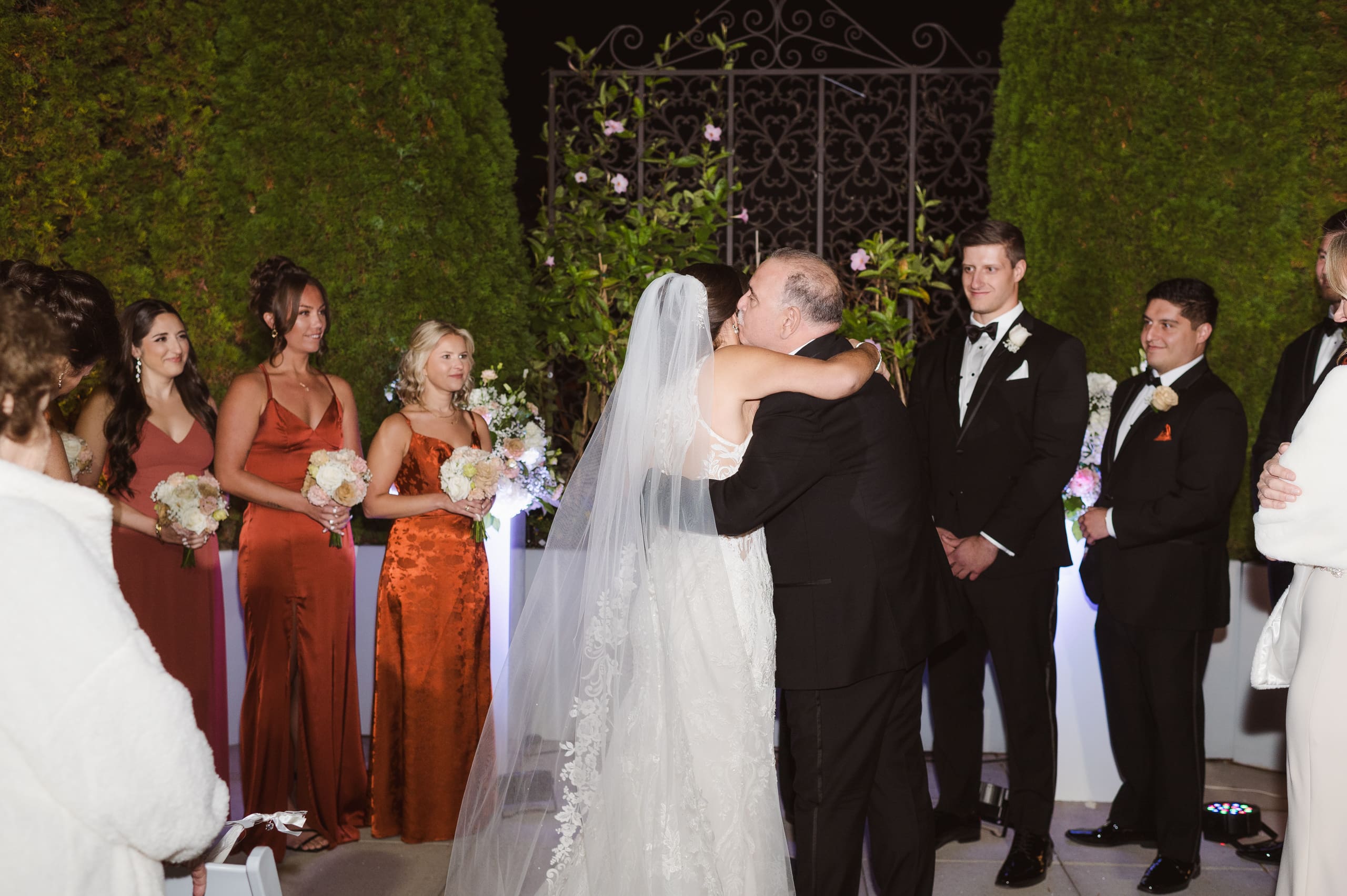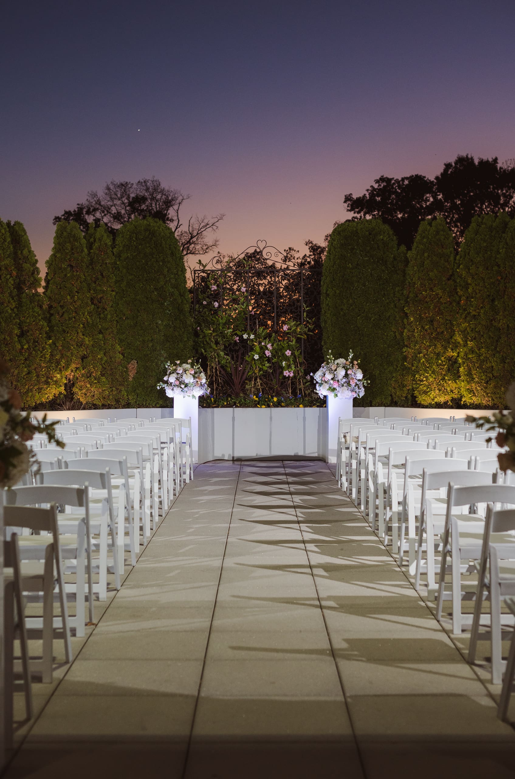The ceremony took place after sunset, and I suggested to the couple that they consider adding uplighting to brighten up the beautiful background trees. It really helps the photos pop and ensures their special moments don’t get lost in the darkness. Given the large guest count, the ceremony setup felt a bit tight, which is common for big weddings. I recommend keeping the wedding party seated at the altar to make it easier to capture those intimate moments. And if we could create a little walkway along the outer aisles for photographers, that would help us capture those beautiful exchanges without getting in the way.