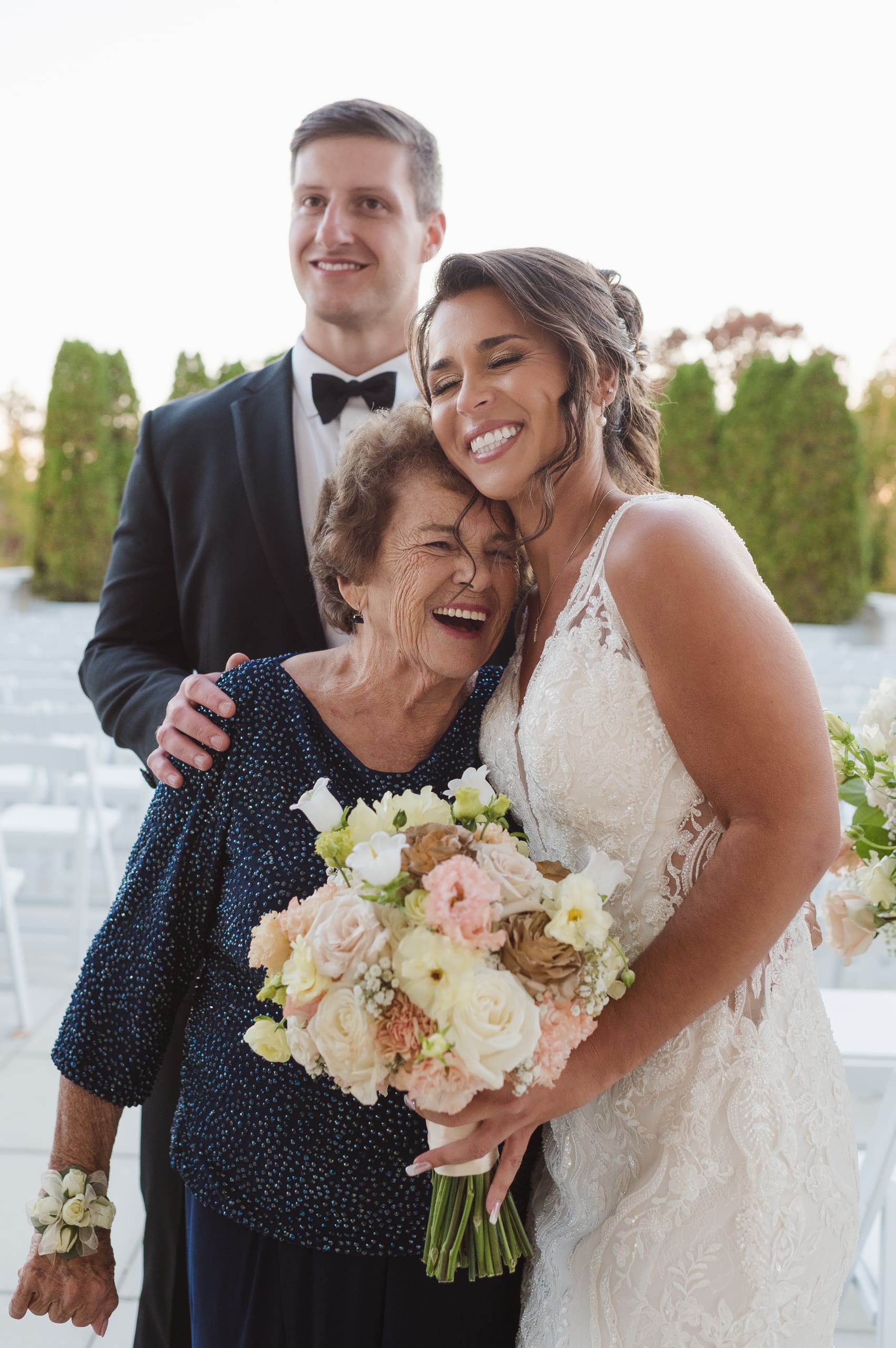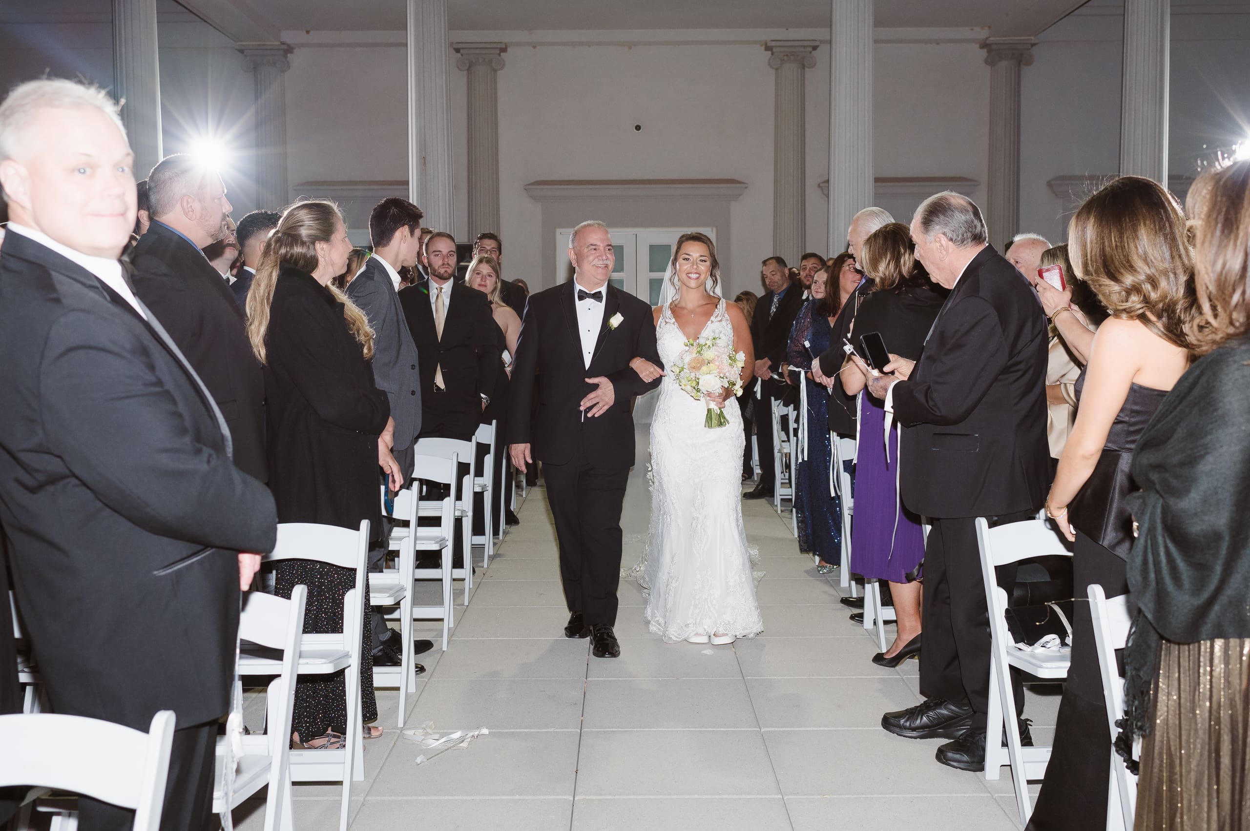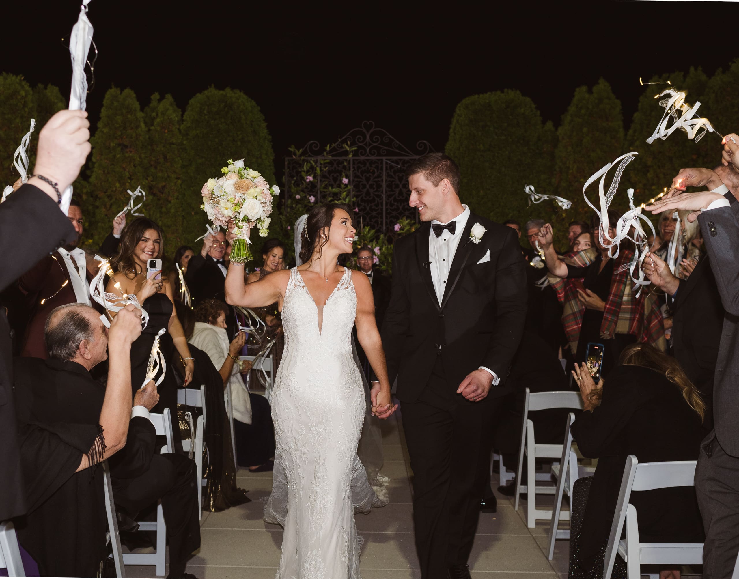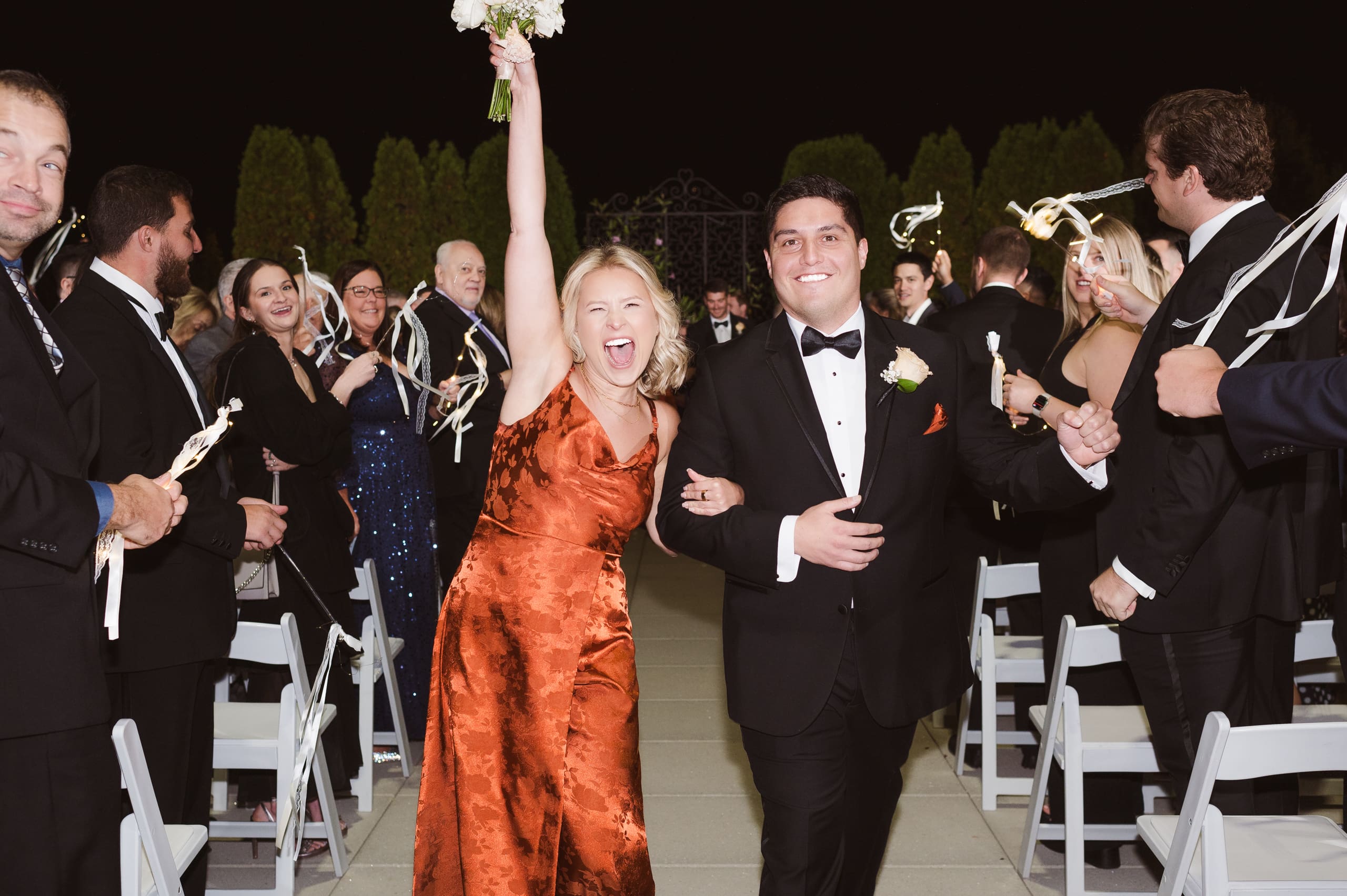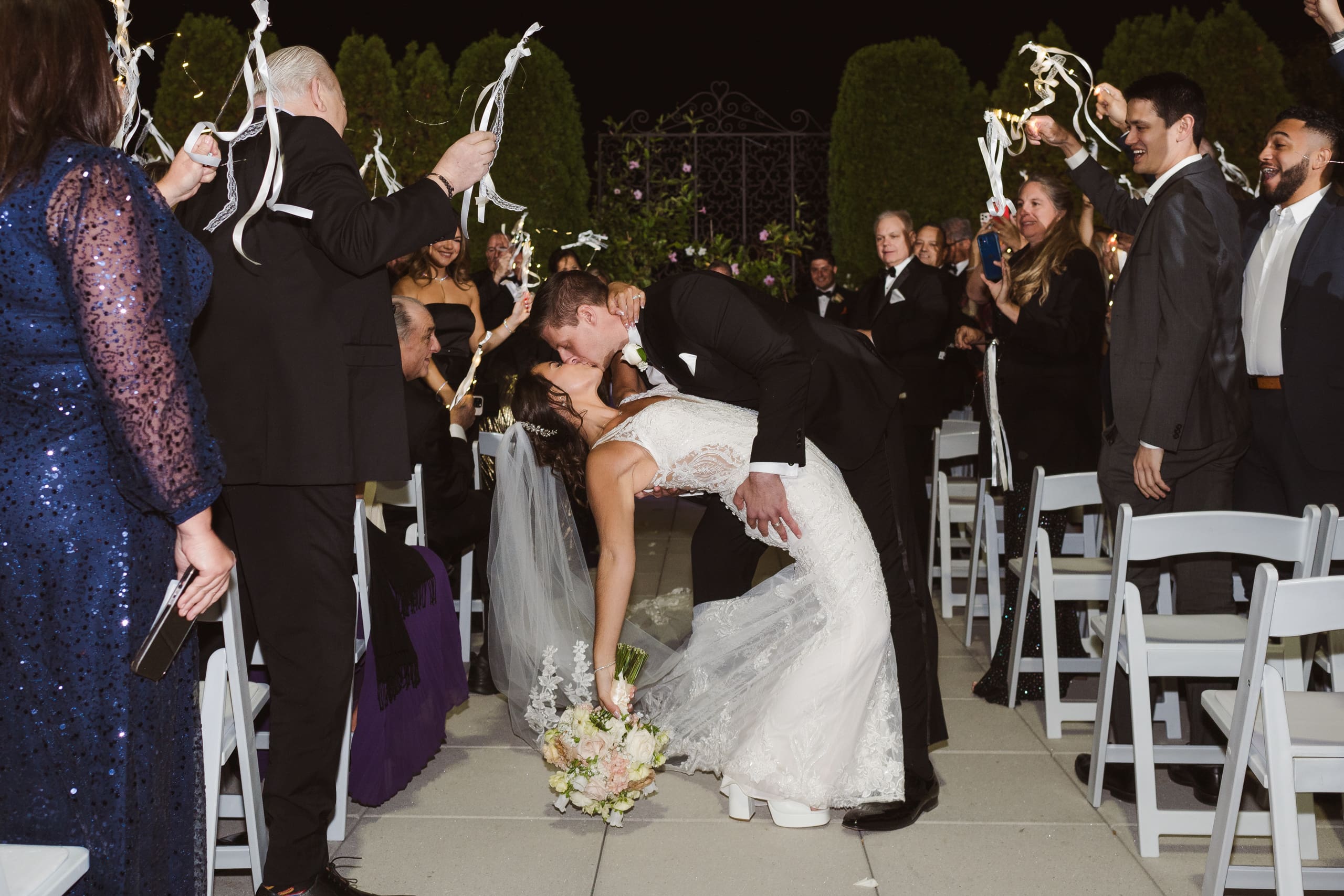 The ceremony took place after sunset, and I suggested to the couple that they consider adding uplighting to brighten up the beautiful background trees. It really helps the photos pop and ensures their special moments don’t get lost in the darkness. Given the large guest count, the ceremony setup felt a bit tight, which is common for big weddings. I recommend keeping the wedding party seated at the altar to make it easier to capture those intimate moments. And if we could create a little walkway along the outer aisles for photographers, that would help us capture those beautiful exchanges without getting in the way.