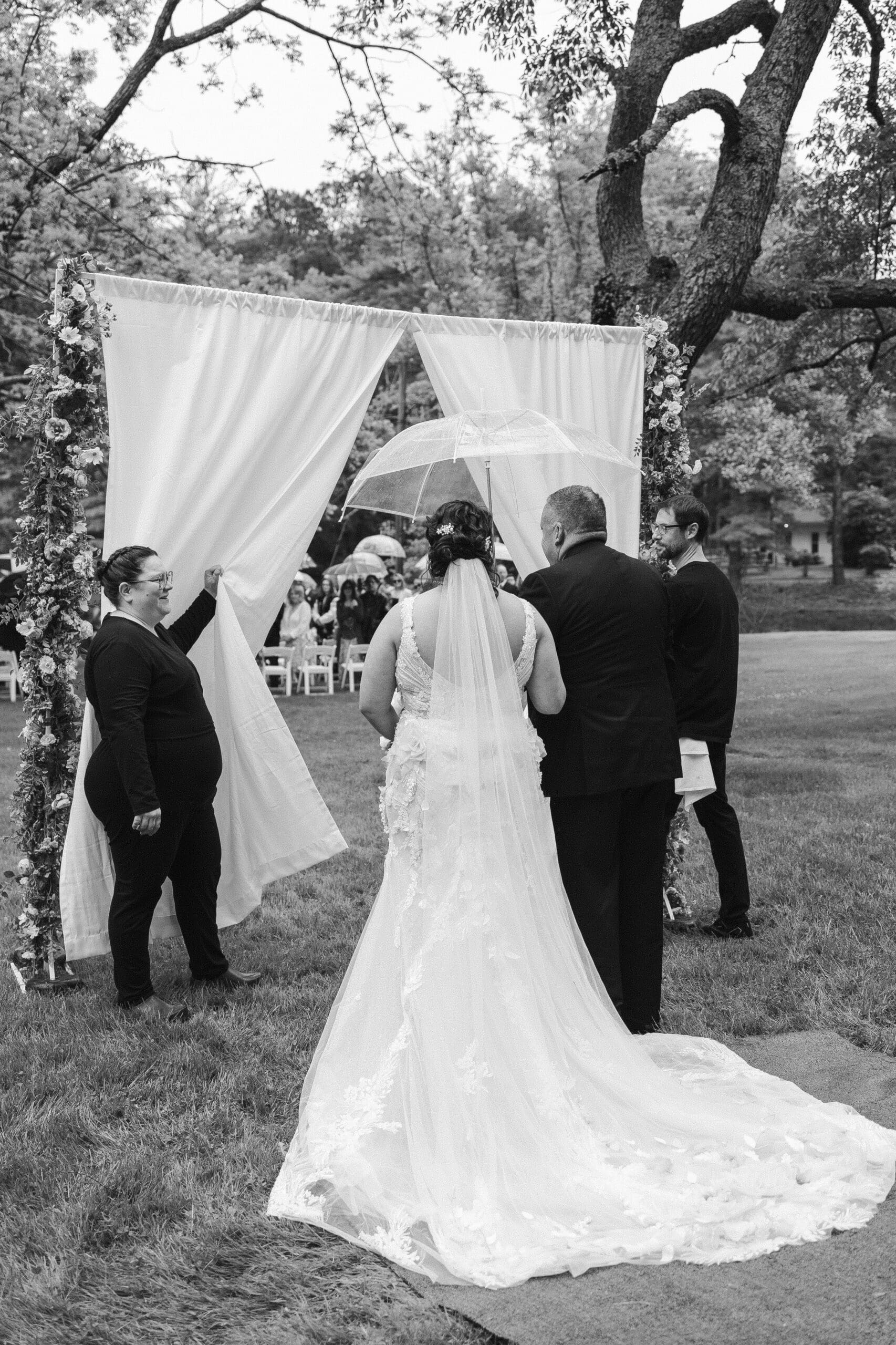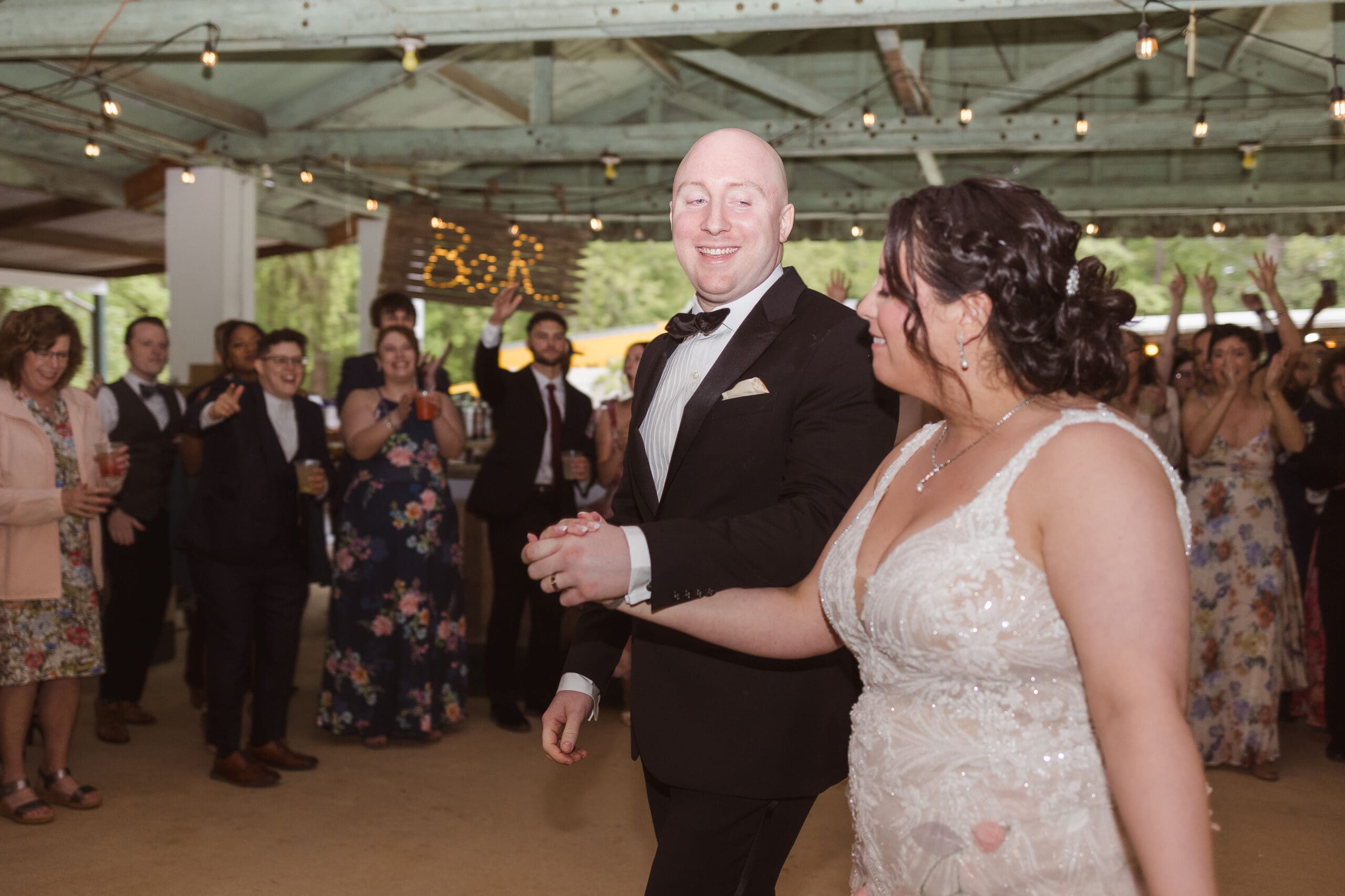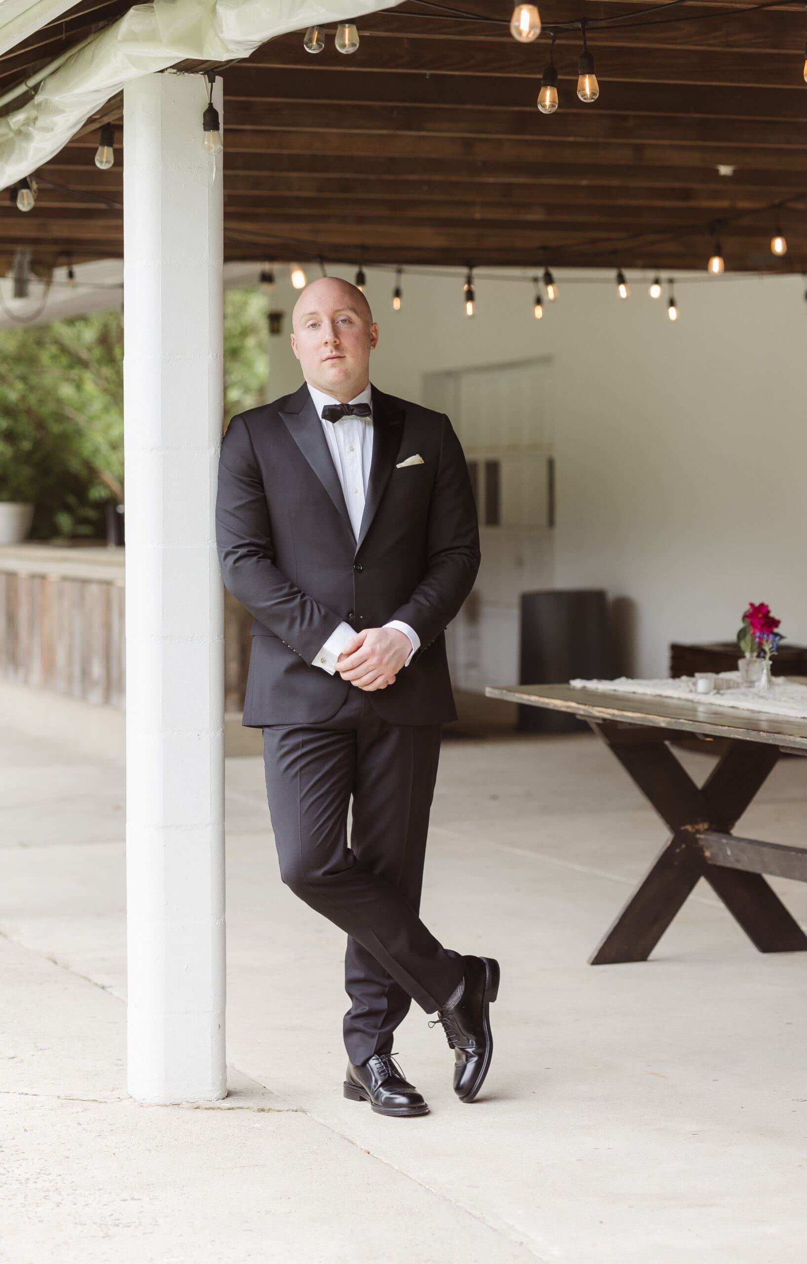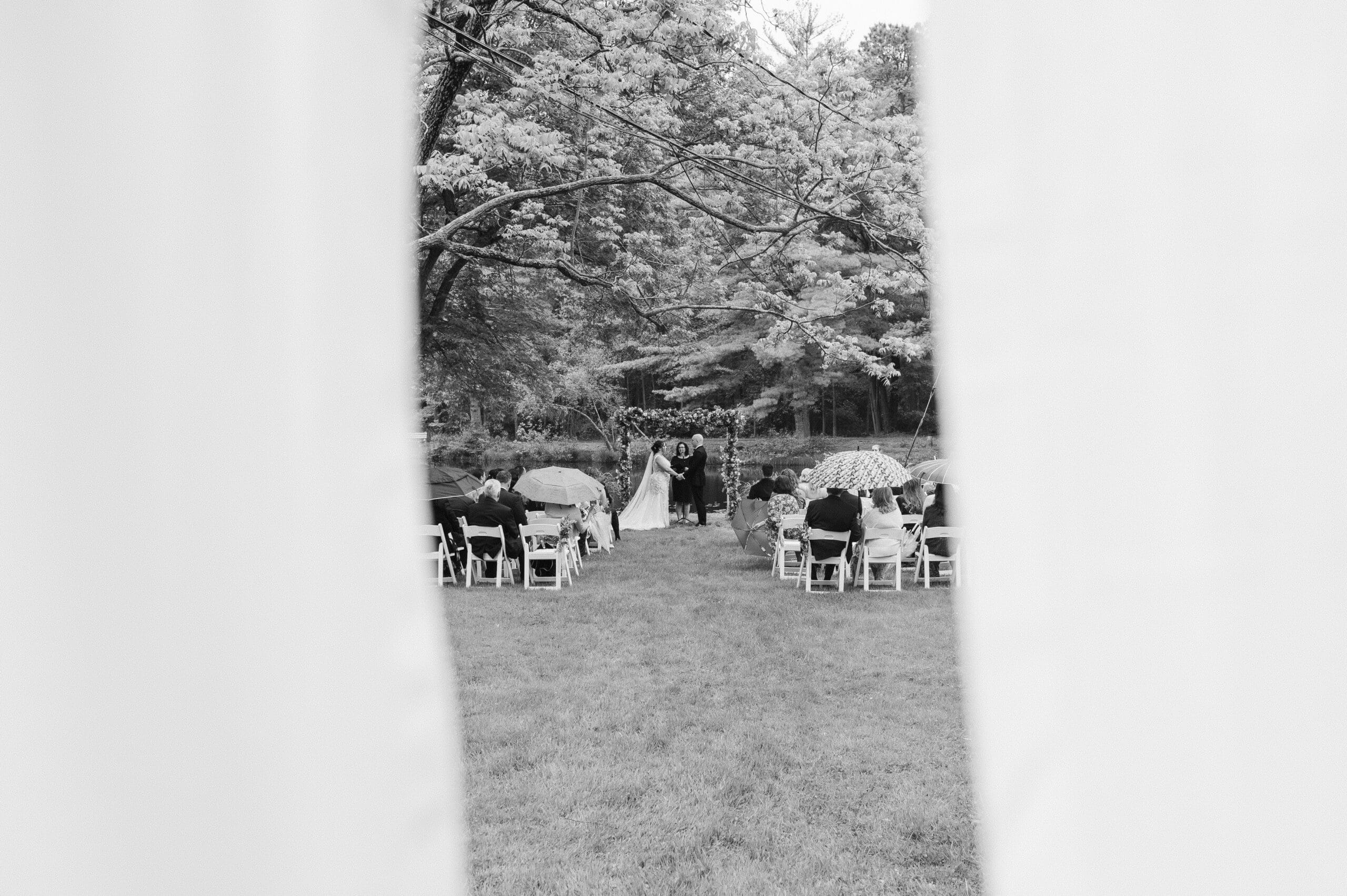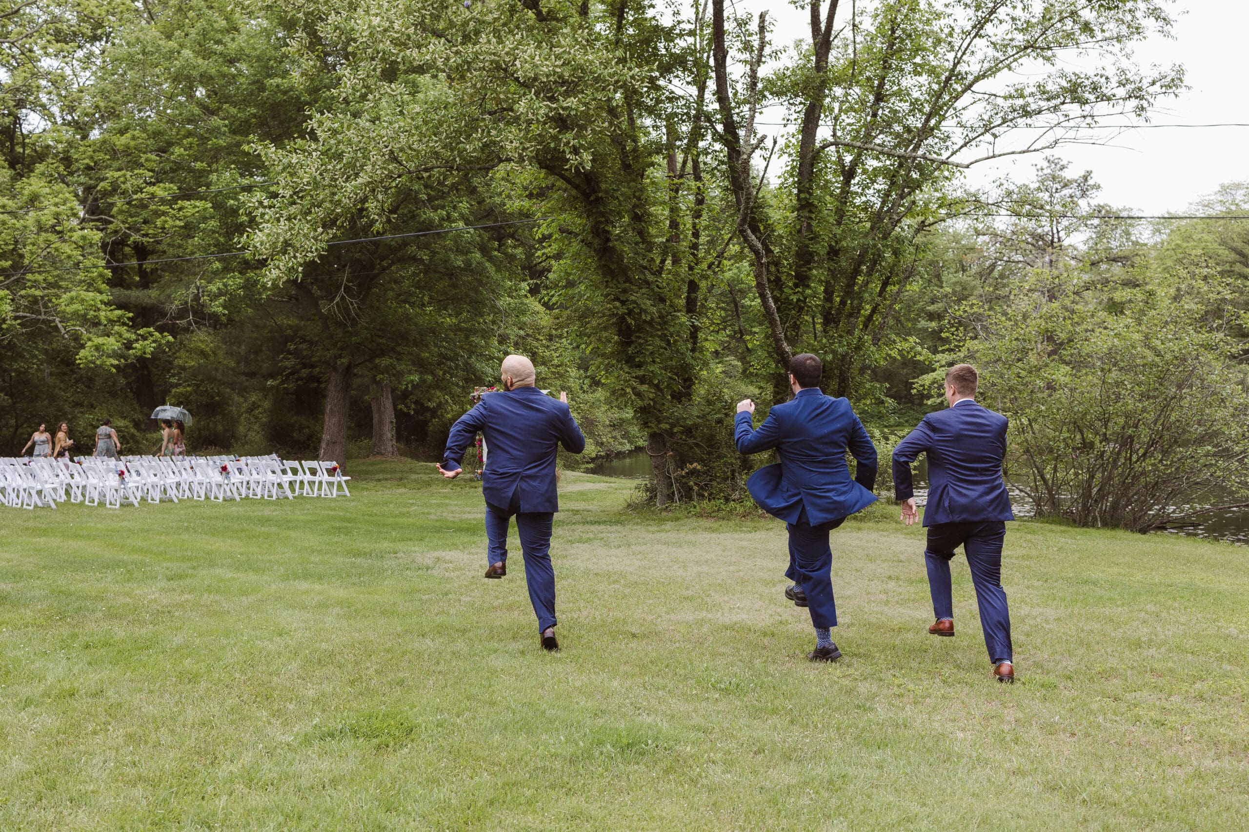 We began with a first look, followed by portraits of just the bride and groom wearing their wedding bands. We then took photos of the wedding party (bridesmaids and groomsmen) and family. We had about 45 minutes to spare to prepare and chill out before the ceremony and the guests’ arrival. It rained during their ceremony, but we continued despite the drizzle not dampening our mood. Afterward, we celebrated with food, dancing, and an open bar under the glow of Pat’s 30 Acre’s Edison bulbs all night long.
