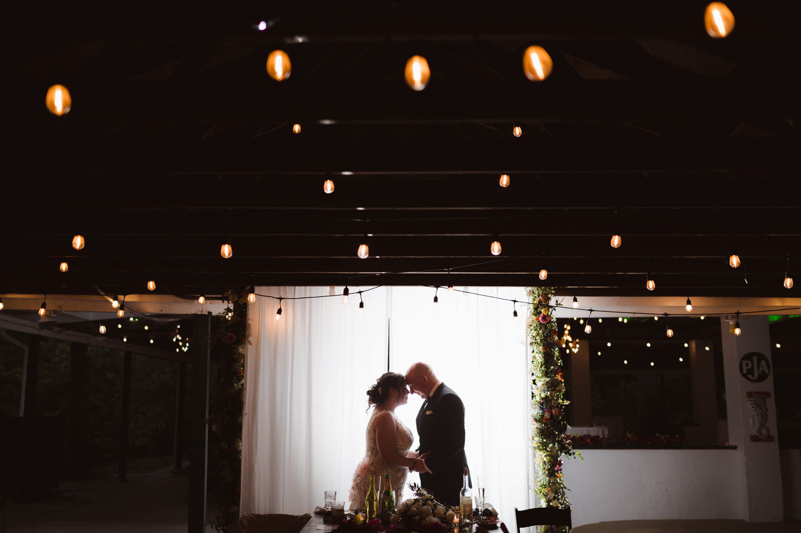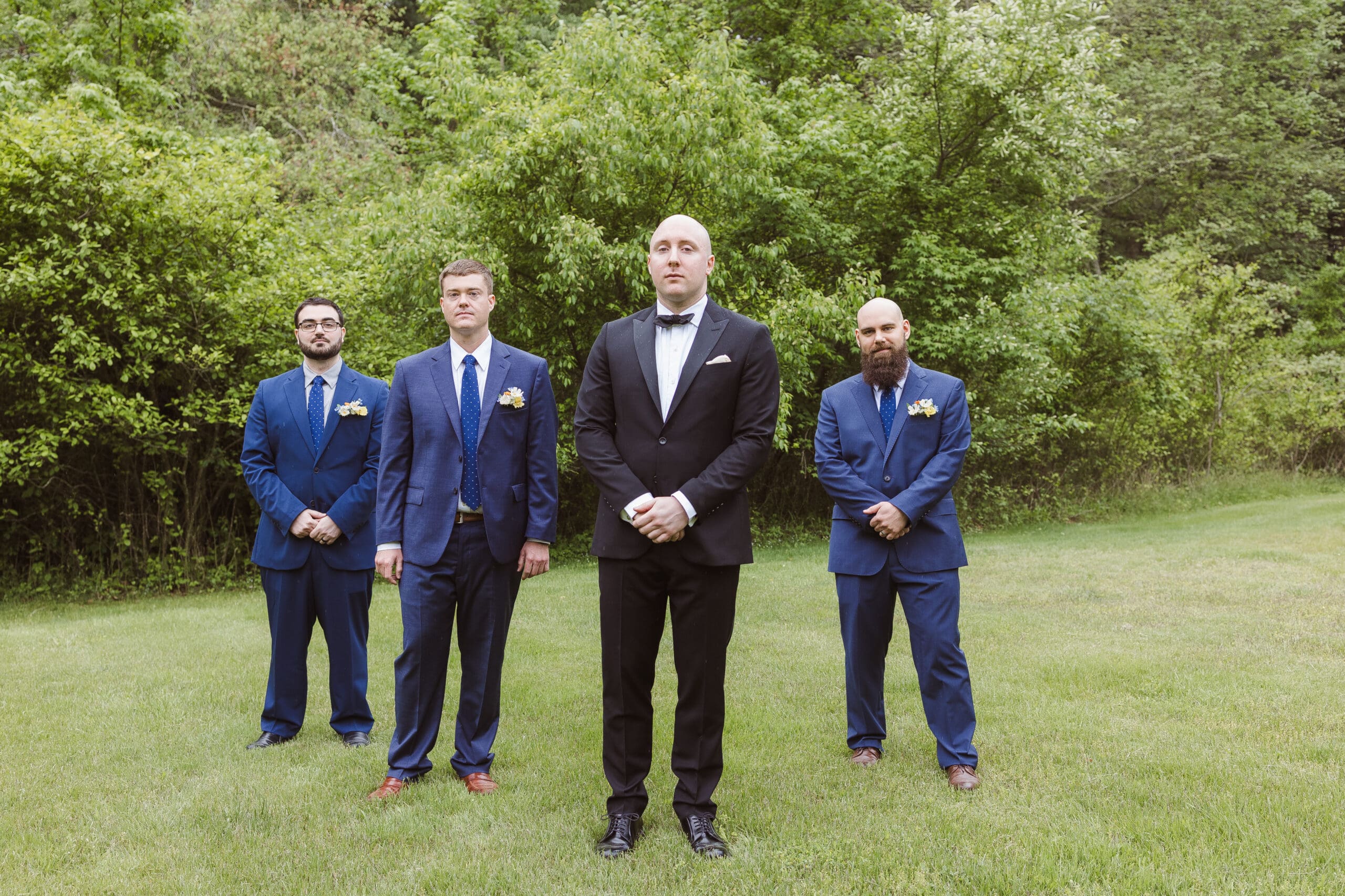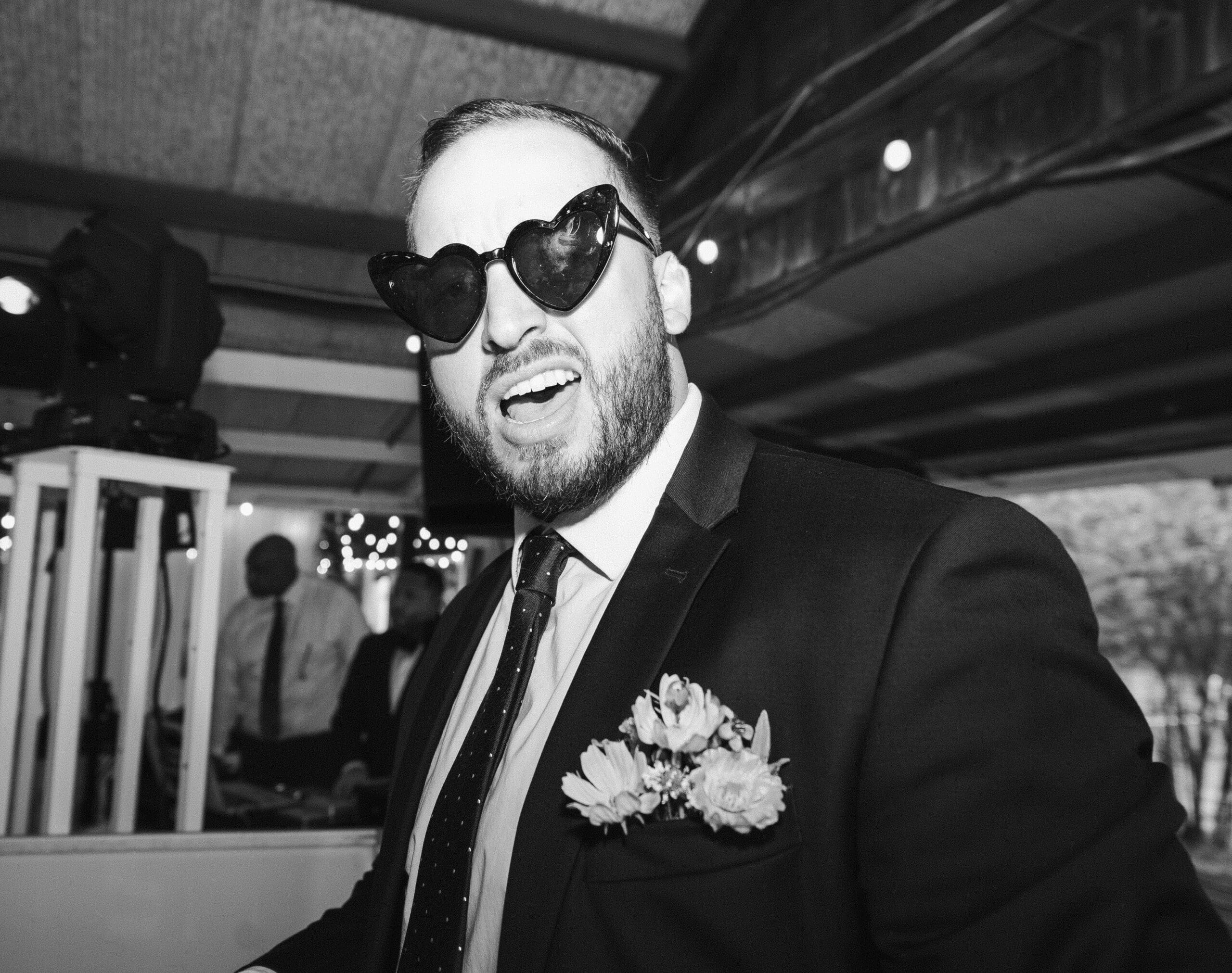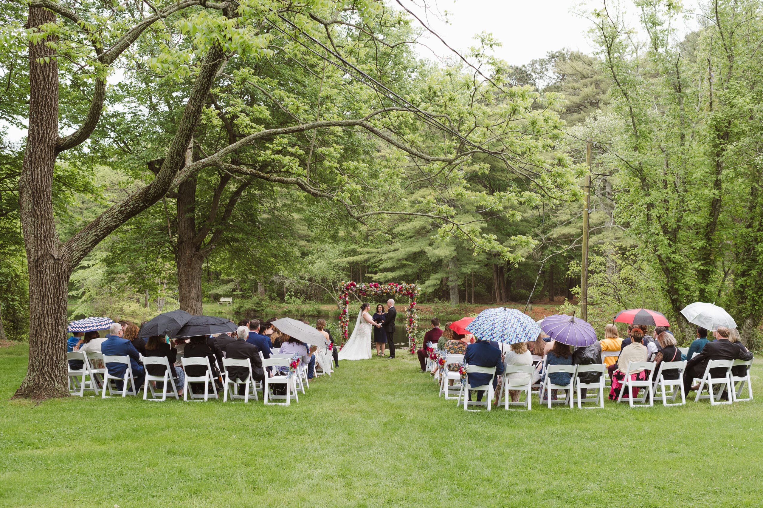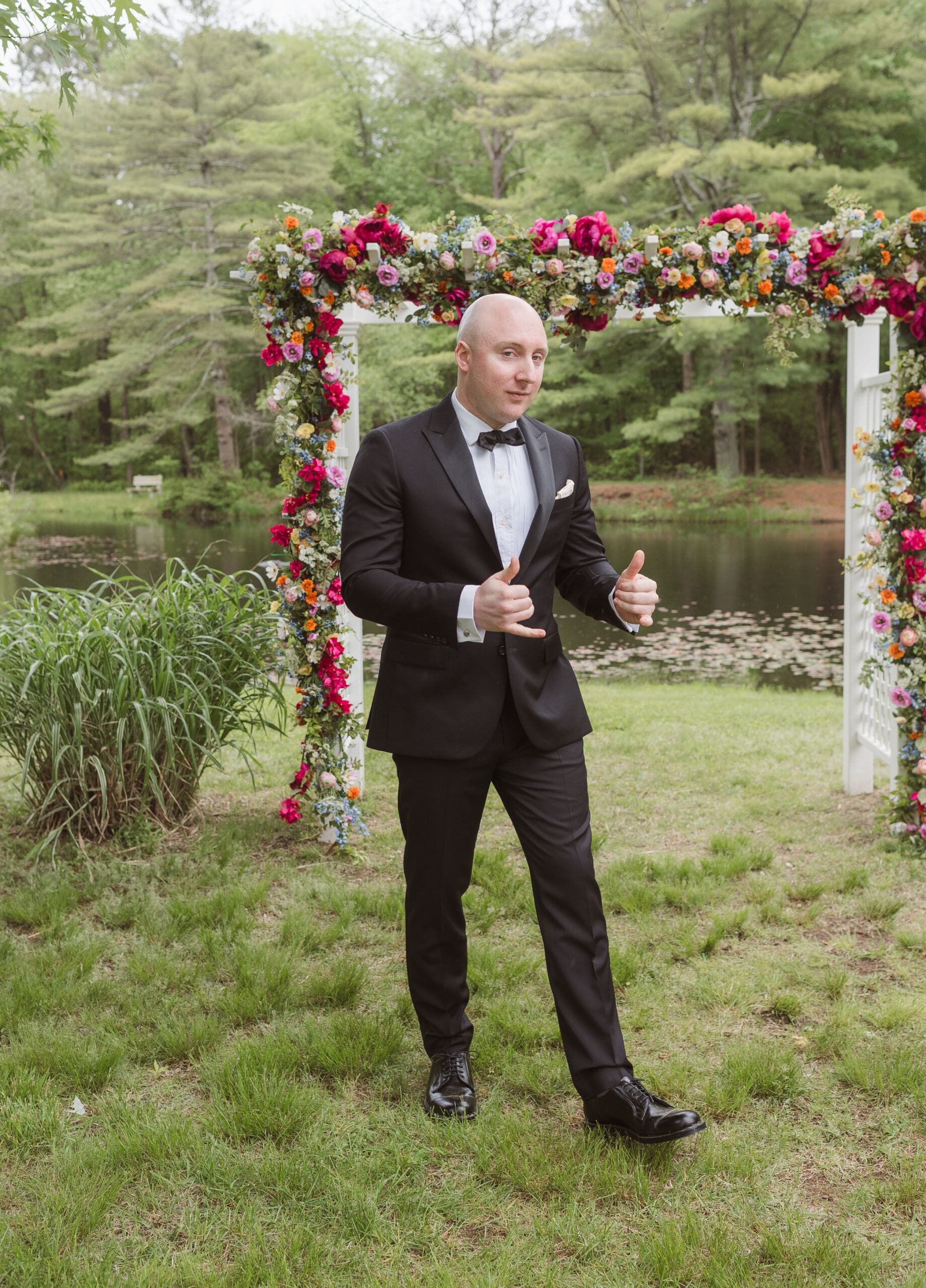 We began with a first look, followed by portraits of just the bride and groom wearing their wedding bands. We then took photos of the wedding party (bridesmaids and groomsmen) and family. We had about 45 minutes to spare to prepare and chill out before the ceremony and the guests’ arrival. It rained during their ceremony, but we continued despite the drizzle not dampening our mood. Afterward, we celebrated with food, dancing, and an open bar under the glow of Pat’s 30 Acre’s Edison bulbs all night long.