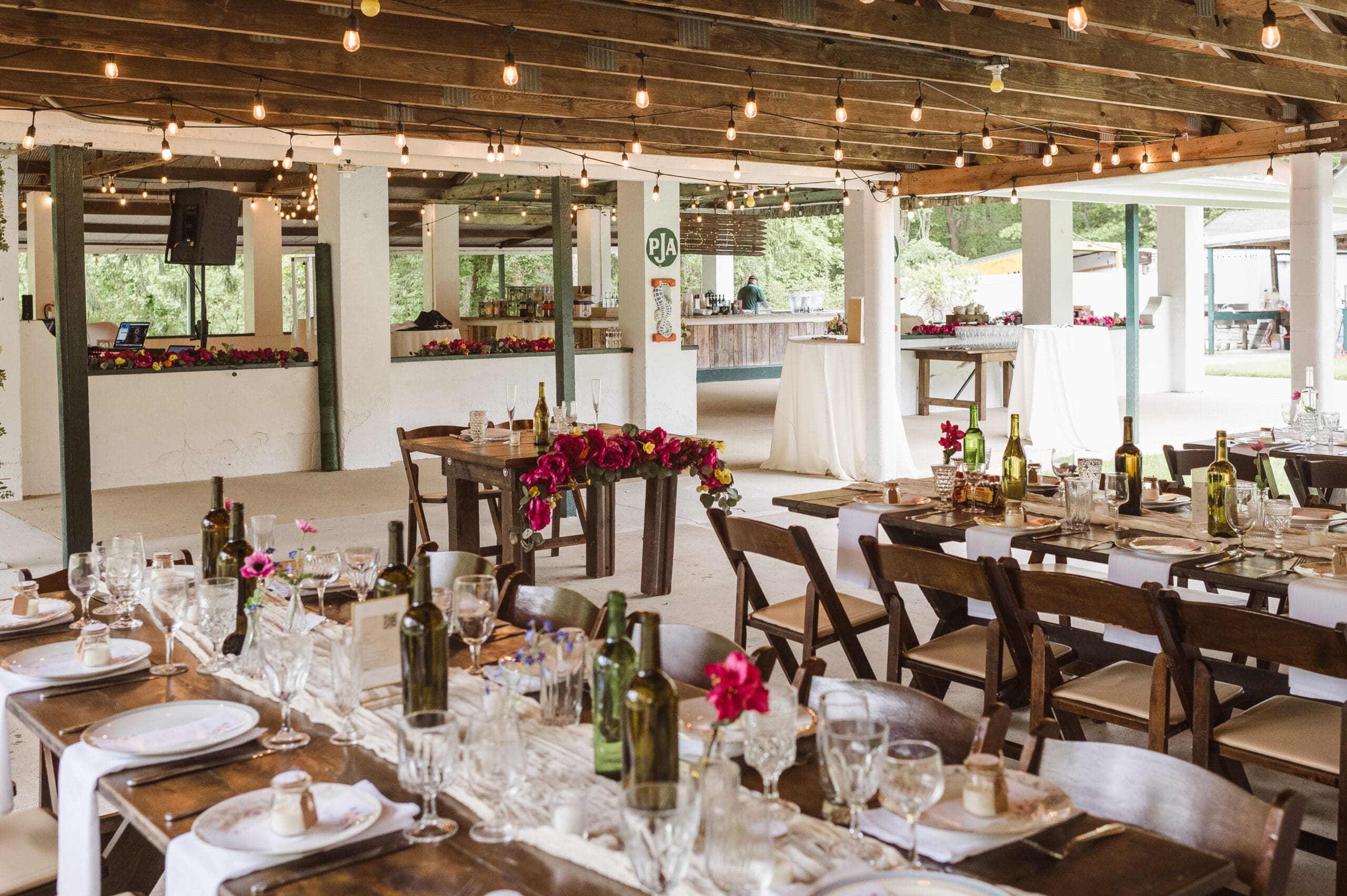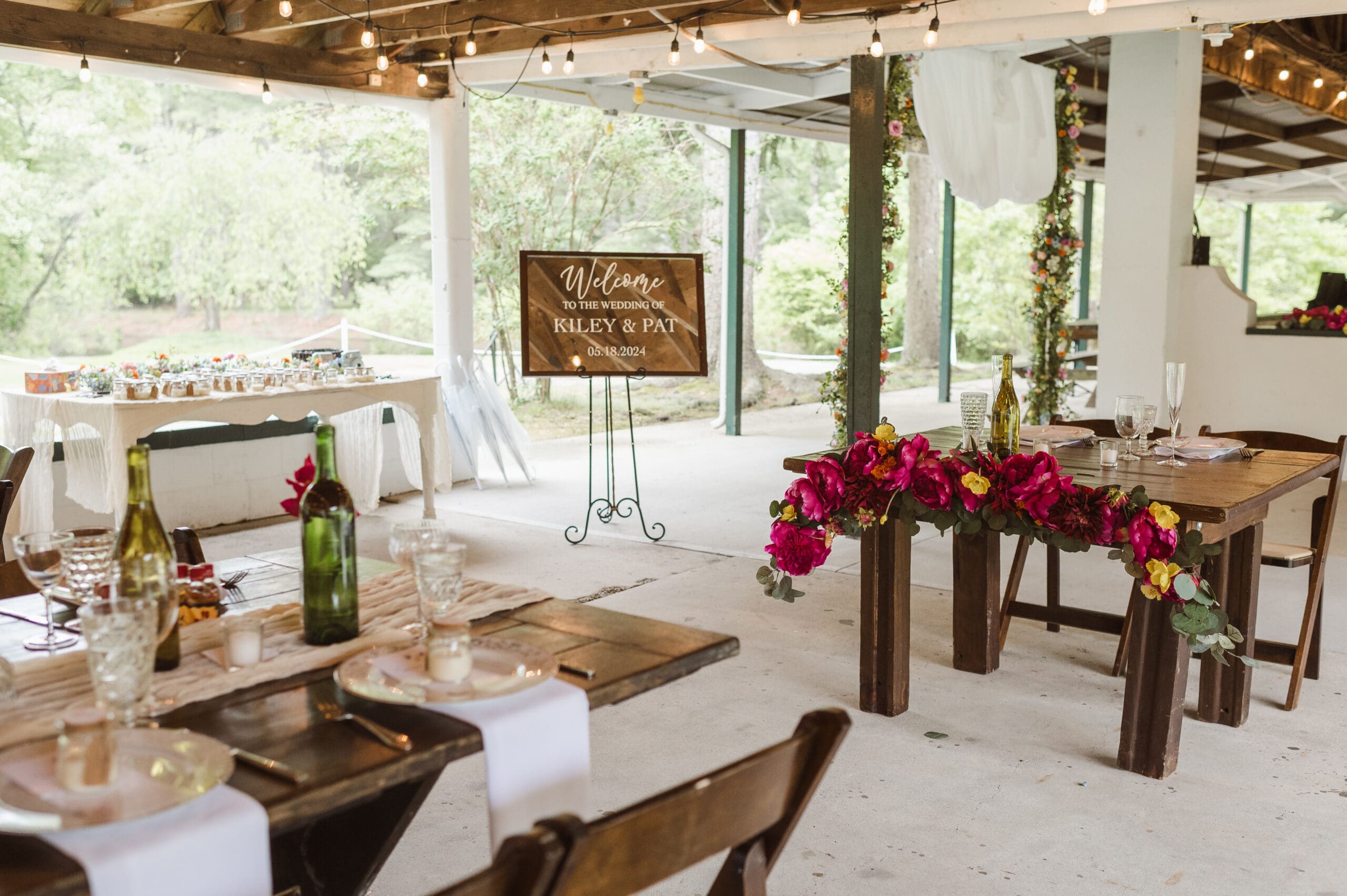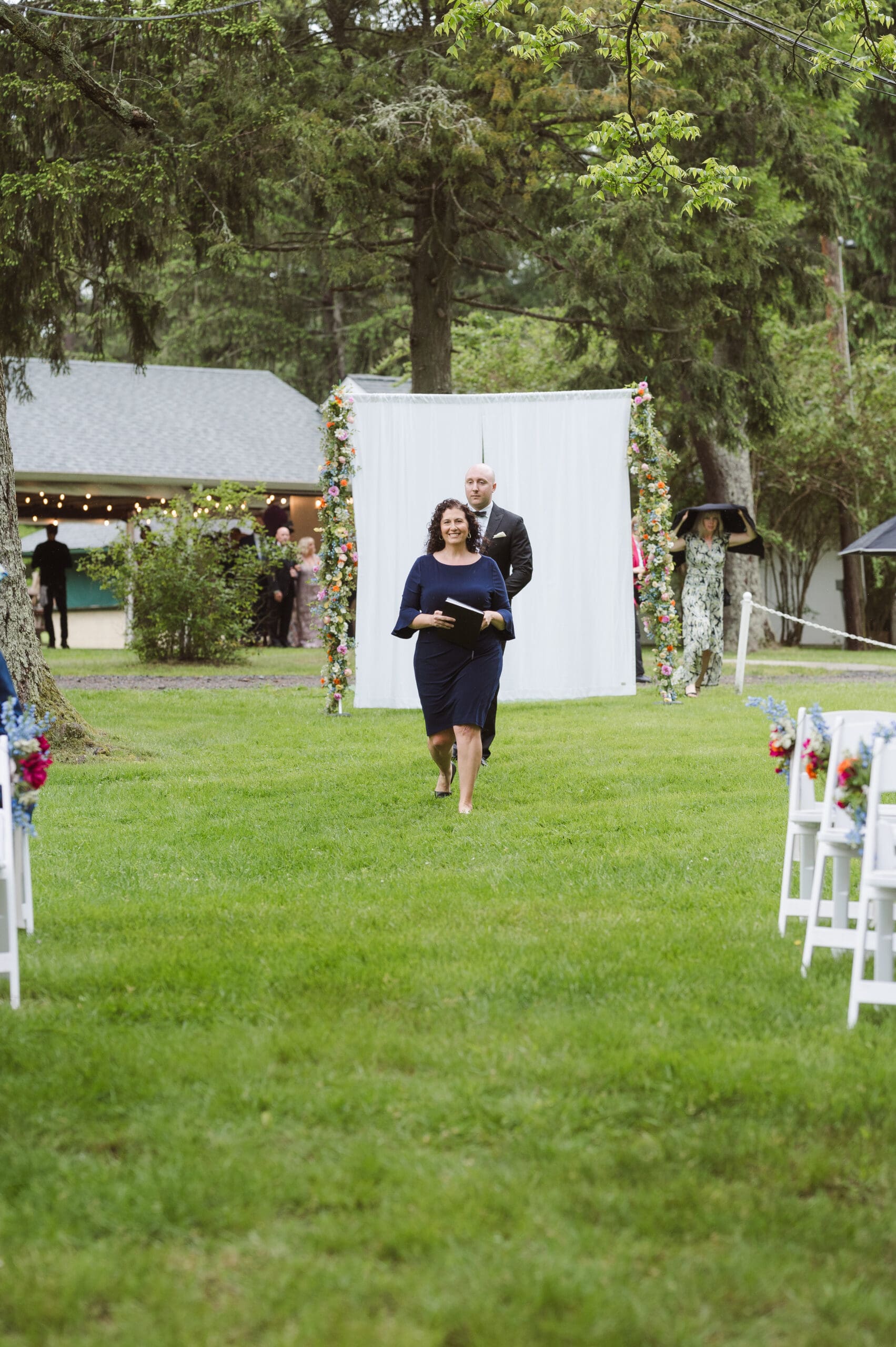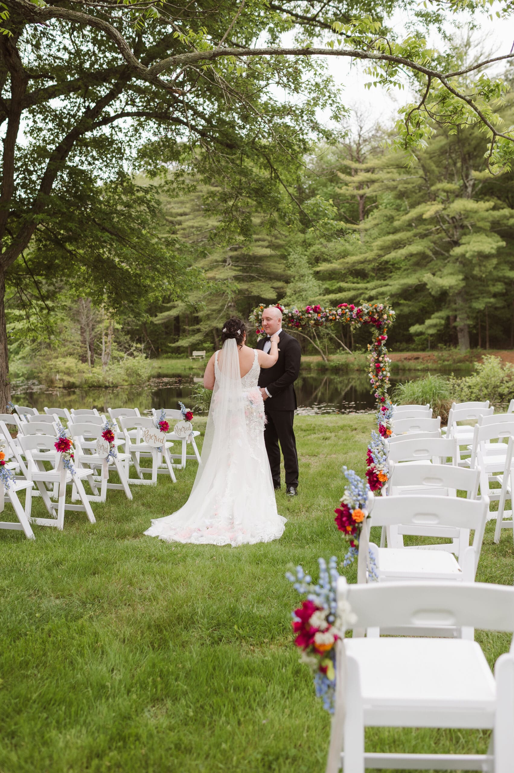 We began with a first look, followed by portraits of just the bride and groom wearing their wedding bands. We then took photos of the wedding party (bridesmaids and groomsmen) and family. We had about 45 minutes to spare to prepare and chill out before the ceremony and the guests’ arrival. It rained during their ceremony, but we continued despite the drizzle not dampening our mood. Afterward, we celebrated with food, dancing, and an open bar under the glow of Pat’s 30 Acre’s Edison bulbs all night long.