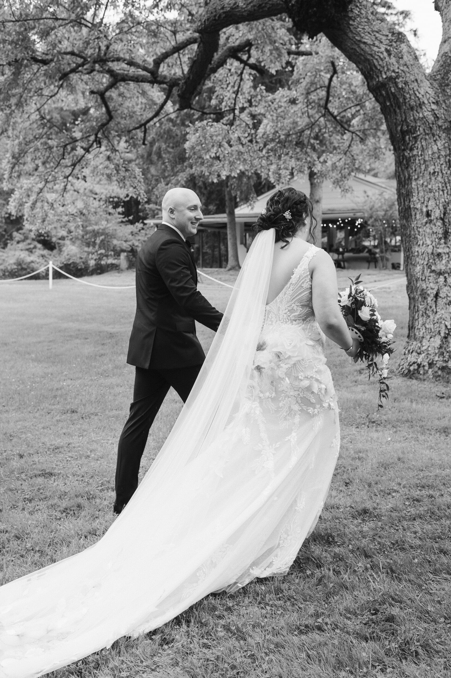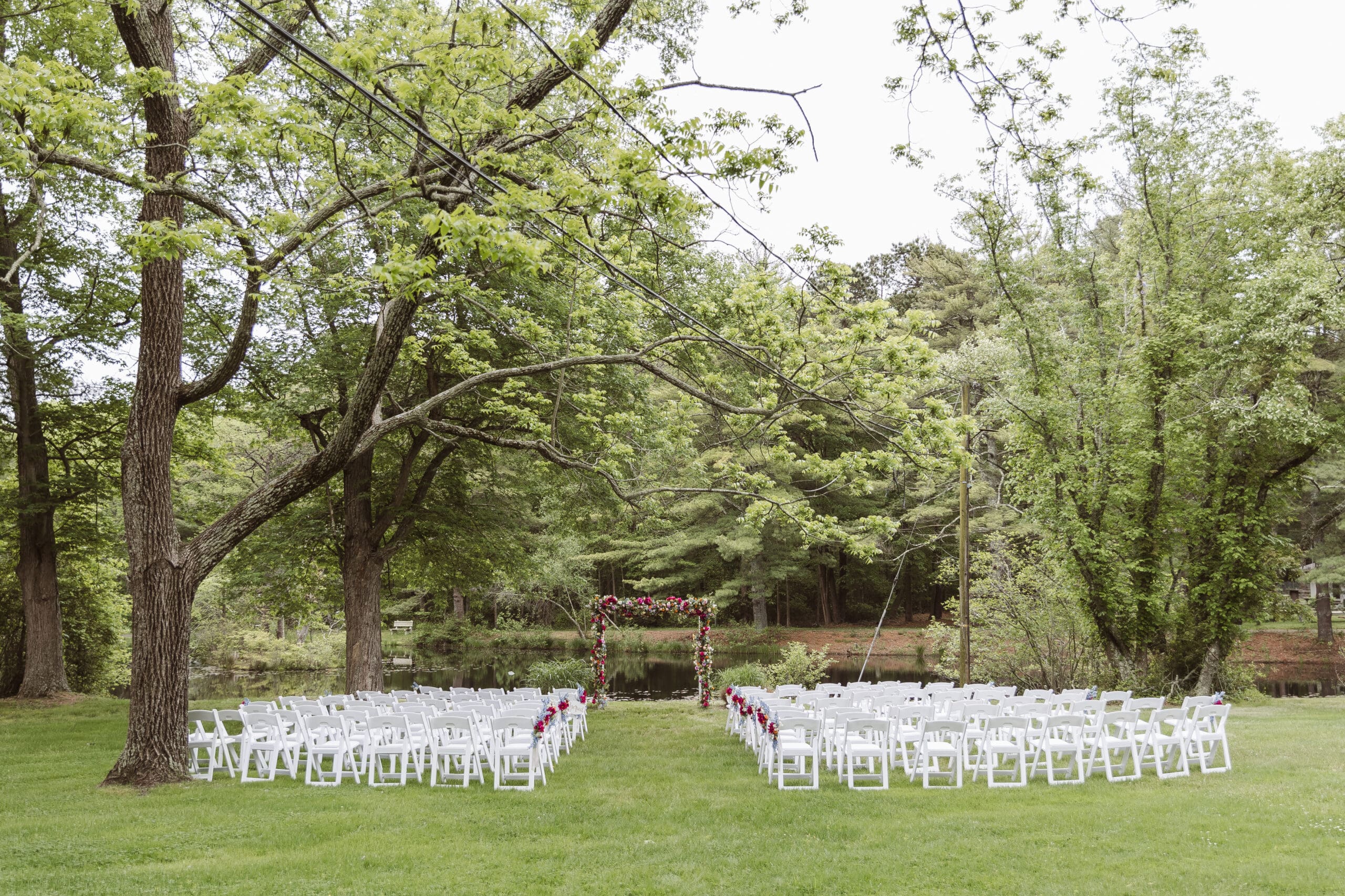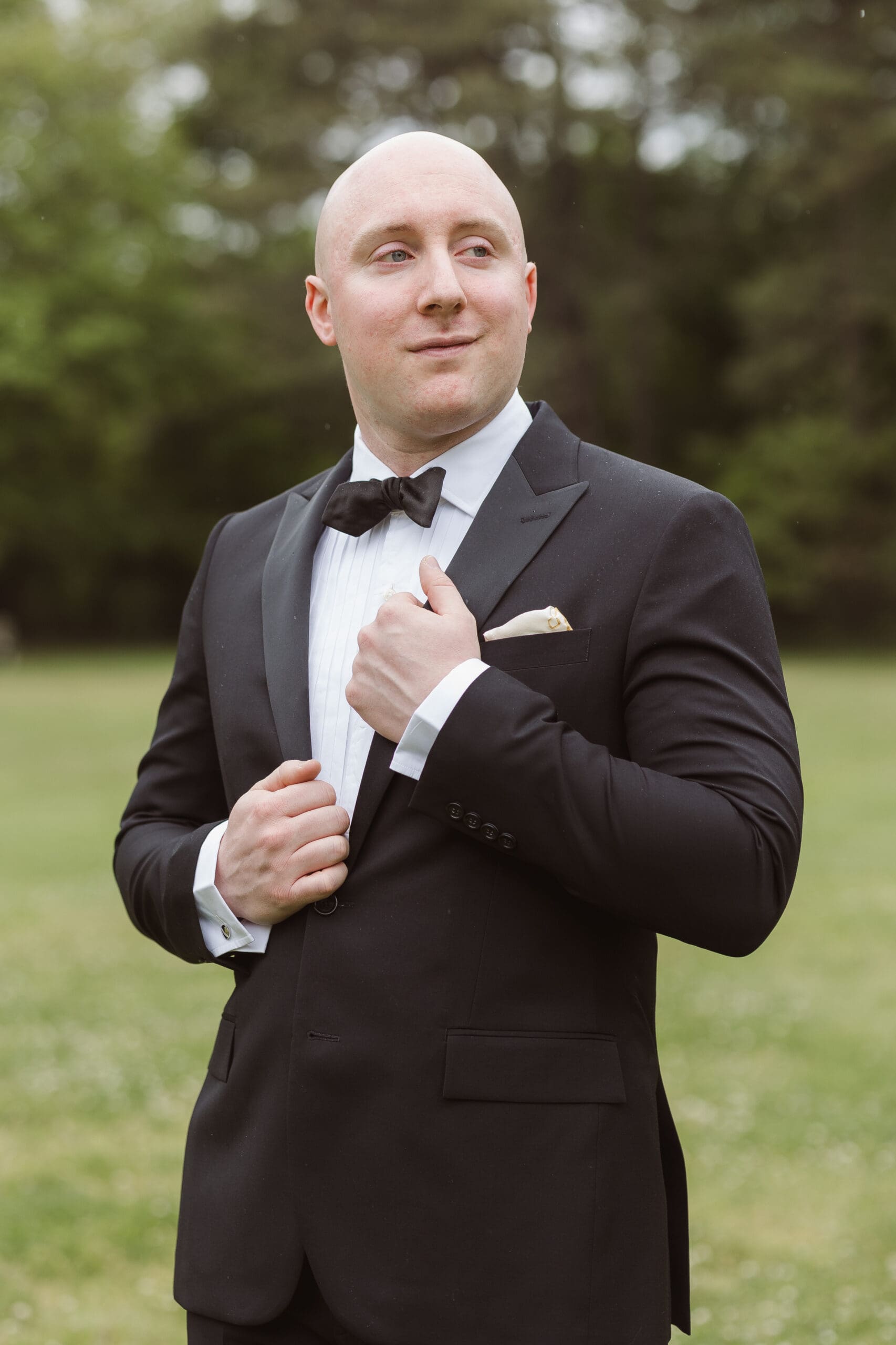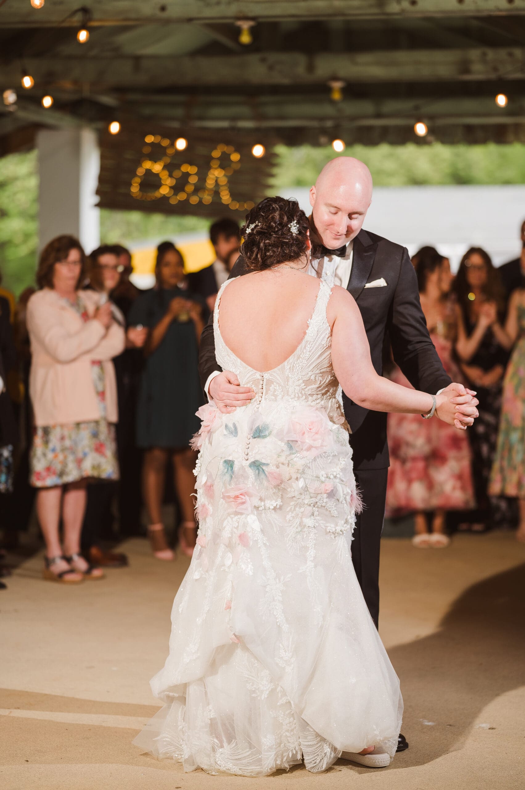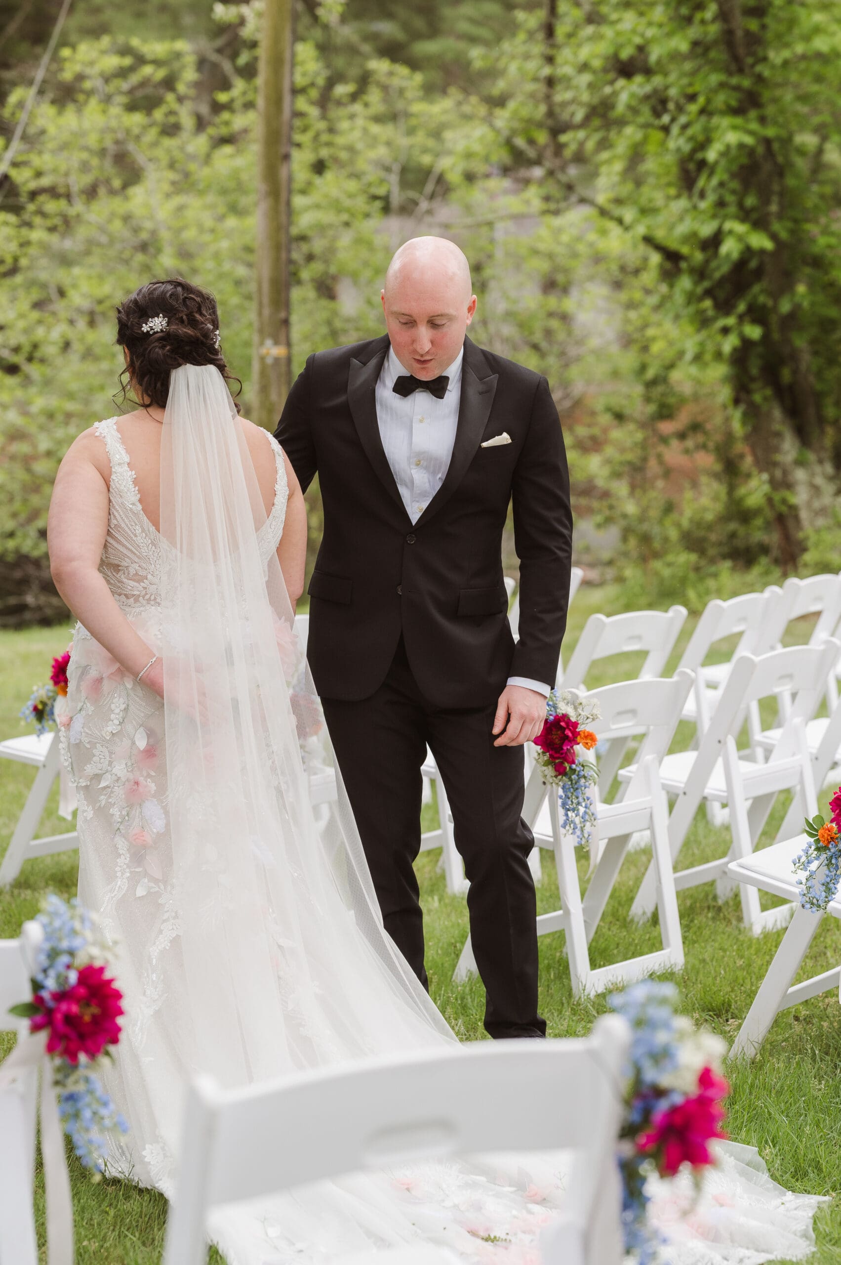 We began with a first look, followed by portraits of just the bride and groom wearing their wedding bands. We then took photos of the wedding party (bridesmaids and groomsmen) and family. We had about 45 minutes to spare to prepare and chill out before the ceremony and the guests’ arrival. It rained during their ceremony, but we continued despite the drizzle not dampening our mood. Afterward, we celebrated with food, dancing, and an open bar under the glow of Pat’s 30 Acre’s Edison bulbs all night long.