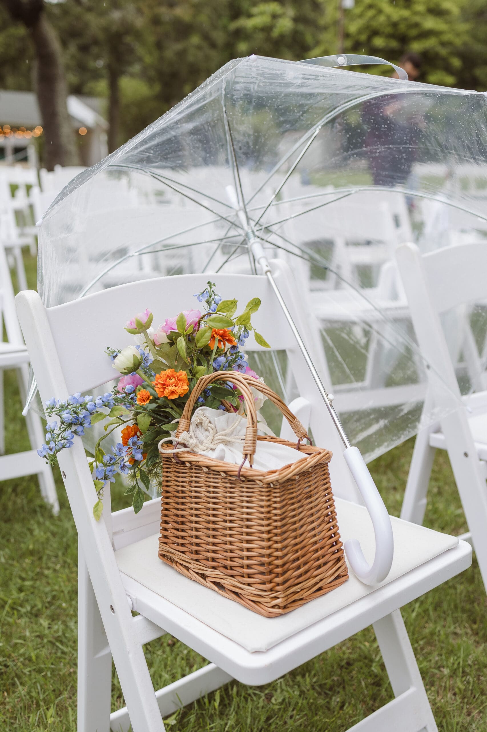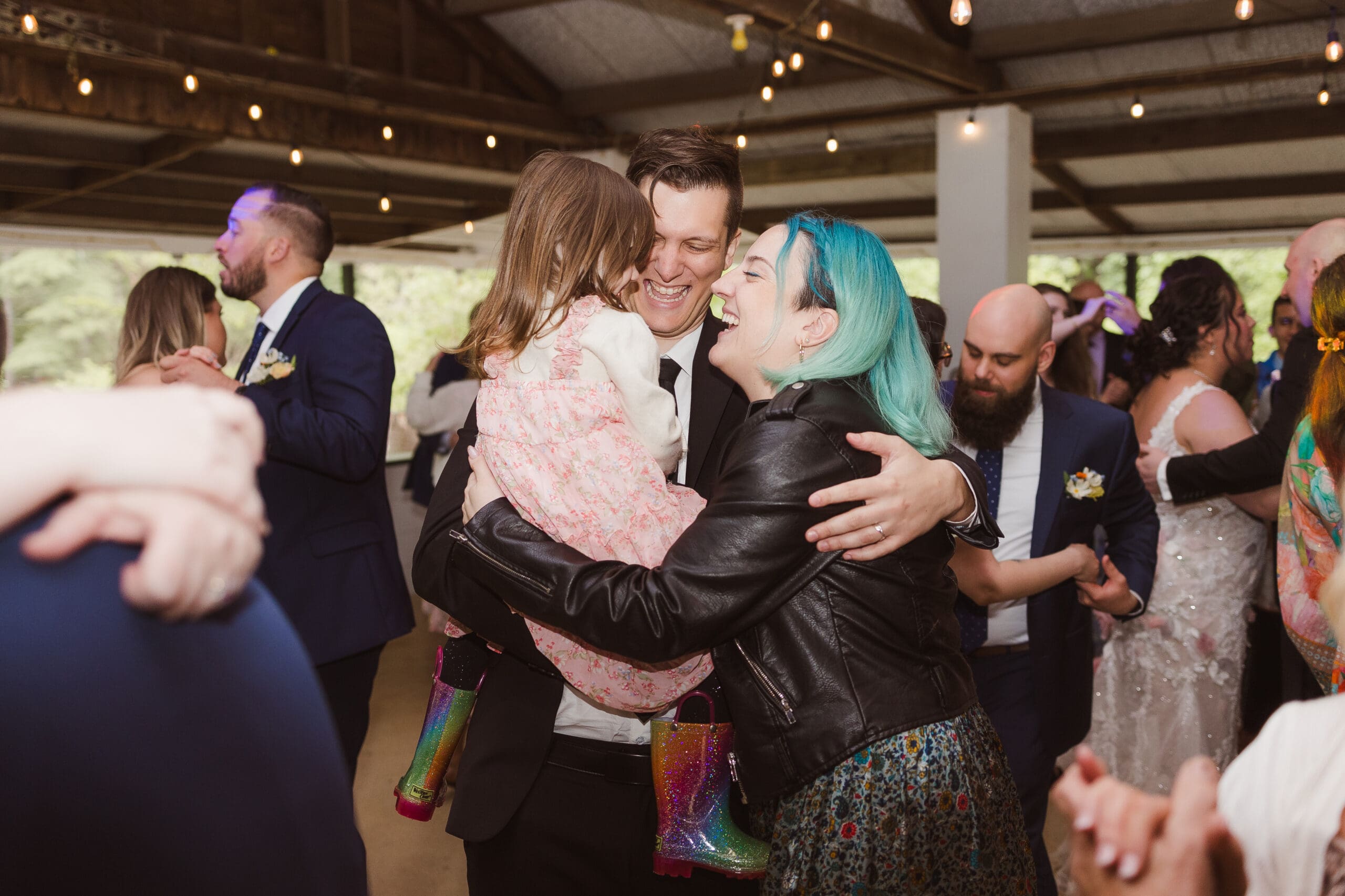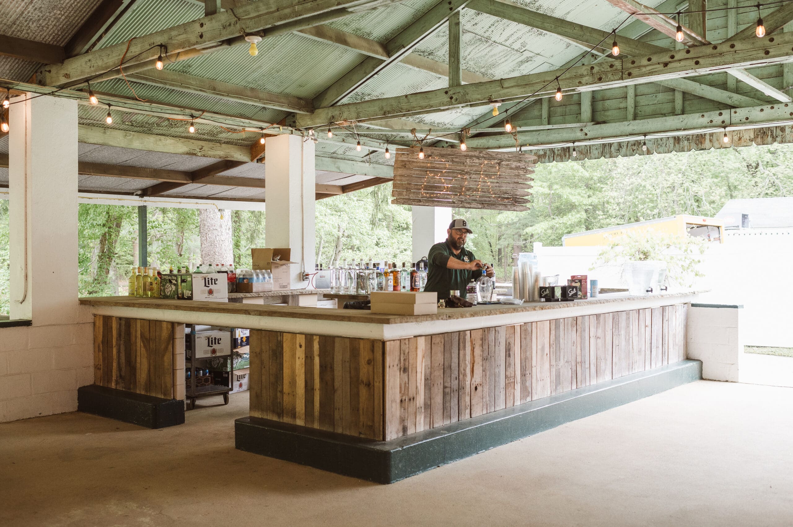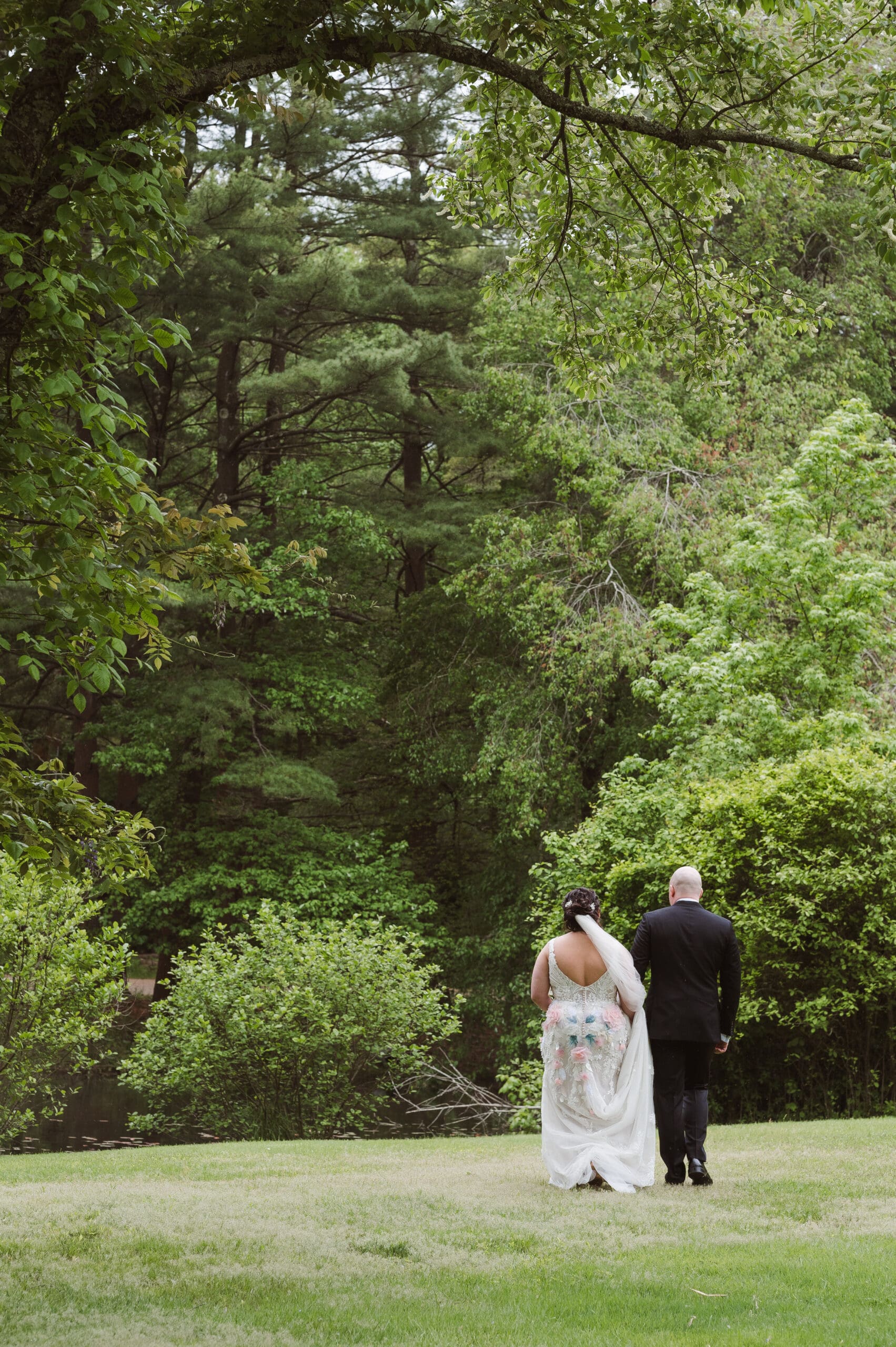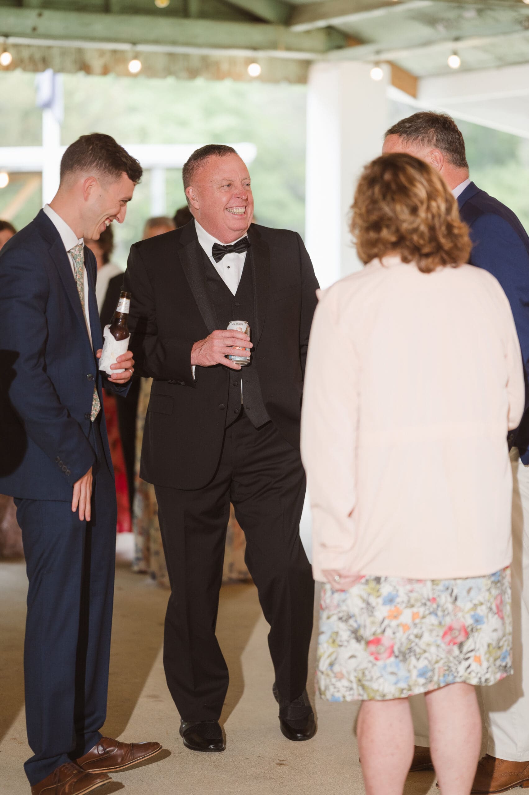 We began with a first look, followed by portraits of just the bride and groom wearing their wedding bands. We then took photos of the wedding party (bridesmaids and groomsmen) and family. We had about 45 minutes to spare to prepare and chill out before the ceremony and the guests’ arrival. It rained during their ceremony, but we continued despite the drizzle not dampening our mood. Afterward, we celebrated with food, dancing, and an open bar under the glow of Pat’s 30 Acre’s Edison bulbs all night long.
