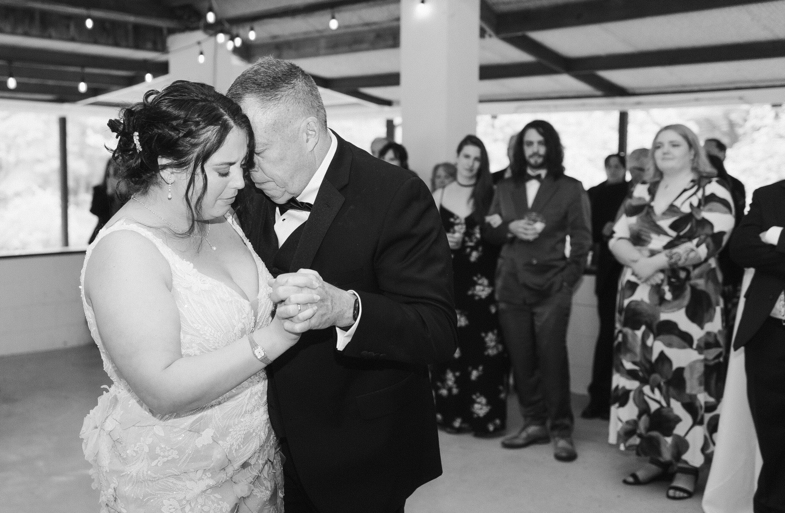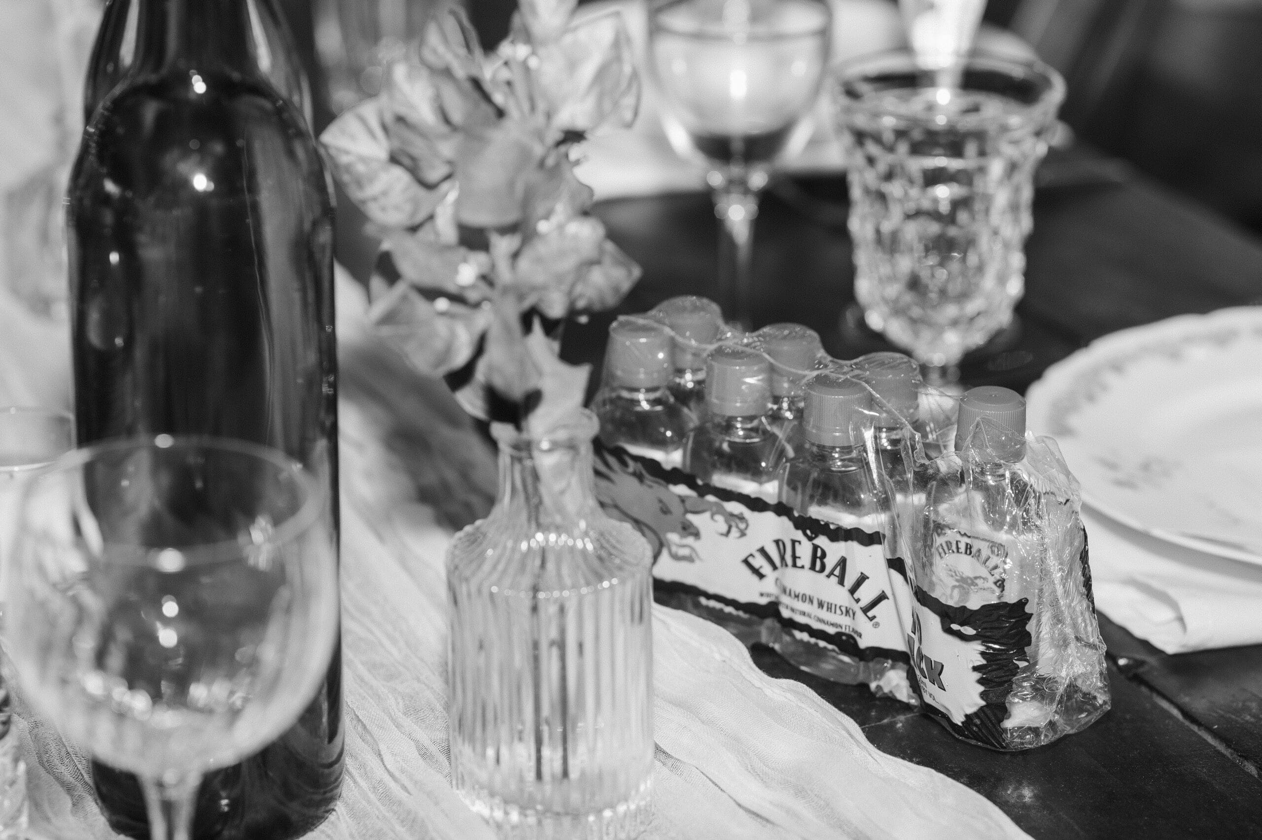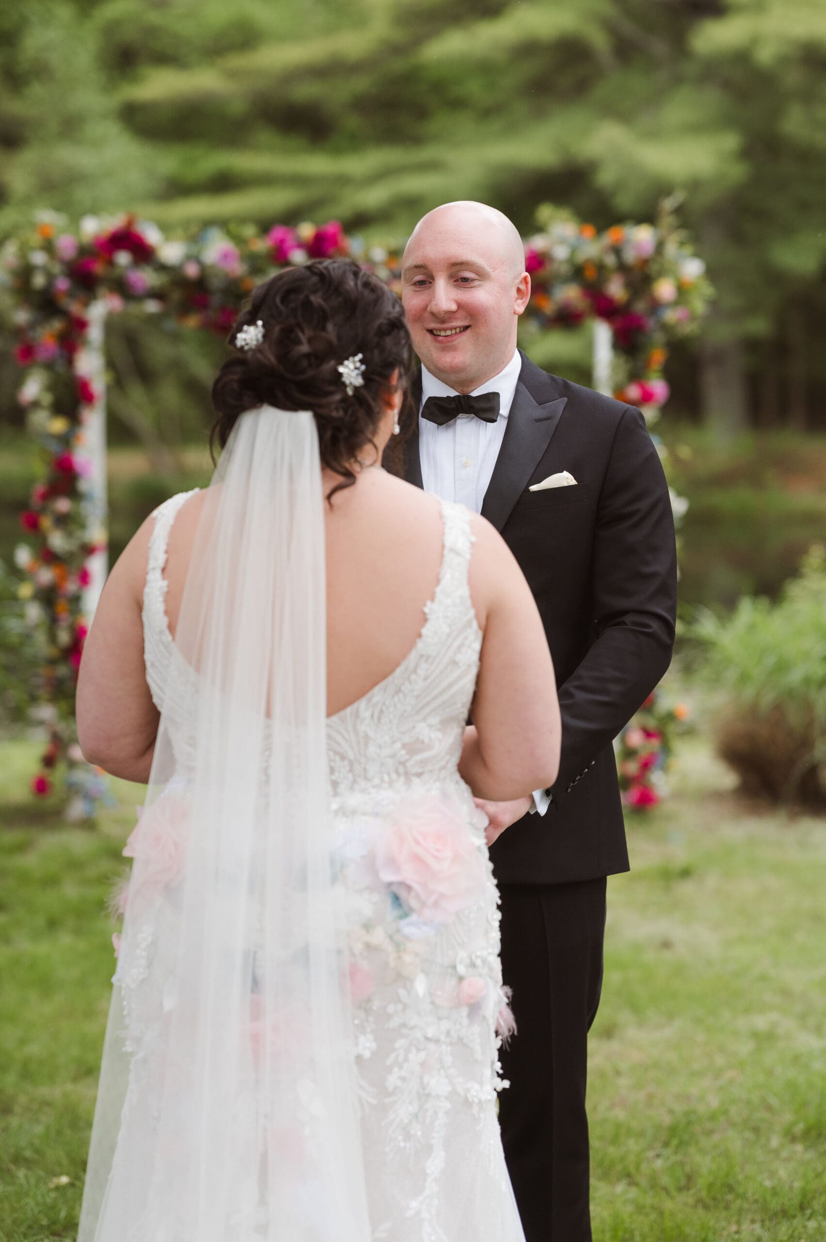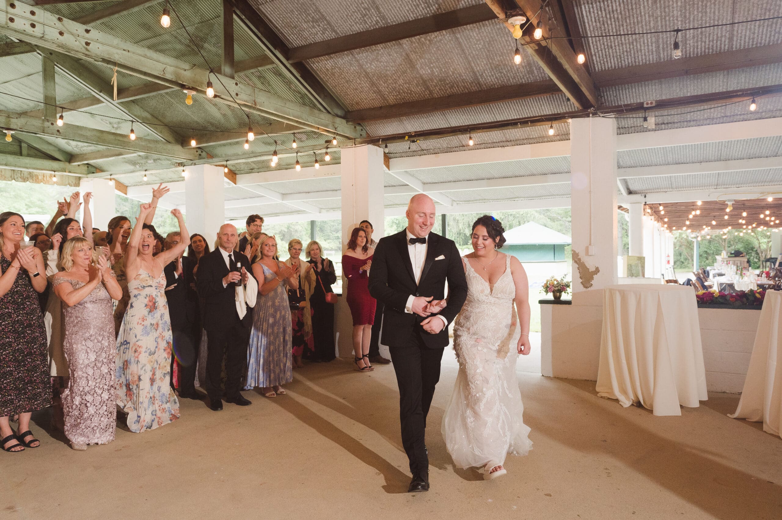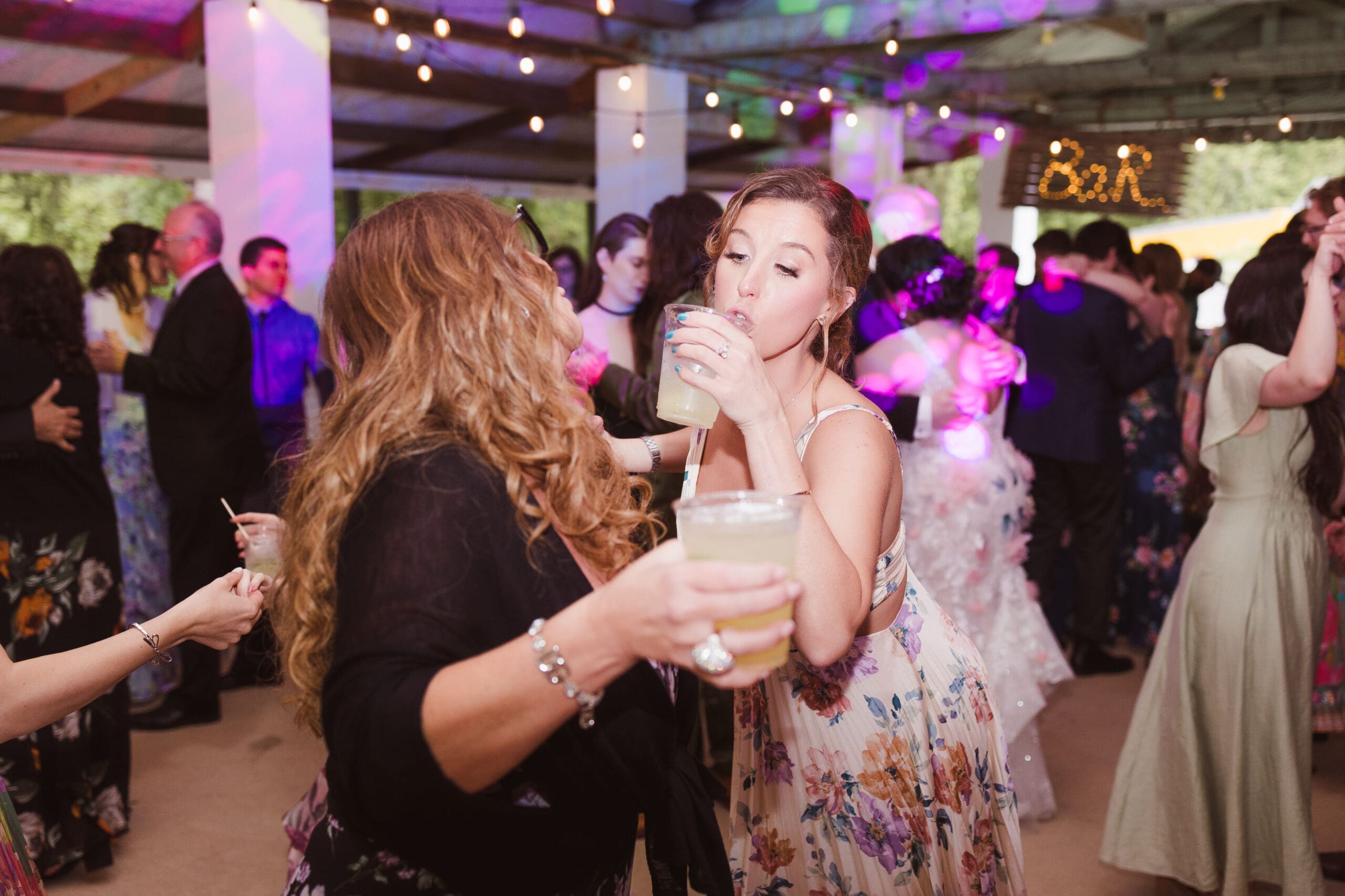We began with a first look, followed by portraits of just the bride and groom wearing their wedding bands. We then took photos of the wedding party (bridesmaids and groomsmen) and family. We had about 45 minutes to spare to prepare and chill out before the ceremony and the guests’ arrival. It rained during their ceremony, but we continued despite the drizzle not dampening our mood. Afterward, we celebrated with food, dancing, and an open bar under the glow of Pat’s 30 Acre’s Edison bulbs all night long.
