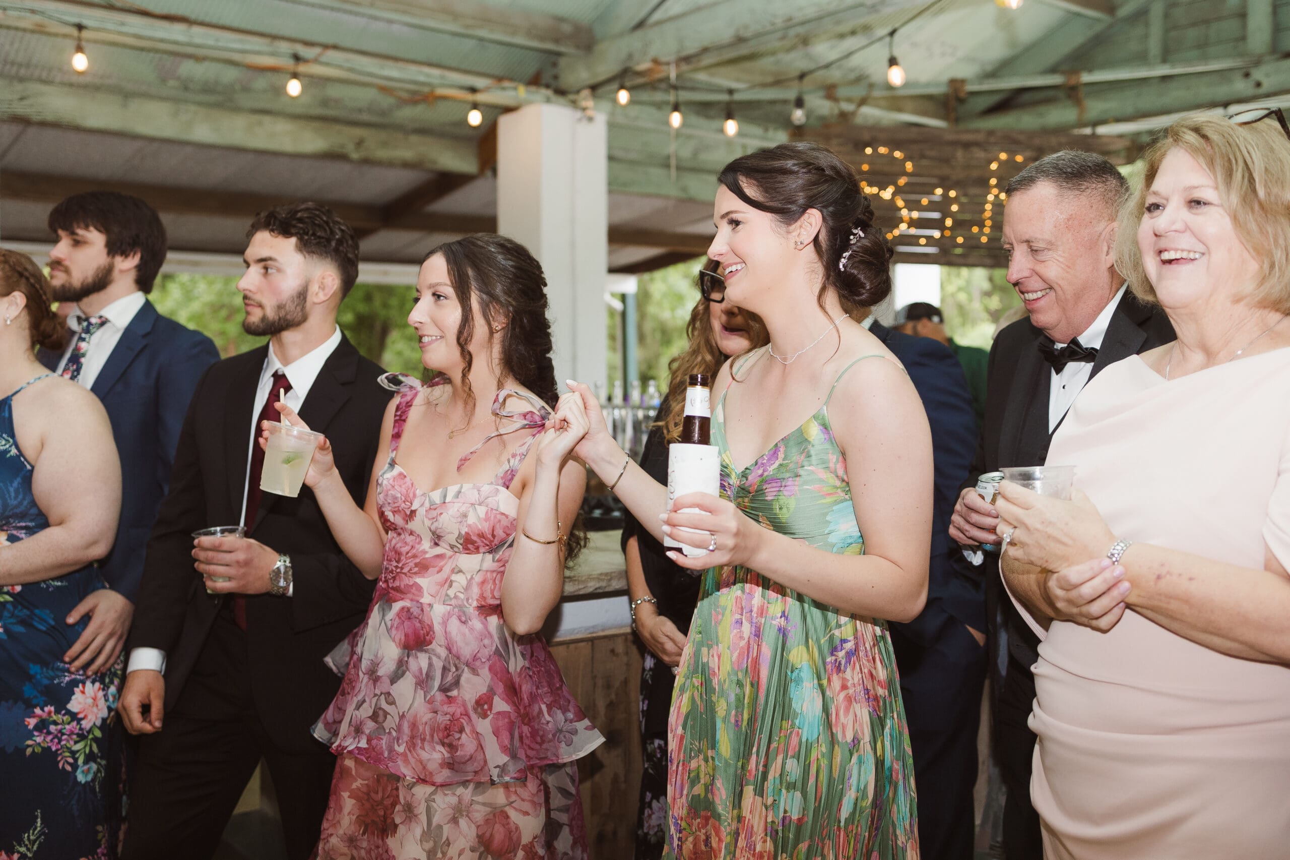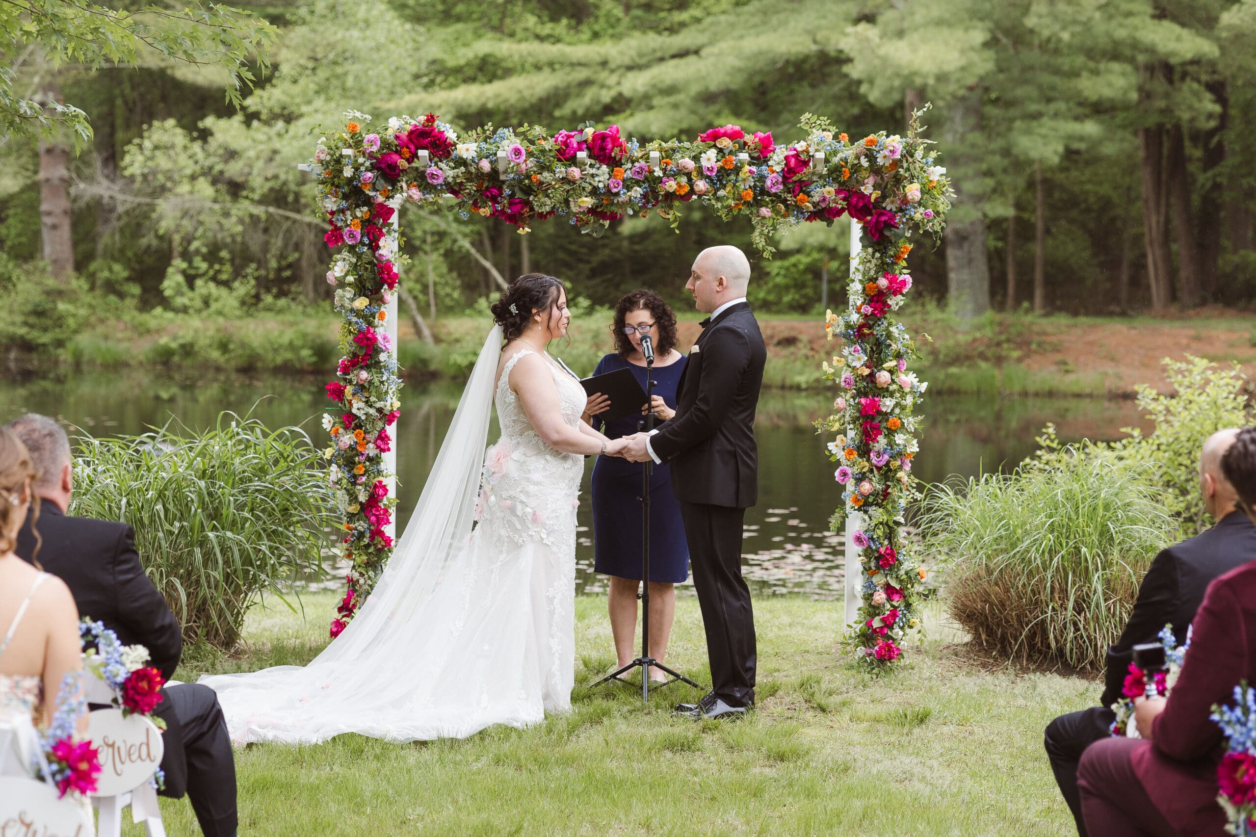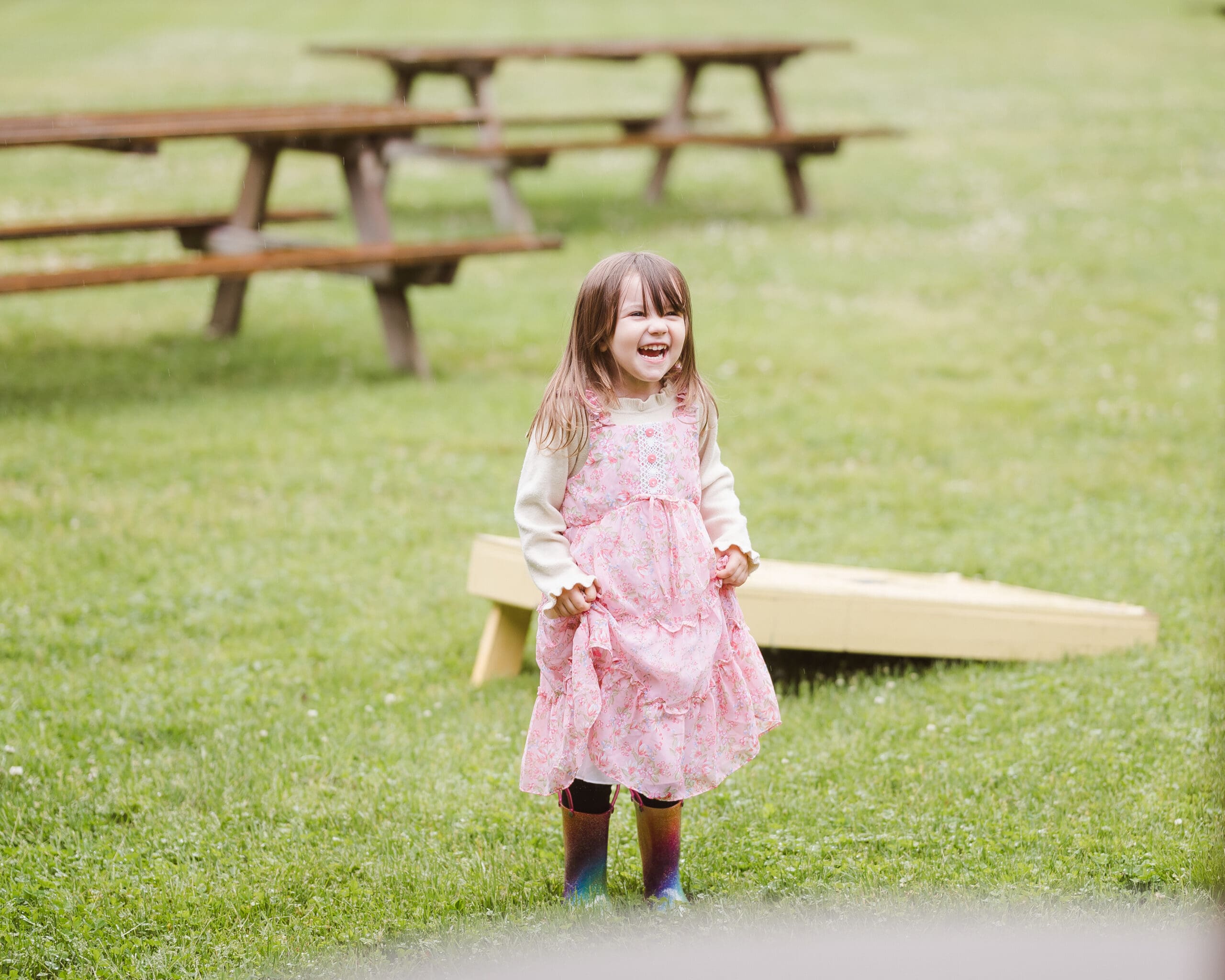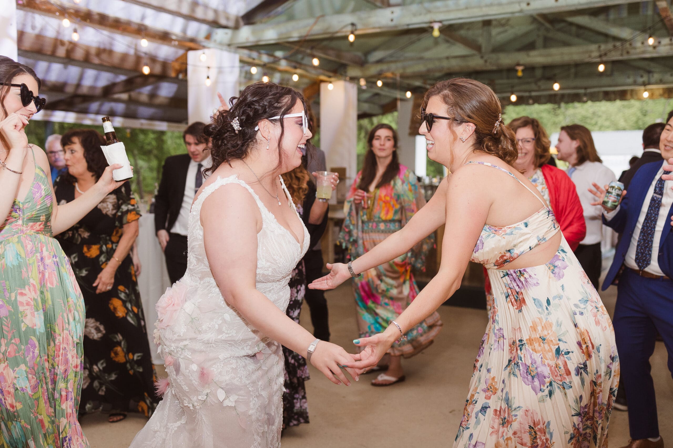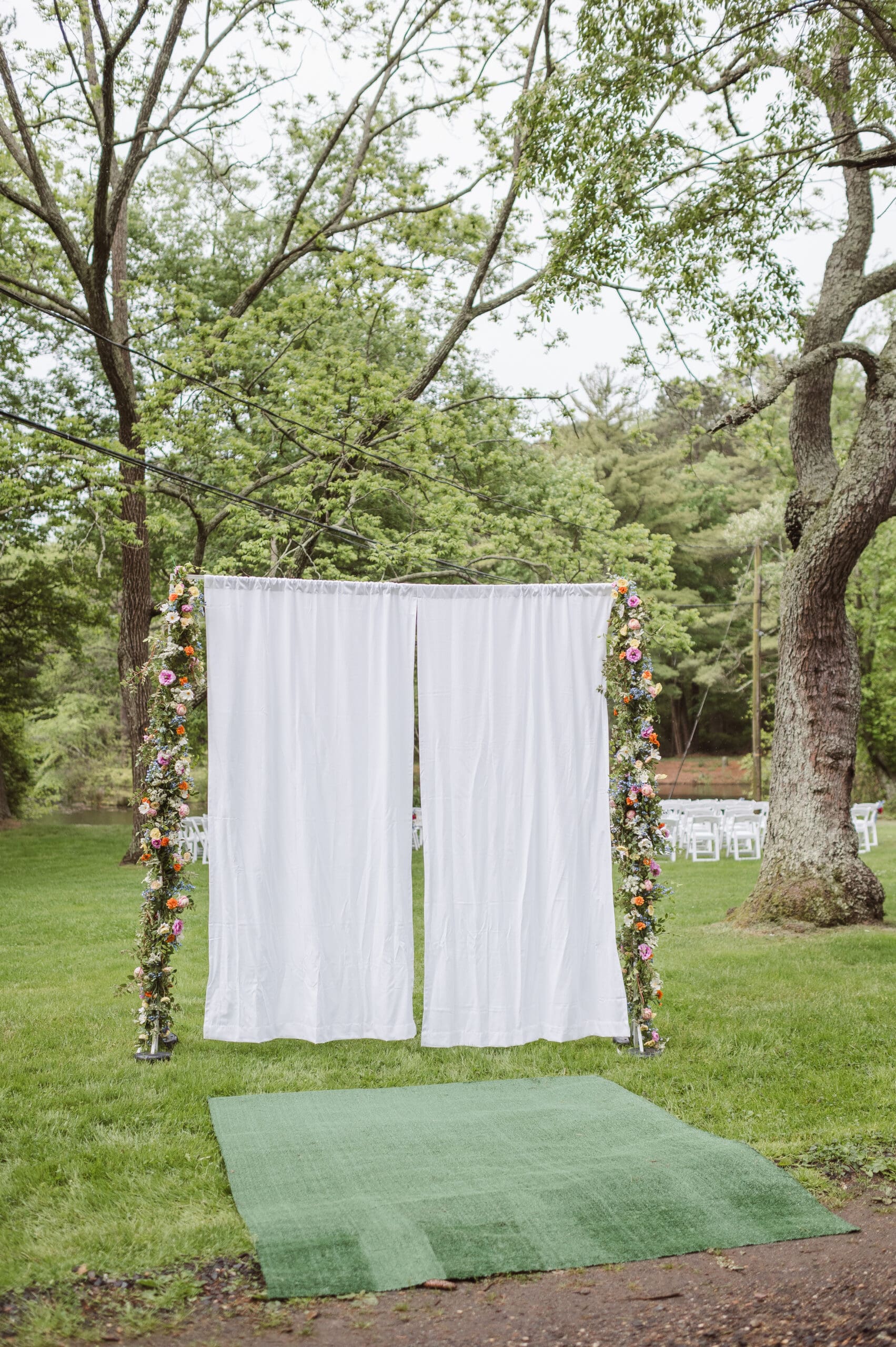 We began with a first look, followed by portraits of just the bride and groom wearing their wedding bands. We then took photos of the wedding party (bridesmaids and groomsmen) and family. We had about 45 minutes to spare to prepare and chill out before the ceremony and the guests’ arrival. It rained during their ceremony, but we continued despite the drizzle not dampening our mood. Afterward, we celebrated with food, dancing, and an open bar under the glow of Pat’s 30 Acre’s Edison bulbs all night long.