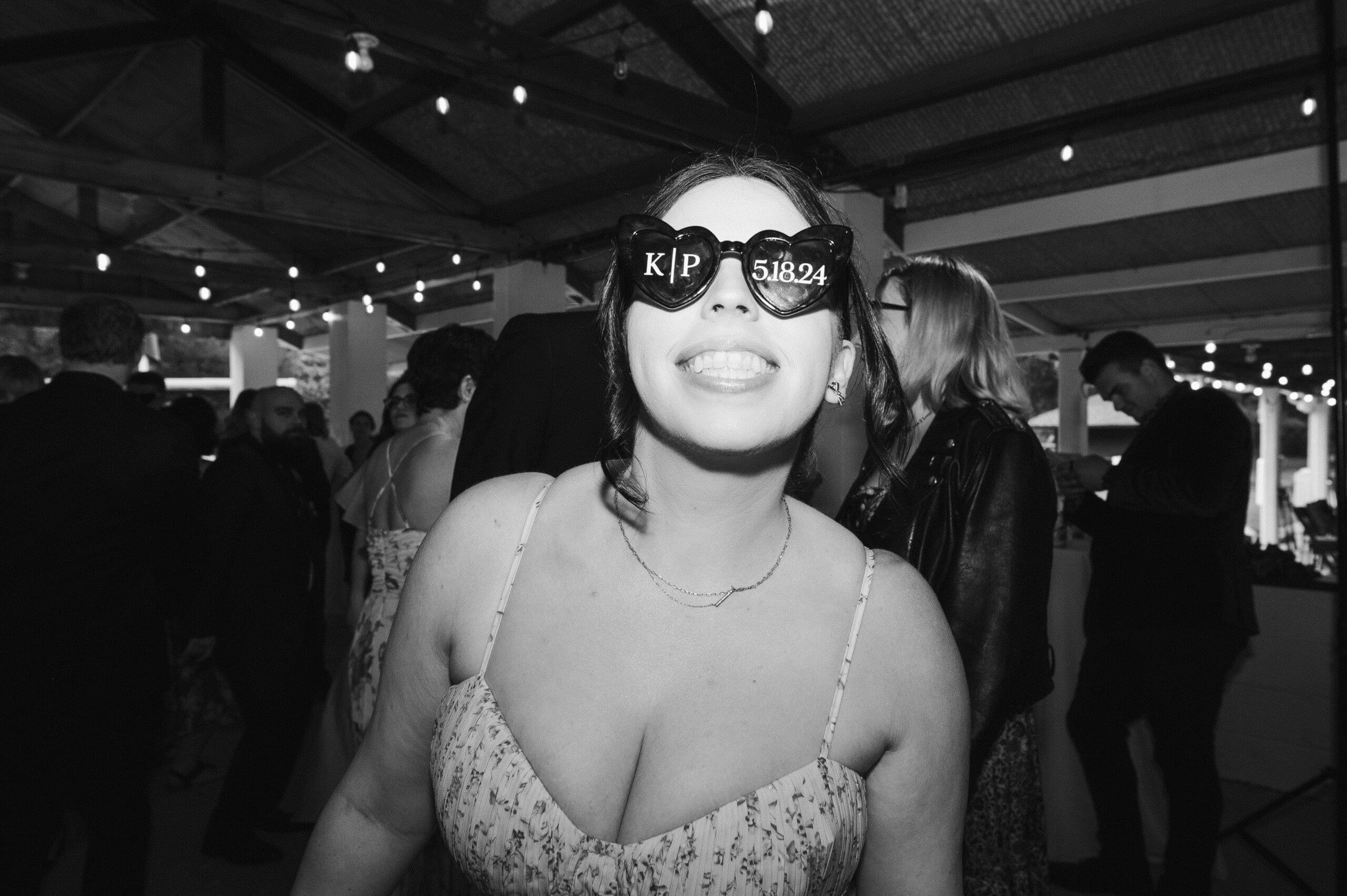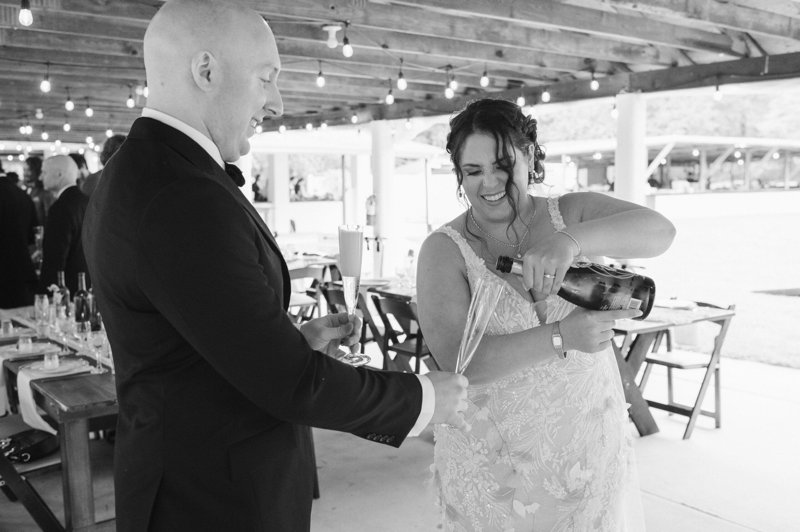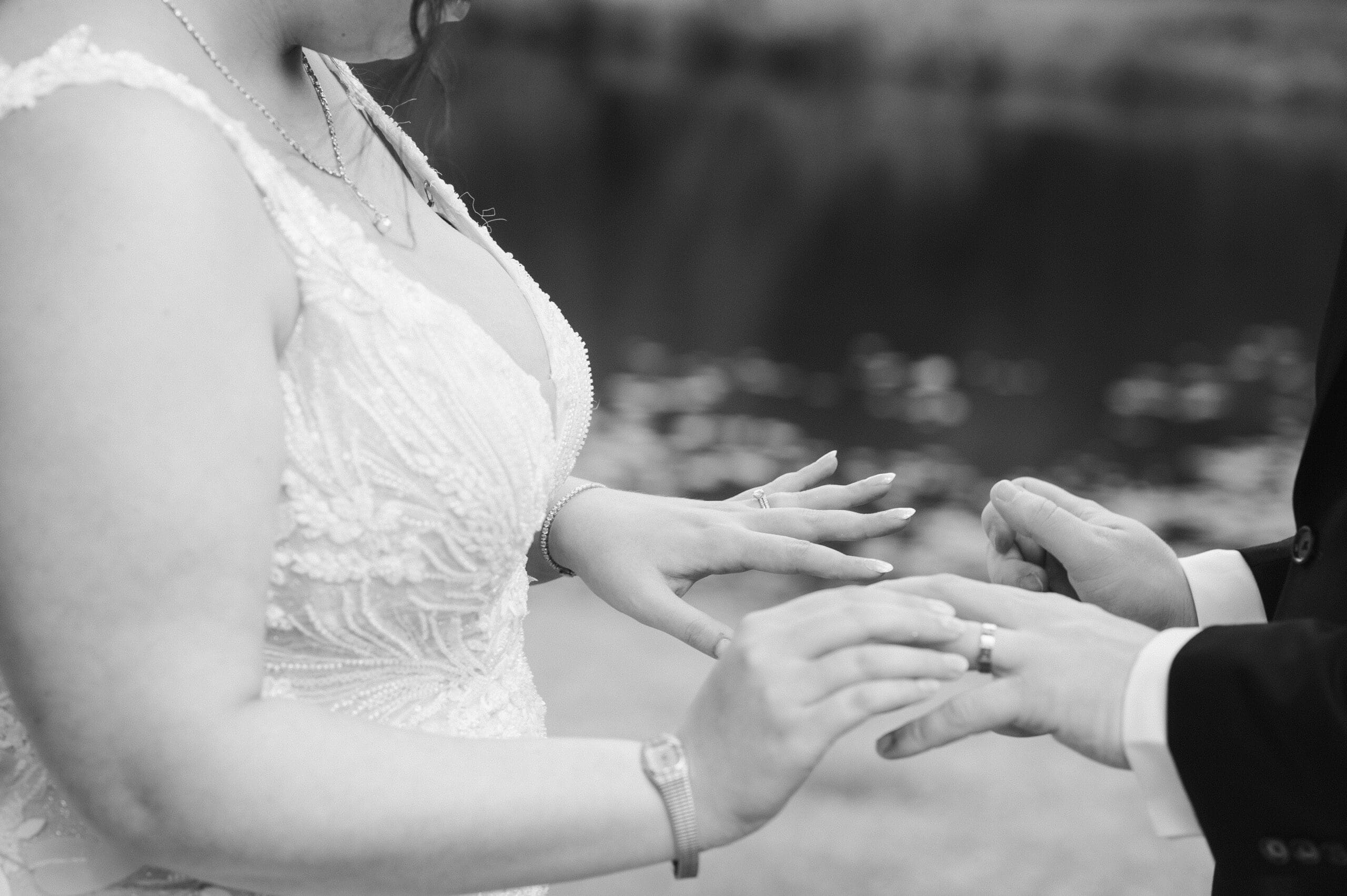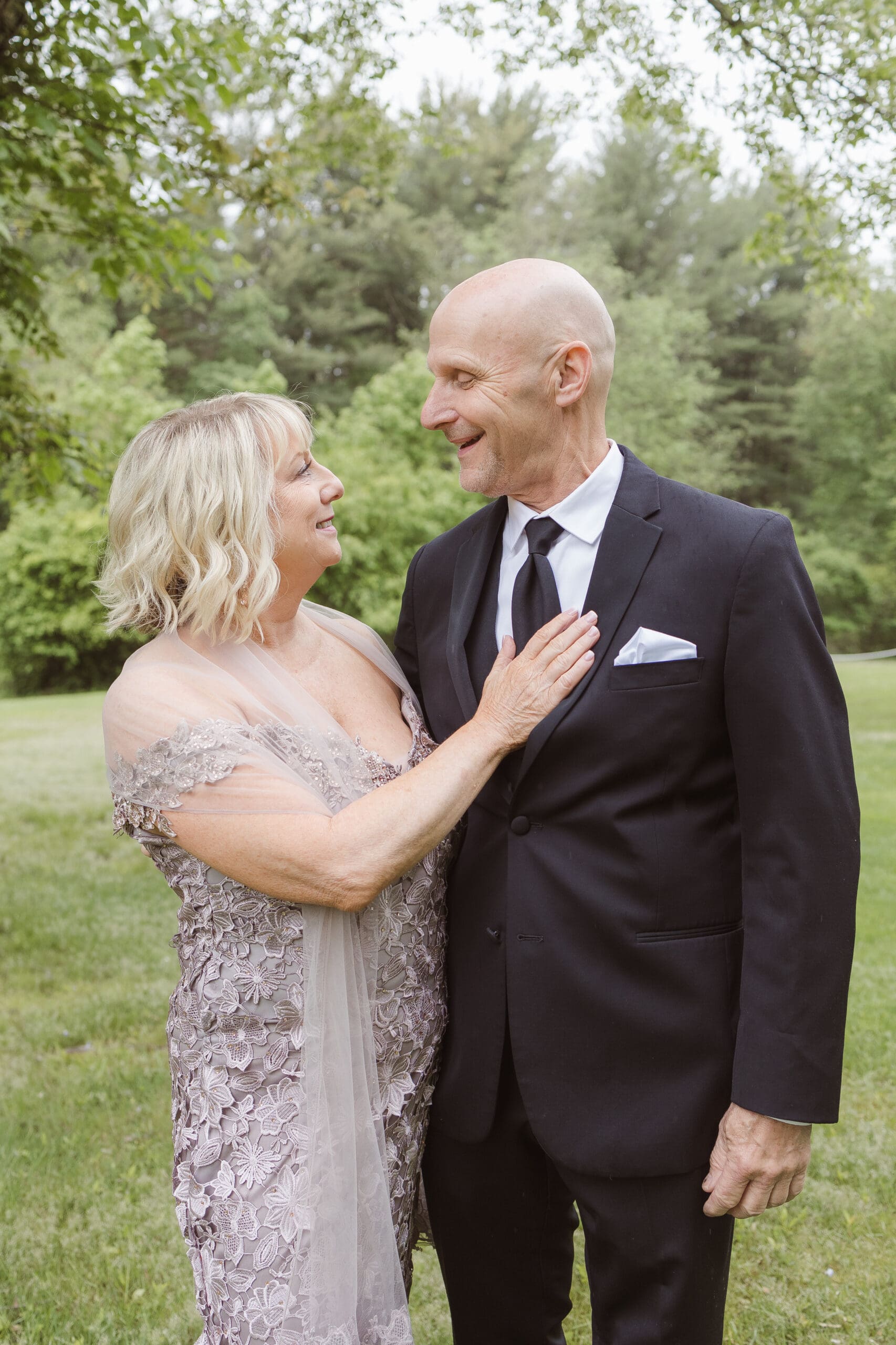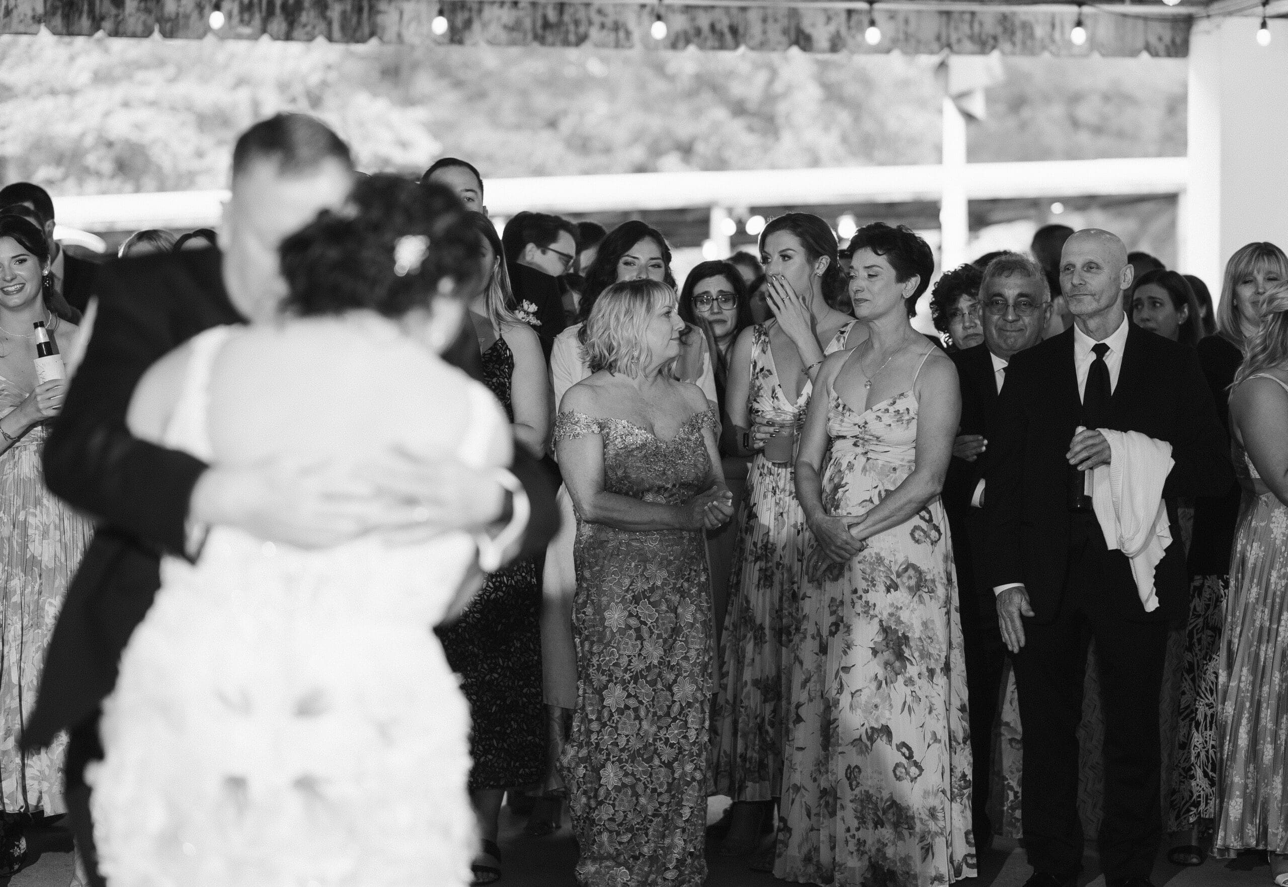 We began with a first look, followed by portraits of just the bride and groom wearing their wedding bands. We then took photos of the wedding party (bridesmaids and groomsmen) and family. We had about 45 minutes to spare to prepare and chill out before the ceremony and the guests’ arrival. It rained during their ceremony, but we continued despite the drizzle not dampening our mood. Afterward, we celebrated with food, dancing, and an open bar under the glow of Pat’s 30 Acre’s Edison bulbs all night long.