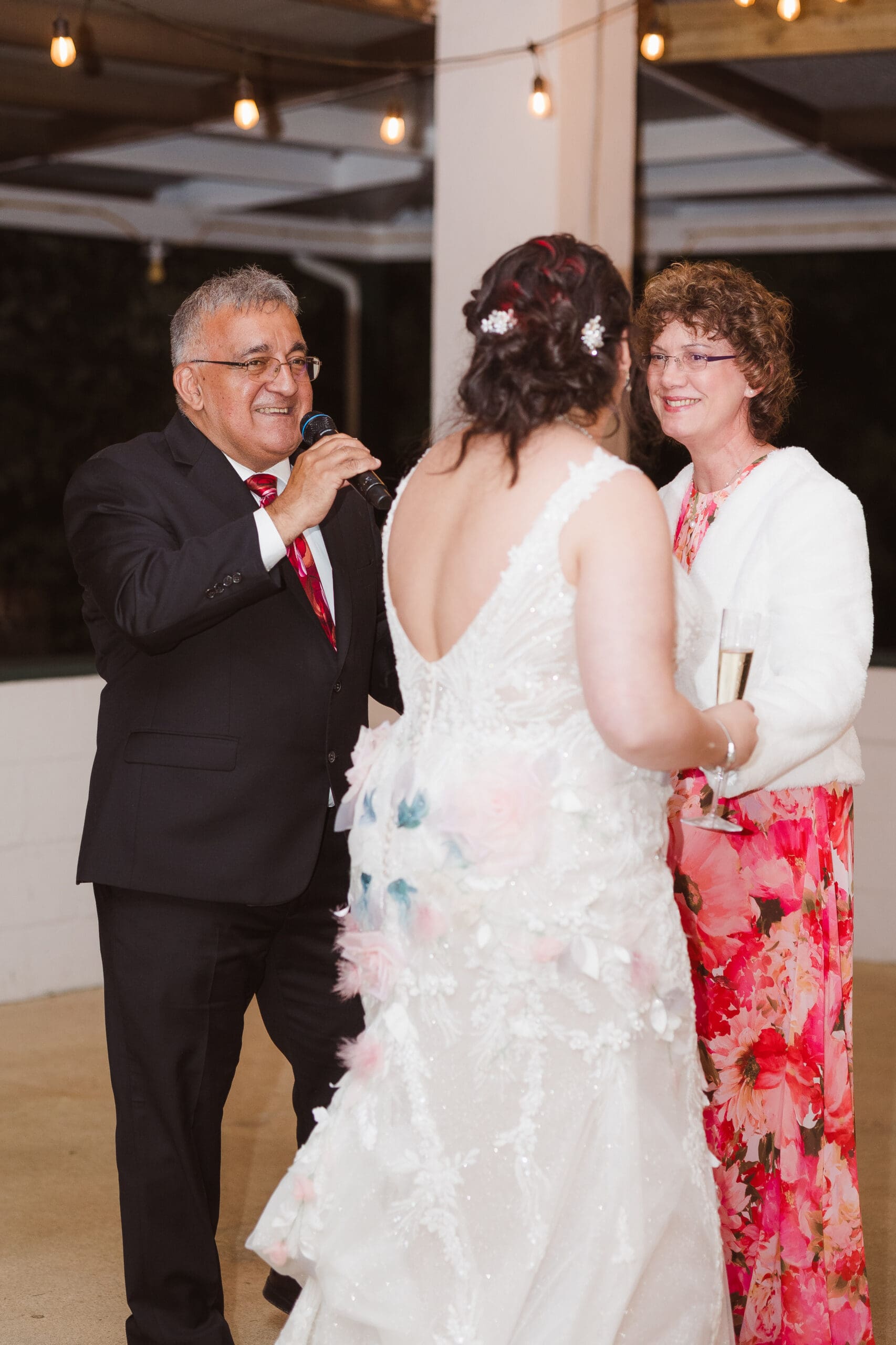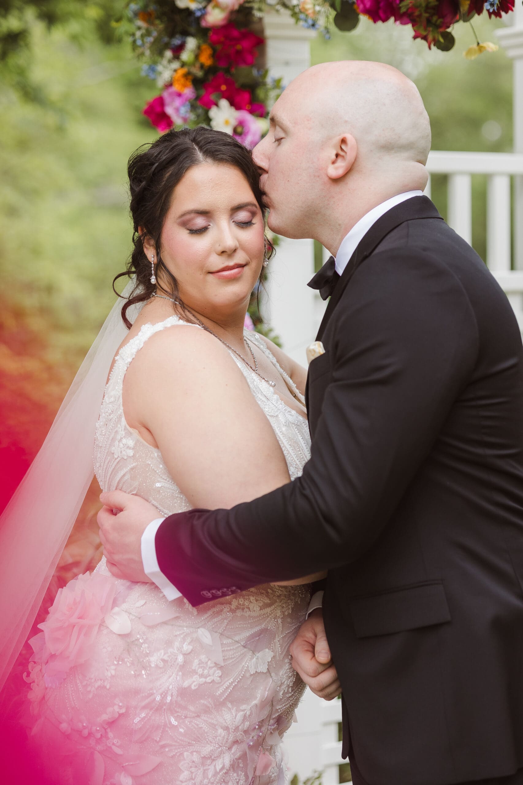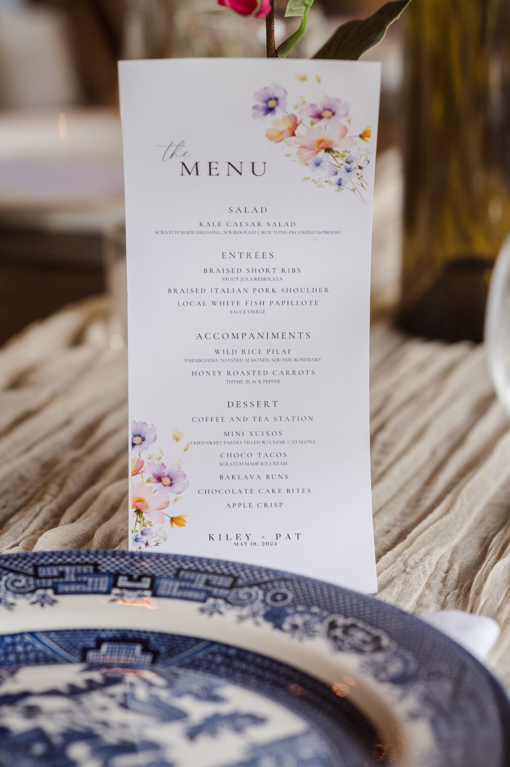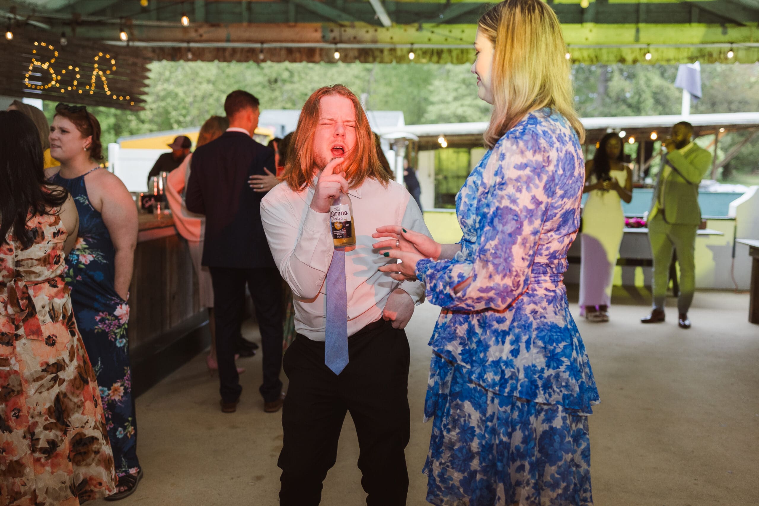 We began with a first look, followed by portraits of just the bride and groom wearing their wedding bands. We then took photos of the wedding party (bridesmaids and groomsmen) and family. We had about 45 minutes to spare to prepare and chill out before the ceremony and the guests’ arrival. It rained during their ceremony, but we continued despite the drizzle not dampening our mood. Afterward, we celebrated with food, dancing, and an open bar under the glow of Pat’s 30 Acre’s Edison bulbs all night long.