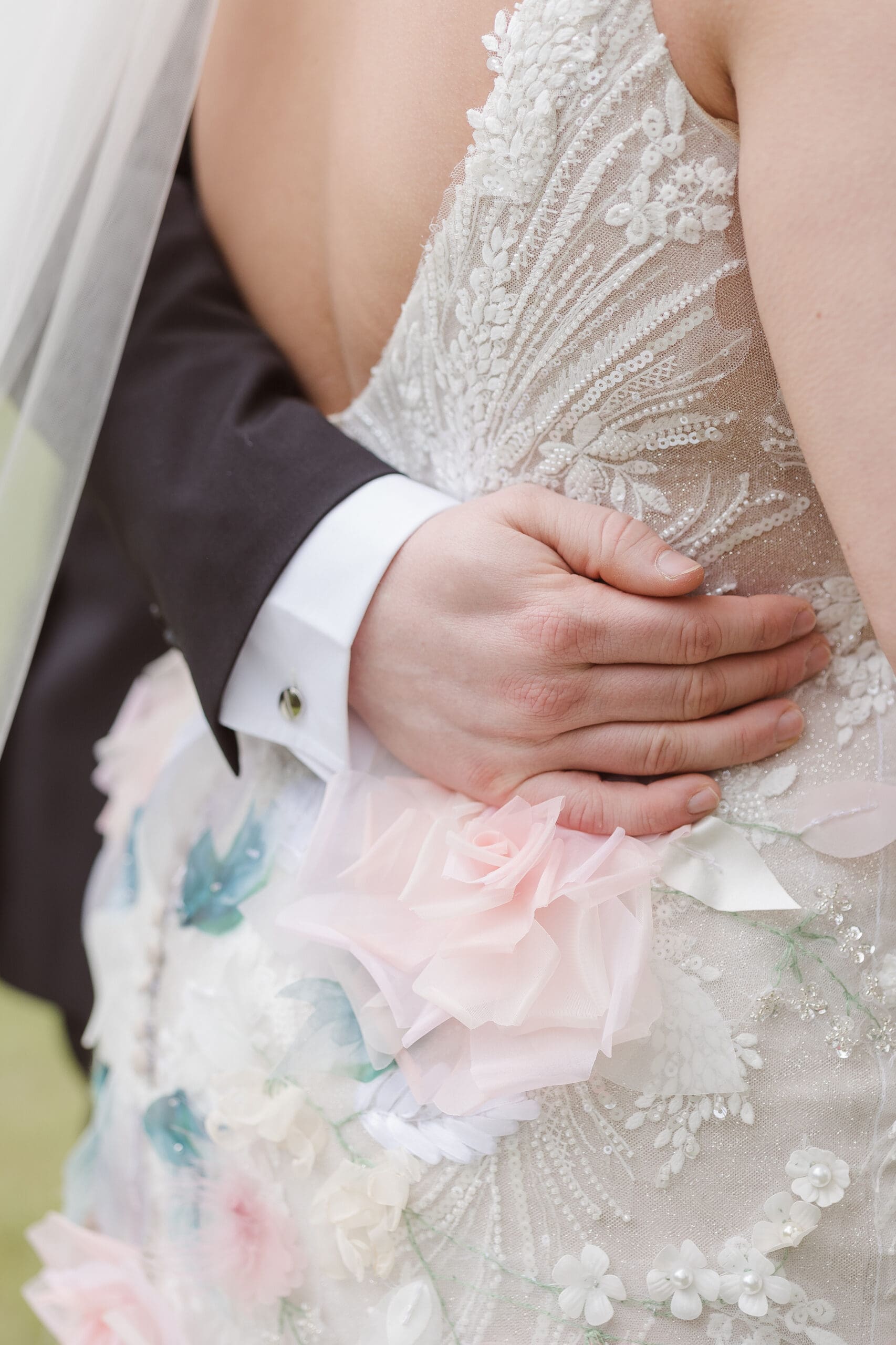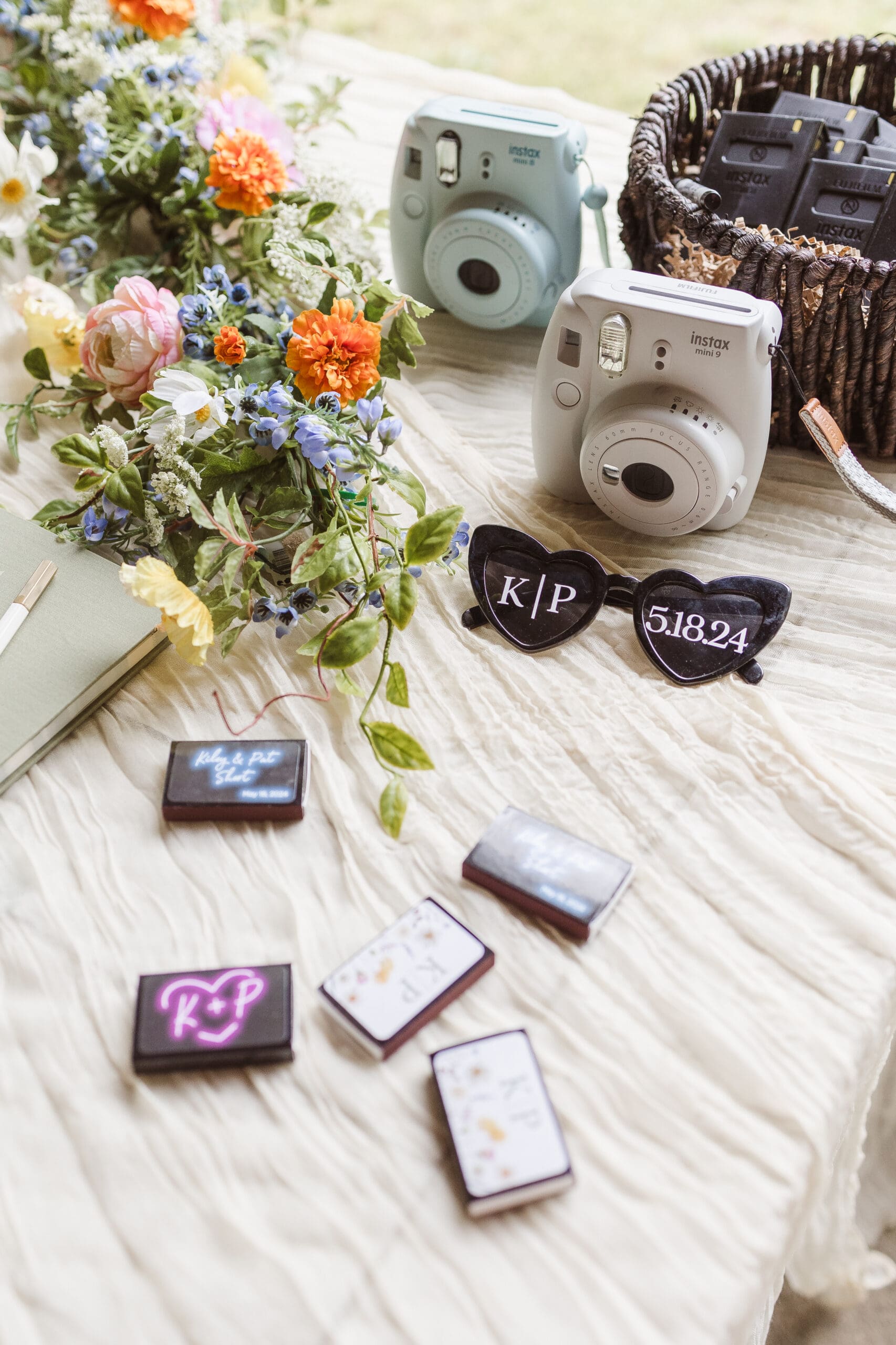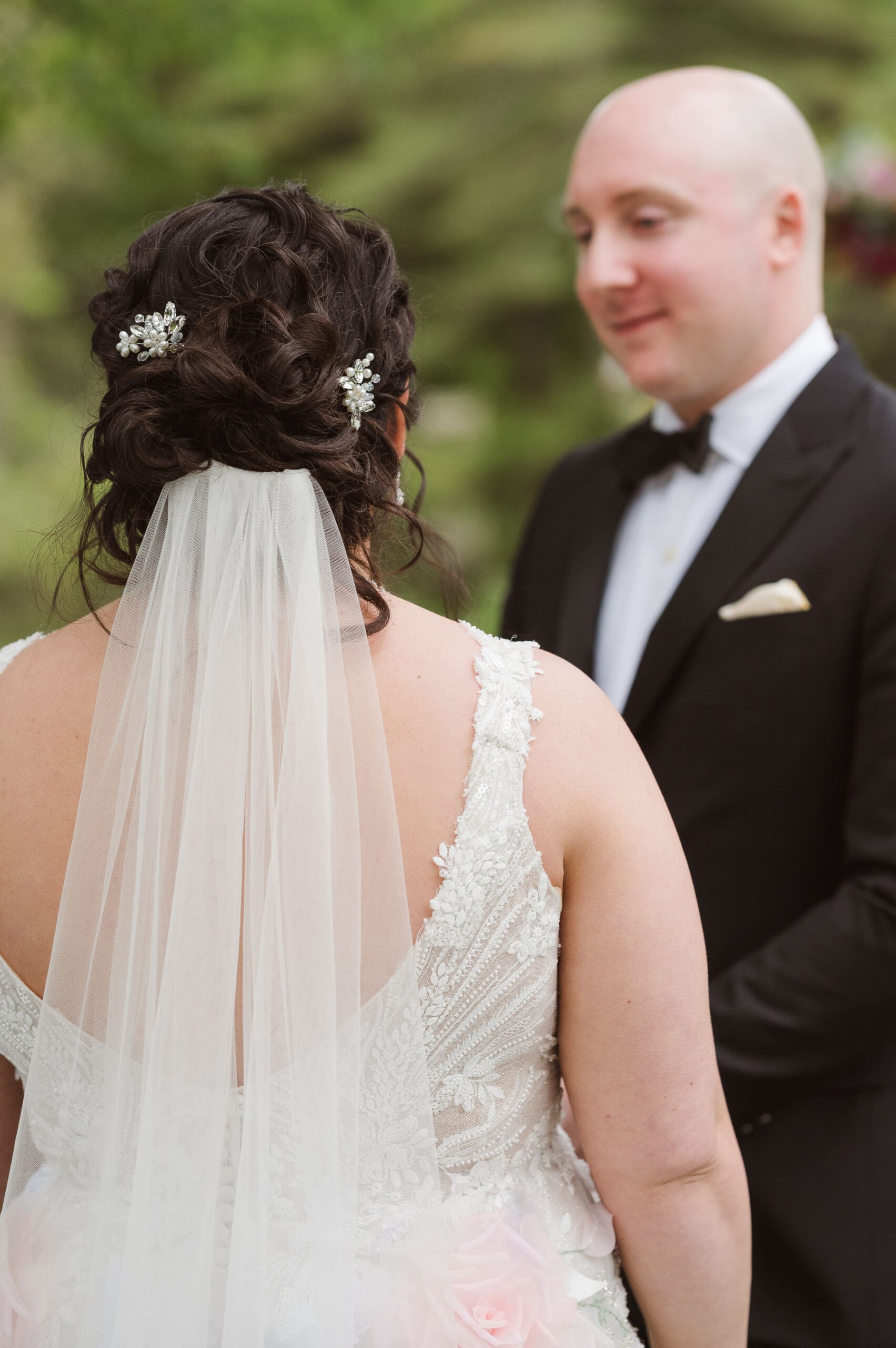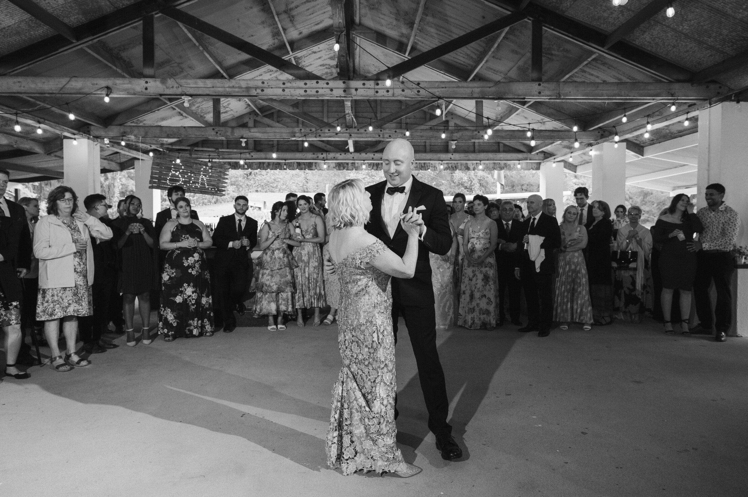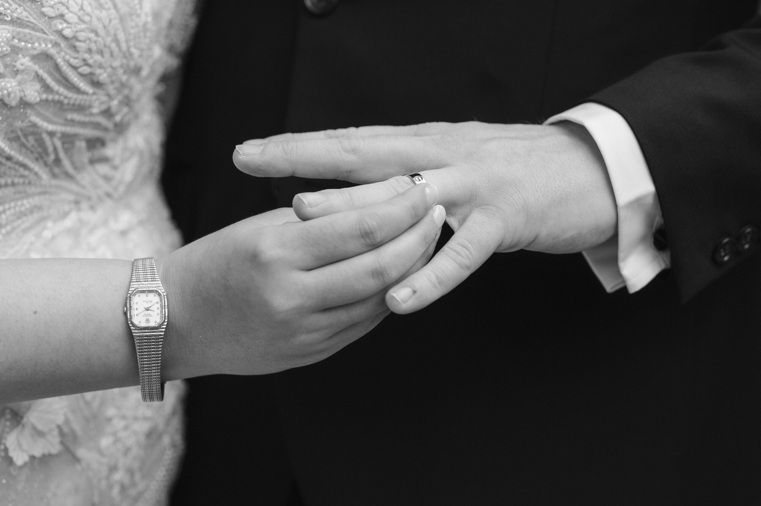 We began with a first look, followed by portraits of just the bride and groom wearing their wedding bands. We then took photos of the wedding party (bridesmaids and groomsmen) and family. We had about 45 minutes to spare to prepare and chill out before the ceremony and the guests’ arrival. It rained during their ceremony, but we continued despite the drizzle not dampening our mood. Afterward, we celebrated with food, dancing, and an open bar under the glow of Pat’s 30 Acre’s Edison bulbs all night long.