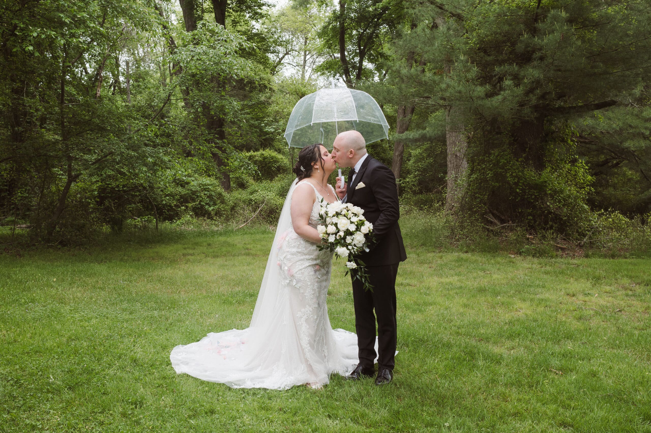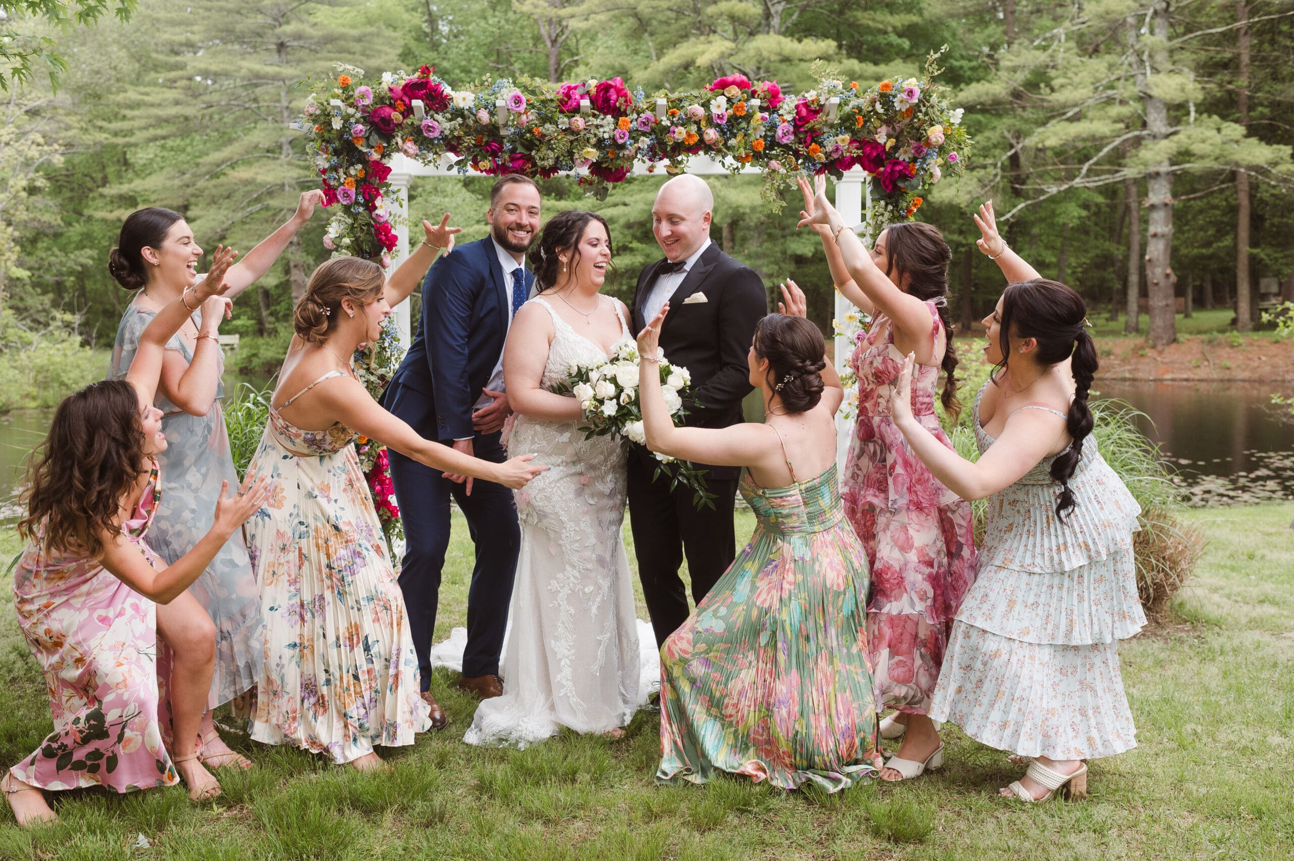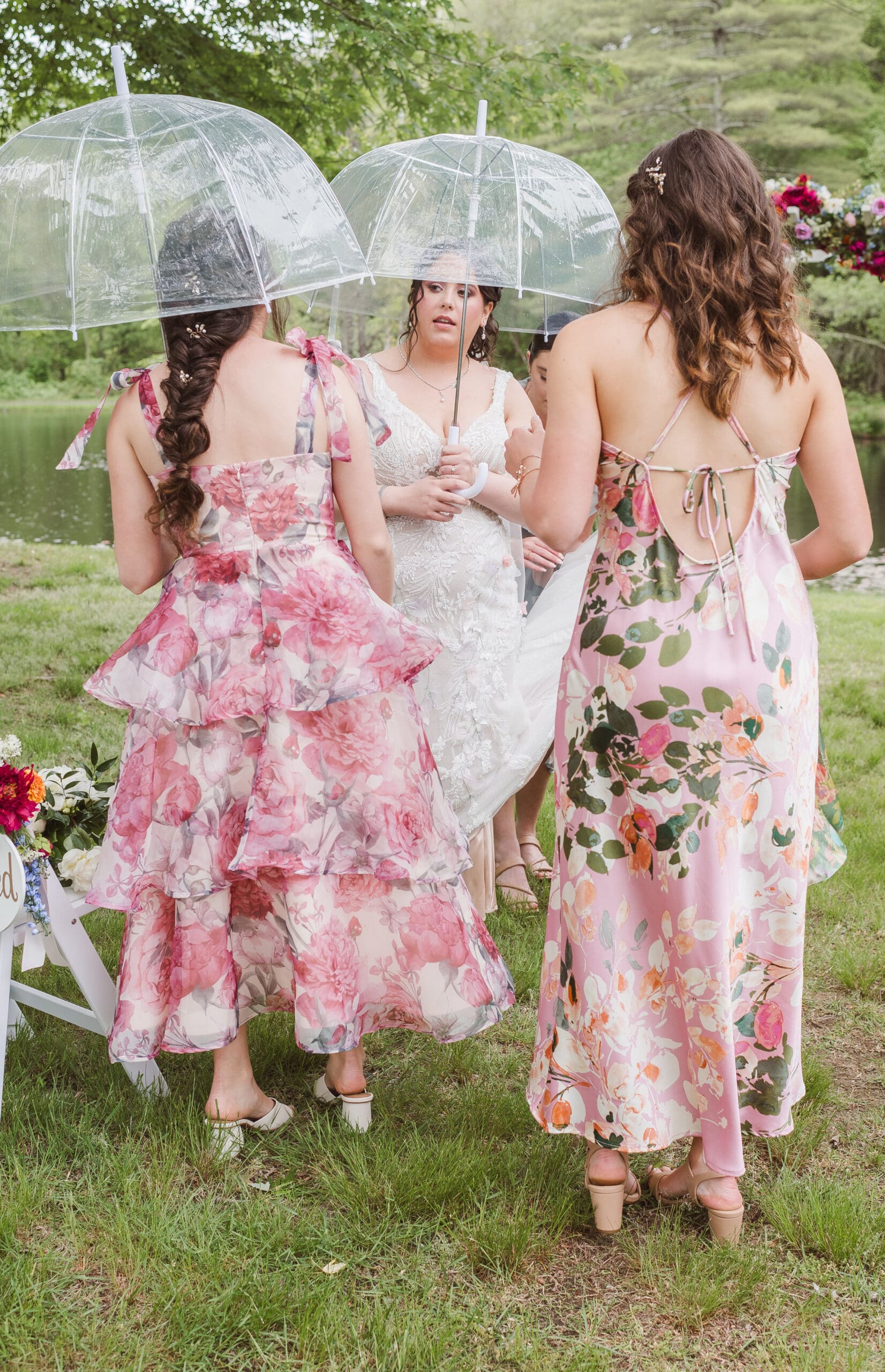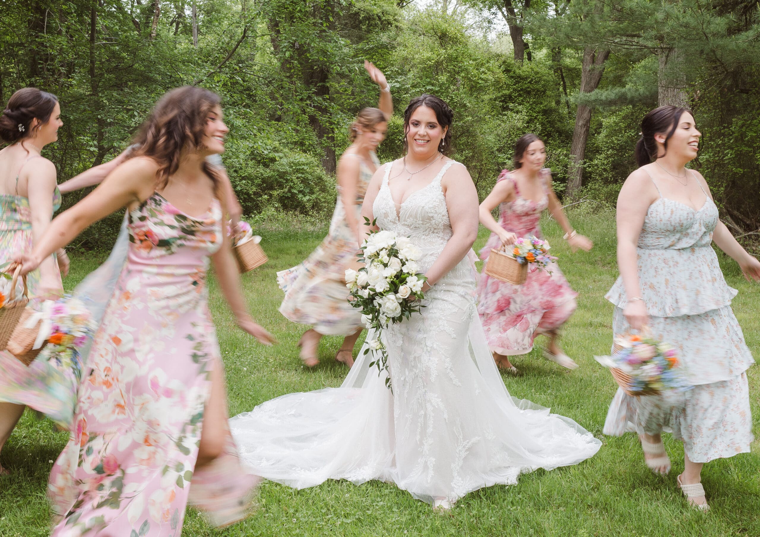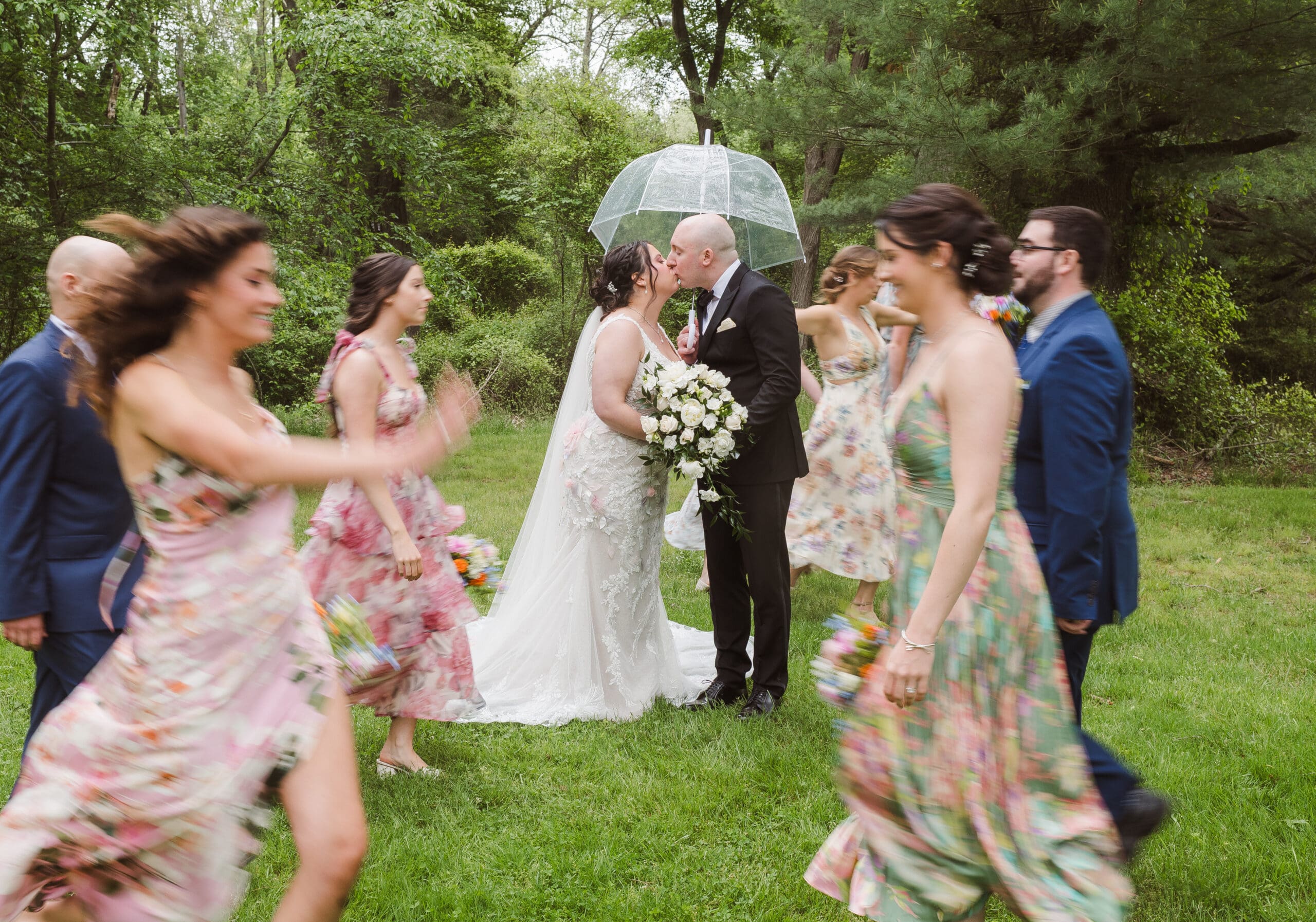 It rained on a late spring day in May, and it was good luck on their wedding day. We started the wedding getting ready at a rental home about a 10-minute drive near Pat’s 30-acre venue. The couple hired their favorite Asbury, NJ restaurant, Crdnl, to cater the wedding. Most of the wedding decor was DIY by one of the bride’s seven sisters. Speaking of seven sisters, the bride had each wear a floral dress without restrictions! Seeing them express each style and go with the garden wedding theme was cute. The wedding was magical, despite the rain. I believe the rain added a touch of romance. The couple prepared with clear umbrellas, and guests came equipped with their own, too, or they found some to borrow for the ceremony under the large trees. Because the ceremony occurred outdoors and on grass, I highly recommend that the females wear chunky heels to protect their pretty shoes from sinking into the mud. At Pat’s 30 acres, I would say it’s a pretty casual vibe. Instead of using the picnic tables provided by the venue, the couple opted to rent out different wood tables, chairs, and mix-match china for their wedding. It certainly elevated the venue by doing this! One of the best parts of my job as a wedding photographer is capturing dance floor action – the DJ entertainment company, Elite Entertainment, kept the dance floor alive all night. By the night’s end, I noticed how perfect the bride still looked – her hair and makeup stylists did a great job making sure her style held up despite the rain, sweat, tears, and jumping around on the dance floor – she remained beautiful through it all!