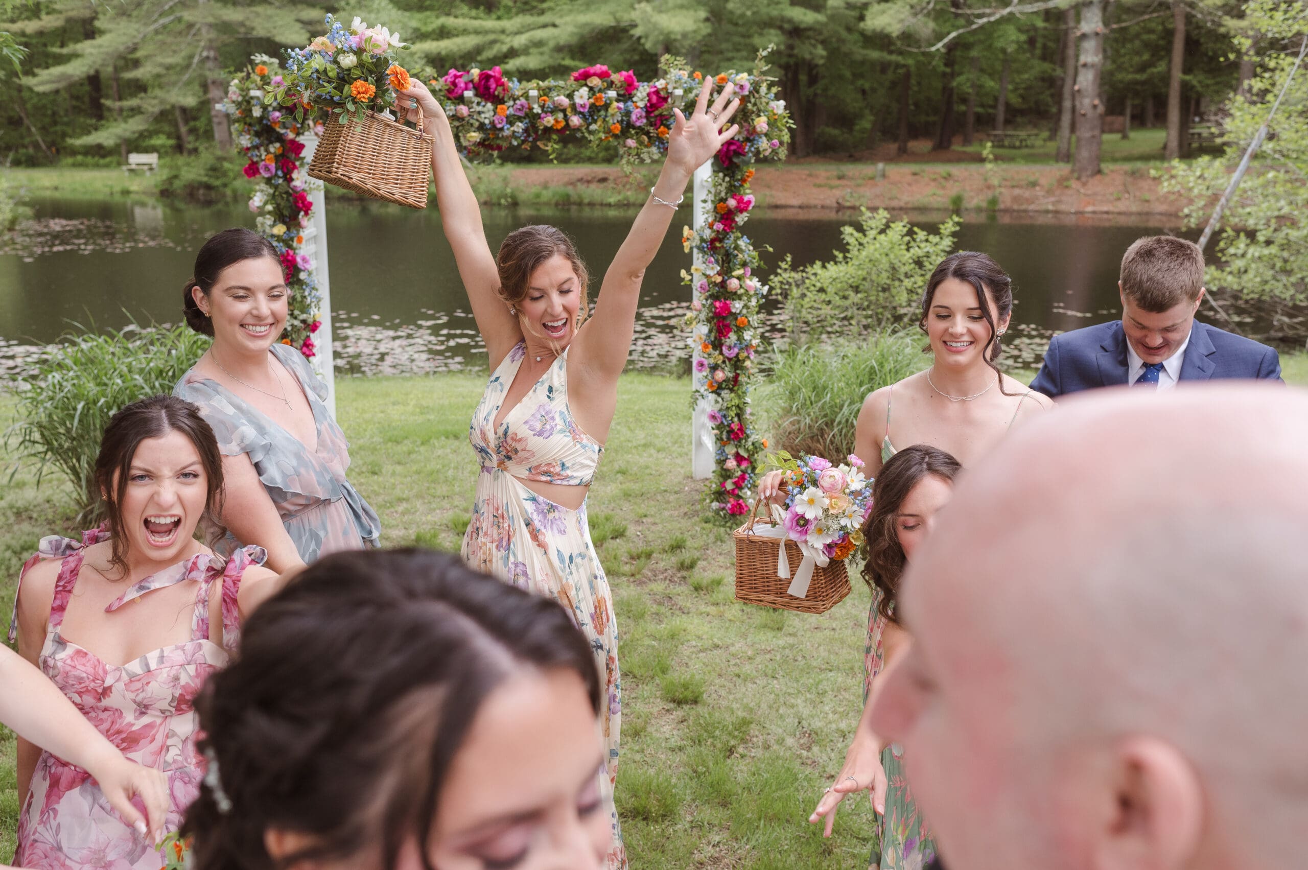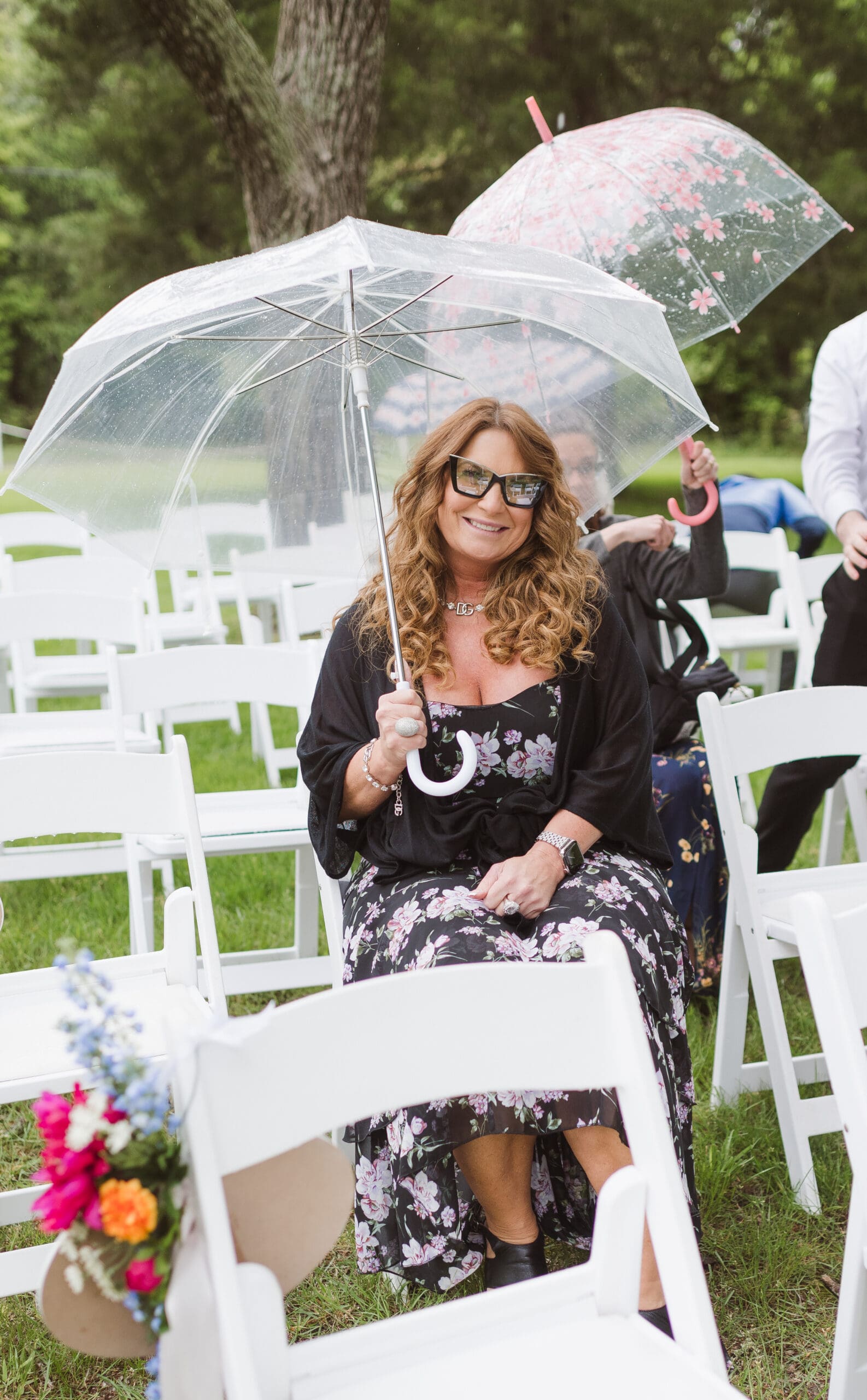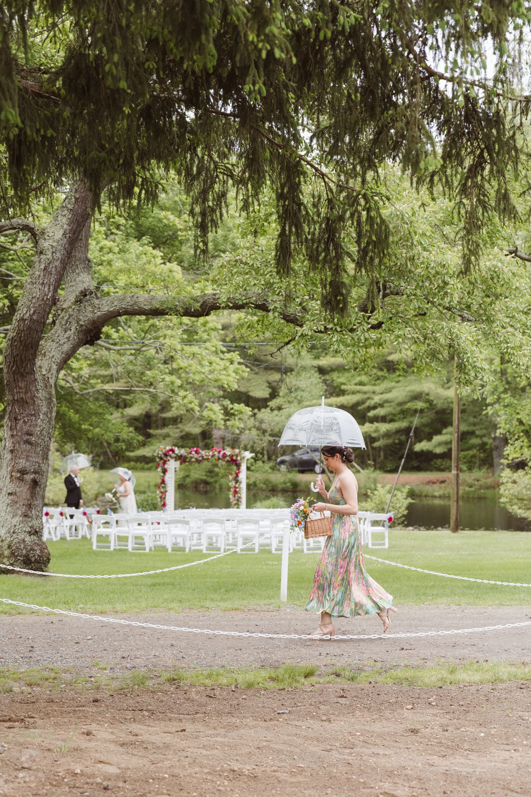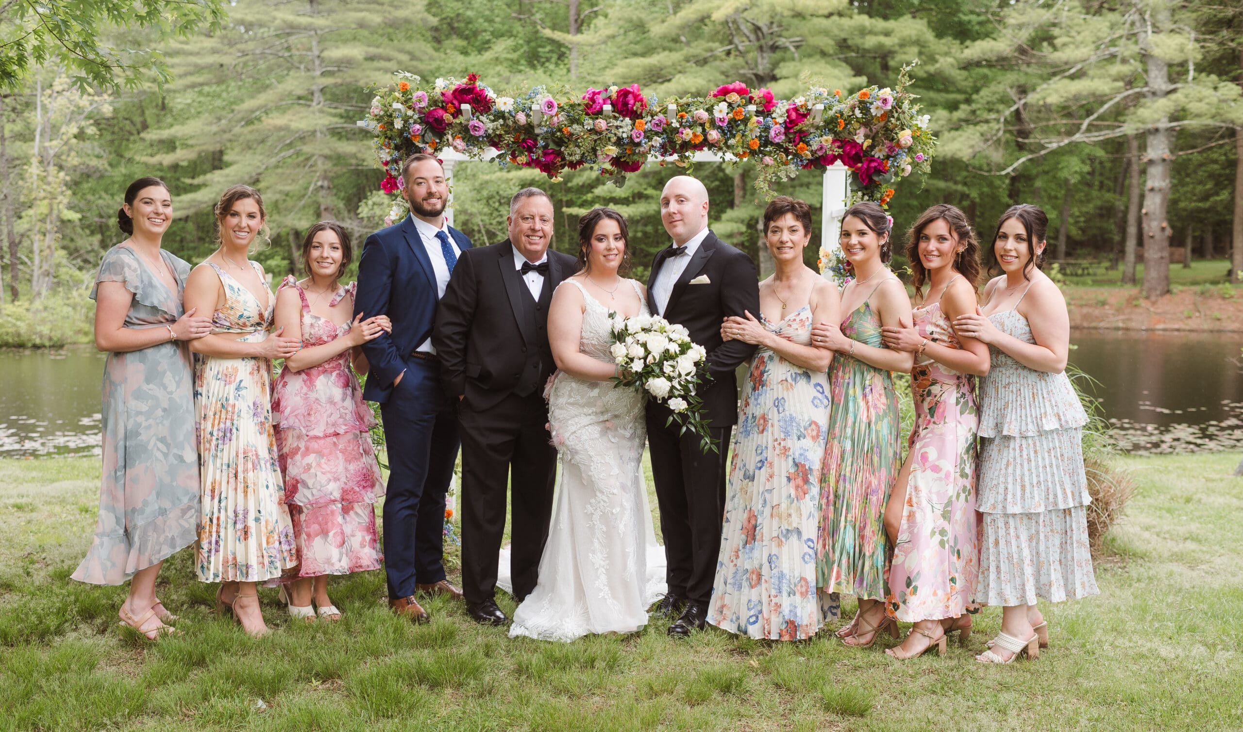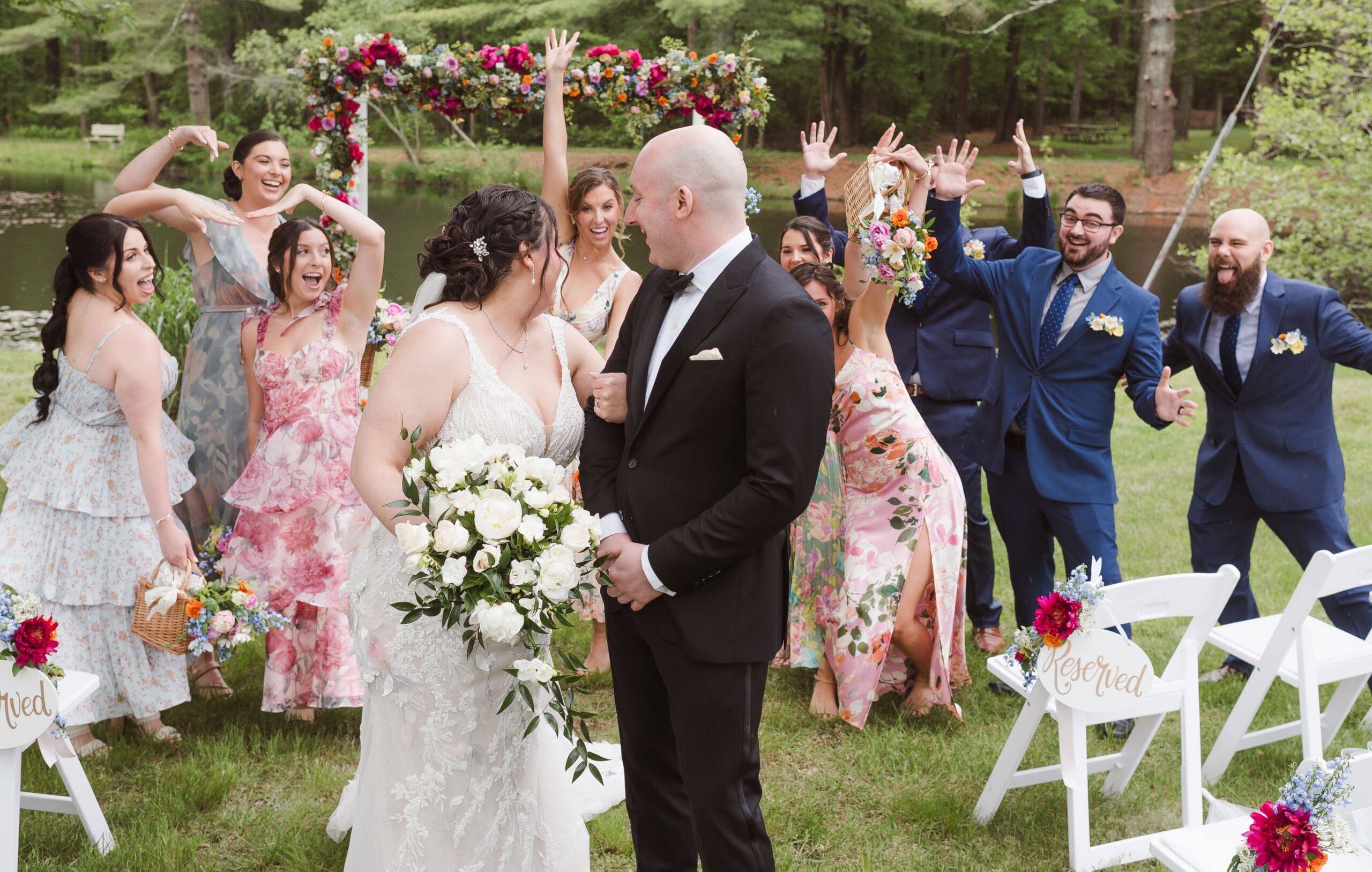 It rained on a late spring day in May, and it was good luck on their wedding day. We started the wedding getting ready at a rental home about a 10-minute drive near Pat’s 30-acre venue. The couple hired their favorite Asbury, NJ restaurant, Crdnl, to cater the wedding. Most of the wedding decor was DIY by one of the bride’s seven sisters. Speaking of seven sisters, the bride had each wear a floral dress without restrictions! Seeing them express each style and go with the garden wedding theme was cute. The wedding was magical, despite the rain. I believe the rain added a touch of romance. The couple prepared with clear umbrellas, and guests came equipped with their own, too, or they found some to borrow for the ceremony under the large trees. Because the ceremony occurred outdoors and on grass, I highly recommend that the females wear chunky heels to protect their pretty shoes from sinking into the mud. At Pat’s 30 acres, I would say it’s a pretty casual vibe. Instead of using the picnic tables provided by the venue, the couple opted to rent out different wood tables, chairs, and mix-match china for their wedding. It certainly elevated the venue by doing this! One of the best parts of my job as a wedding photographer is capturing dance floor action – the DJ entertainment company, Elite Entertainment, kept the dance floor alive all night. By the night’s end, I noticed how perfect the bride still looked – her hair and makeup stylists did a great job making sure her style held up despite the rain, sweat, tears, and jumping around on the dance floor – she remained beautiful through it all!