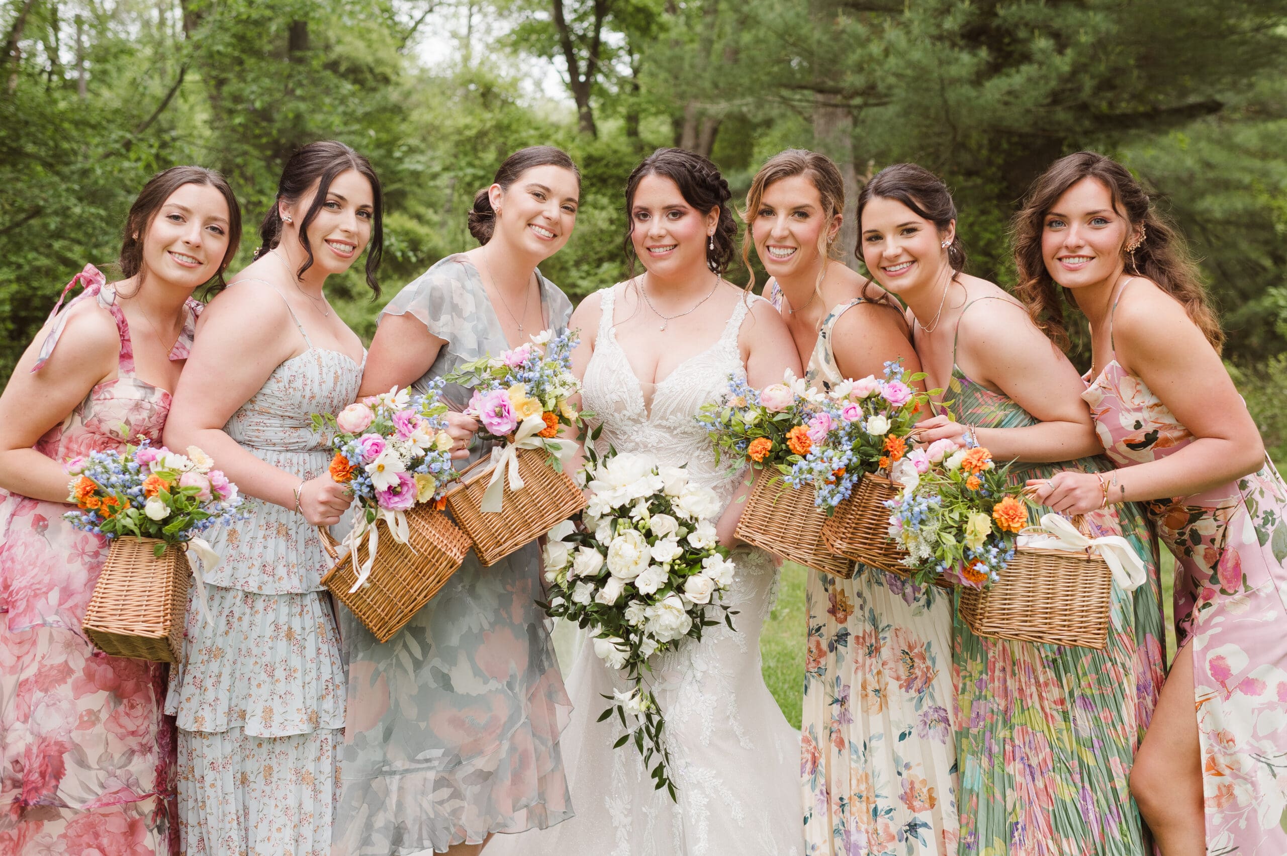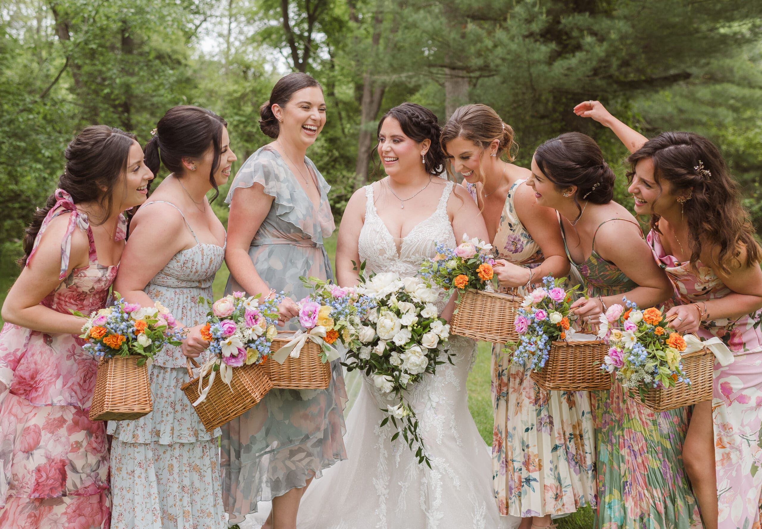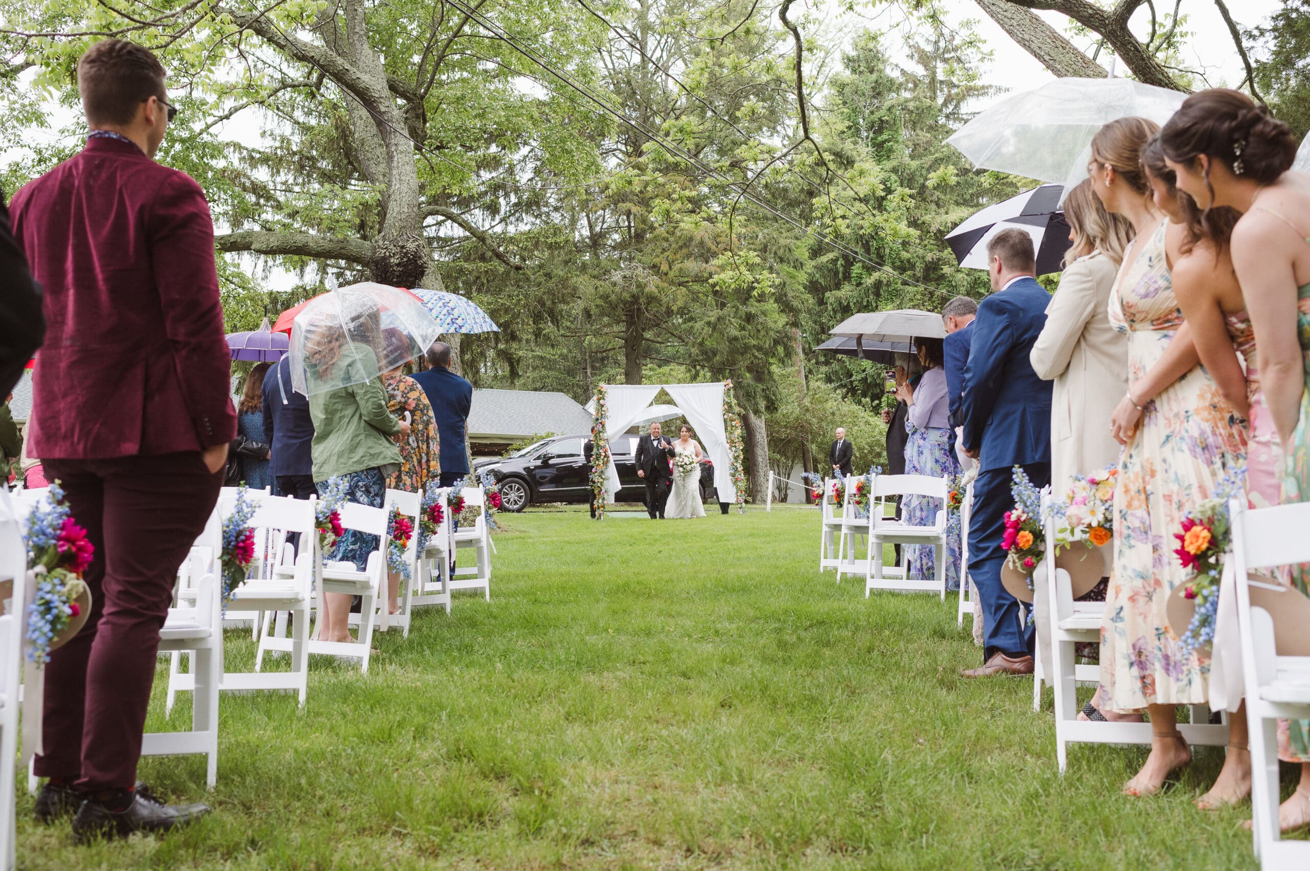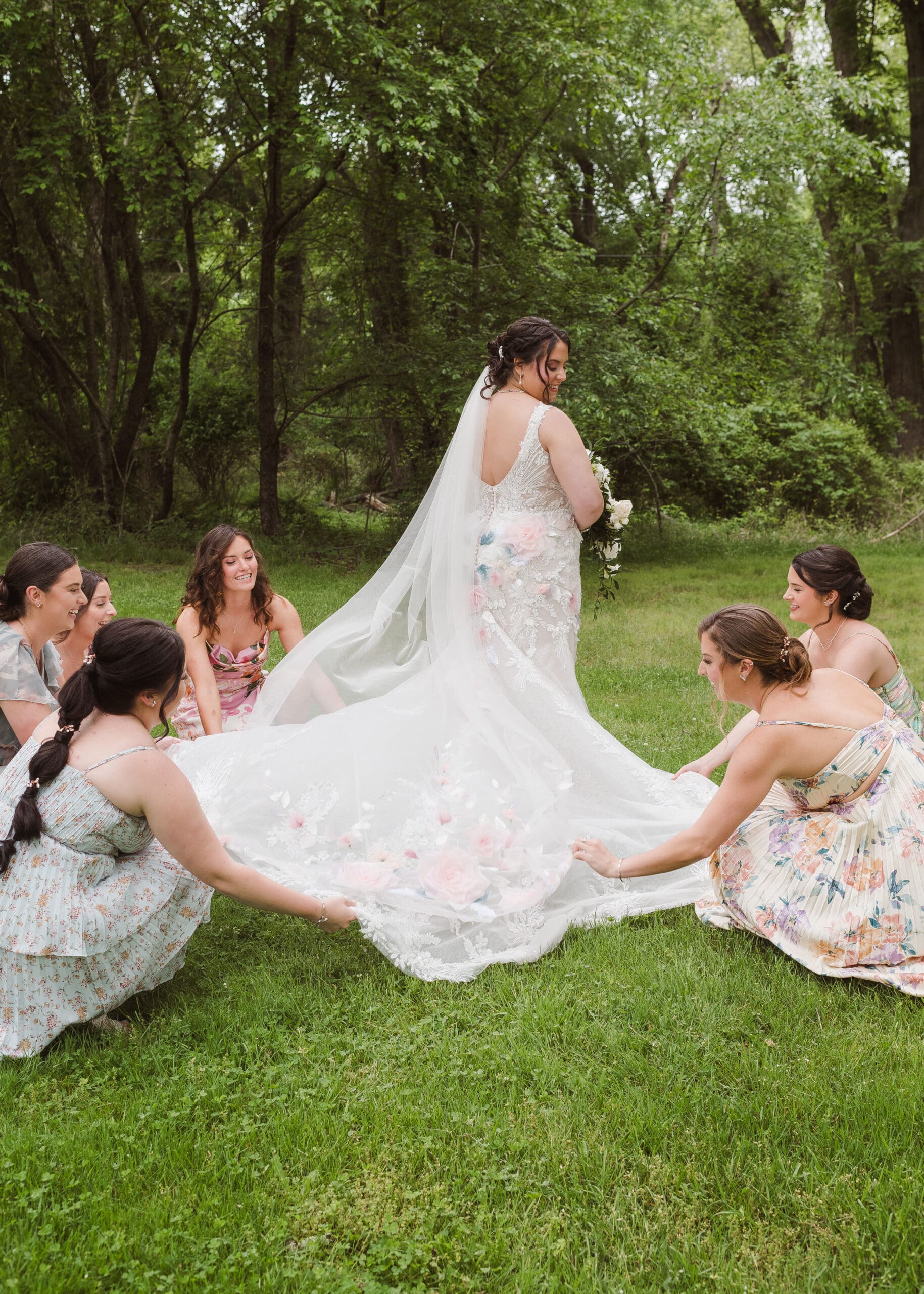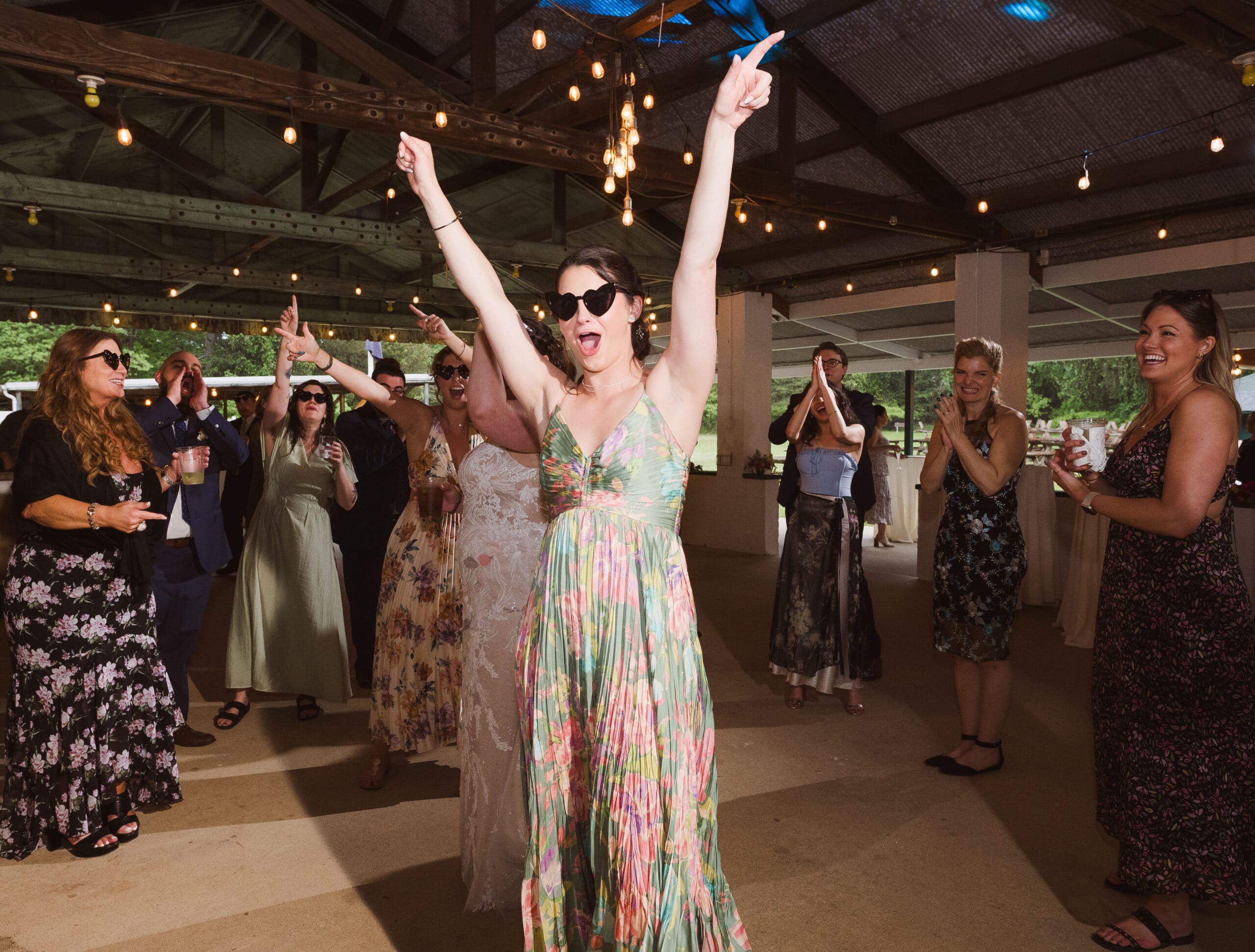 It rained on a late spring day in May, and it was good luck on their wedding day. We started the wedding getting ready at a rental home about a 10-minute drive near Pat’s 30-acre venue. The couple hired their favorite Asbury, NJ restaurant, Crdnl, to cater the wedding. Most of the wedding decor was DIY by one of the bride’s seven sisters. Speaking of seven sisters, the bride had each wear a floral dress without restrictions! Seeing them express each style and go with the garden wedding theme was cute. The wedding was magical, despite the rain. I believe the rain added a touch of romance. The couple prepared with clear umbrellas, and guests came equipped with their own, too, or they found some to borrow for the ceremony under the large trees. Because the ceremony occurred outdoors and on grass, I highly recommend that the females wear chunky heels to protect their pretty shoes from sinking into the mud. At Pat’s 30 acres, I would say it’s a pretty casual vibe. Instead of using the picnic tables provided by the venue, the couple opted to rent out different wood tables, chairs, and mix-match china for their wedding. It certainly elevated the venue by doing this! One of the best parts of my job as a wedding photographer is capturing dance floor action – the DJ entertainment company, Elite Entertainment, kept the dance floor alive all night. By the night’s end, I noticed how perfect the bride still looked – her hair and makeup stylists did a great job making sure her style held up despite the rain, sweat, tears, and jumping around on the dance floor – she remained beautiful through it all!