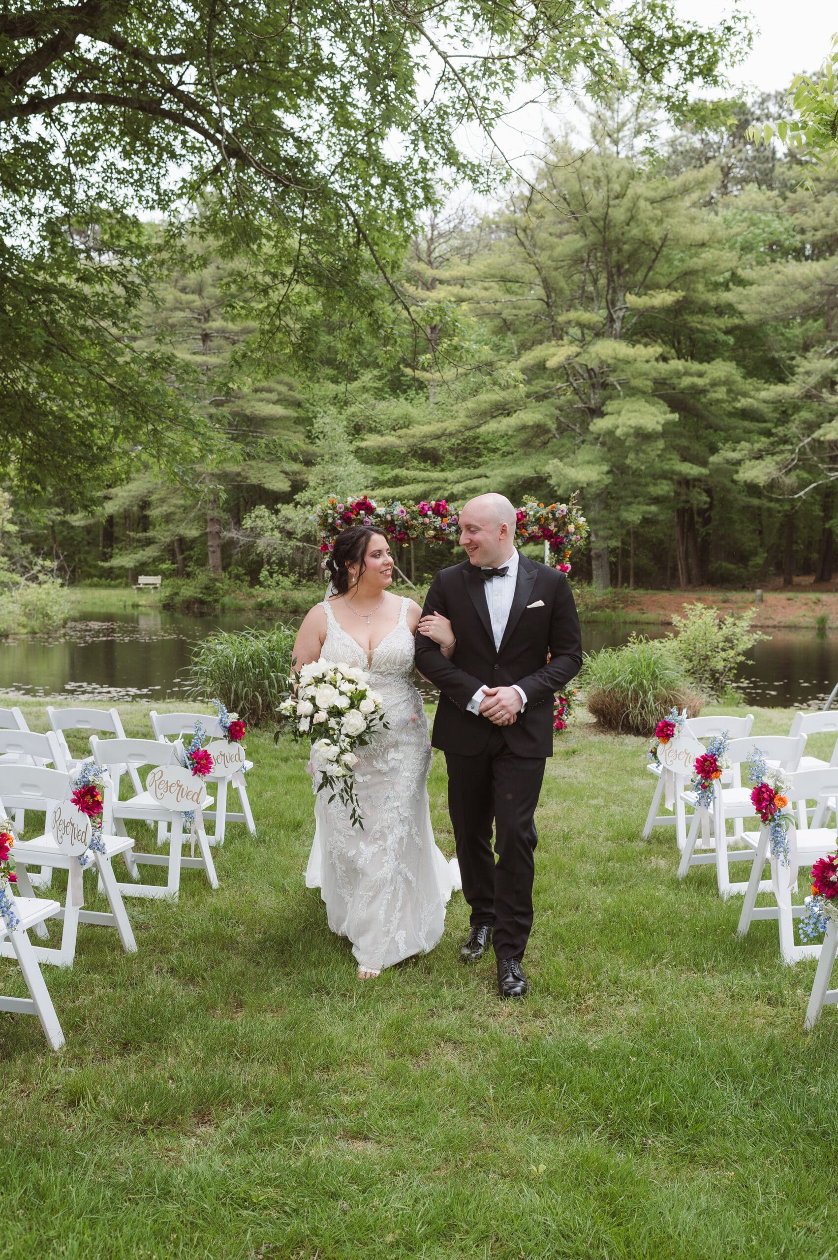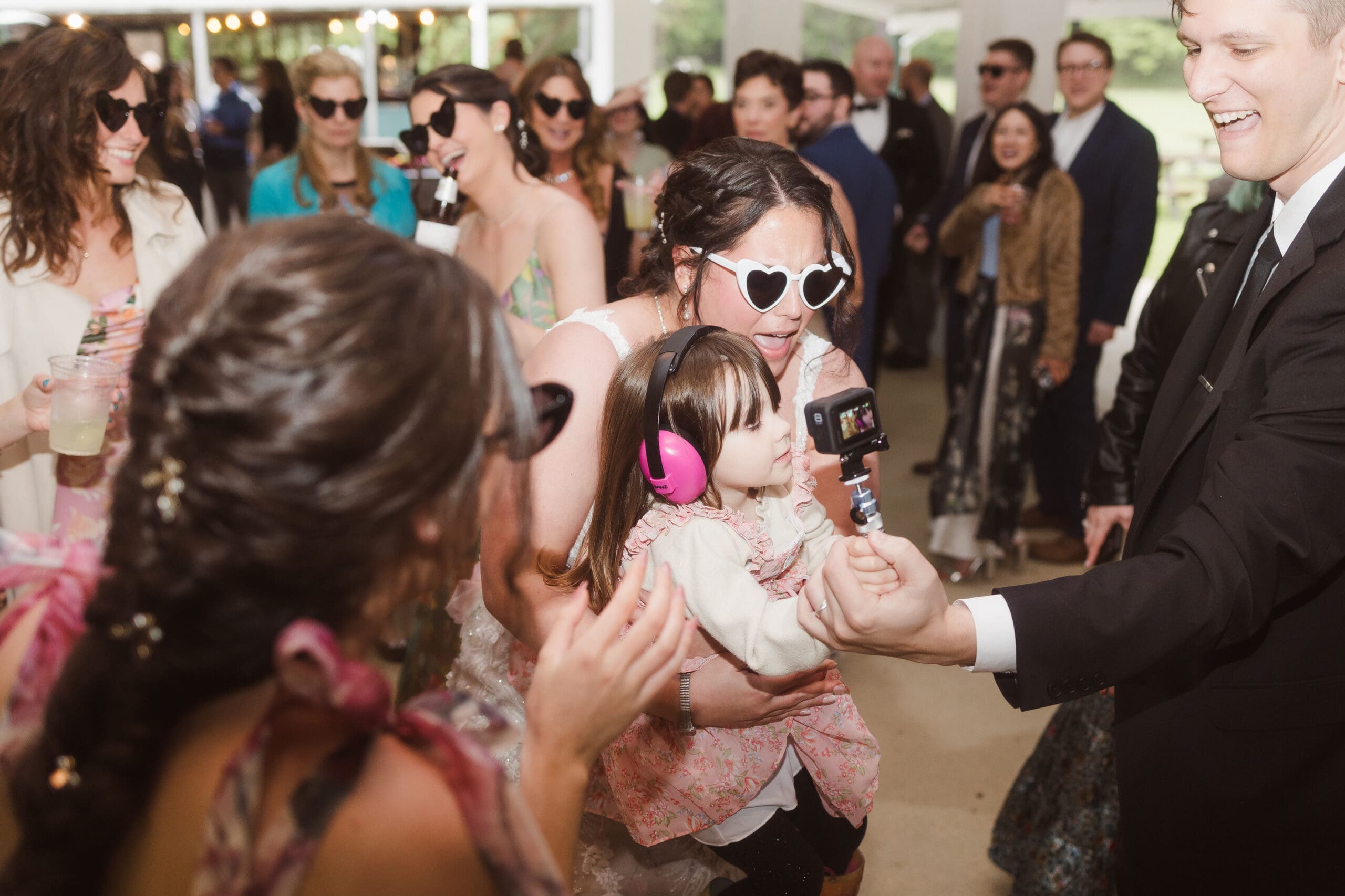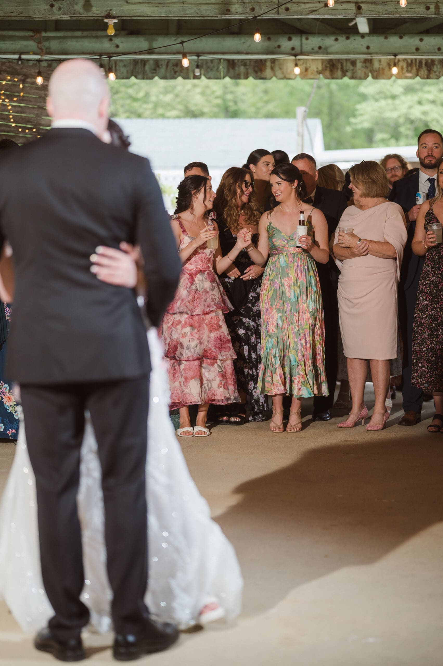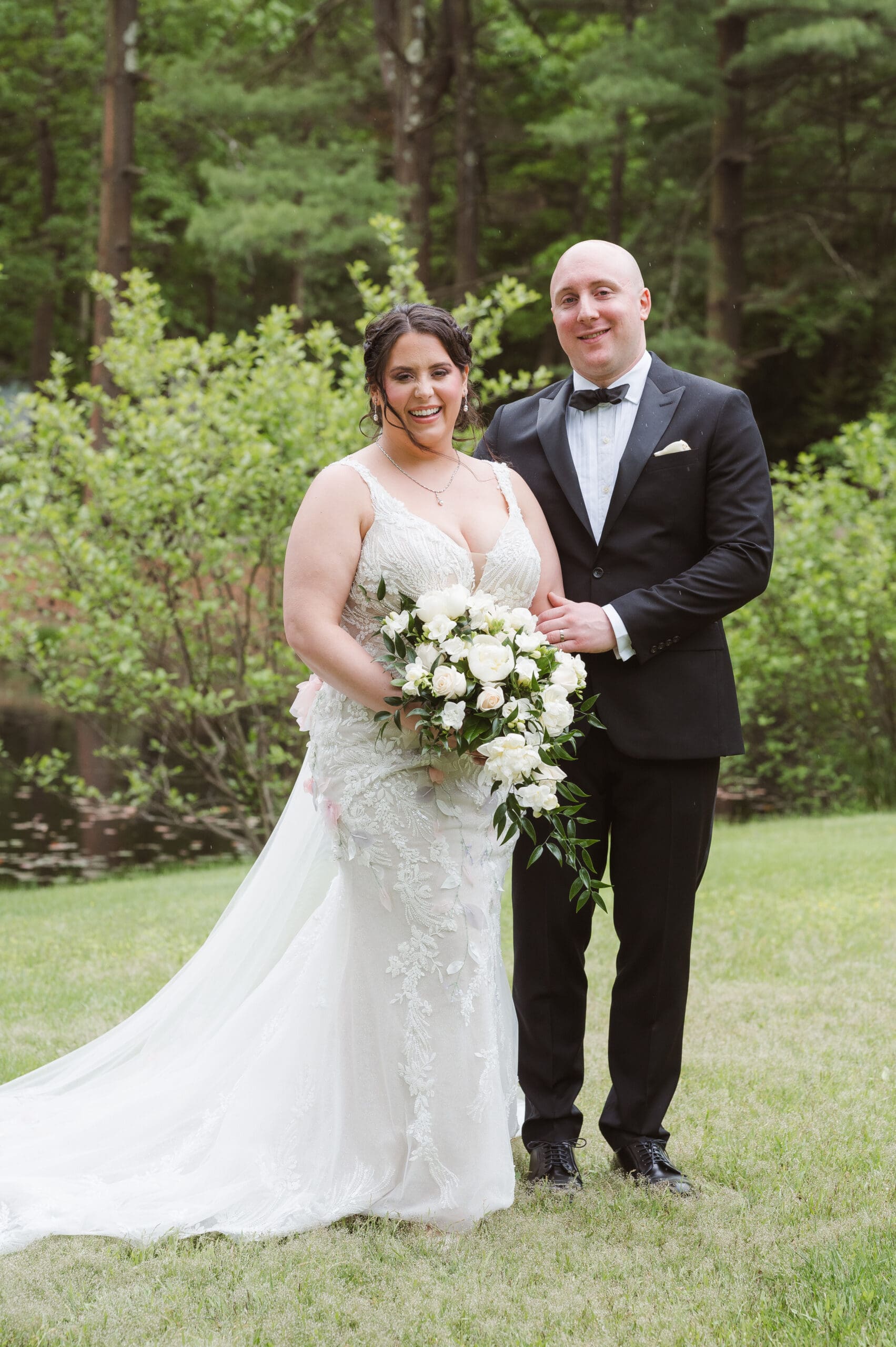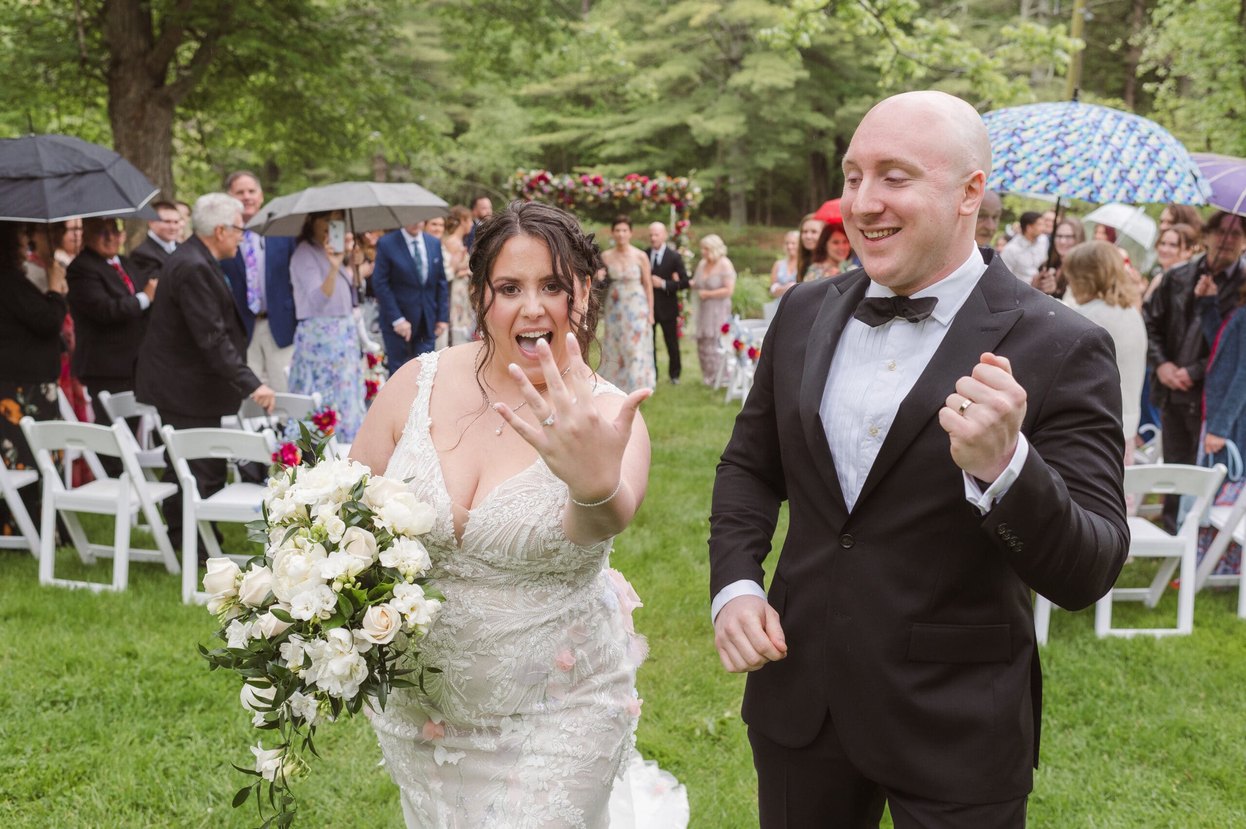 It rained on a late spring day in May, and it was good luck on their wedding day. We started the wedding getting ready at a rental home about a 10-minute drive near Pat’s 30-acre venue. The couple hired their favorite Asbury, NJ restaurant, Crdnl, to cater the wedding. Most of the wedding decor was DIY by one of the bride’s seven sisters. Speaking of seven sisters, the bride had each wear a floral dress without restrictions! Seeing them express each style and go with the garden wedding theme was cute. The wedding was magical, despite the rain. I believe the rain added a touch of romance. The couple prepared with clear umbrellas, and guests came equipped with their own, too, or they found some to borrow for the ceremony under the large trees. Because the ceremony occurred outdoors and on grass, I highly recommend that the females wear chunky heels to protect their pretty shoes from sinking into the mud. At Pat’s 30 acres, I would say it’s a pretty casual vibe. Instead of using the picnic tables provided by the venue, the couple opted to rent out different wood tables, chairs, and mix-match china for their wedding. It certainly elevated the venue by doing this! One of the best parts of my job as a wedding photographer is capturing dance floor action – the DJ entertainment company, Elite Entertainment, kept the dance floor alive all night. By the night’s end, I noticed how perfect the bride still looked – her hair and makeup stylists did a great job making sure her style held up despite the rain, sweat, tears, and jumping around on the dance floor – she remained beautiful through it all!