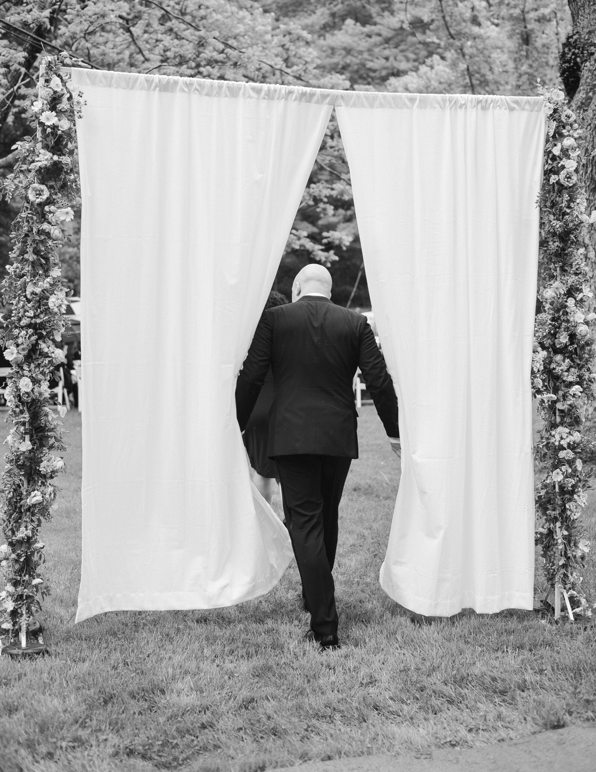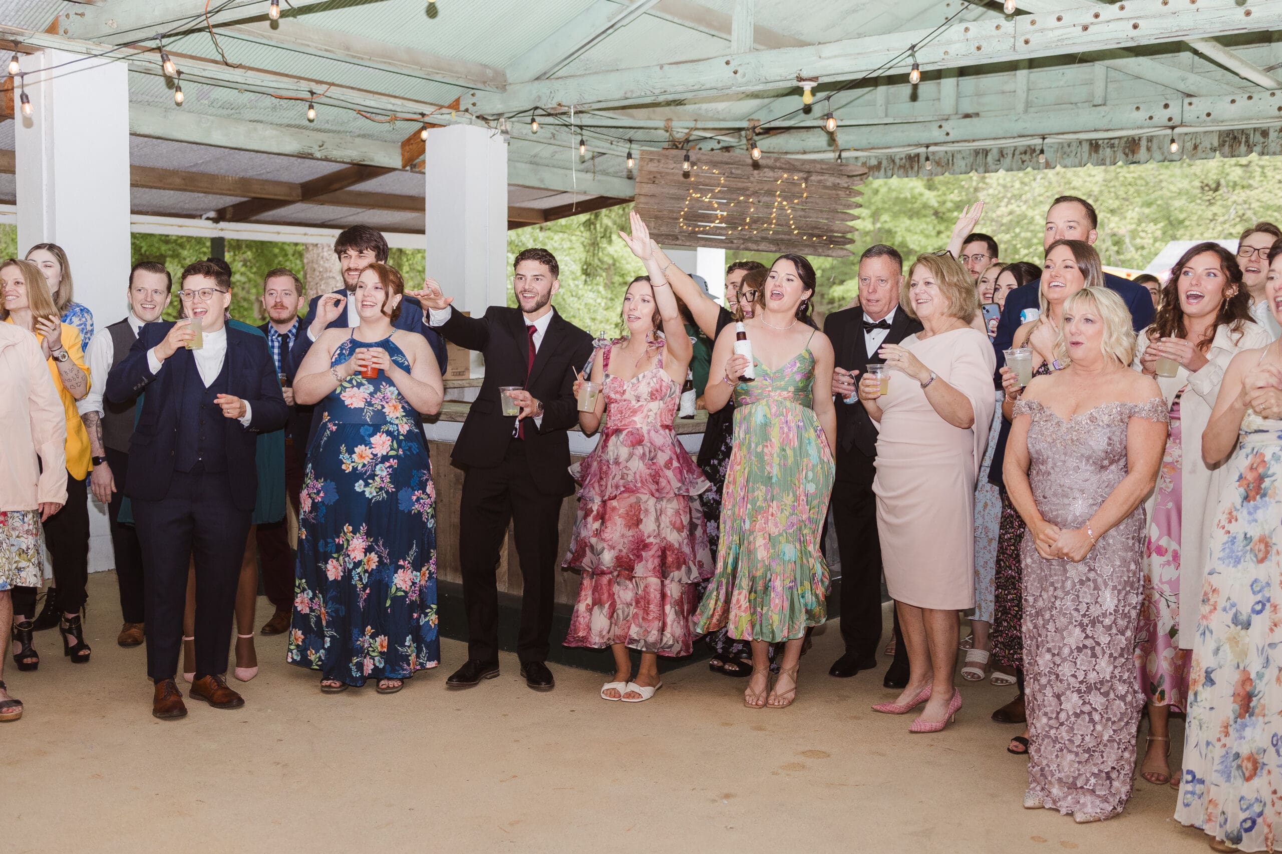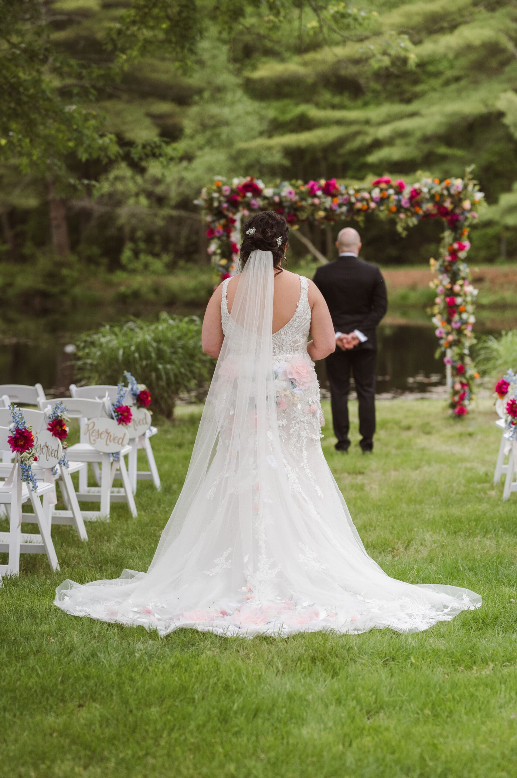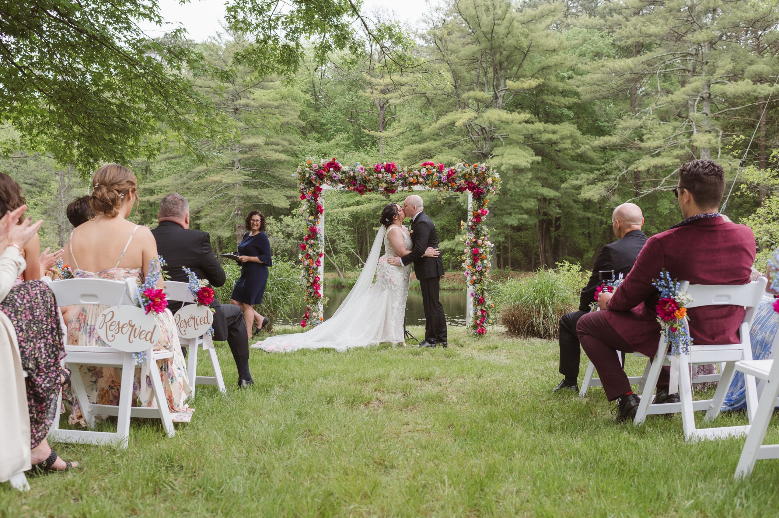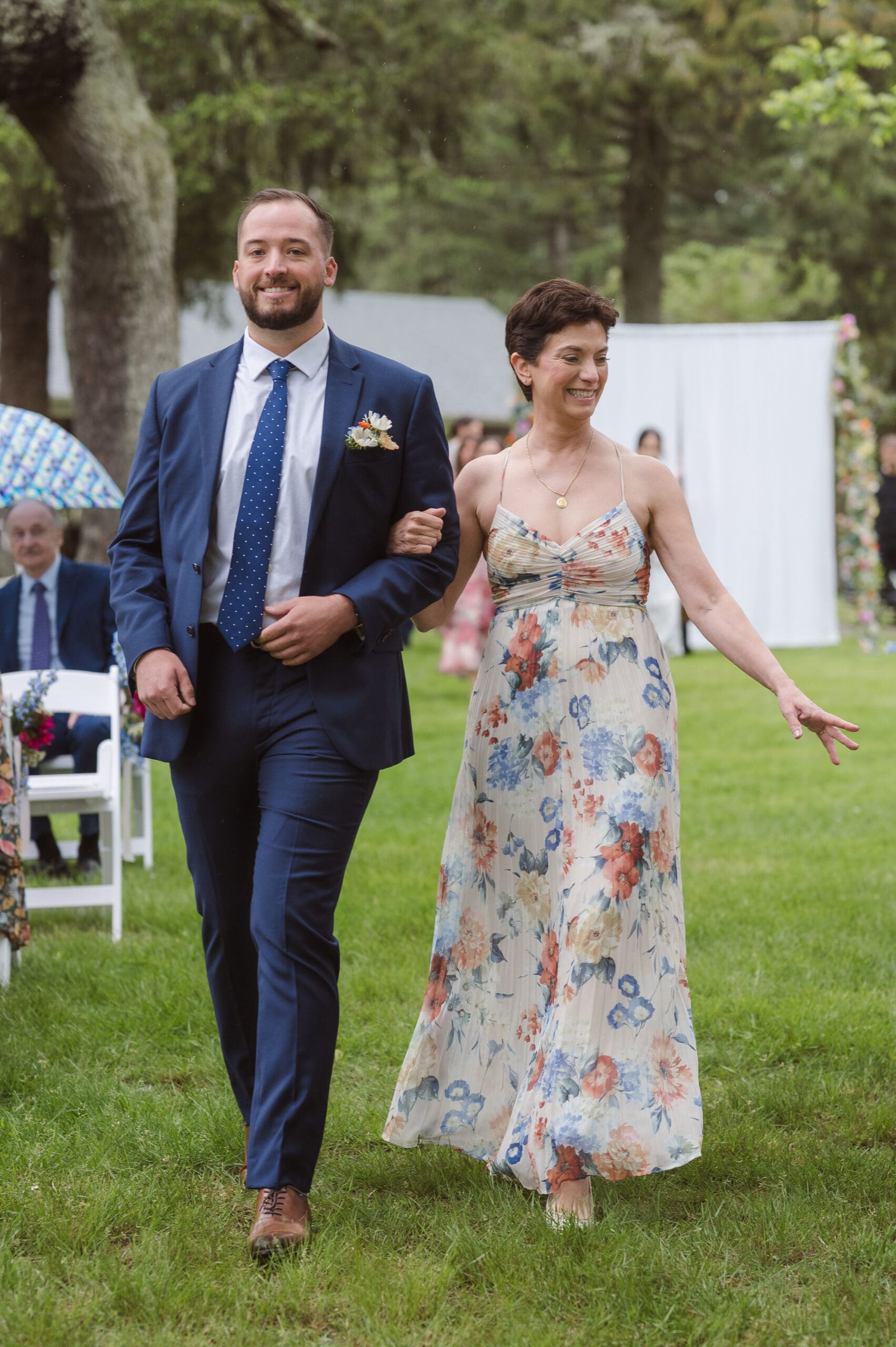 It rained on a late spring day in May, and it was good luck on their wedding day. We started the wedding getting ready at a rental home about a 10-minute drive near Pat’s 30-acre venue. The couple hired their favorite Asbury, NJ restaurant, Crdnl, to cater the wedding. Most of the wedding decor was DIY by one of the bride’s seven sisters. Speaking of seven sisters, the bride had each wear a floral dress without restrictions! Seeing them express each style and go with the garden wedding theme was cute. The wedding was magical, despite the rain. I believe the rain added a touch of romance. The couple prepared with clear umbrellas, and guests came equipped with their own, too, or they found some to borrow for the ceremony under the large trees. Because the ceremony occurred outdoors and on grass, I highly recommend that the females wear chunky heels to protect their pretty shoes from sinking into the mud. At Pat’s 30 acres, I would say it’s a pretty casual vibe. Instead of using the picnic tables provided by the venue, the couple opted to rent out different wood tables, chairs, and mix-match china for their wedding. It certainly elevated the venue by doing this! One of the best parts of my job as a wedding photographer is capturing dance floor action – the DJ entertainment company, Elite Entertainment, kept the dance floor alive all night. By the night’s end, I noticed how perfect the bride still looked – her hair and makeup stylists did a great job making sure her style held up despite the rain, sweat, tears, and jumping around on the dance floor – she remained beautiful through it all!