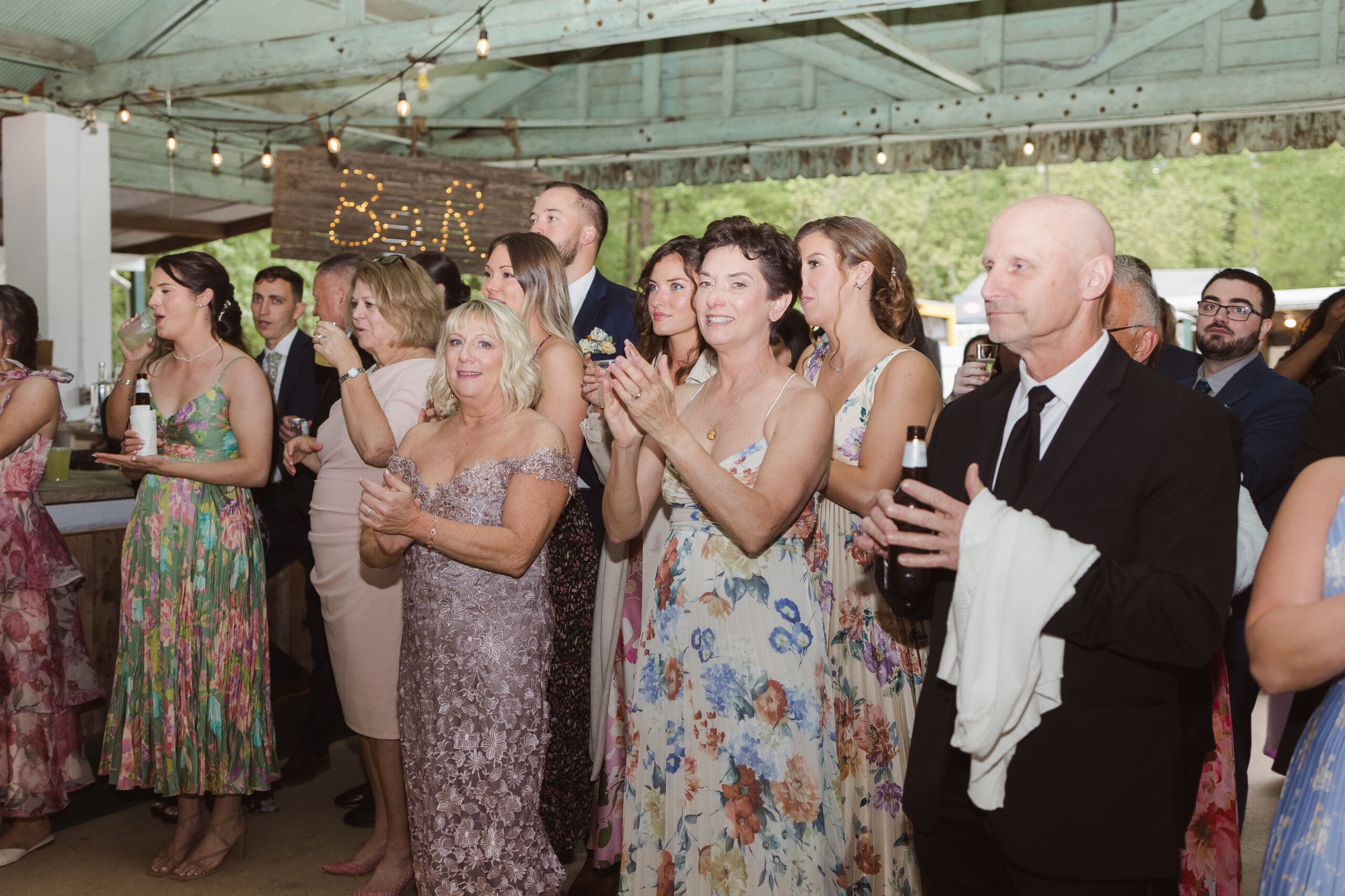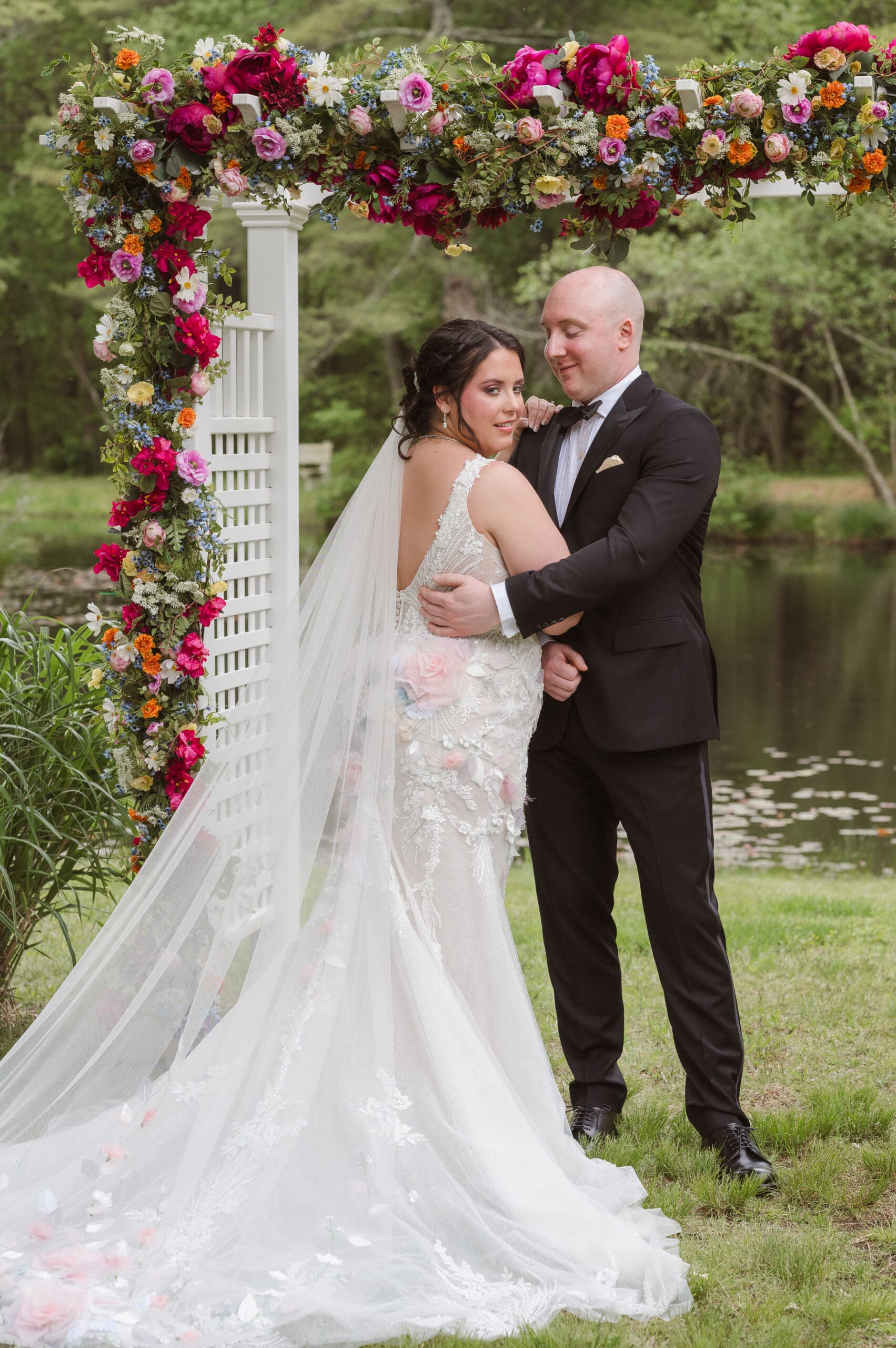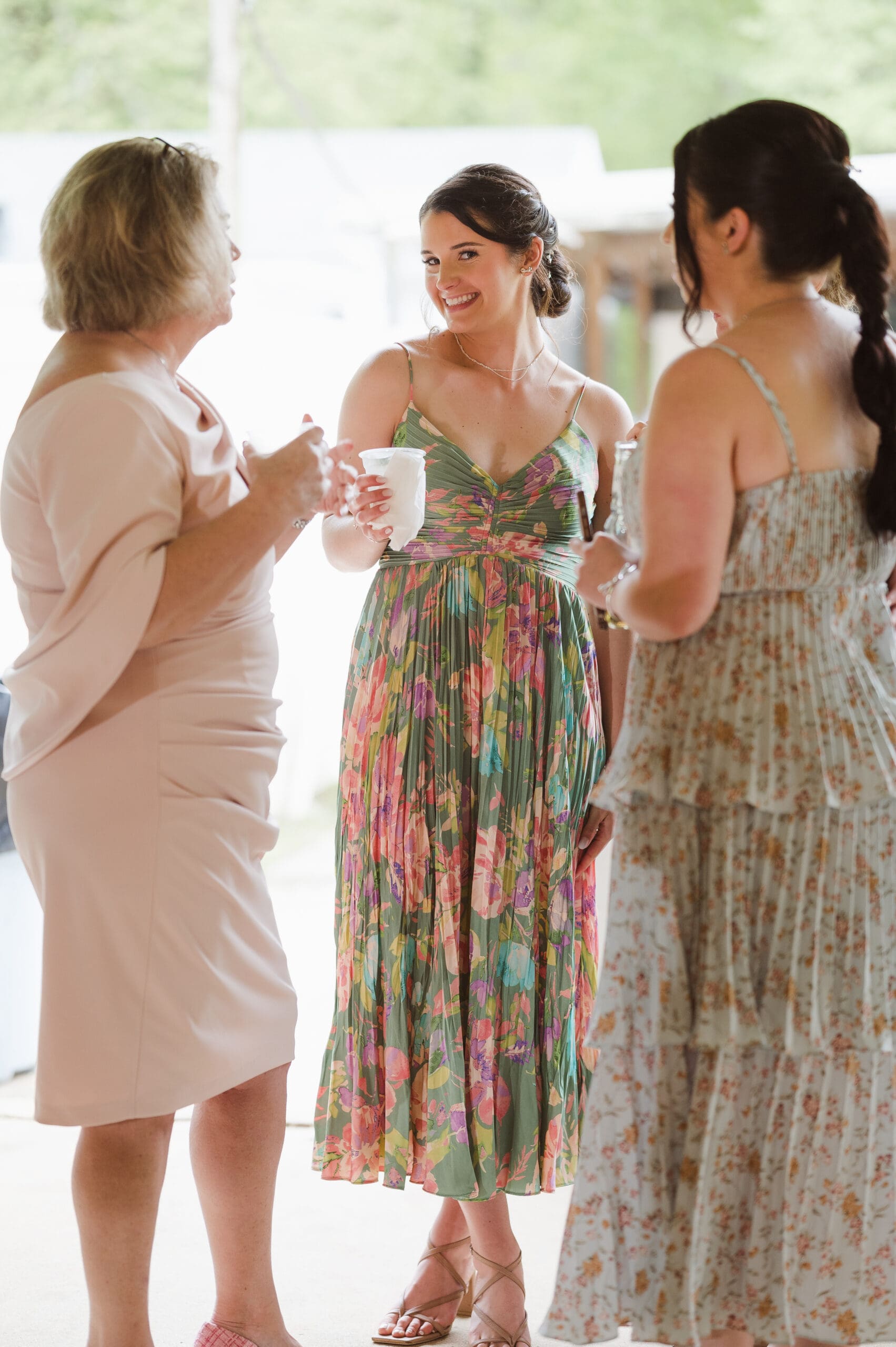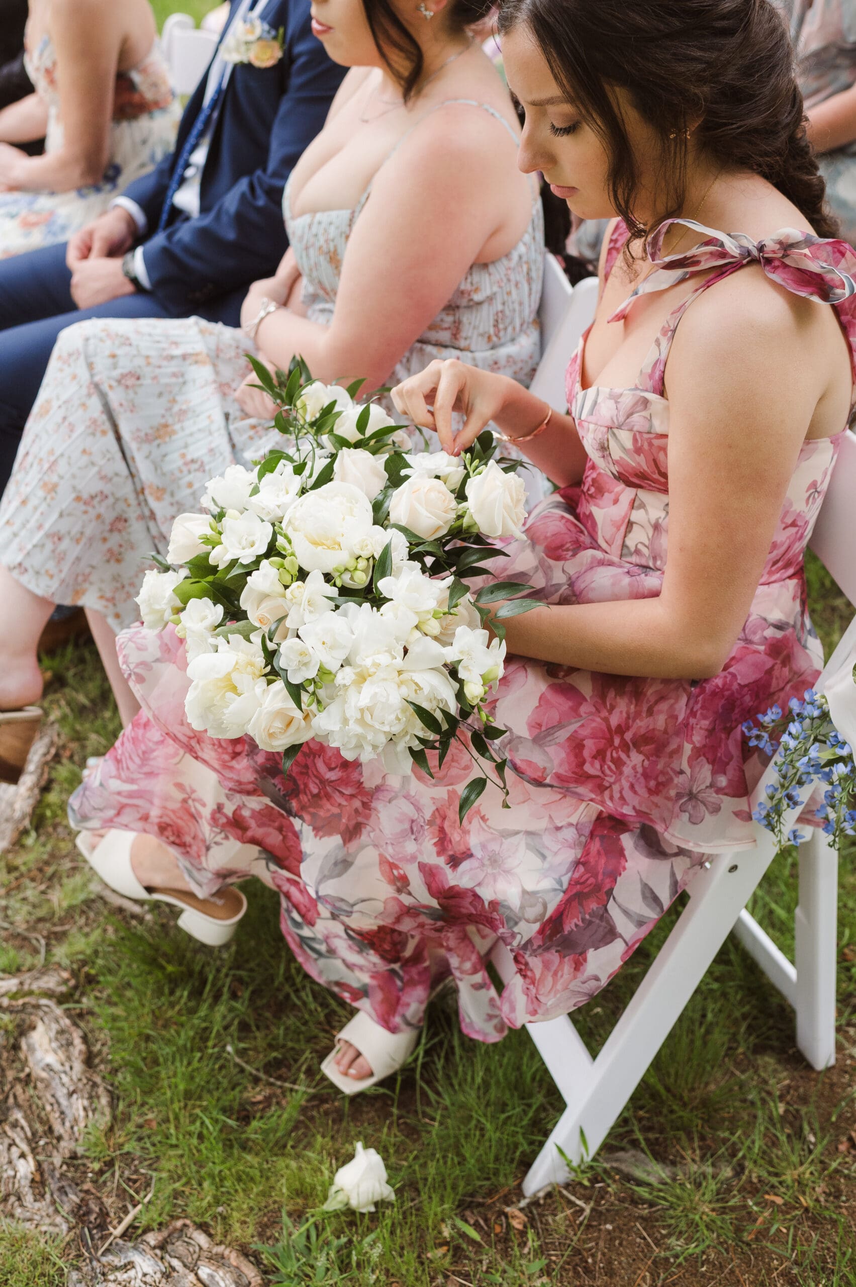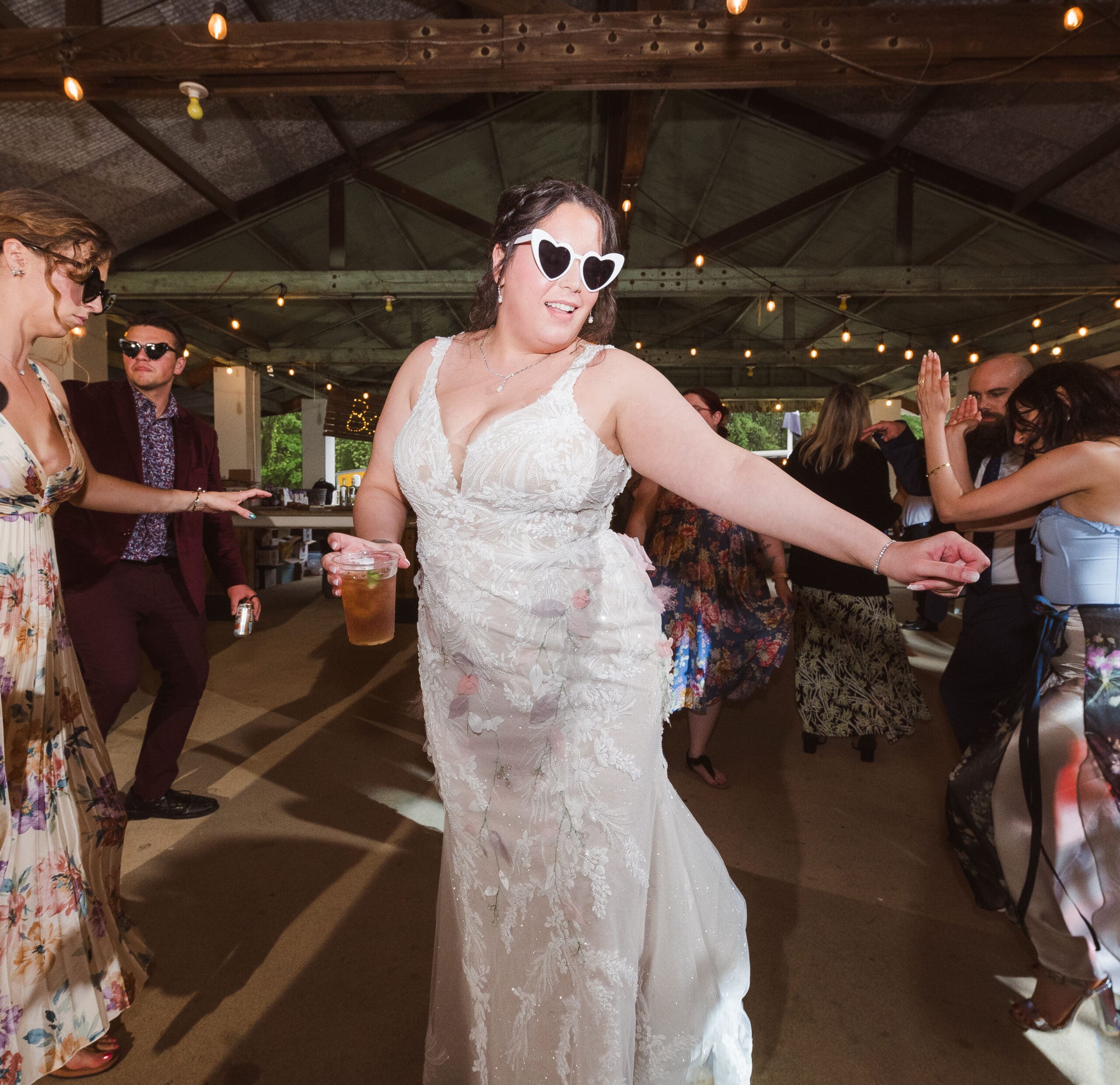 It rained on a late spring day in May, and it was good luck on their wedding day. We started the wedding getting ready at a rental home about a 10-minute drive near Pat’s 30-acre venue. The couple hired their favorite Asbury, NJ restaurant, Crdnl, to cater the wedding. Most of the wedding decor was DIY by one of the bride’s seven sisters. Speaking of seven sisters, the bride had each wear a floral dress without restrictions! Seeing them express each style and go with the garden wedding theme was cute. The wedding was magical, despite the rain. I believe the rain added a touch of romance. The couple prepared with clear umbrellas, and guests came equipped with their own, too, or they found some to borrow for the ceremony under the large trees. Because the ceremony occurred outdoors and on grass, I highly recommend that the females wear chunky heels to protect their pretty shoes from sinking into the mud. At Pat’s 30 acres, I would say it’s a pretty casual vibe. Instead of using the picnic tables provided by the venue, the couple opted to rent out different wood tables, chairs, and mix-match china for their wedding. It certainly elevated the venue by doing this! One of the best parts of my job as a wedding photographer is capturing dance floor action – the DJ entertainment company, Elite Entertainment, kept the dance floor alive all night. By the night’s end, I noticed how perfect the bride still looked – her hair and makeup stylists did a great job making sure her style held up despite the rain, sweat, tears, and jumping around on the dance floor – she remained beautiful through it all!