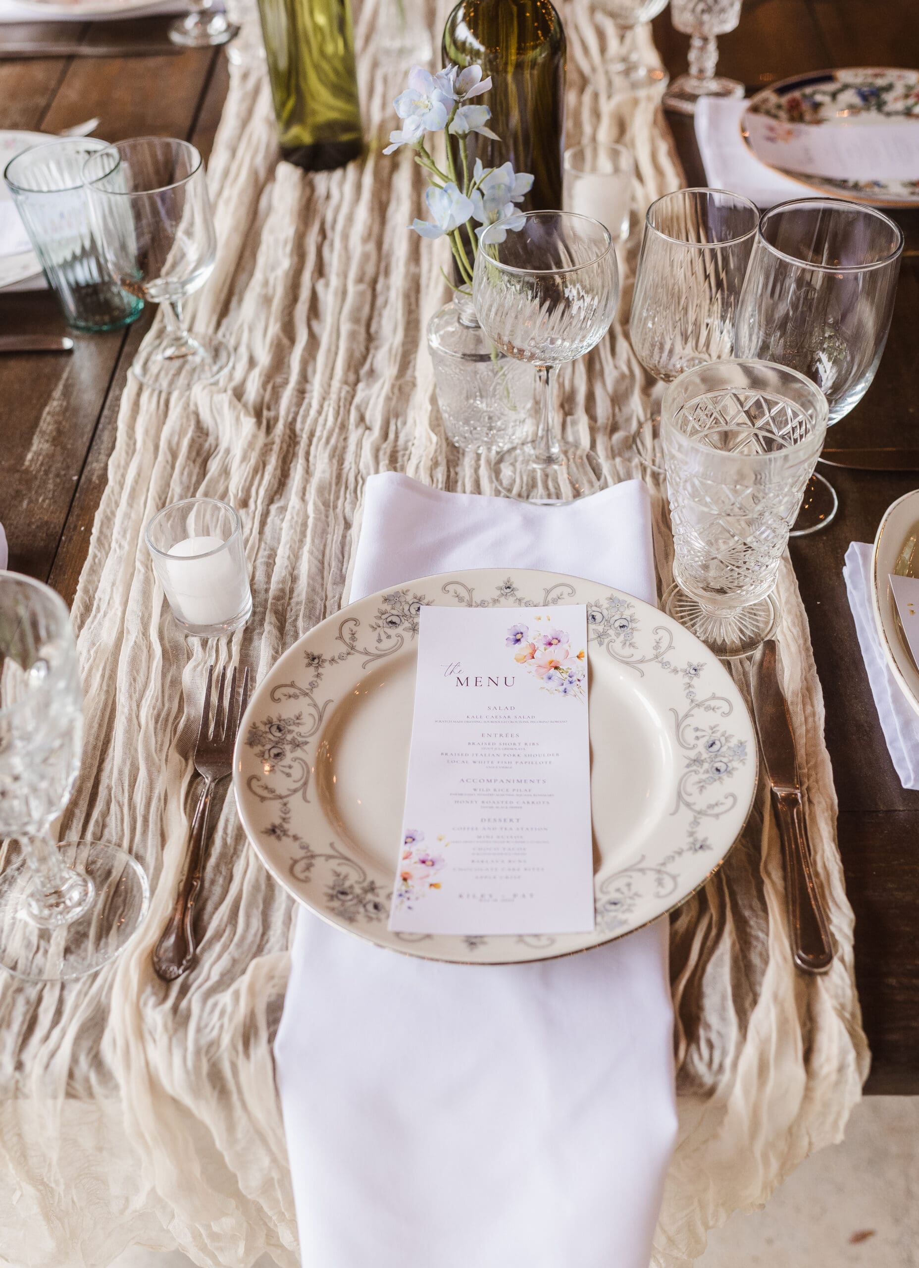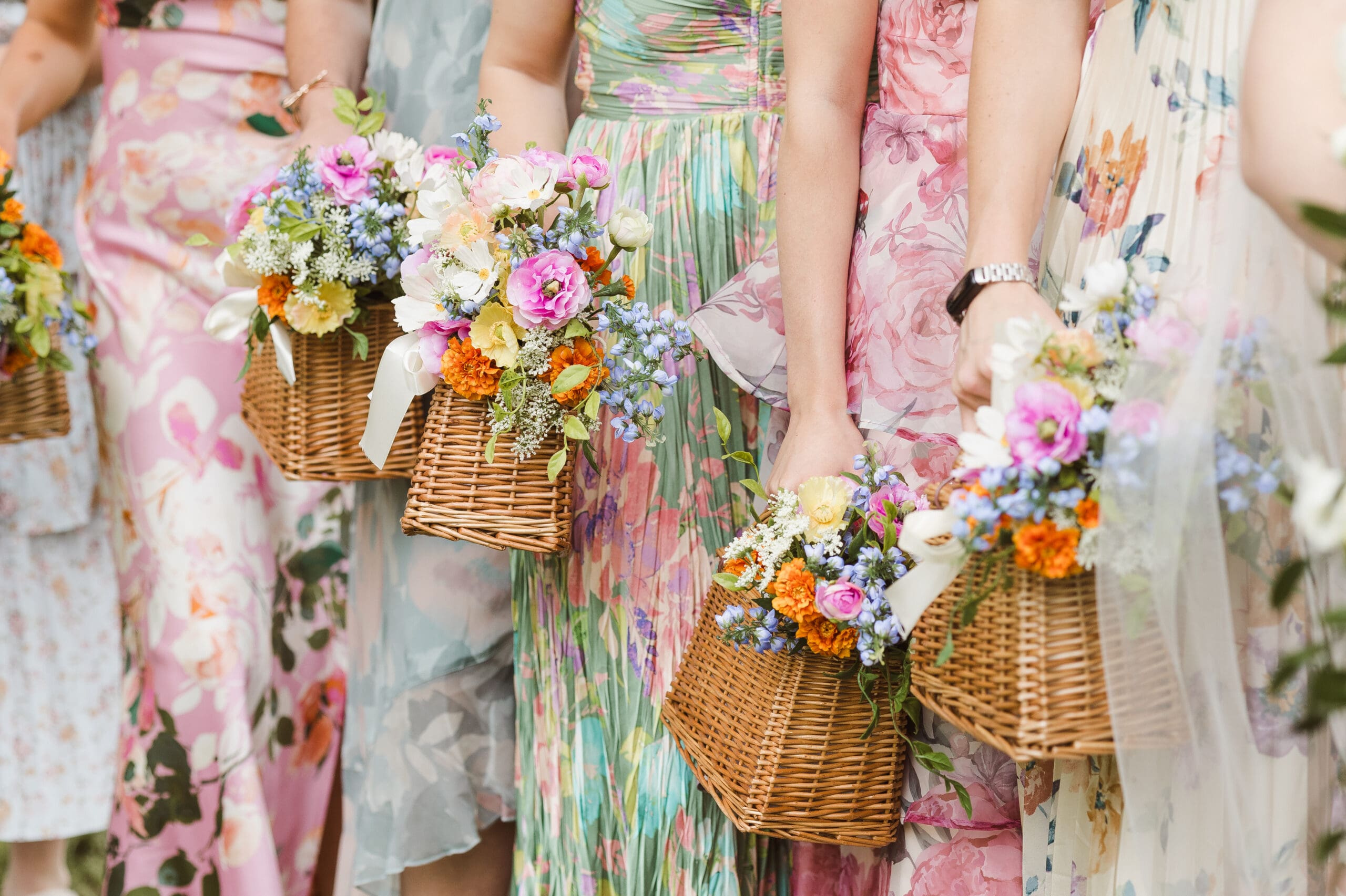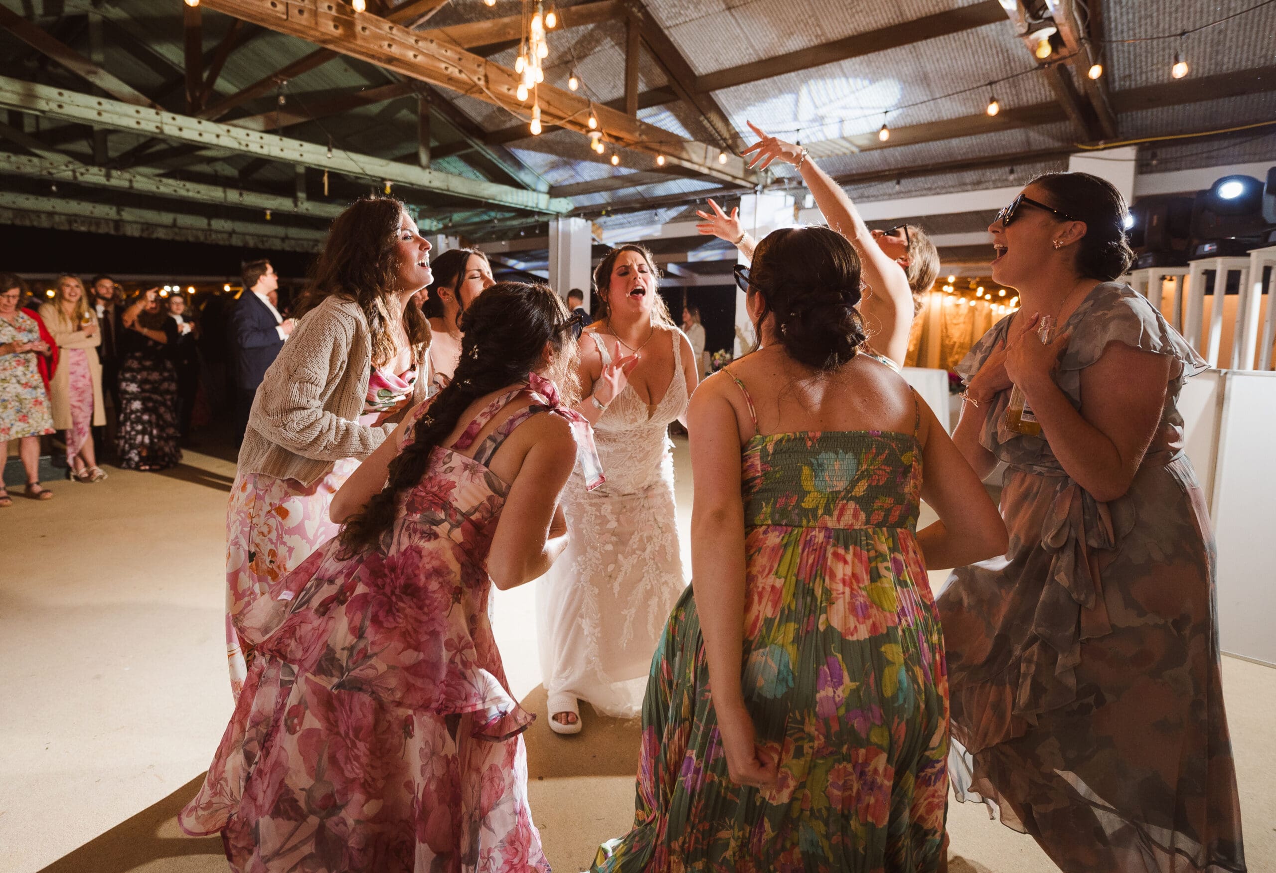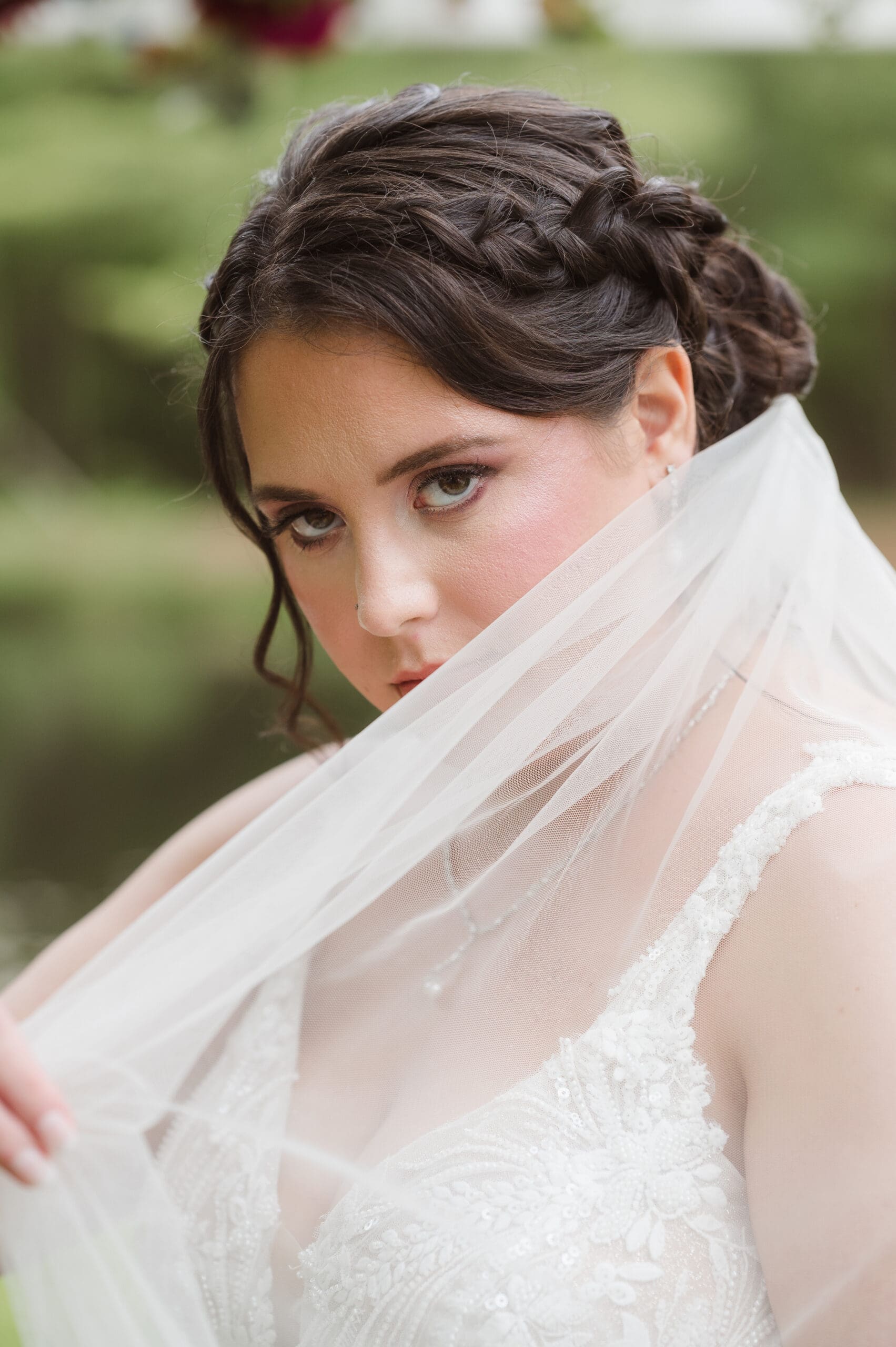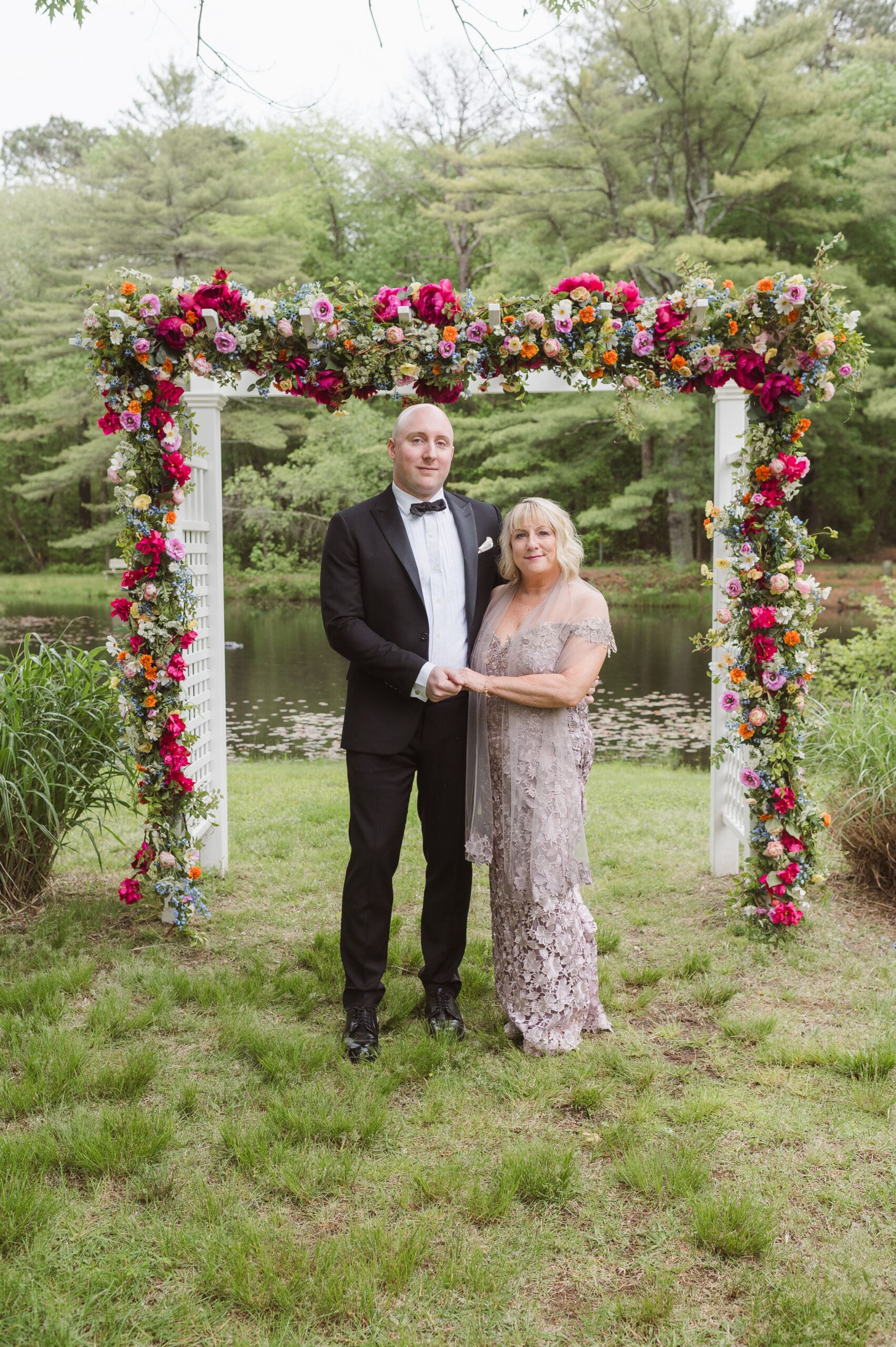 It rained on a late spring day in May, and it was good luck on their wedding day. We started the wedding getting ready at a rental home about a 10-minute drive near Pat’s 30-acre venue. The couple hired their favorite Asbury, NJ restaurant, Crdnl, to cater the wedding. Most of the wedding decor was DIY by one of the bride’s seven sisters. Speaking of seven sisters, the bride had each wear a floral dress without restrictions! Seeing them express each style and go with the garden wedding theme was cute. The wedding was magical, despite the rain. I believe the rain added a touch of romance. The couple prepared with clear umbrellas, and guests came equipped with their own, too, or they found some to borrow for the ceremony under the large trees. Because the ceremony occurred outdoors and on grass, I highly recommend that the females wear chunky heels to protect their pretty shoes from sinking into the mud. At Pat’s 30 acres, I would say it’s a pretty casual vibe. Instead of using the picnic tables provided by the venue, the couple opted to rent out different wood tables, chairs, and mix-match china for their wedding. It certainly elevated the venue by doing this! One of the best parts of my job as a wedding photographer is capturing dance floor action – the DJ entertainment company, Elite Entertainment, kept the dance floor alive all night. By the night’s end, I noticed how perfect the bride still looked – her hair and makeup stylists did a great job making sure her style held up despite the rain, sweat, tears, and jumping around on the dance floor – she remained beautiful through it all!