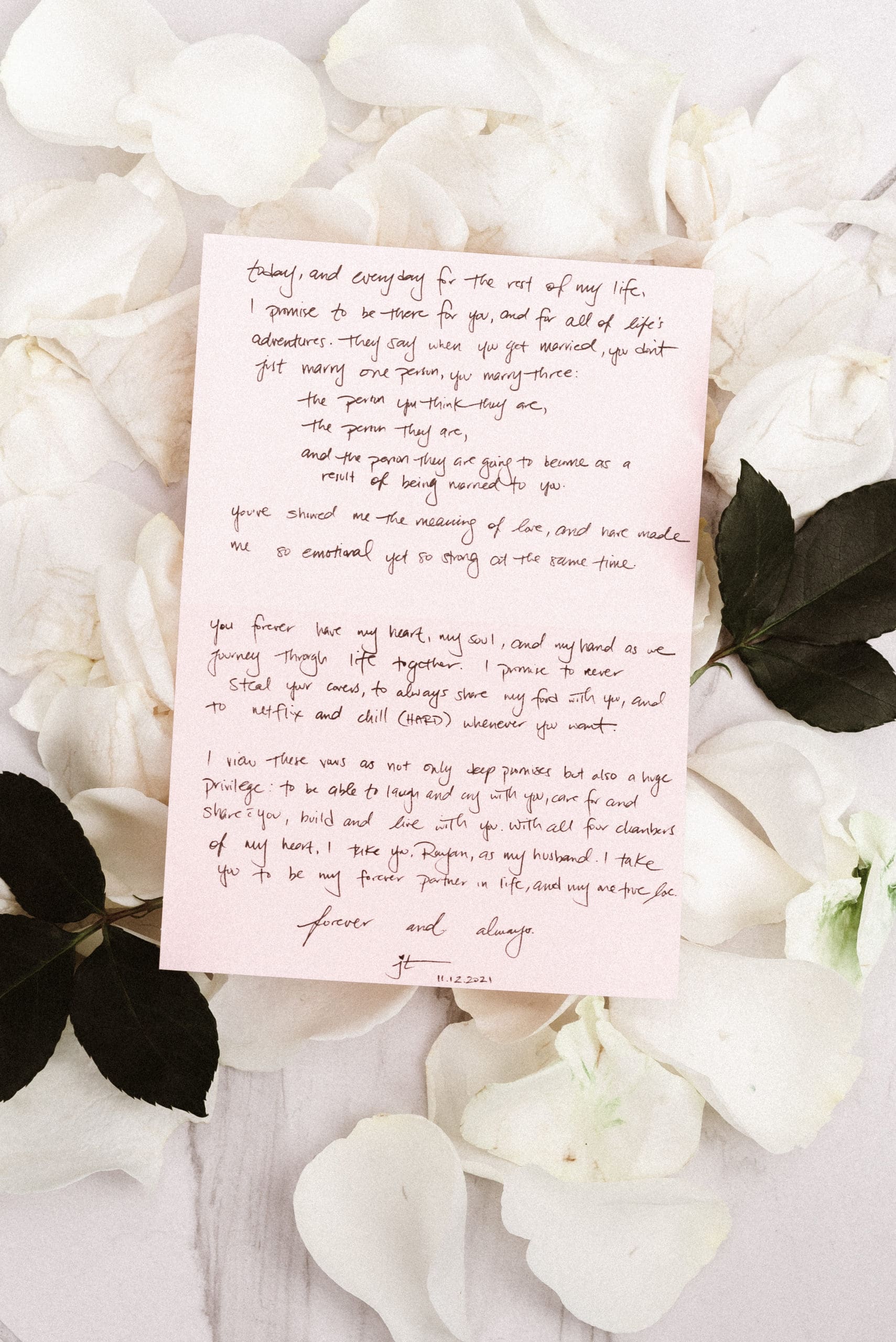 It’s not surprising to know that both photographers and videographers are guilty of not making this one a priority or forgetting to document vows/letters.Us photographers/videographers should prioritize documenting vows and letters inside and out. Vows/letters are usually paper copy so I think it’s so important that the are photographed. I good idea for photographers is to add the couple’s rings on the bottom of the vows/letter as part of the detail shots.