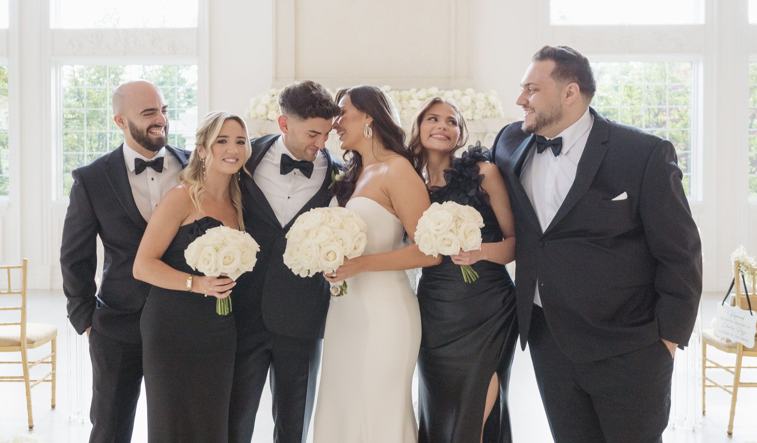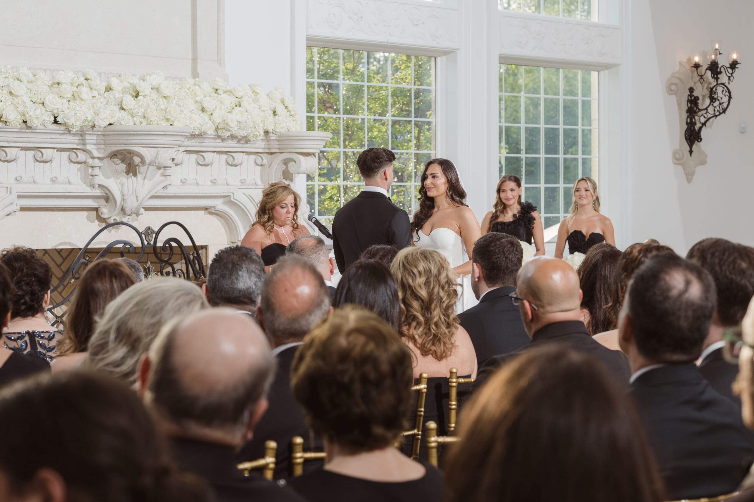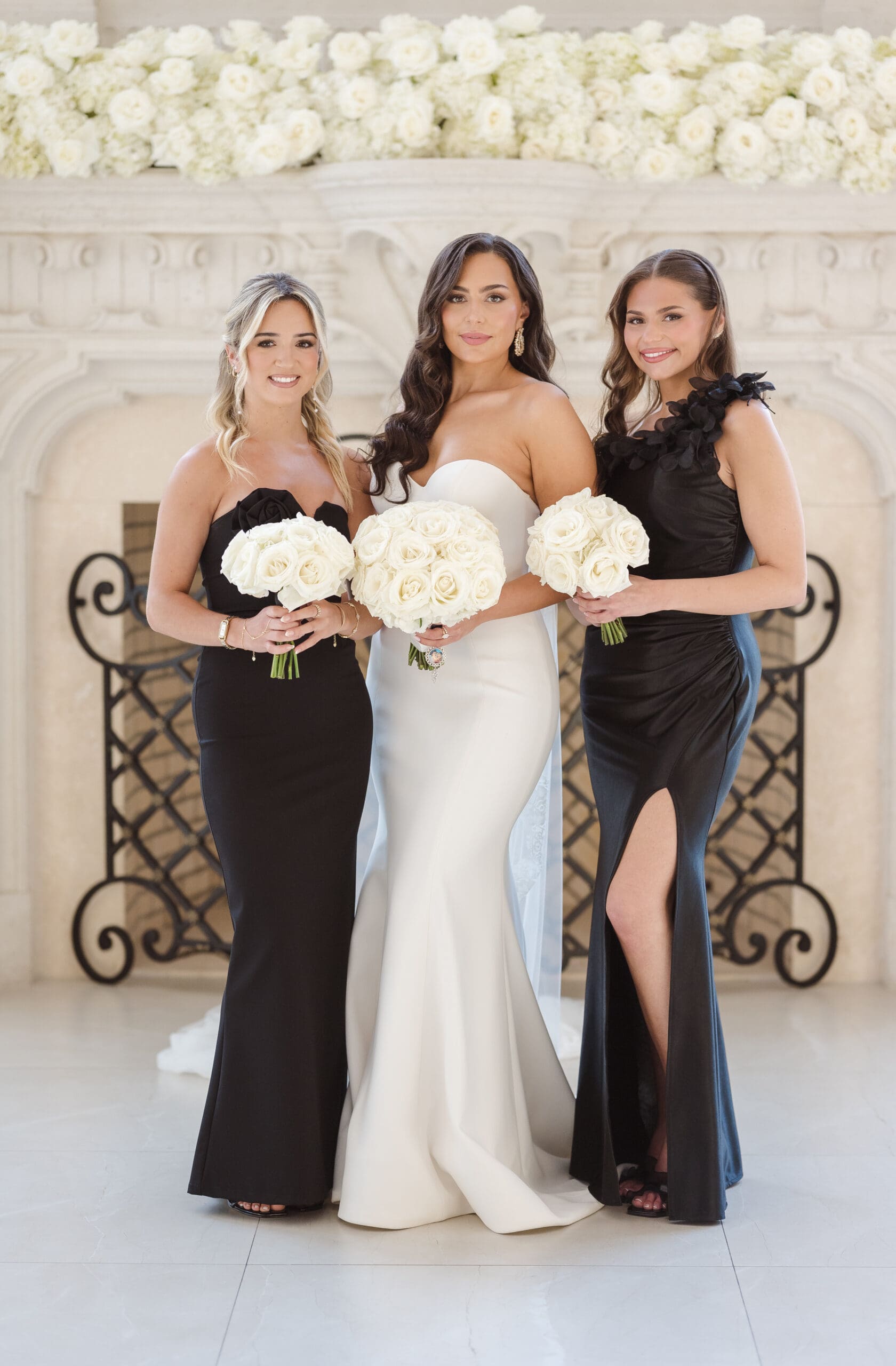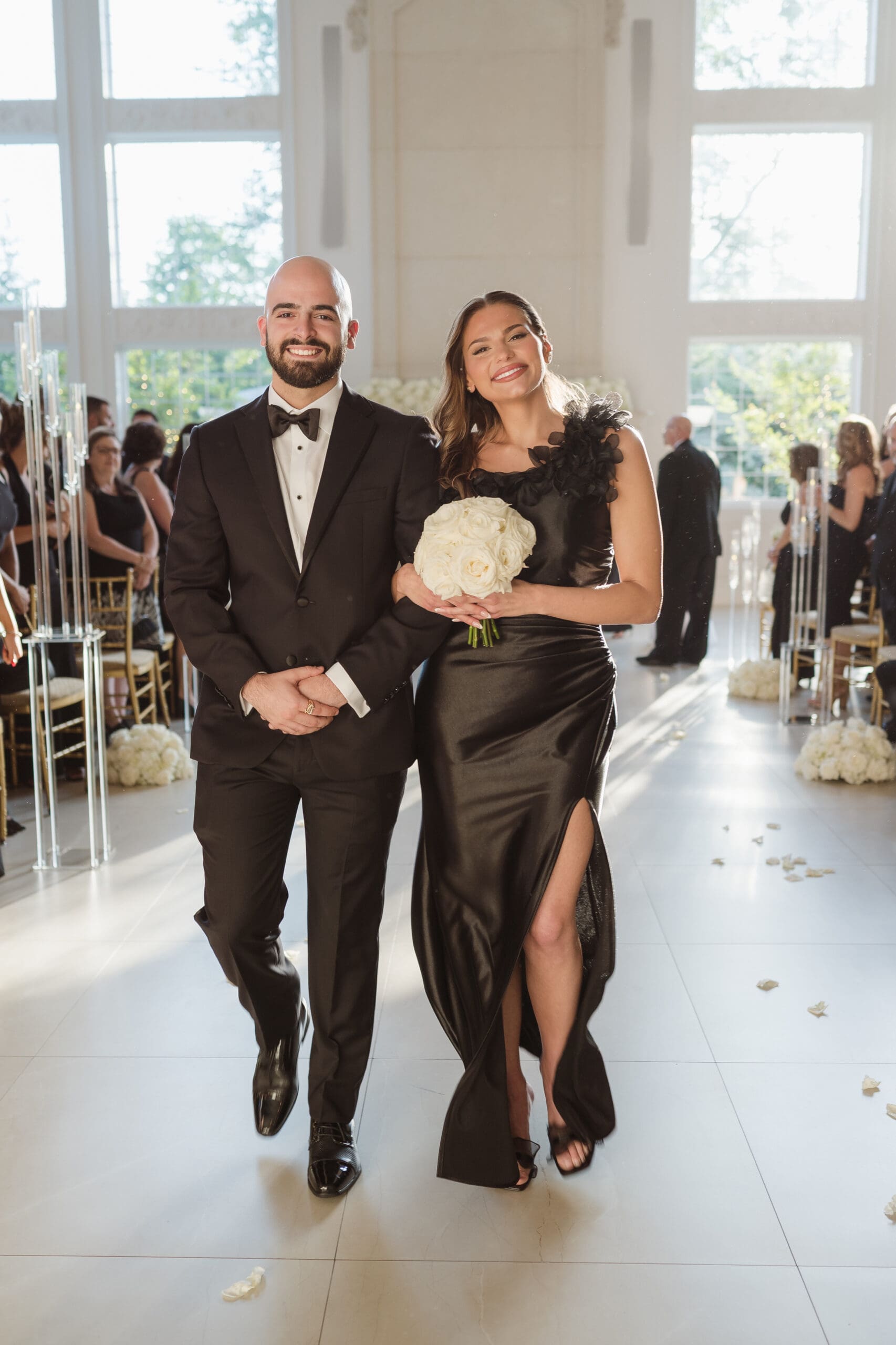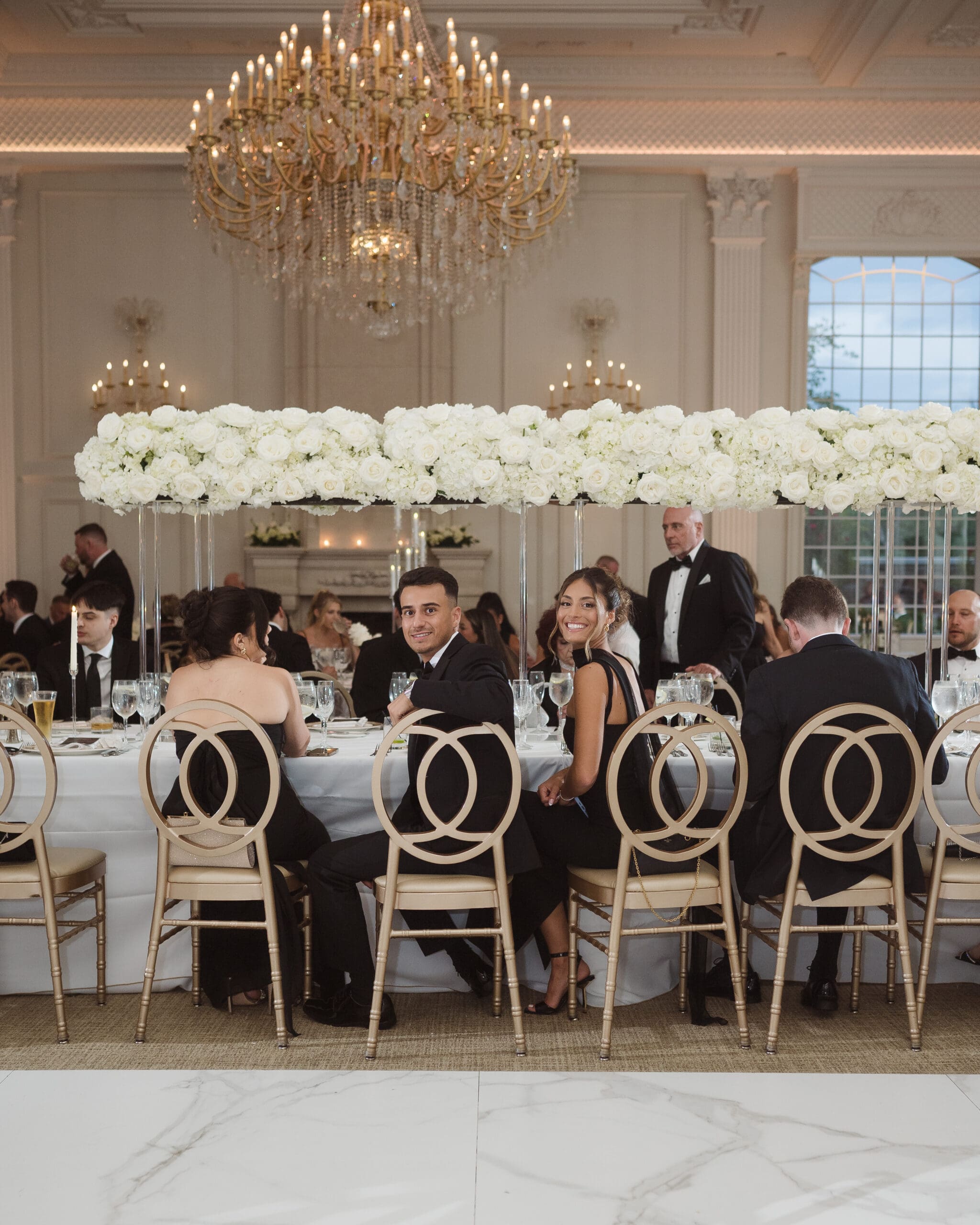 The couple requested a formal dress code in all black. The floral arrangements featured a mix of white and ivory, with minimal greenery.