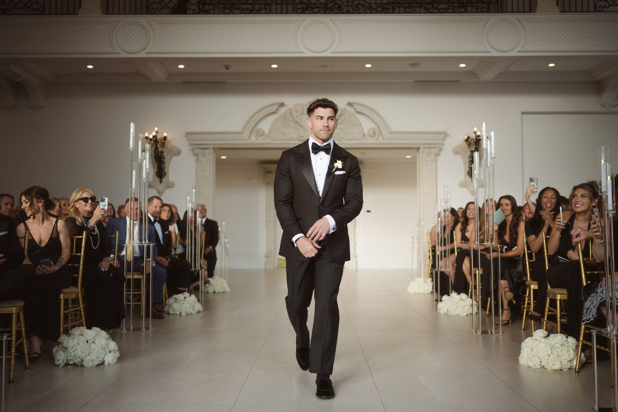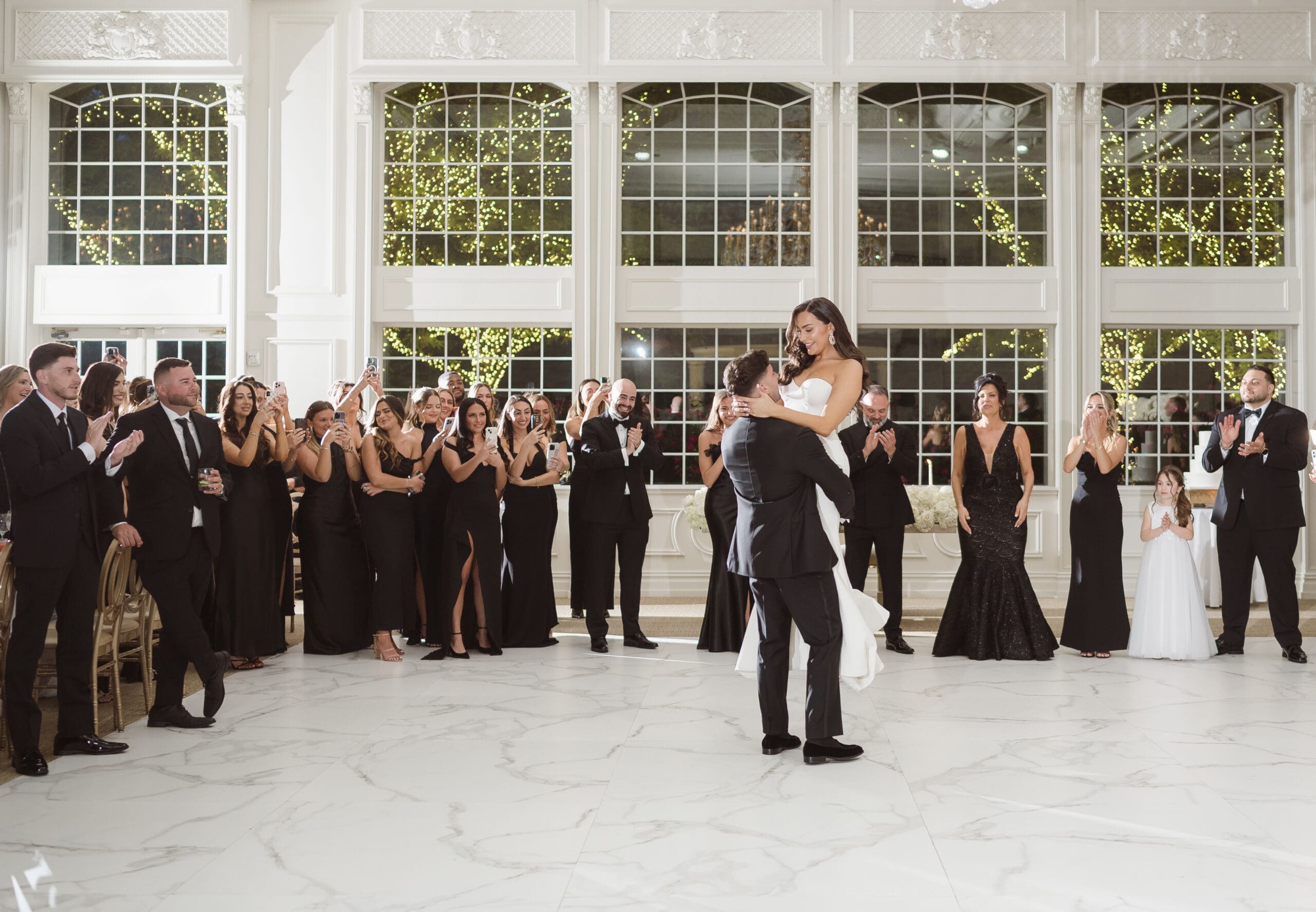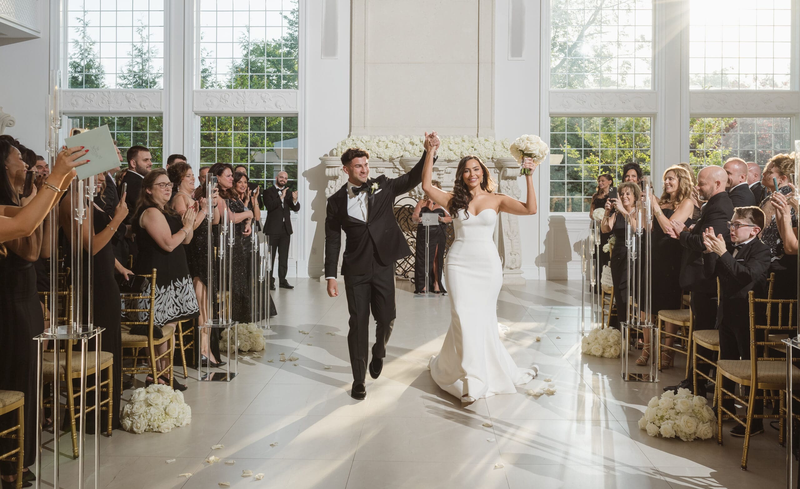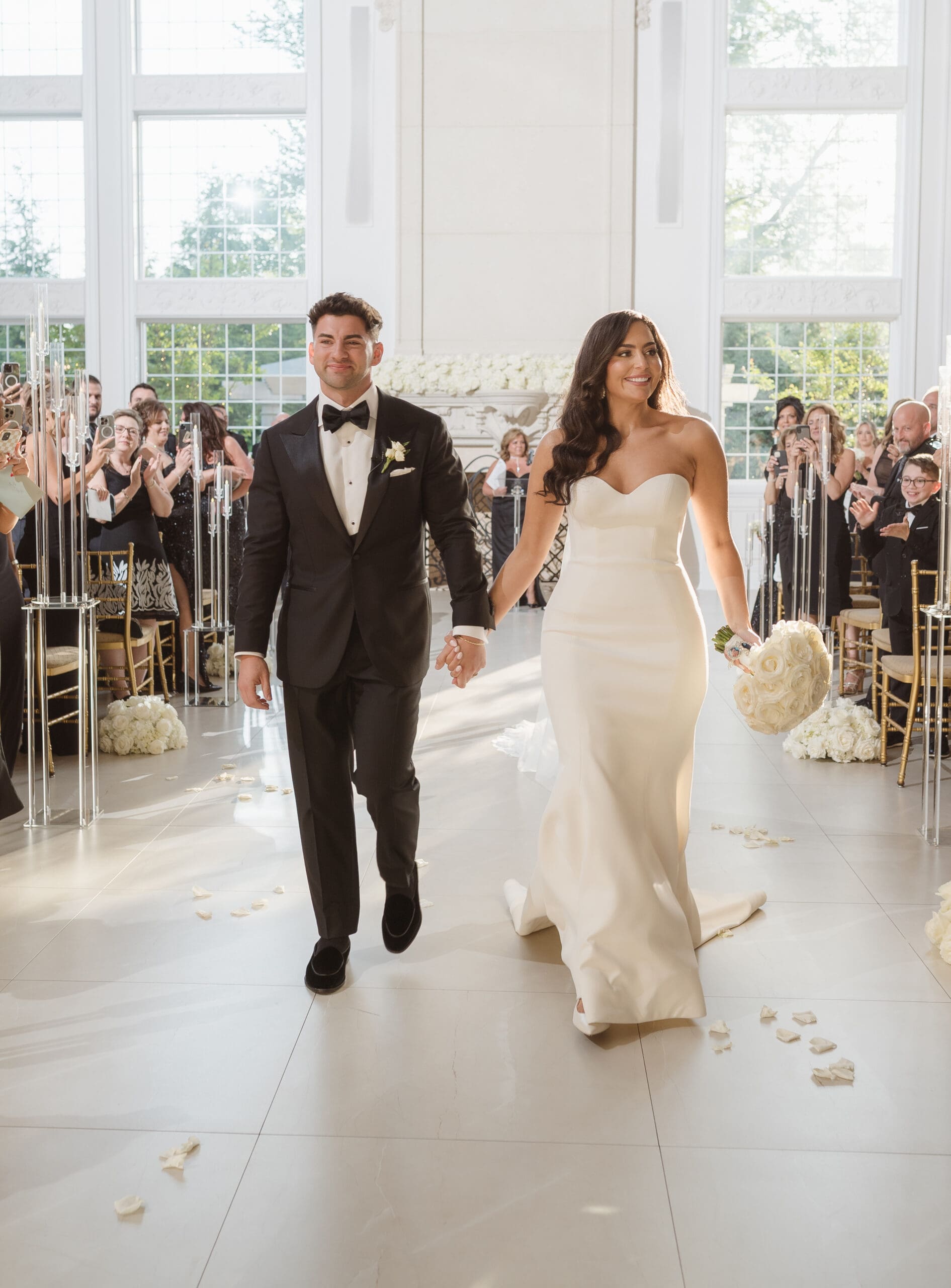 The couple requested a formal dress code in all black. The floral arrangements featured a mix of white and ivory, with minimal greenery.