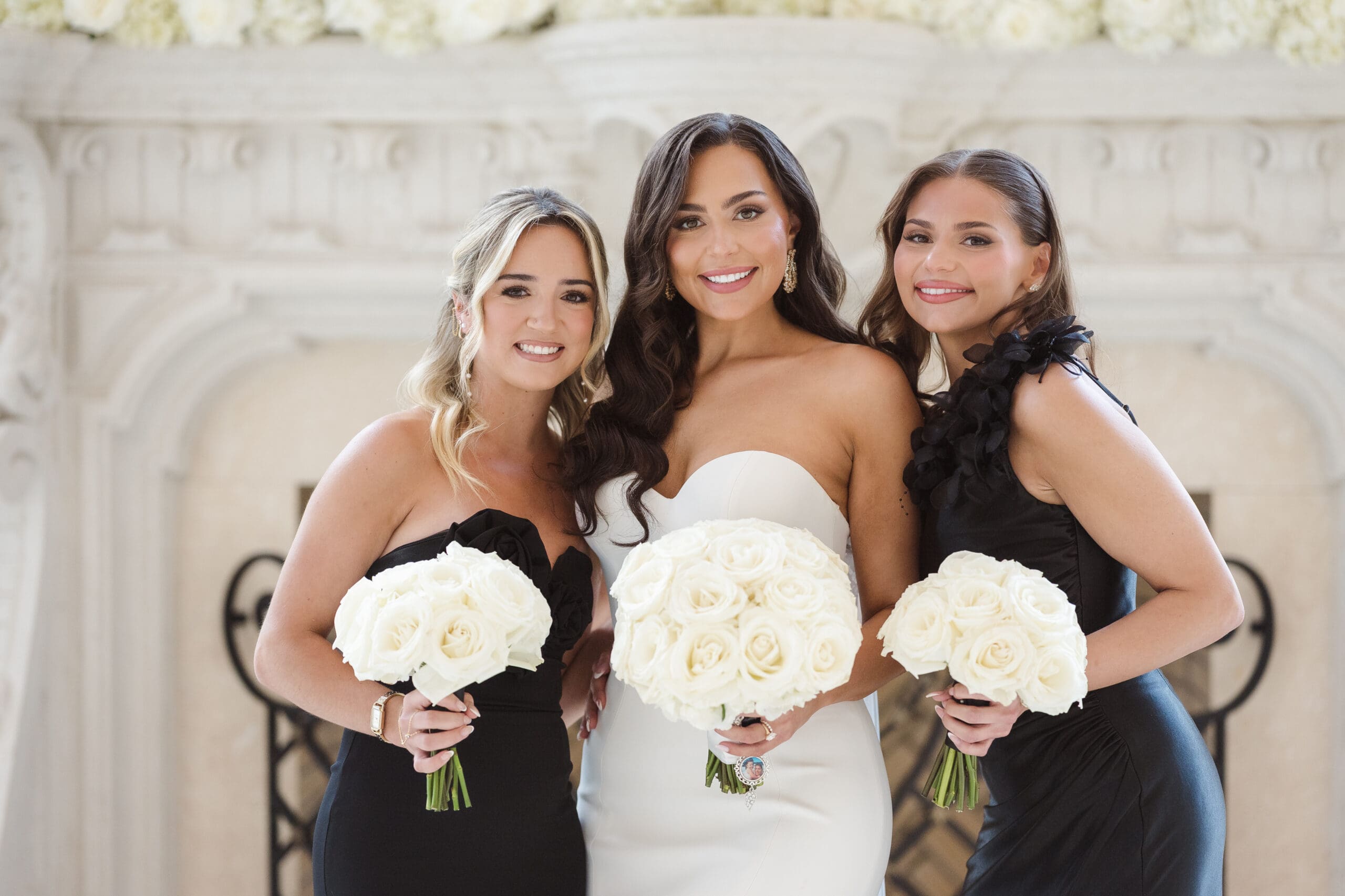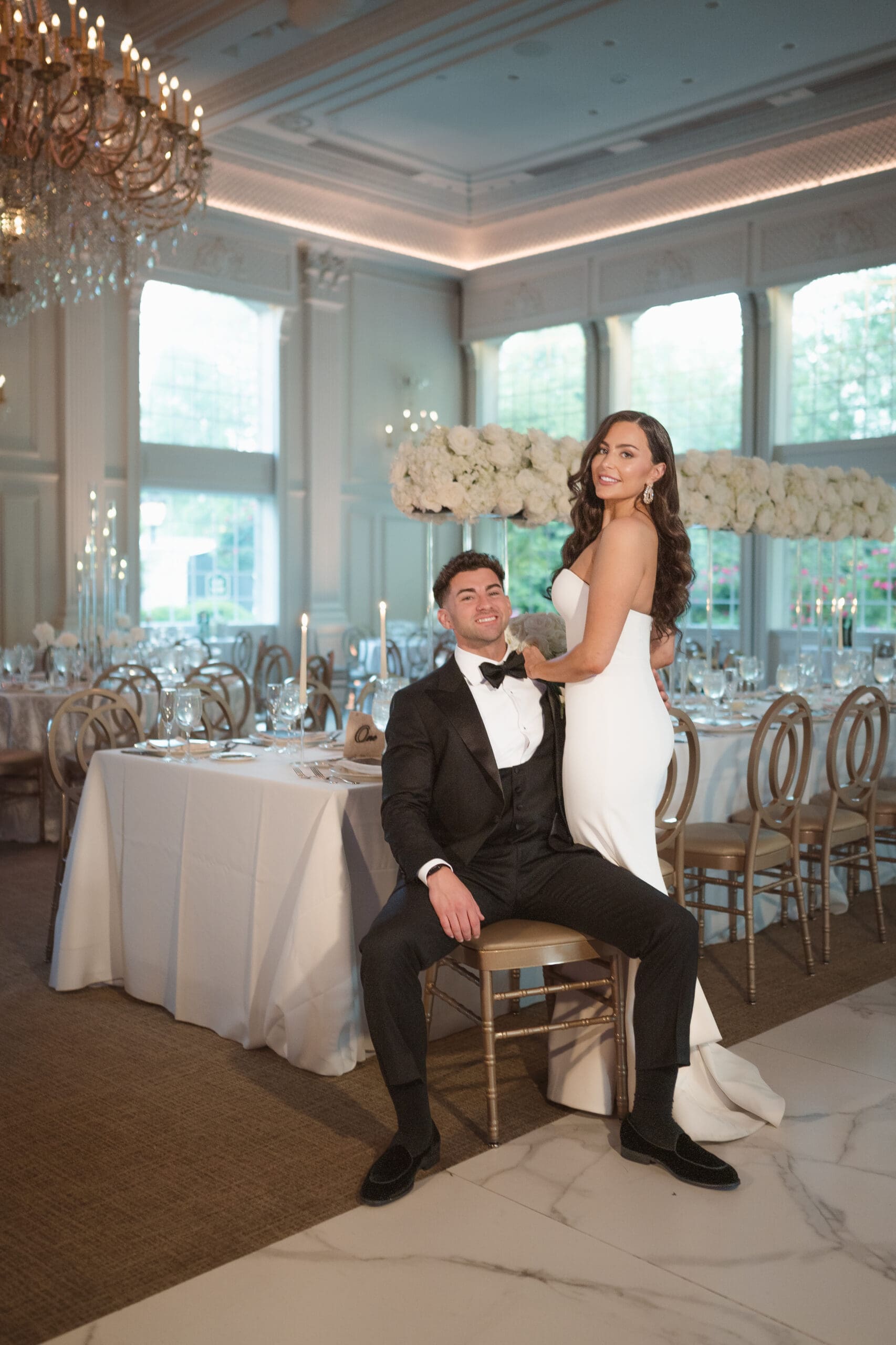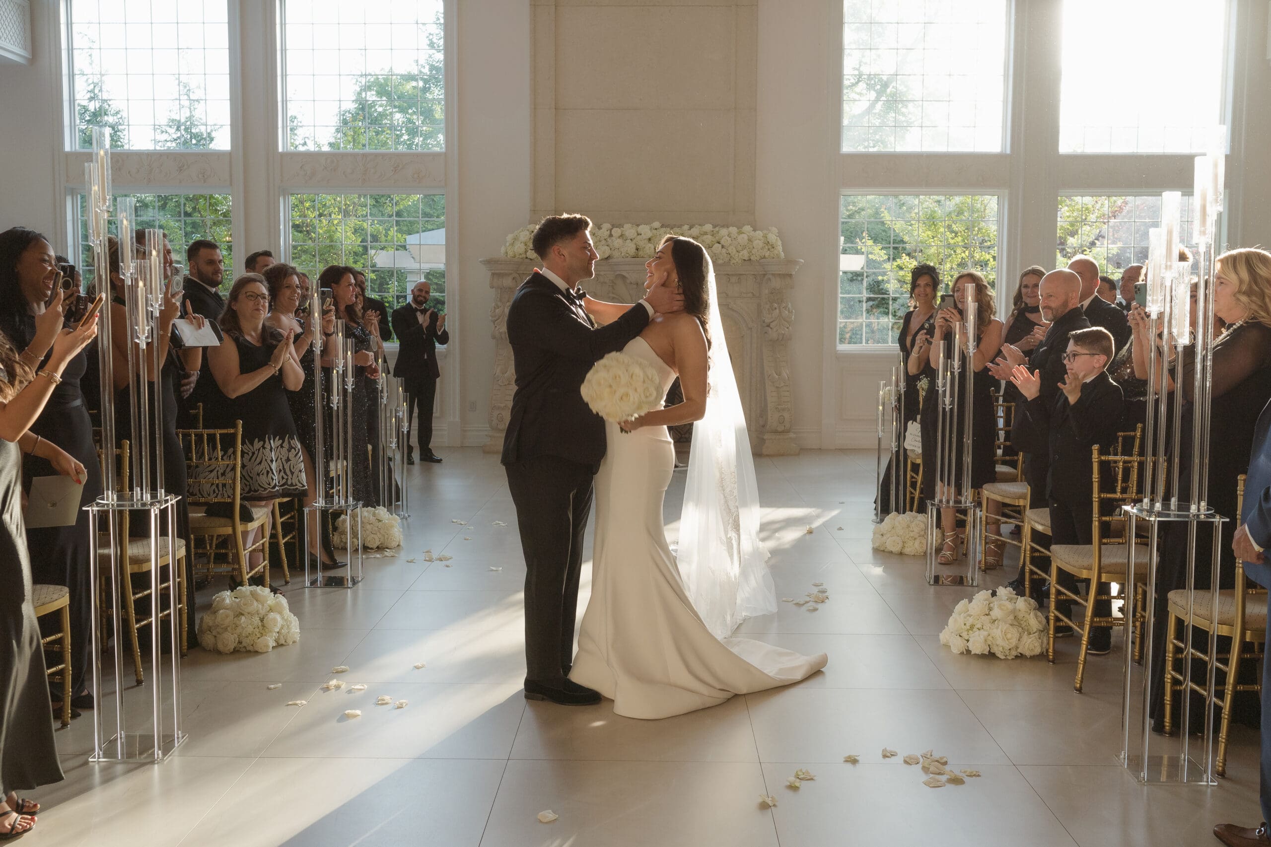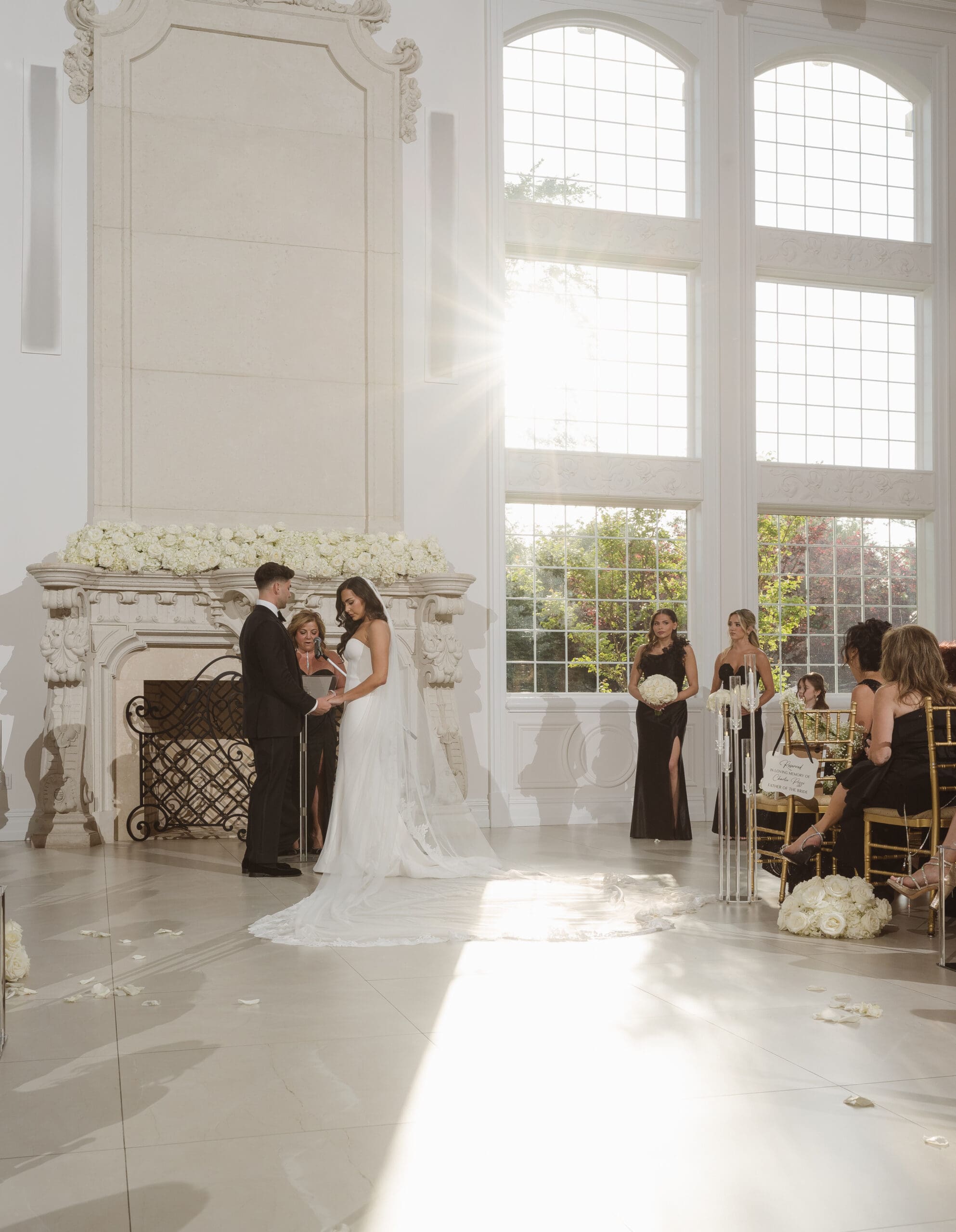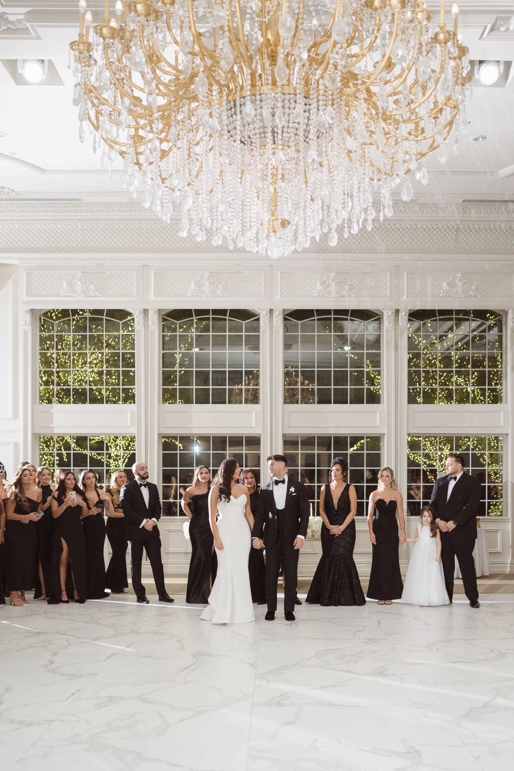 The couple requested a formal dress code in all black. The floral arrangements featured a mix of white and ivory, with minimal greenery.