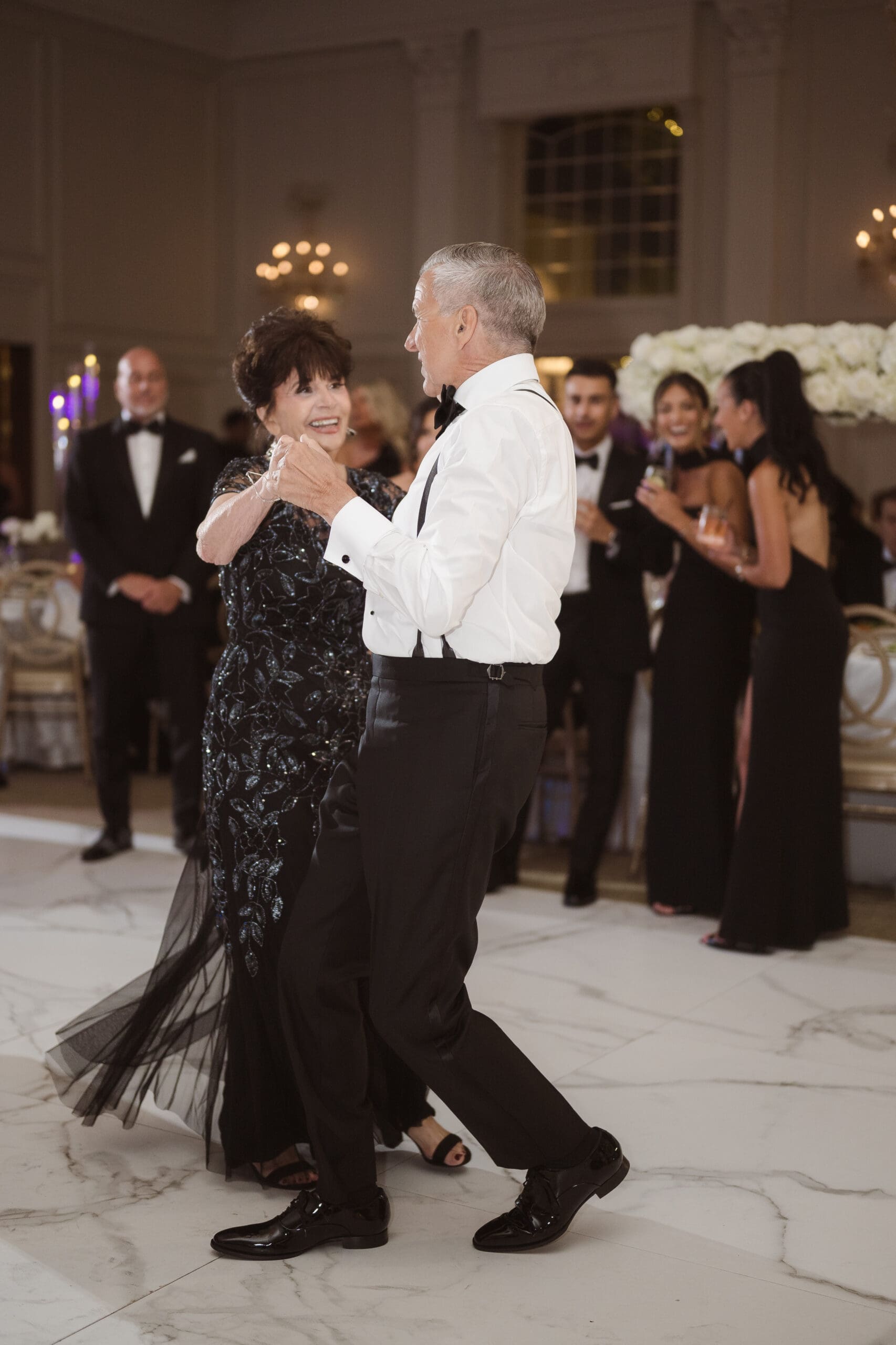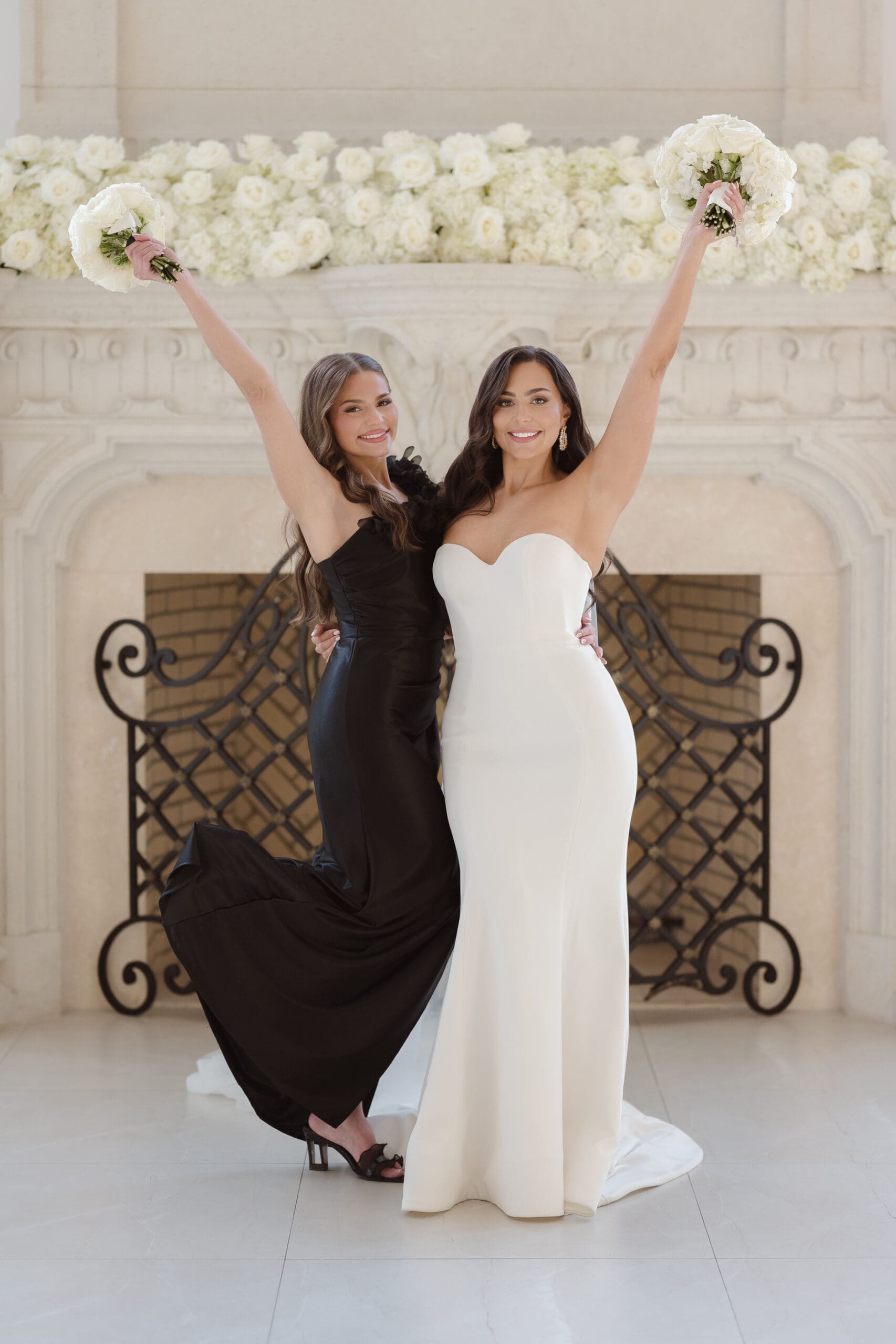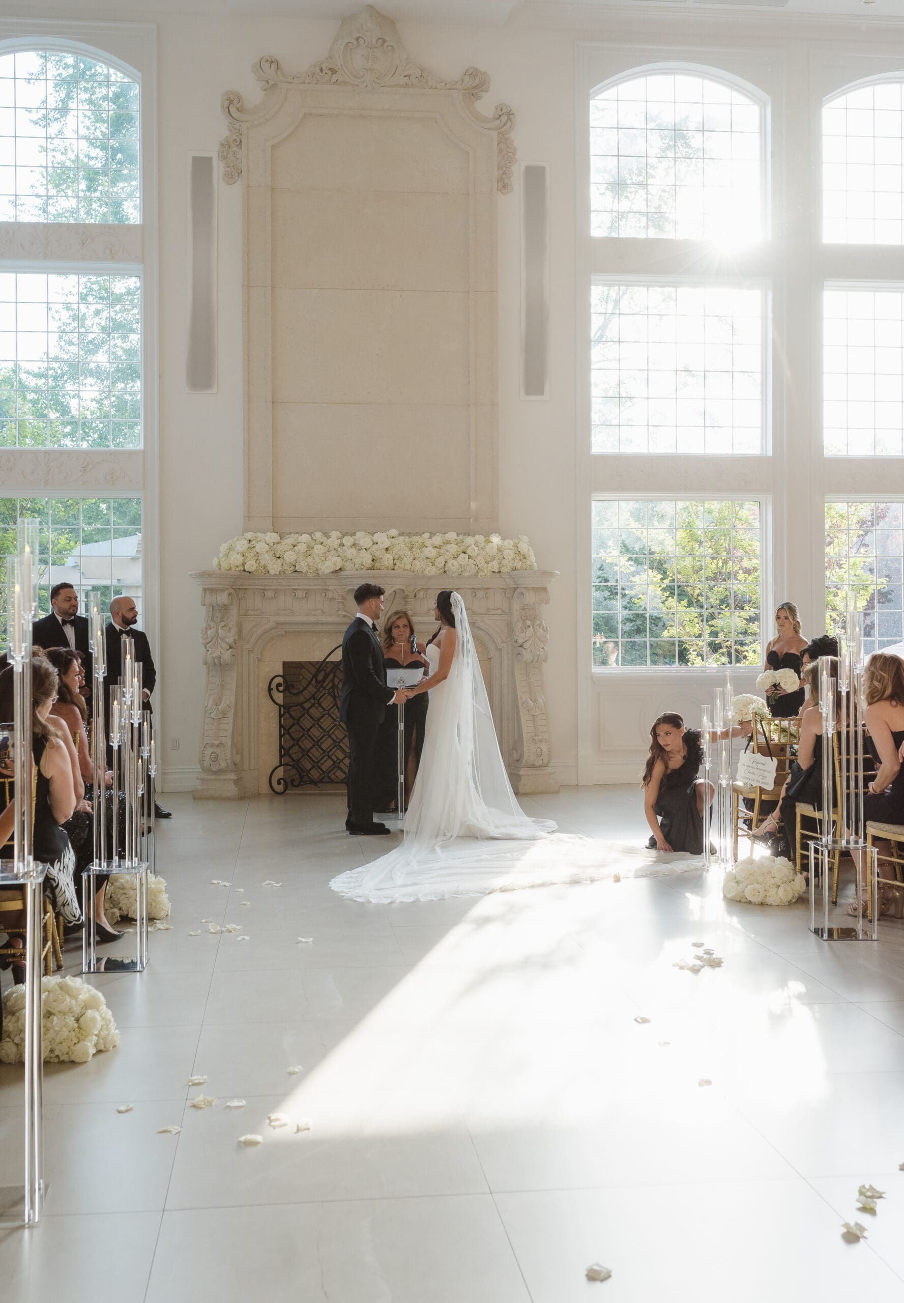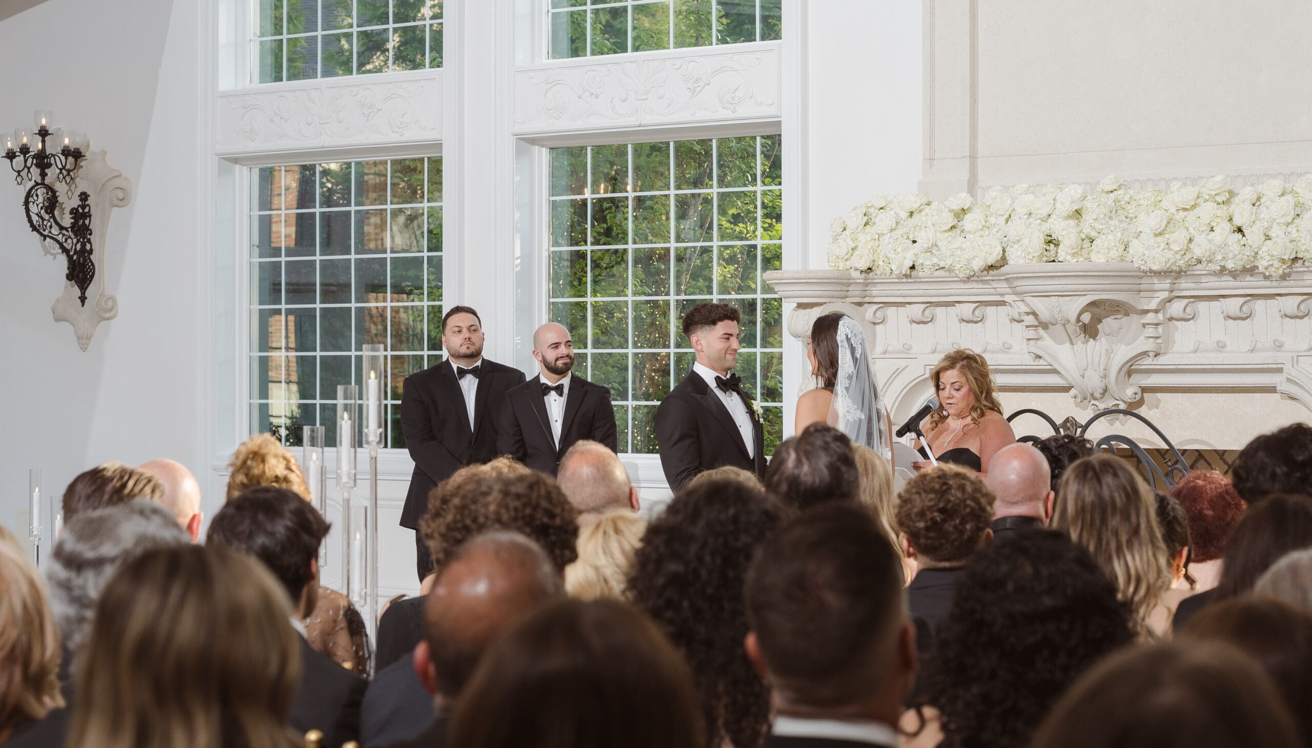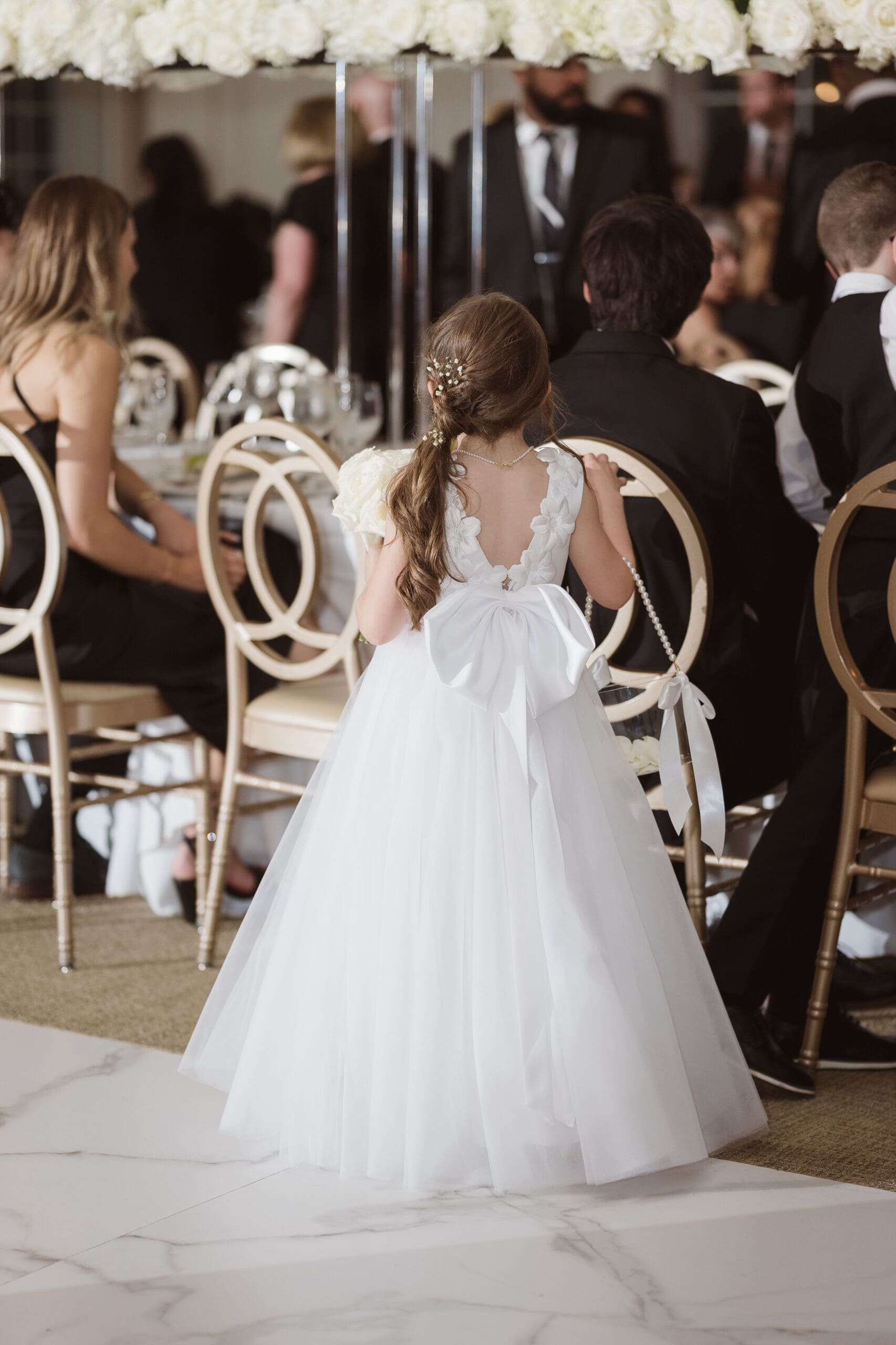 The couple requested a formal dress code in all black. The floral arrangements featured a mix of white and ivory, with minimal greenery.