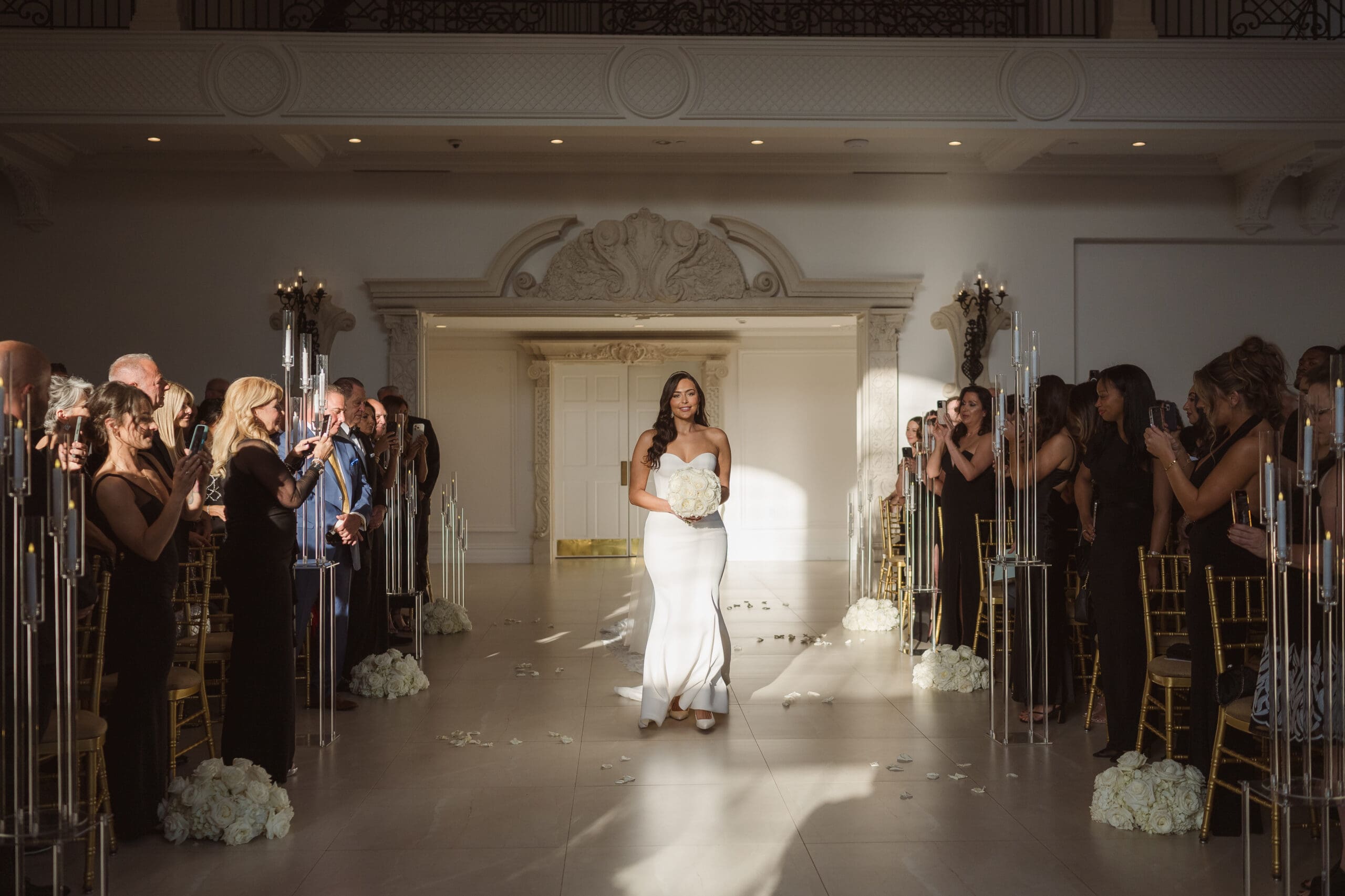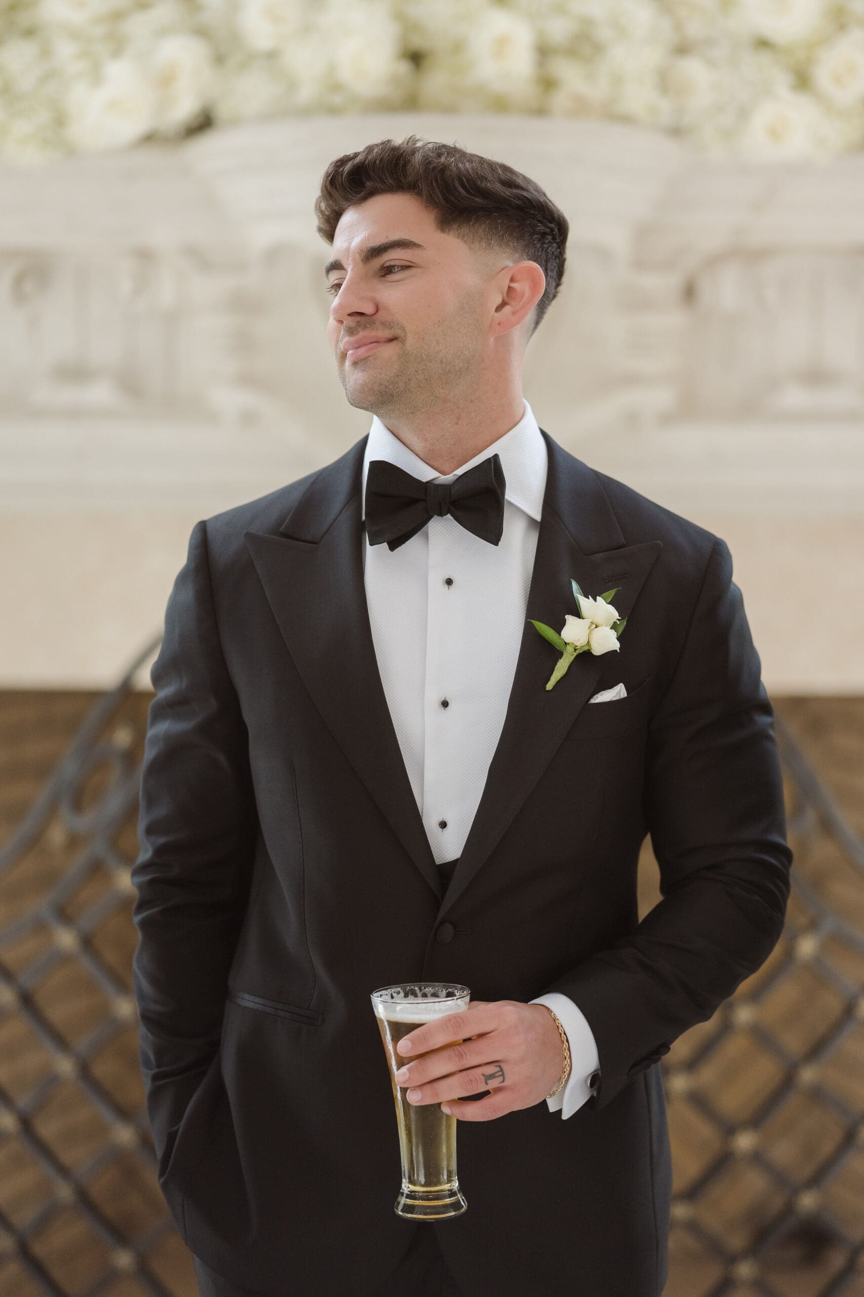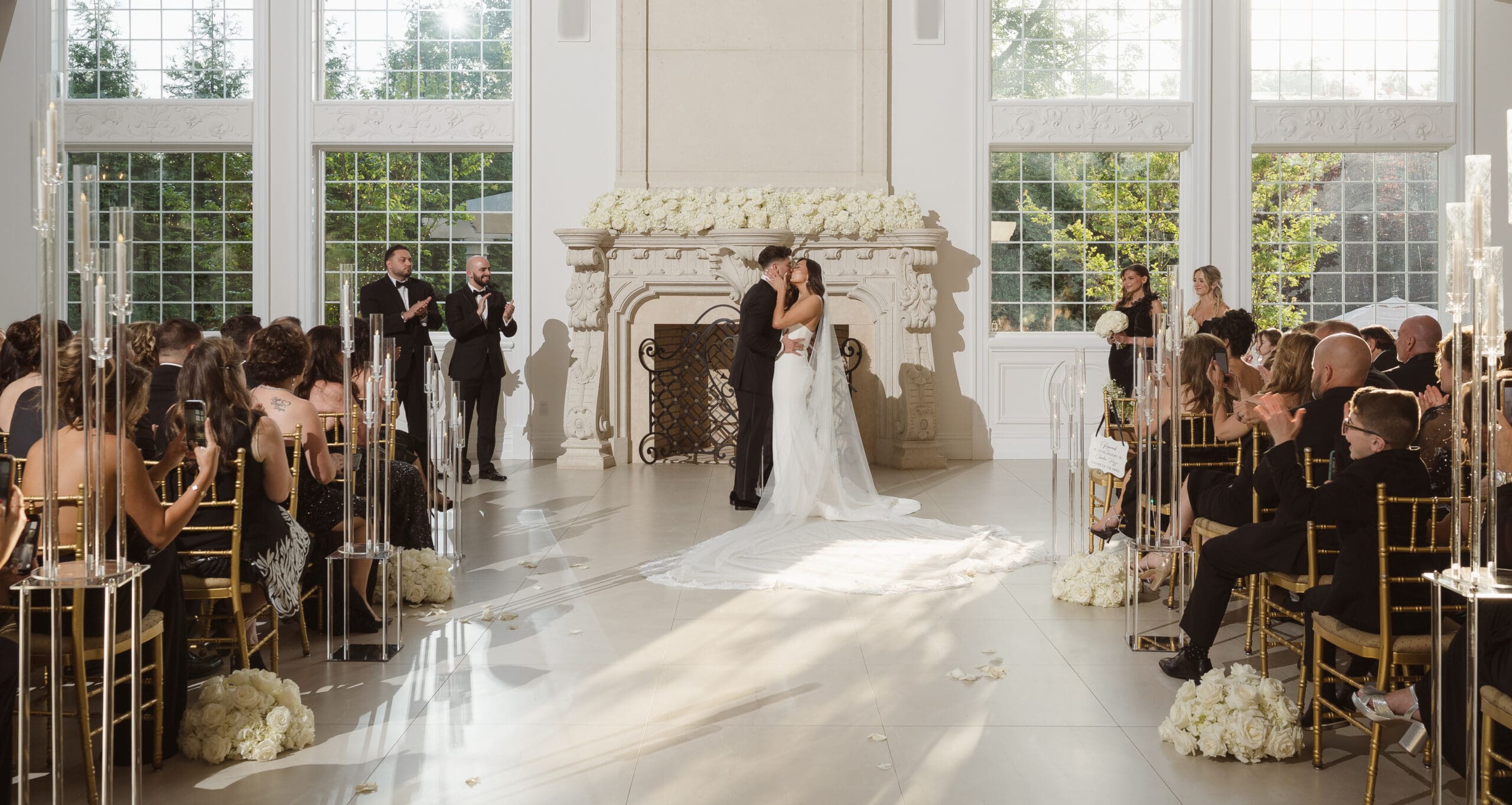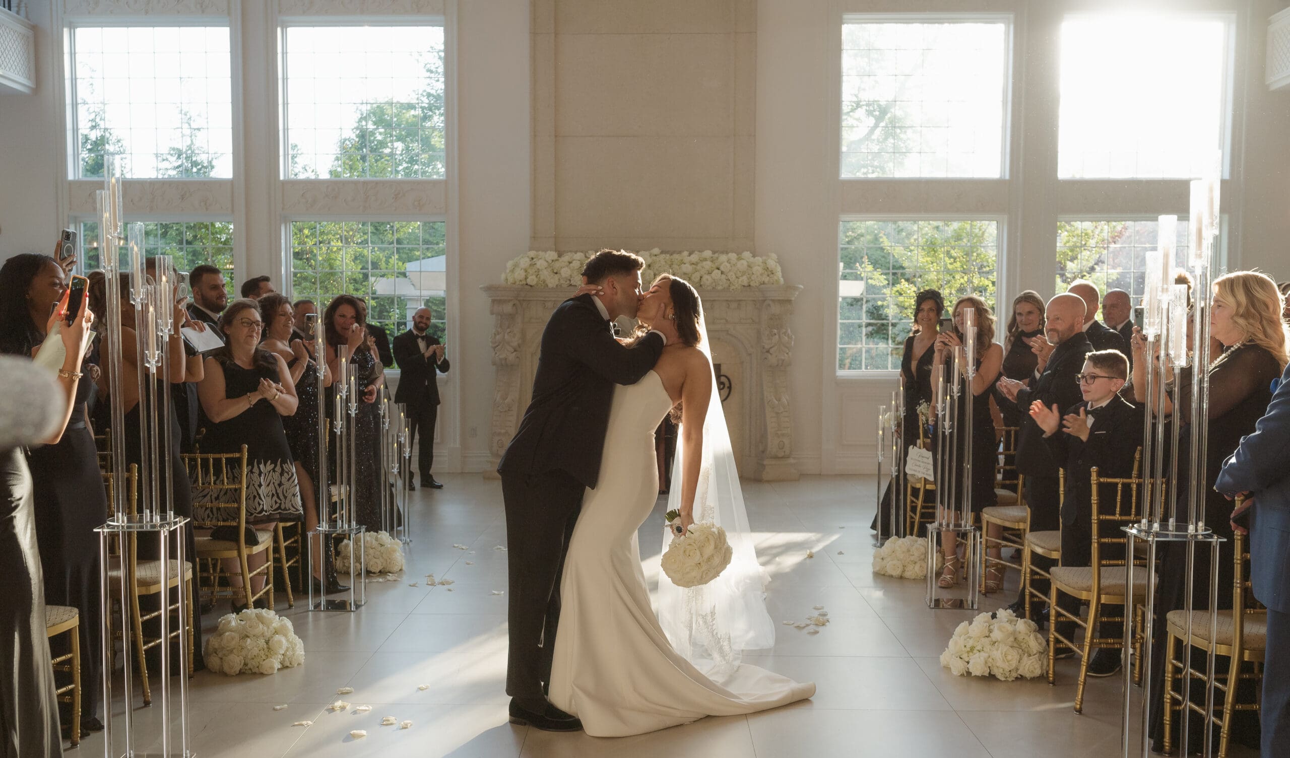 The couple requested a formal dress code in all black. The floral arrangements featured a mix of white and ivory, with minimal greenery.