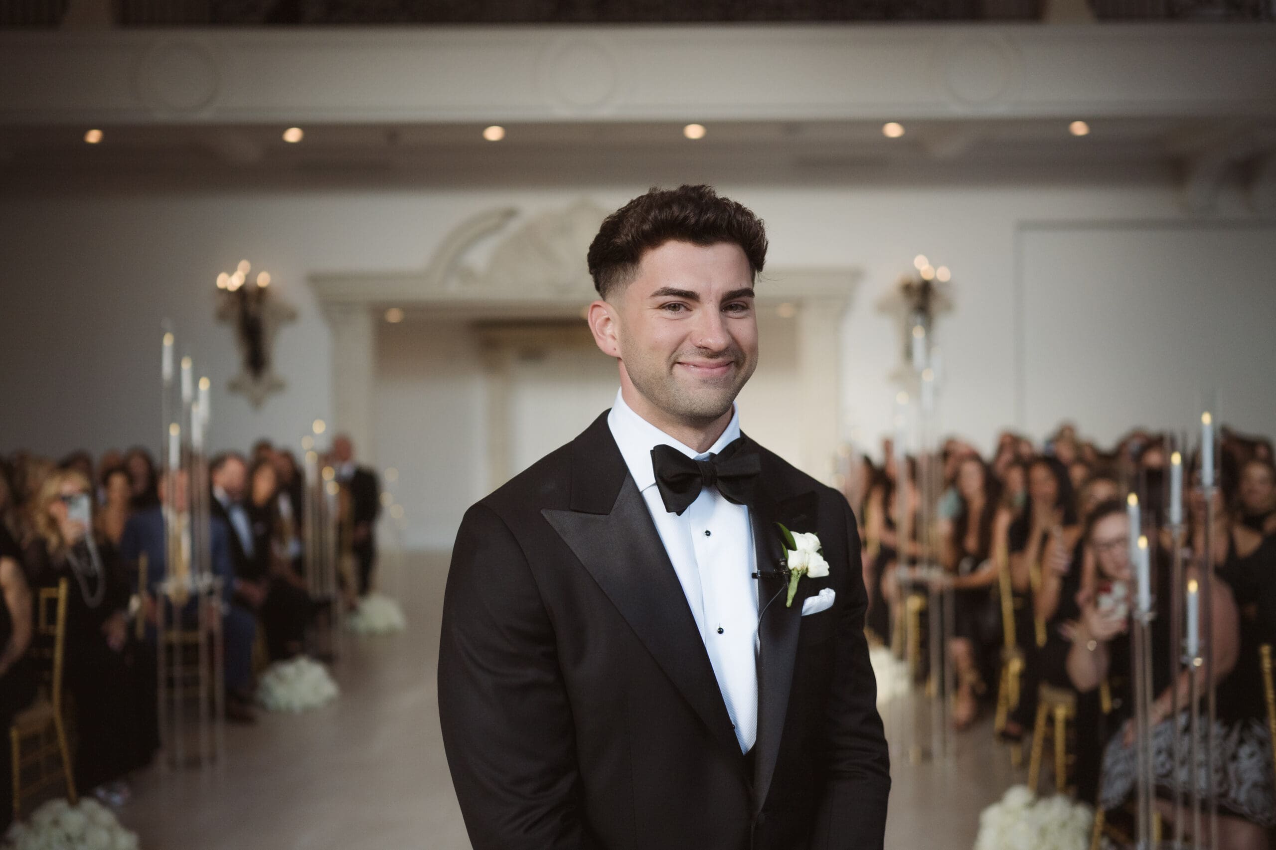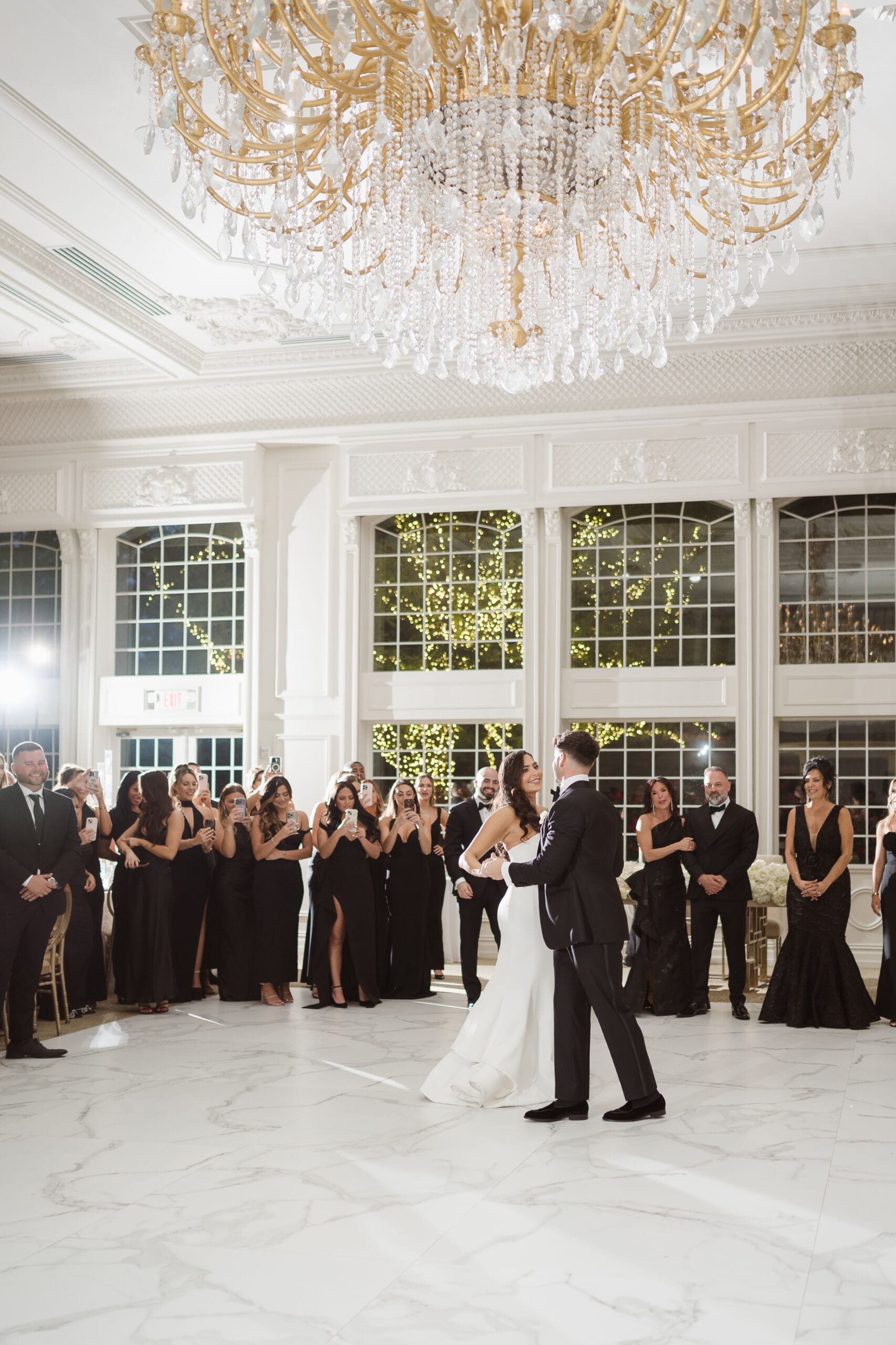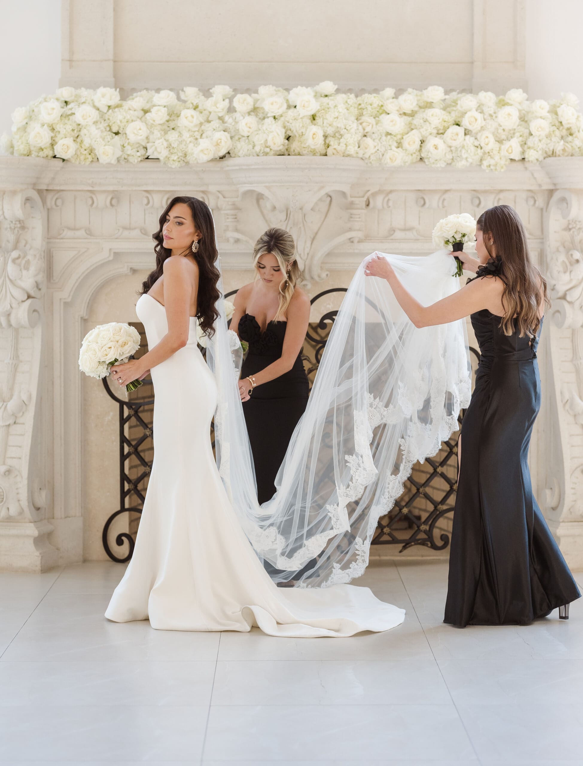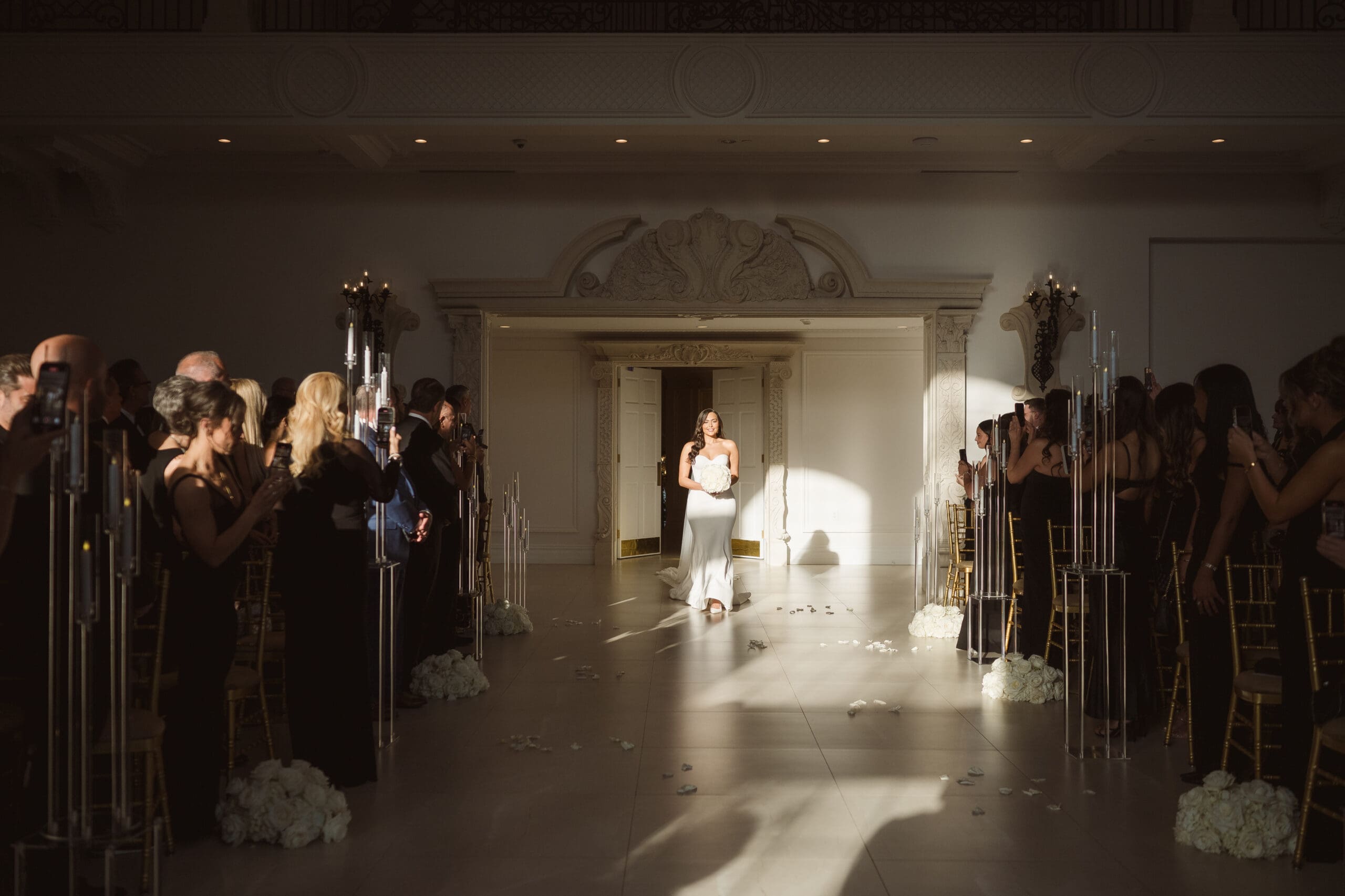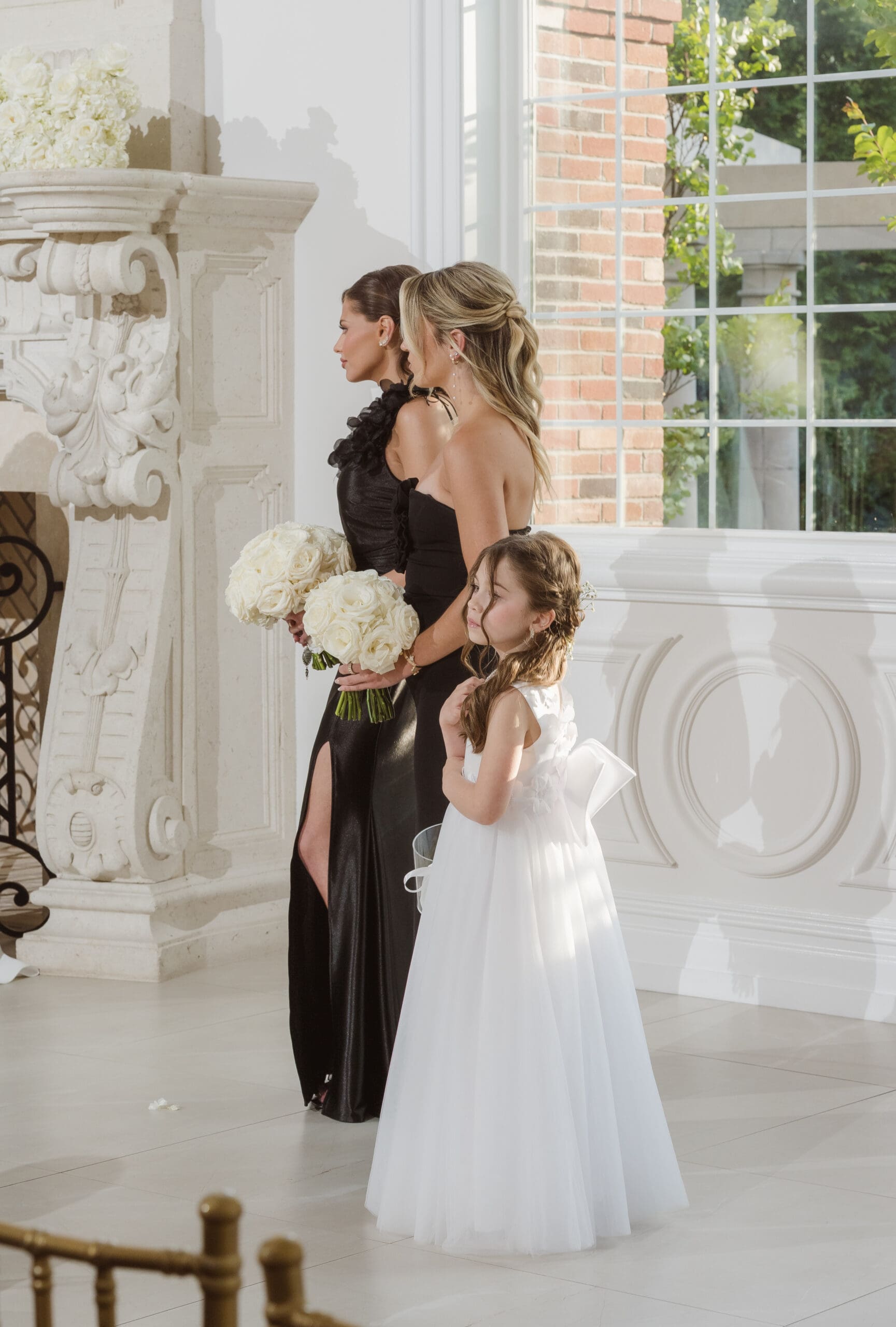 The couple requested a formal dress code in all black. The floral arrangements featured a mix of white and ivory, with minimal greenery.